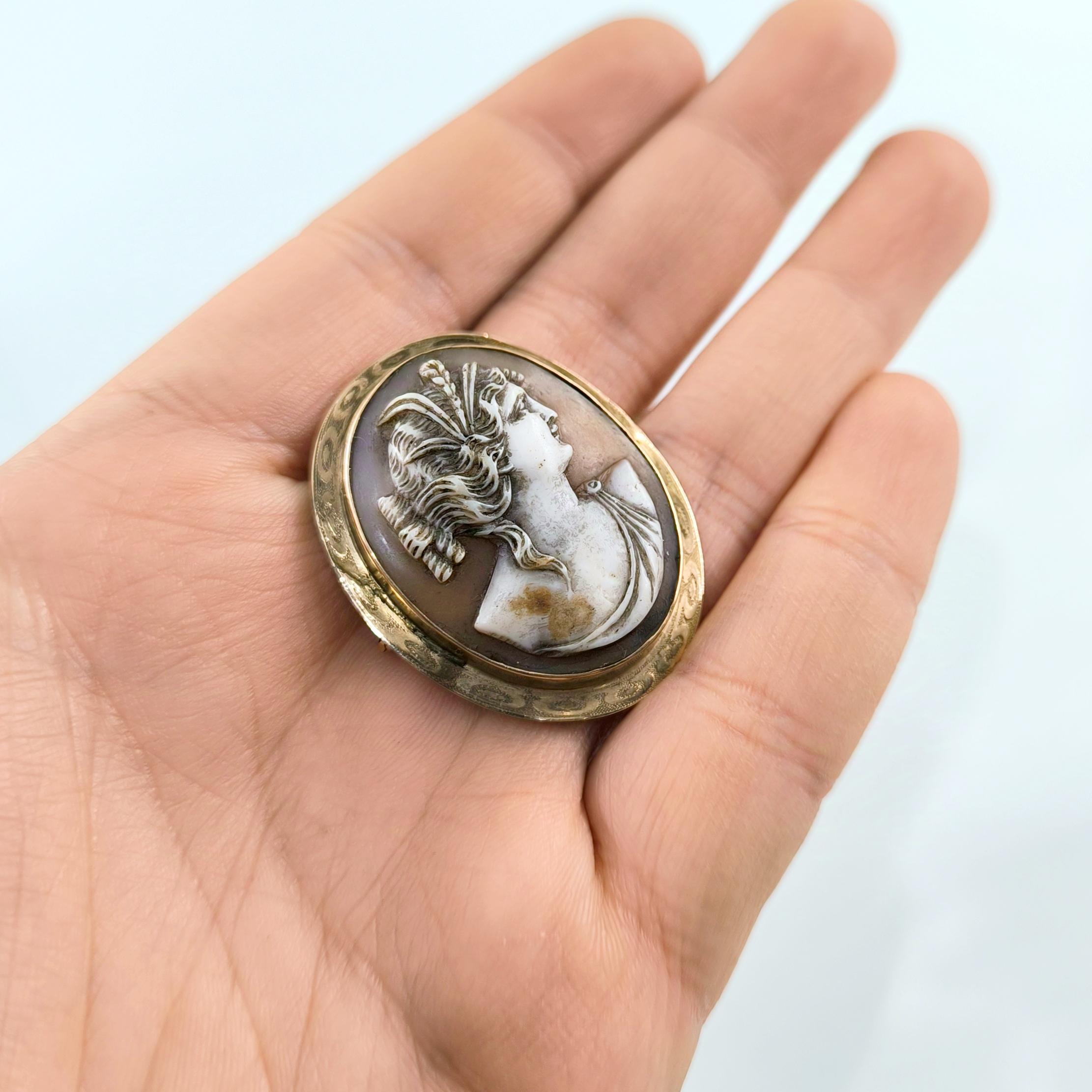 Eşsiz bir Antika Cameo mücevher ! Deniz kabuğu Üzerine "Leydi'' tasvirli & muhtemelen Avrupa yapımı gerçek bir vintage mücevher! Çerçevesi 10 ayar altın olup, broş olarak kullanılabilecek eşsiz bir mücevherdir!