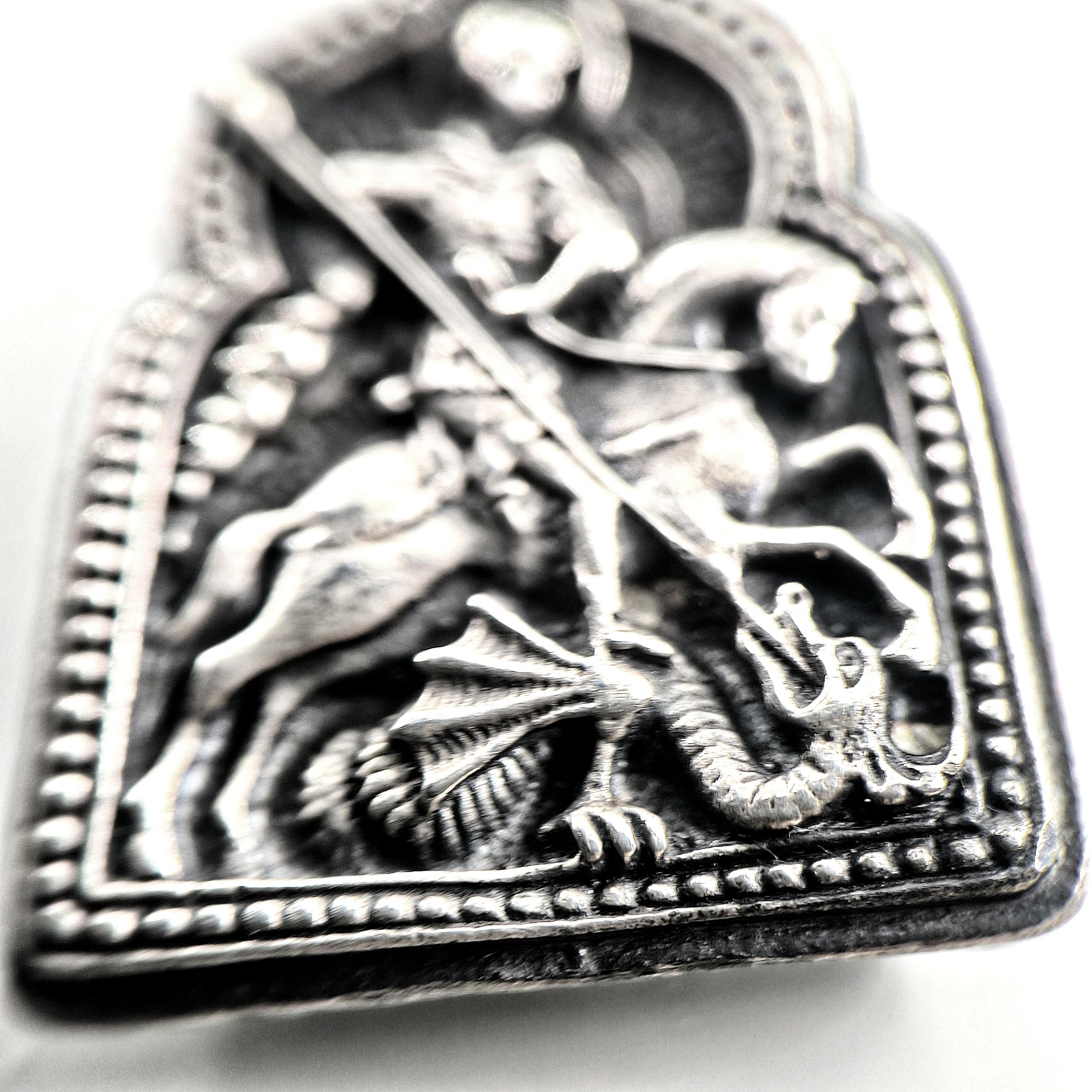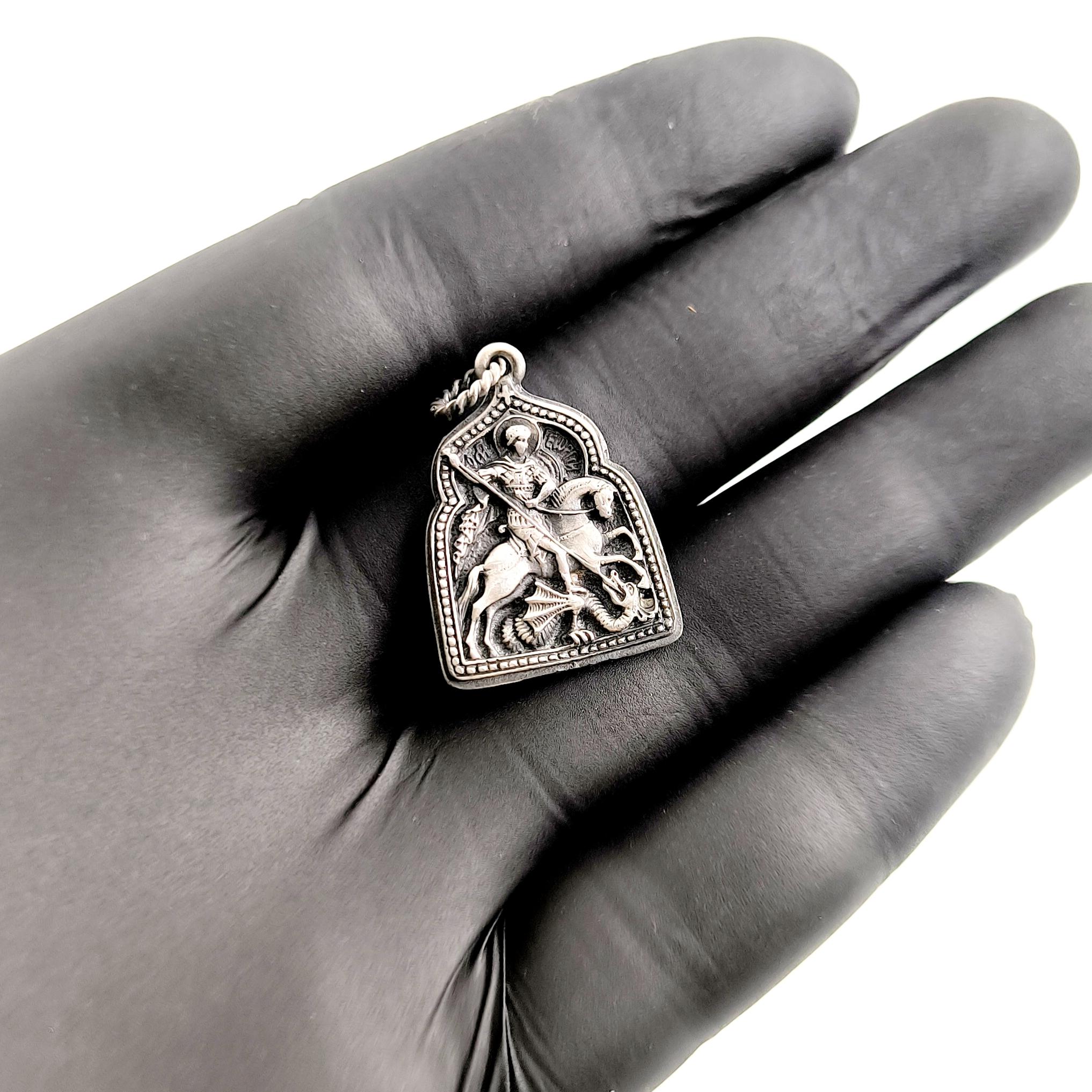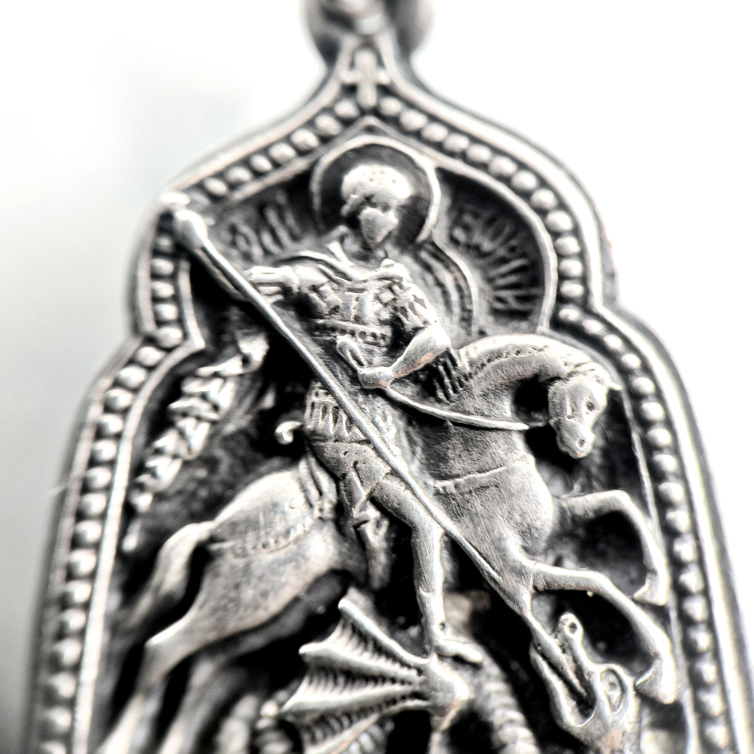 St. George’un ejderhayı mızrakla alt ettiği ikonografiyi taşıyan bu özel ikona kolye, 925 ayar gümüşten üretilmiştir. Ön yüzdeki yüksek kabartma detayları, kutsal savaşın ve karanlığa karşı zaferin sembolünü tarihî bir anlatımla sunar. Arka yüzünde ise Rus Ortodoks geleneğinden gelen klasik dua metni yer alır: “Ey zafer taşıyan büyük şehit Aziz George, bizim için Tanrı’dan dua dile.” Manevi gücü, koruyucu anlamı ve sanatsal işçiliği bir arada taşıyan bu parça, hem ruhani bir tılsım hem de koleksiyon değeri yüksek bir ikonadır.