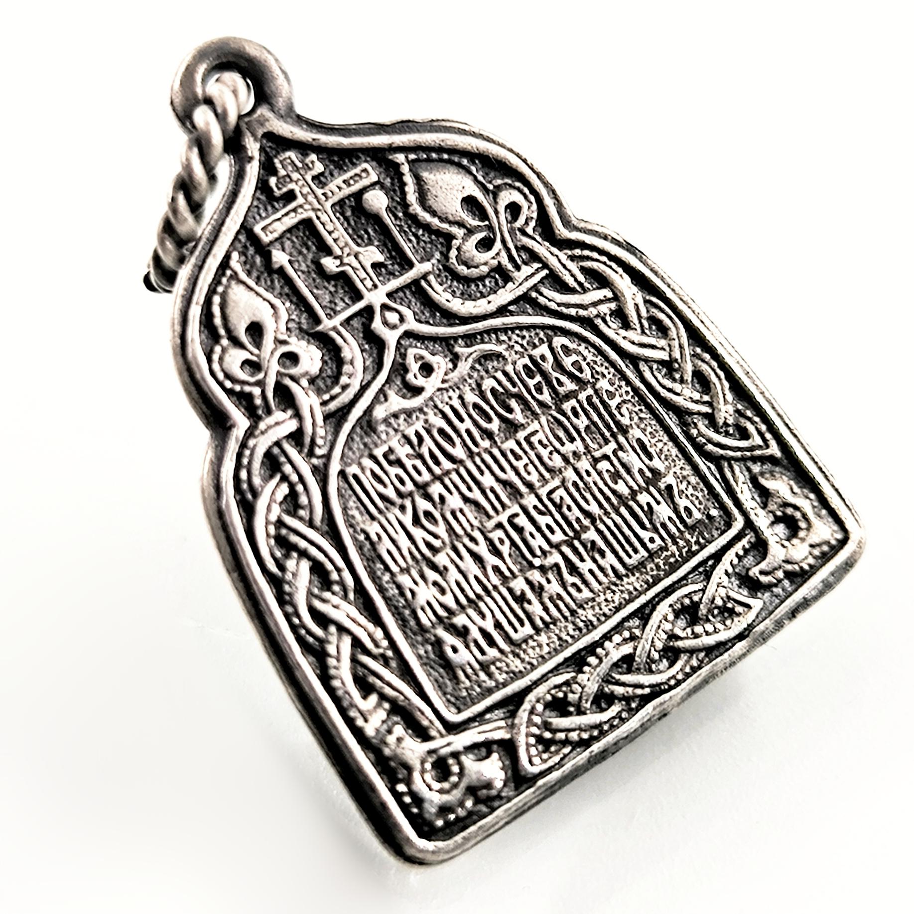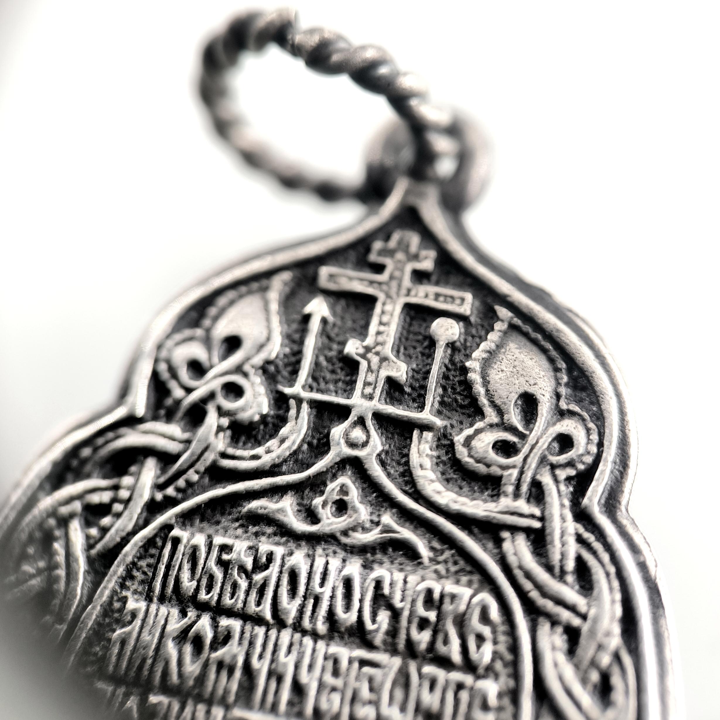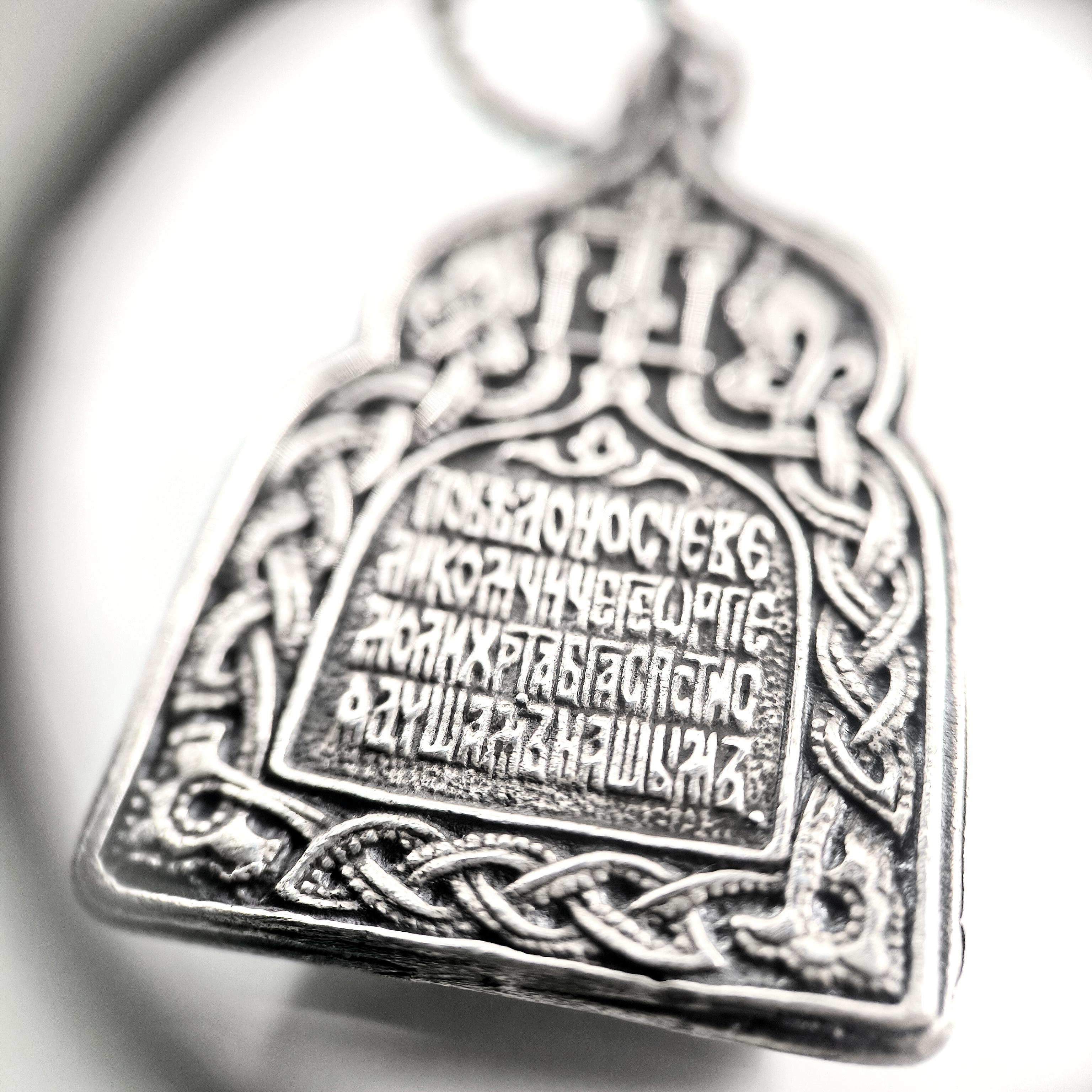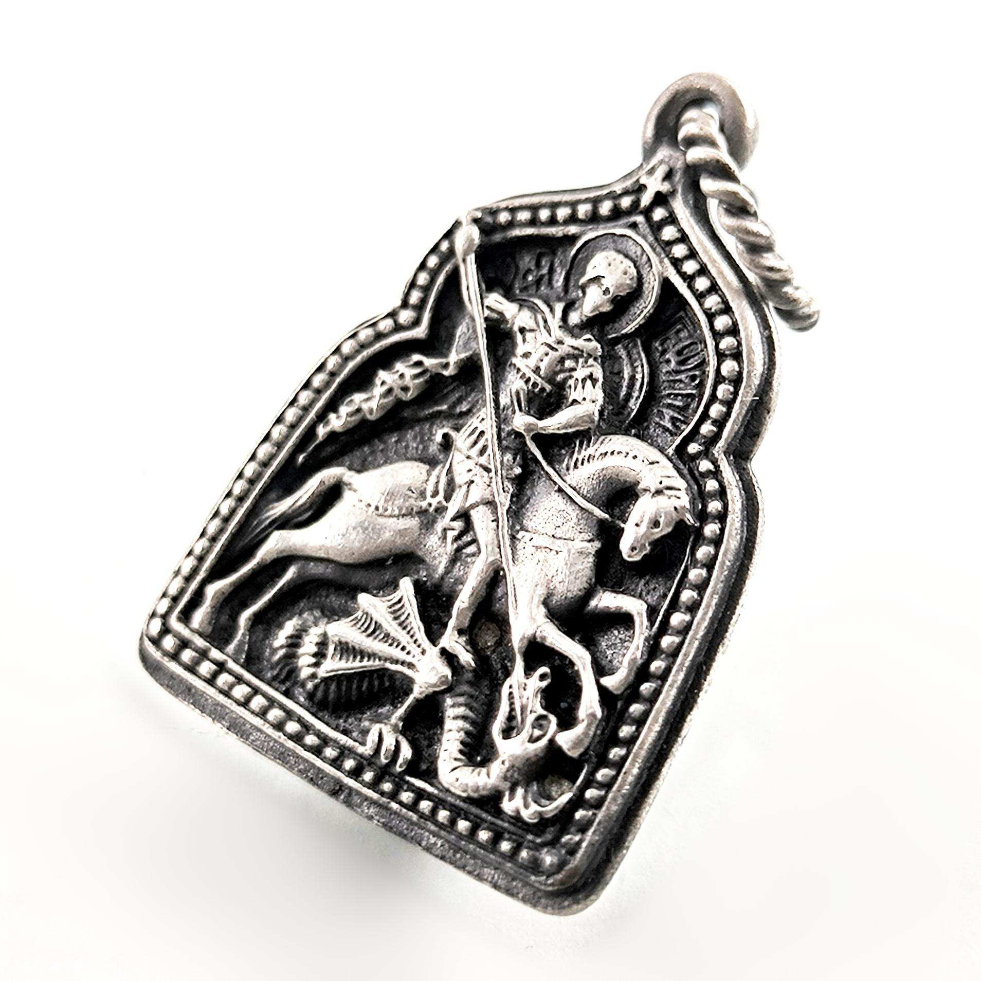St. George’un ejderhayı mızrakla alt ettiği ikonografiyi taşıyan bu özel ikona kolye, 925 ayar gümüşten üretilmiştir. Ön yüzdeki yüksek kabartma detayları, kutsal savaşın ve karanlığa karşı zaferin sembolünü tarihî bir anlatımla sunar. Arka yüzünde ise Rus Ortodoks geleneğinden gelen klasik dua metni yer alır: “Ey zafer taşıyan büyük şehit Aziz George, bizim için Tanrı’dan dua dile.” Manevi gücü, koruyucu anlamı ve sanatsal işçiliği bir arada taşıyan bu parça, hem ruhani bir tılsım hem de koleksiyon değeri yüksek bir ikonadır.