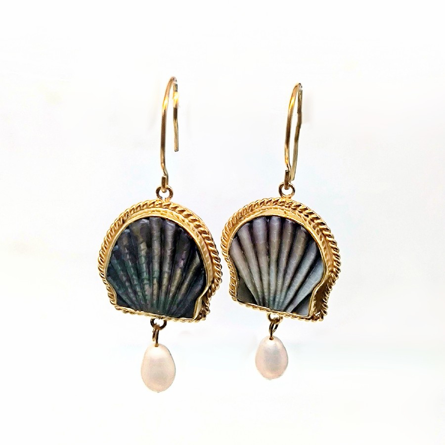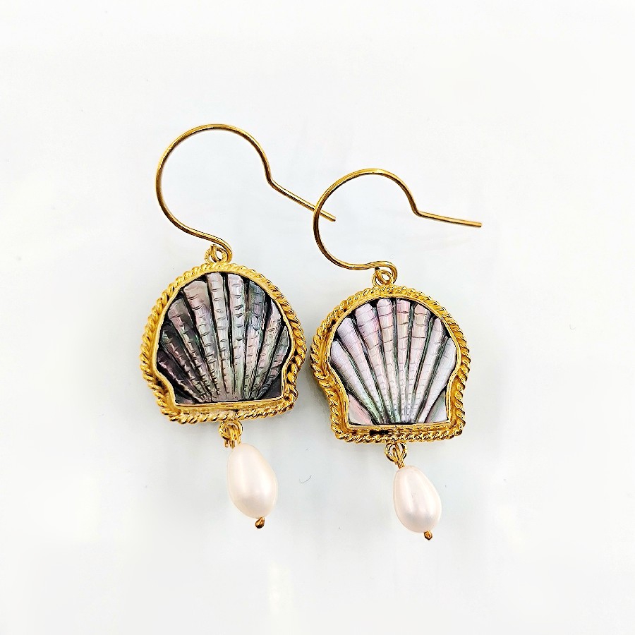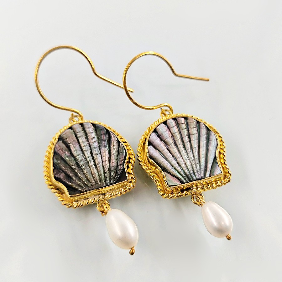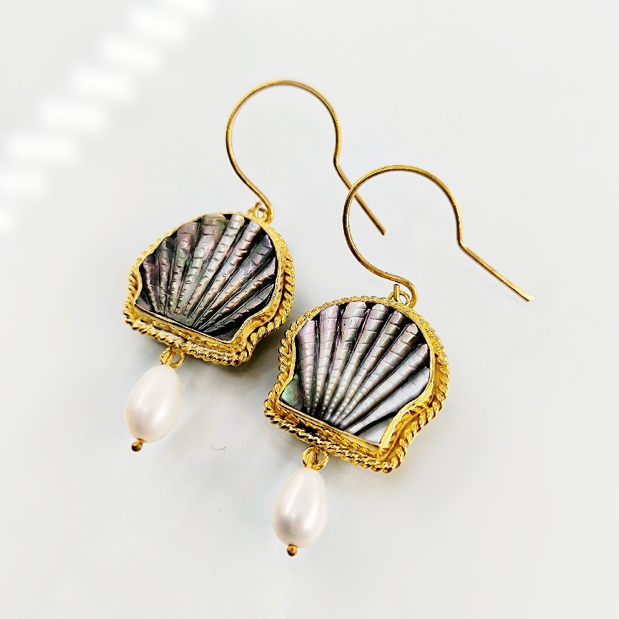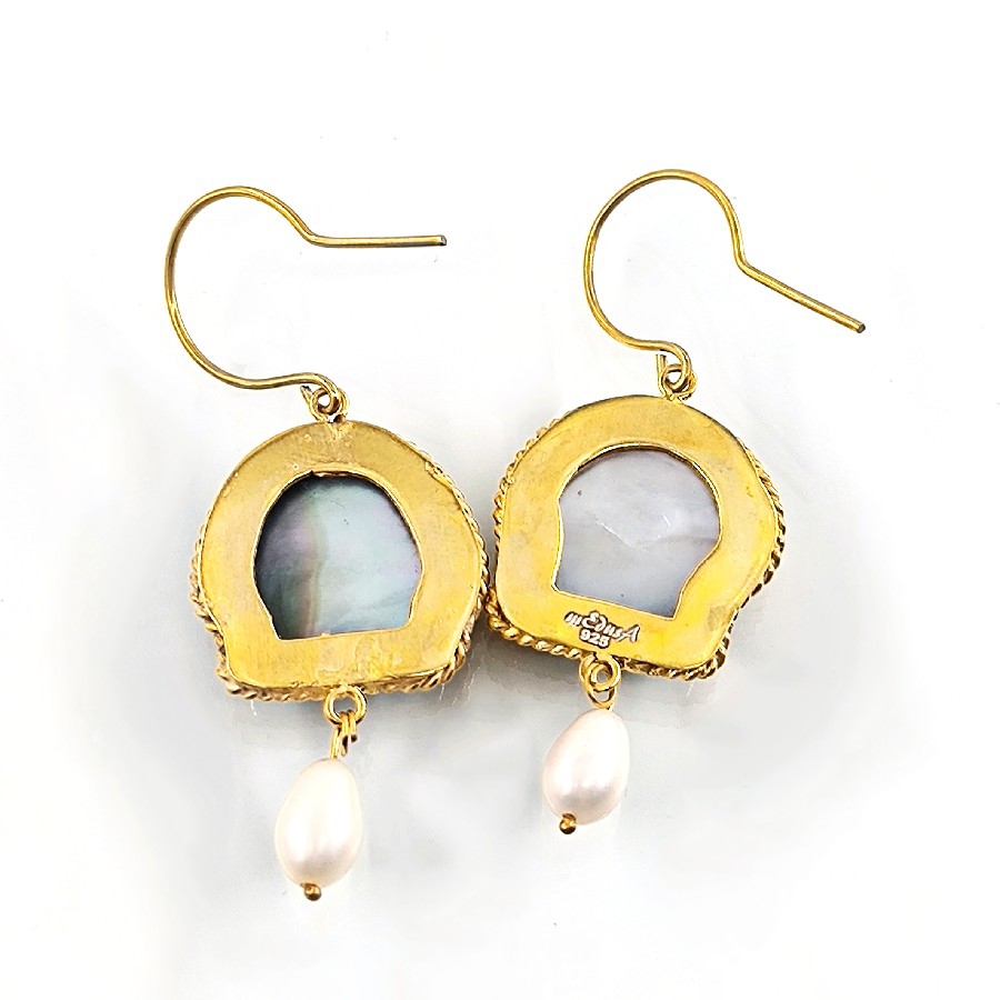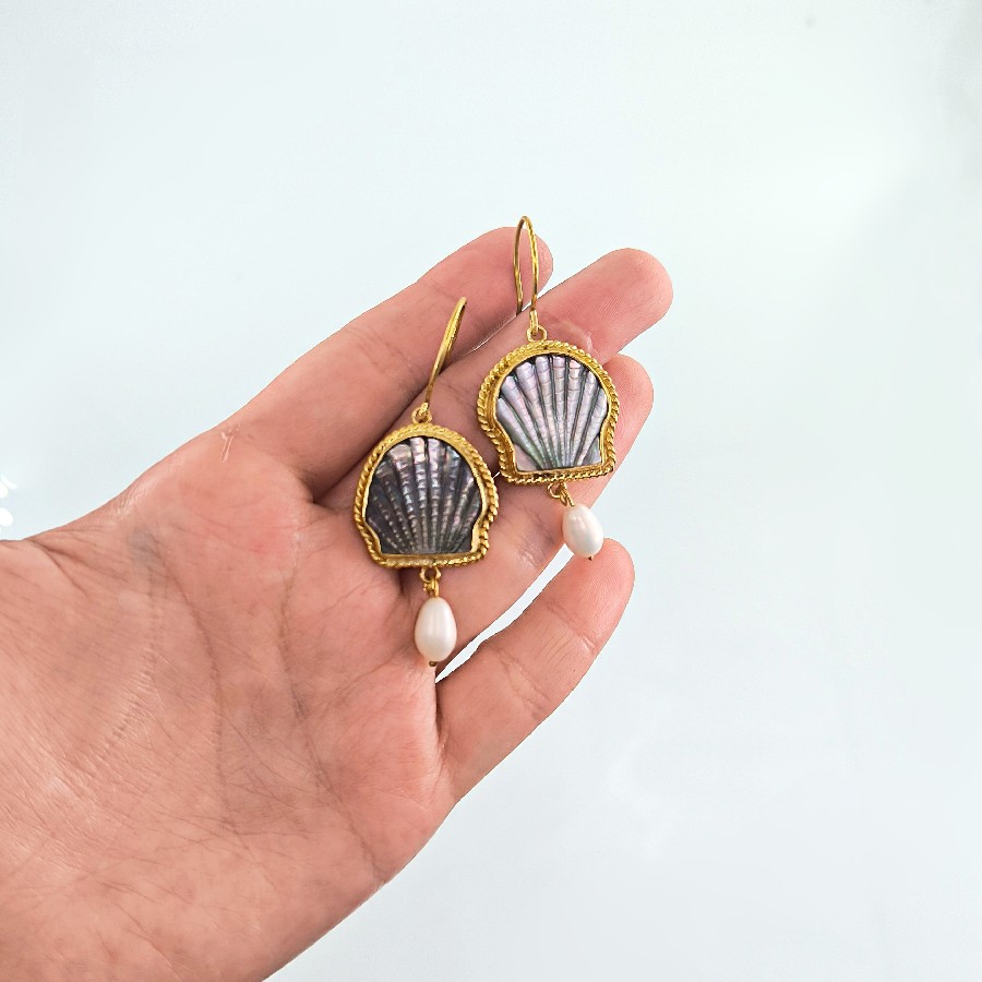 Her detayı el işçiliğiyle şekillendirilmiş bu özel küpeler, denizlerin büyüsünü üzerinizde taşımanızı sağlıyor. Doğal abalone (sedefli deniz kabuğu) kabuğundan oyularak hazırlanmış formlar, altına sallanan orijinal inciyle tamamlandı. 925 ayar gümüş üzerine altın kaplama yapılan bu eşsiz parça, hem doğal taşların enerjisini hem de zamansız bir şıklığı yansıtıyor.