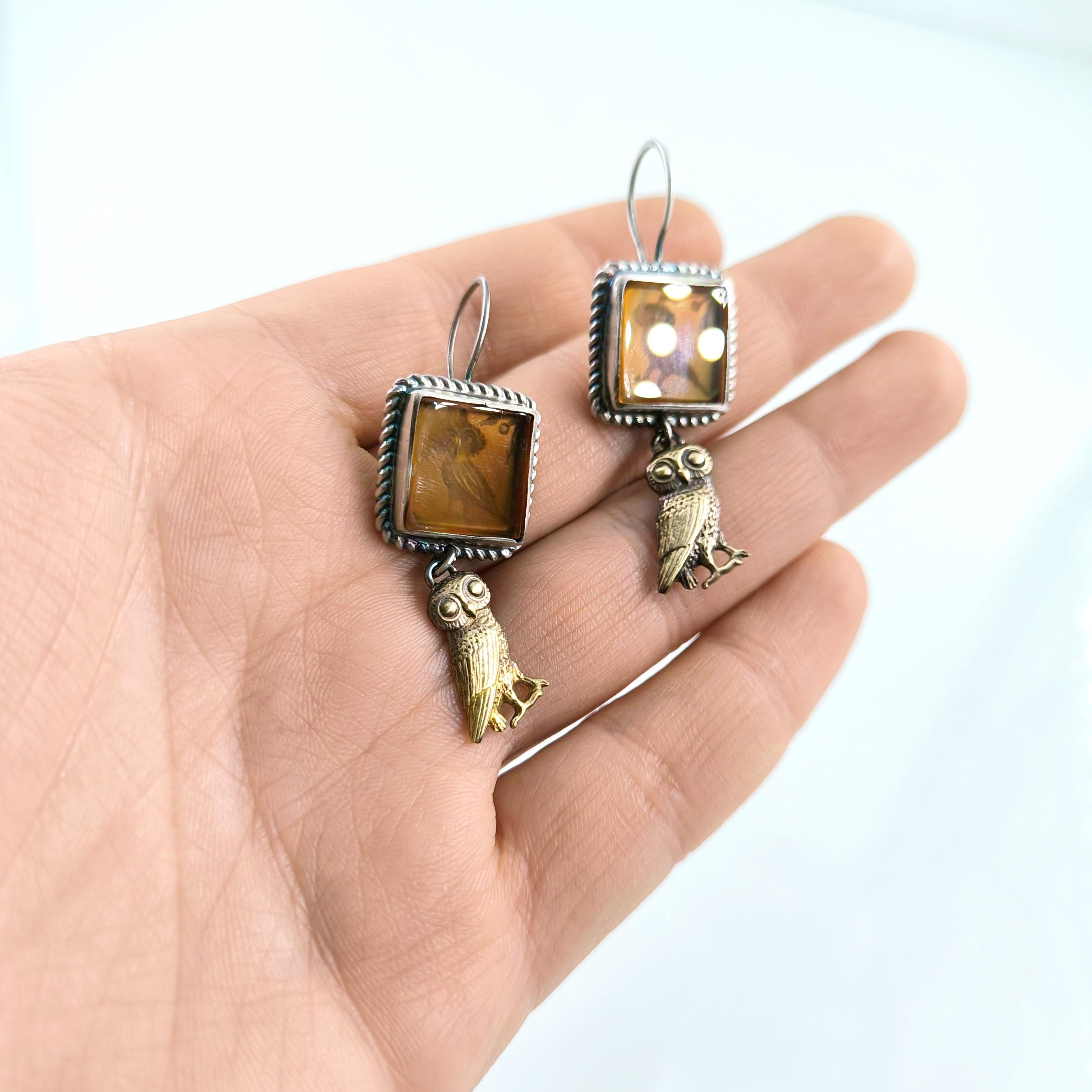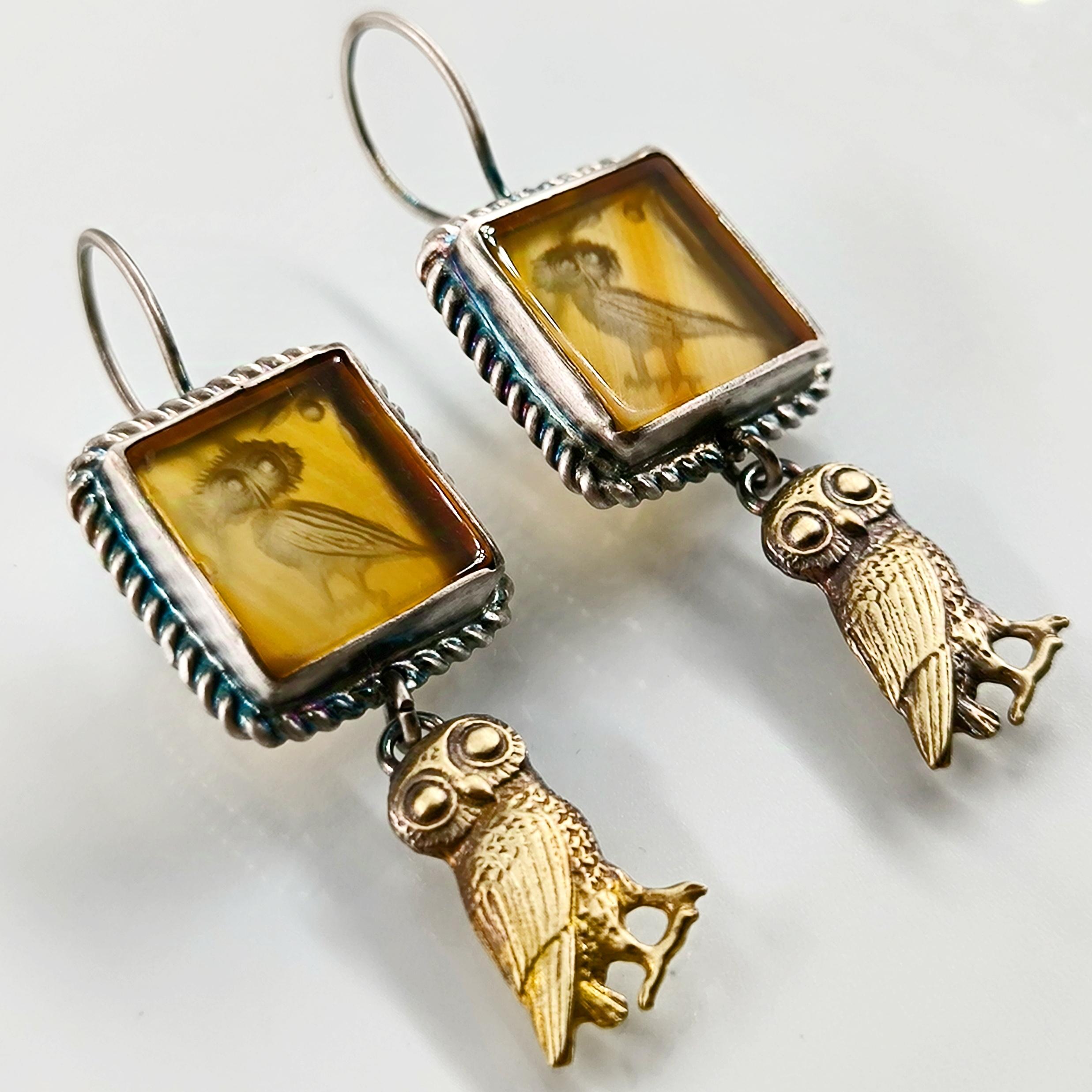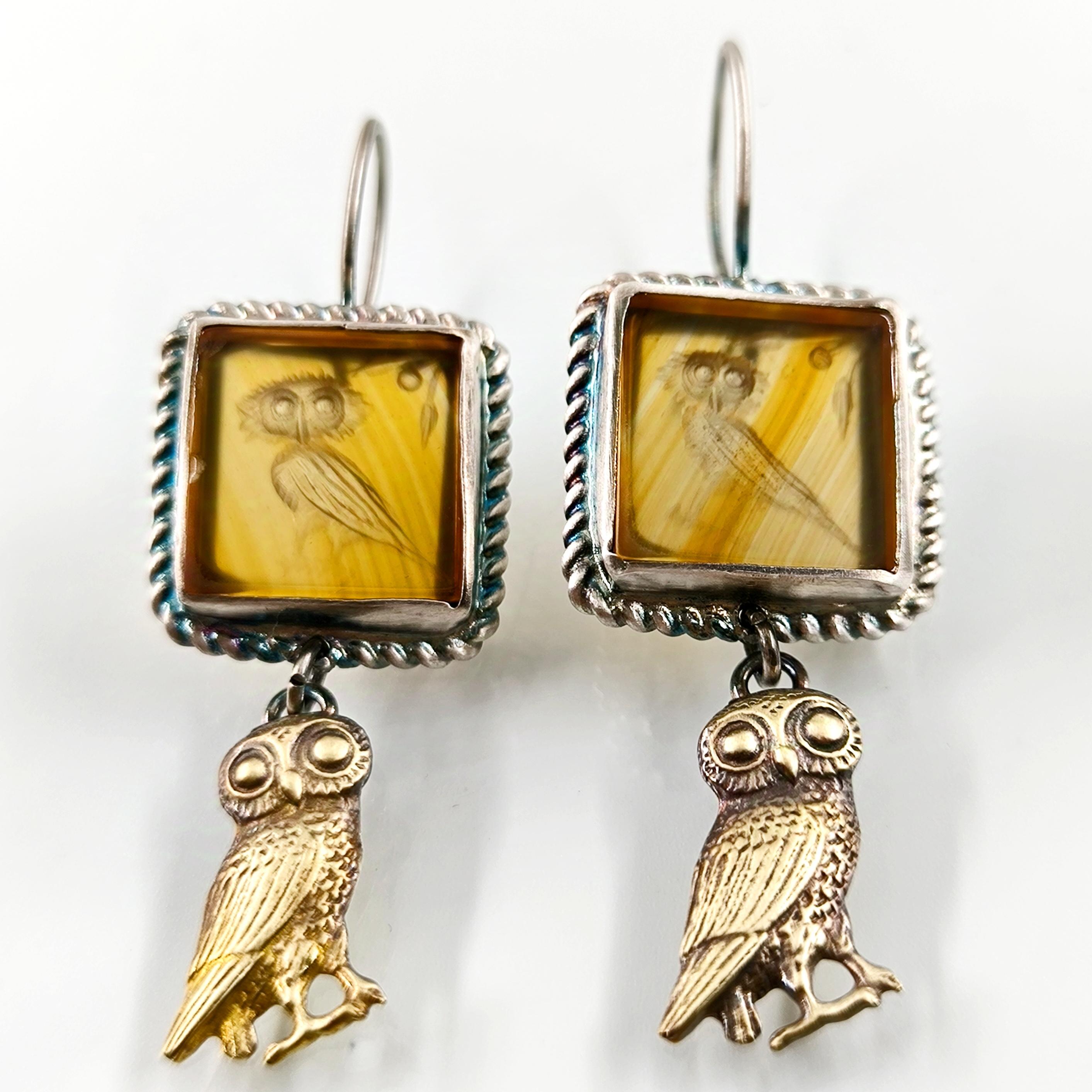 Dünyaca ünlü antik Grek sikkesi üzerindeki Athana'yı temsil eden ''baykuş'' simgesini akik üzerine intaglio çalıştığımız, bronzdan sikke baykuşu ile süslediğimiz antik stilde gümüş küpelerimiz!