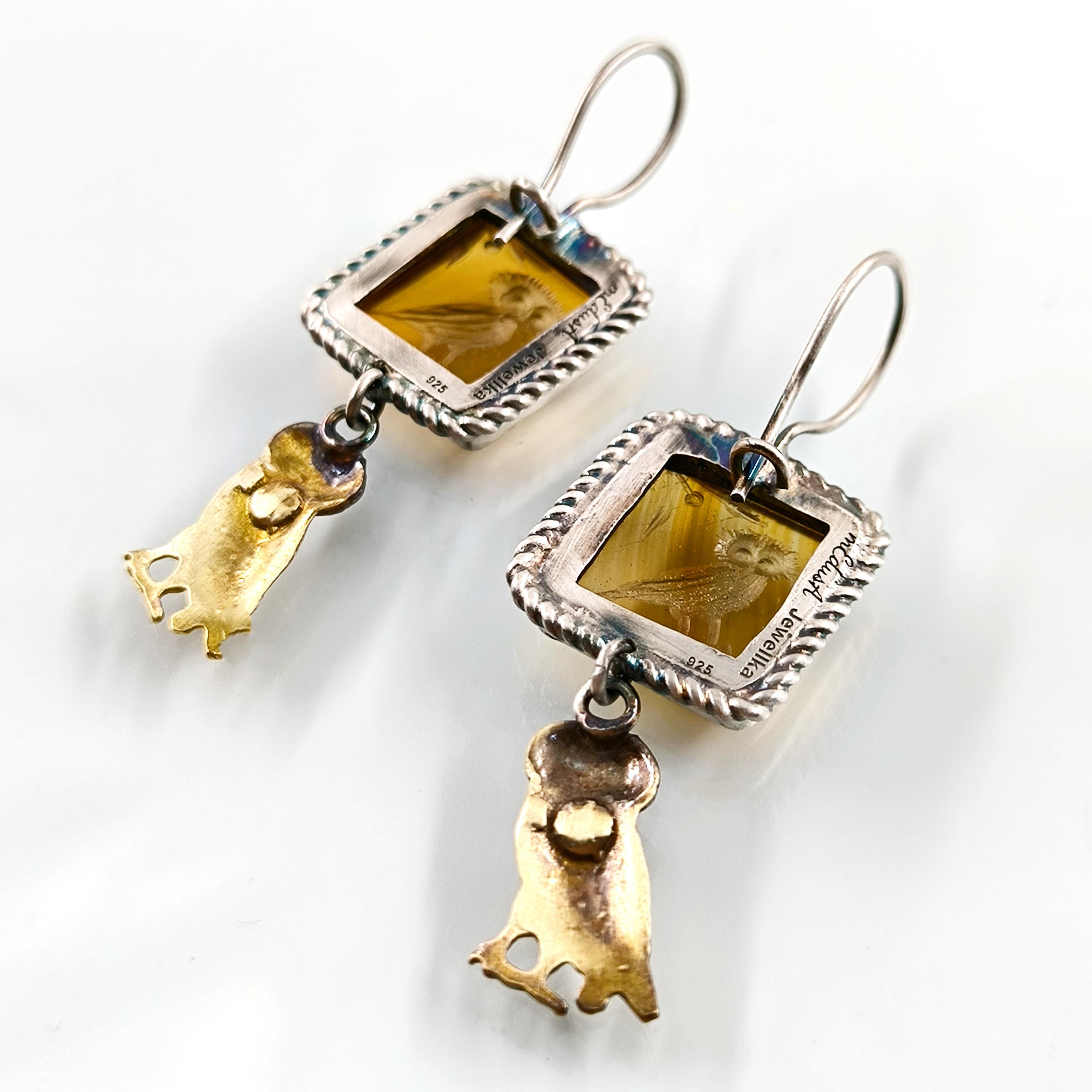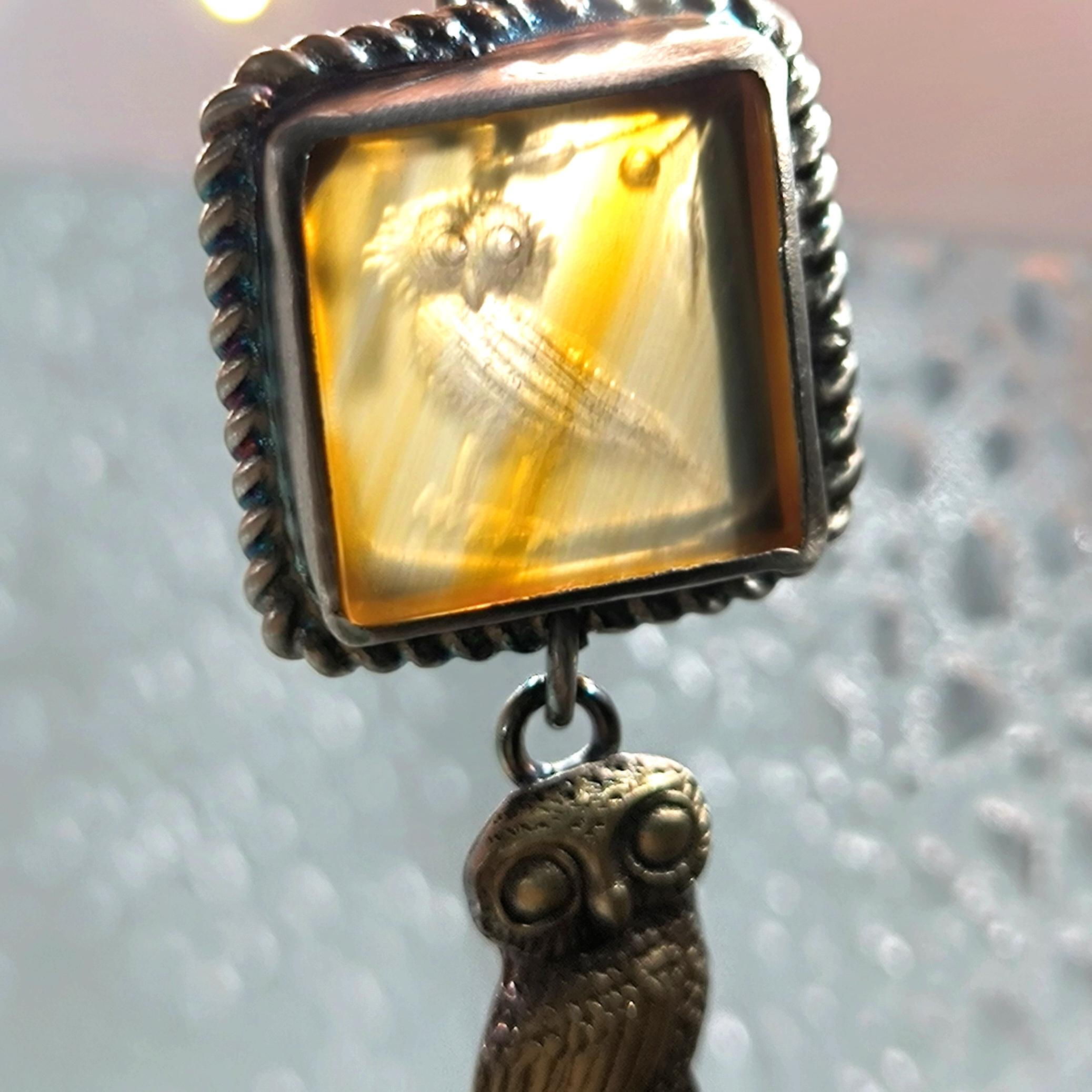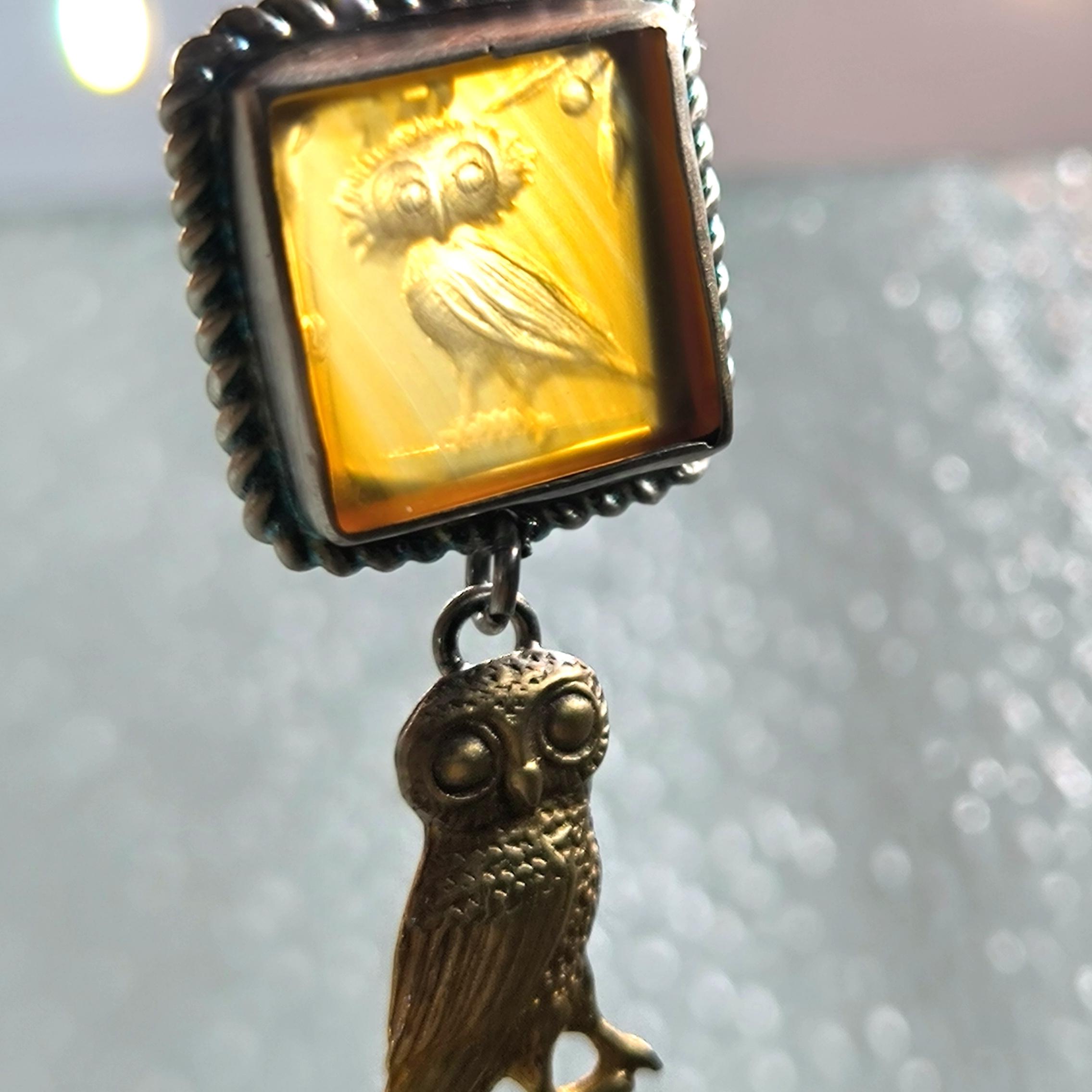 Dünyaca ünlü antik Grek sikkesi üzerindeki Athana'yı temsil eden ''baykuş'' simgesini akik üzerine intaglio çalıştığımız, bronzdan sikke baykuşu ile süslediğimiz antik stilde gümüş küpelerimiz!