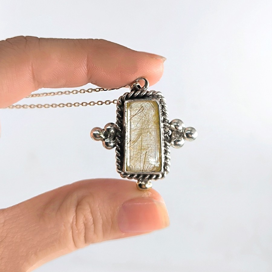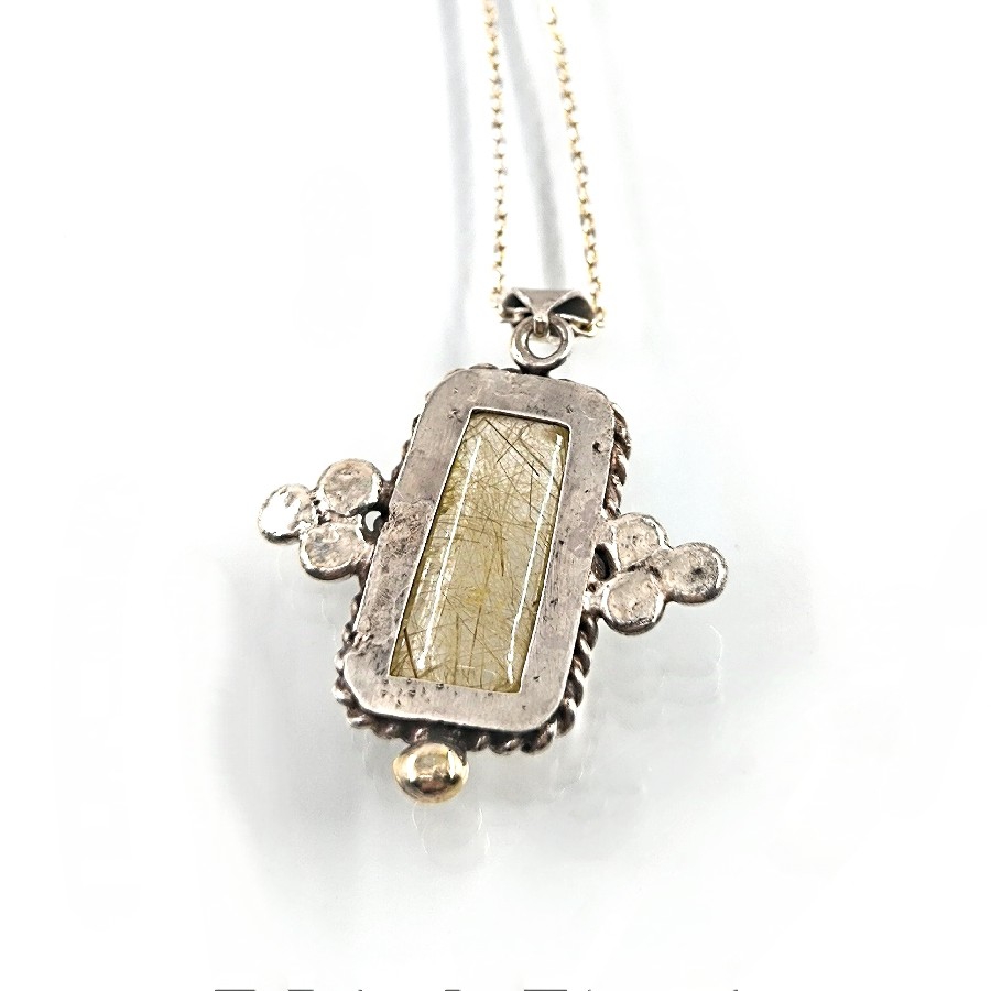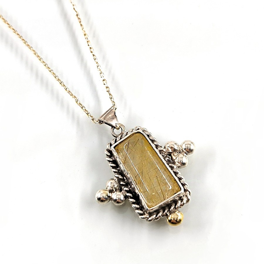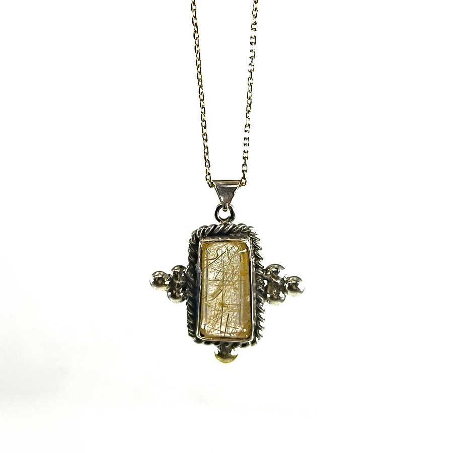 Bu şık kolye, ince işçiliği ve özenle seçilmiş malzemeleriyle dikkat çekmektedir. Kolyenin ana taşı olan altın rutilli kuvars, dünyanın nadir bulunan ve değerli taşları arasındadır. Doğal güzelliği, çarpıcı altın tel gibi görüntüsüyle herkesin gözlerini üzerine çekmektedir.