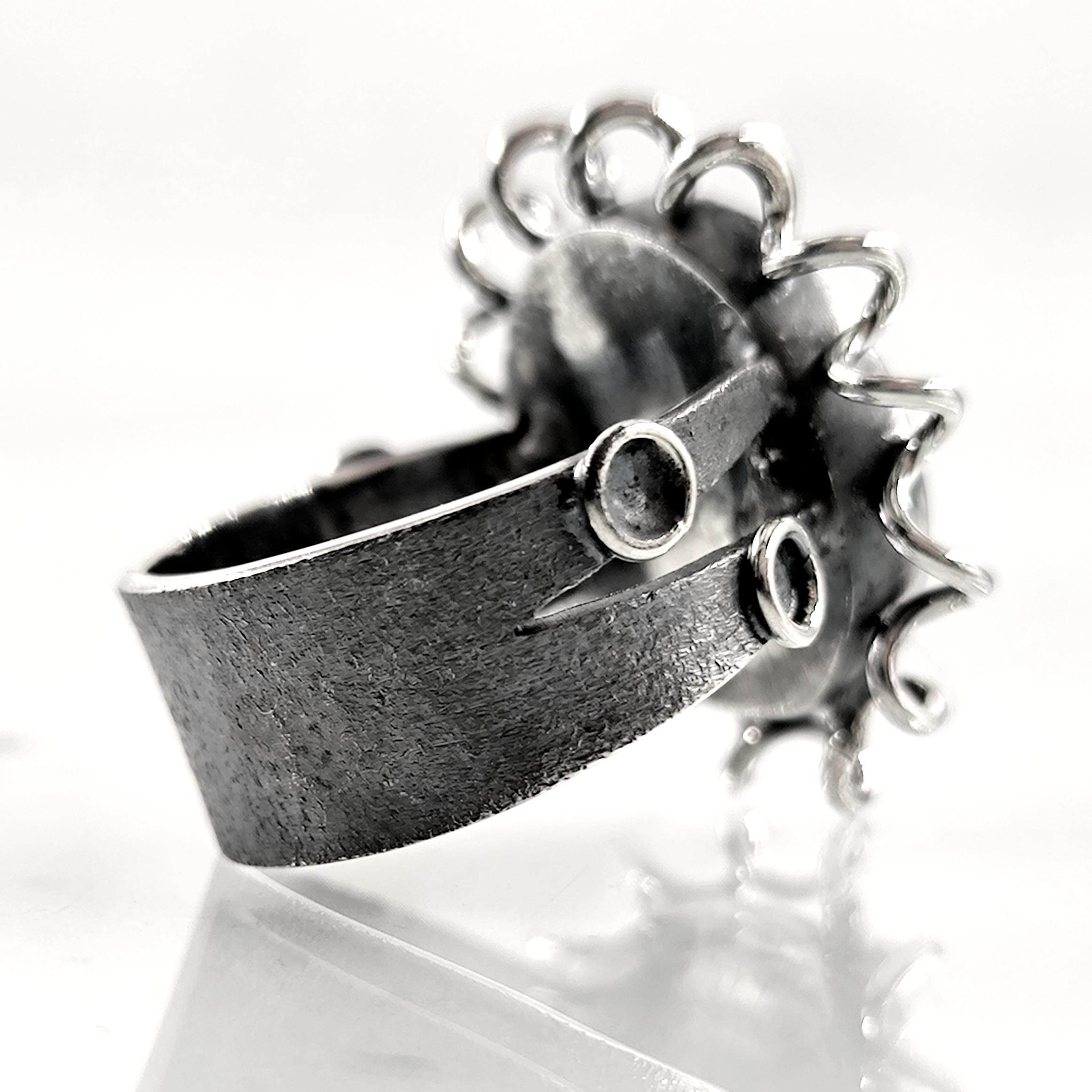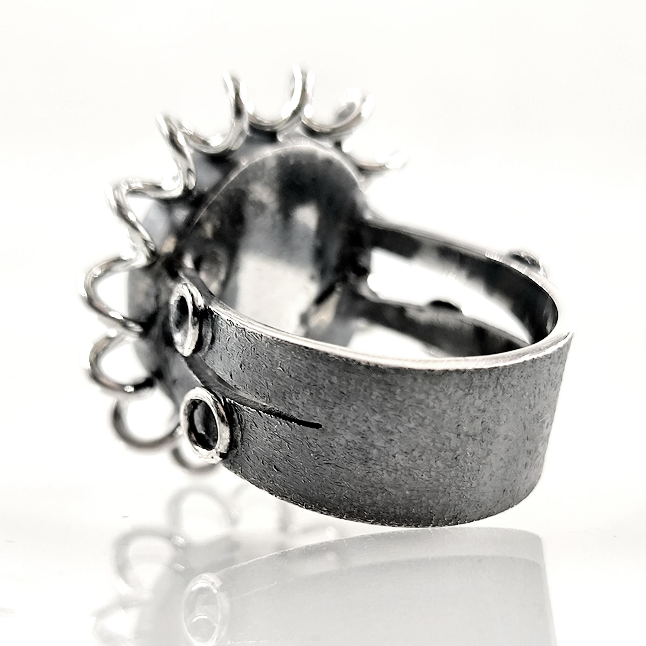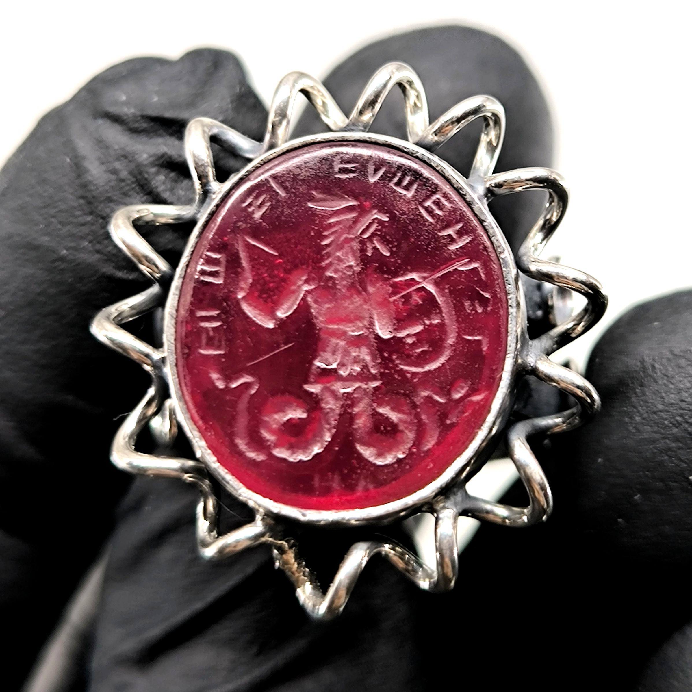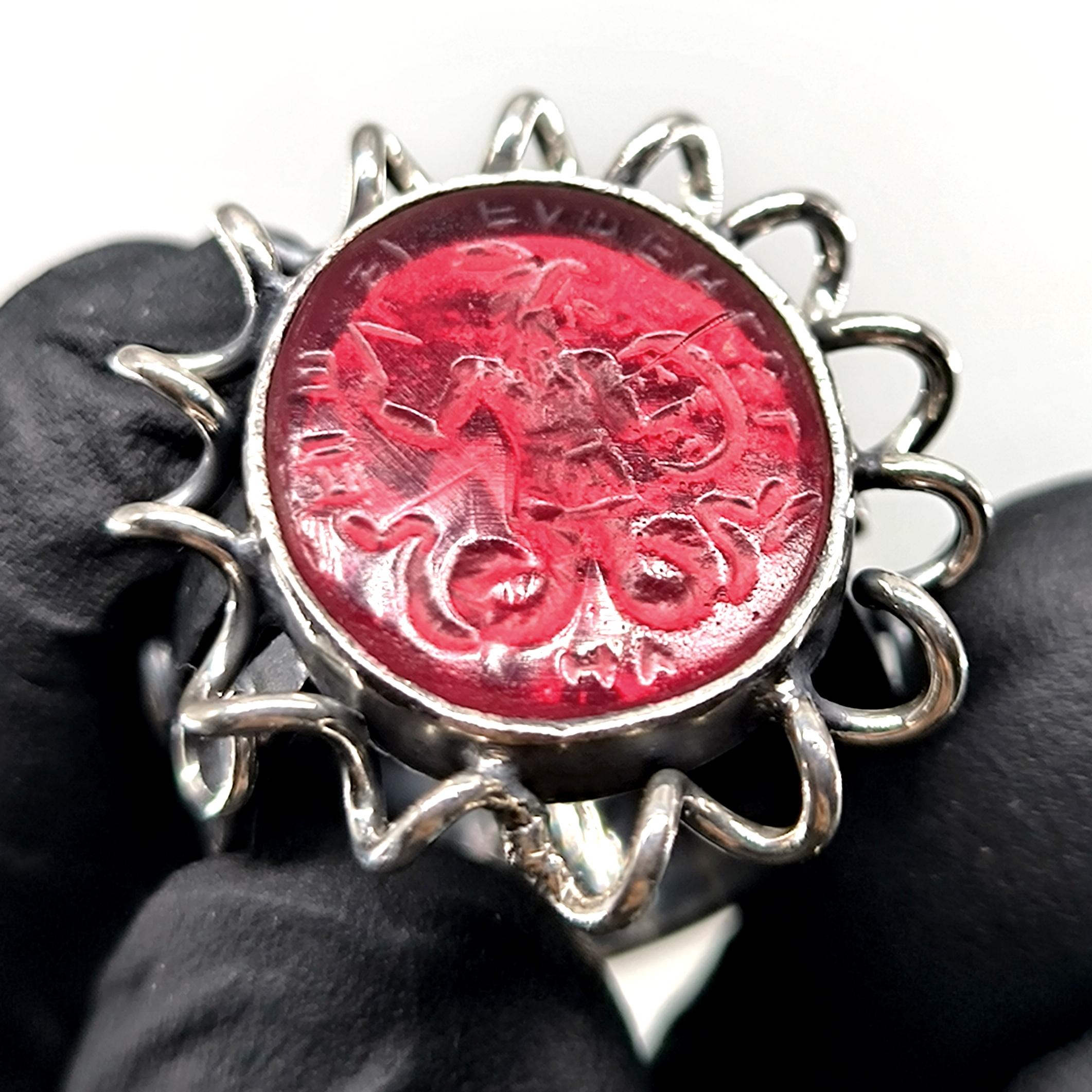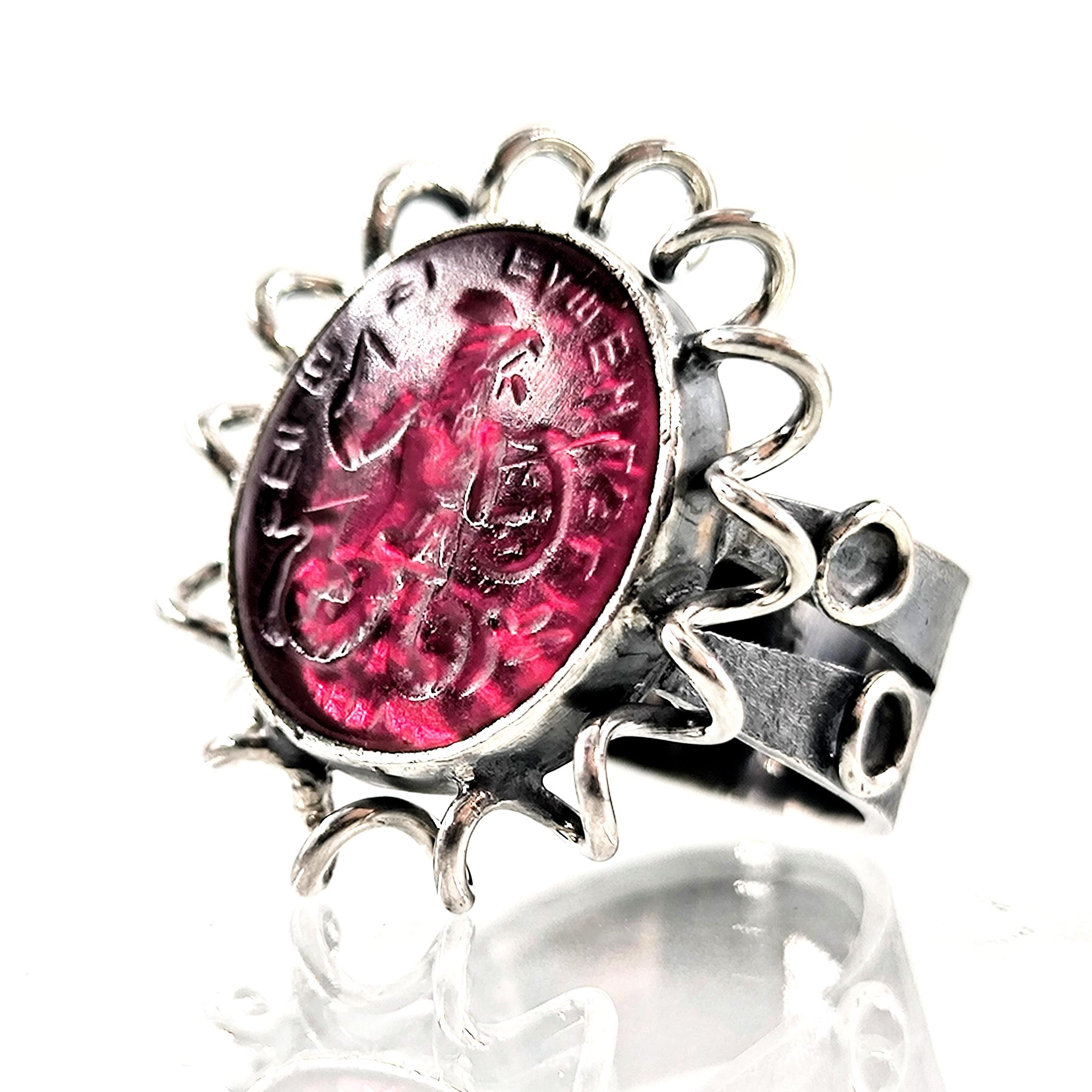 Antik dünyada koruma, güç ve kozmik dengeyi simgeleyen Abraxas figürü, bu yüzükte kırmızı cam üzerine pres tekniğiyle uygulanan negatif intaglio (arkadan oyma) yöntemiyle yeniden hayat buluyor; oyma detaylar camın alt yüzeyinde işlendiği için üstten bakıldığında figür üç boyutlu ve derinlikli bir etki yaratıyor. Kırmızı camın altına yerleştirilen özel foya, ışığa göre değişen janjanlı yansımalar oluşturarak figürün mistik karakterini güçlendirirken, antik stil tamamen el işçiliğiyle üretilmiş 925 ayar gümüş yüzük gövdesi bu tılsımı zamansız bir sanat objesine dönüştürüyor.