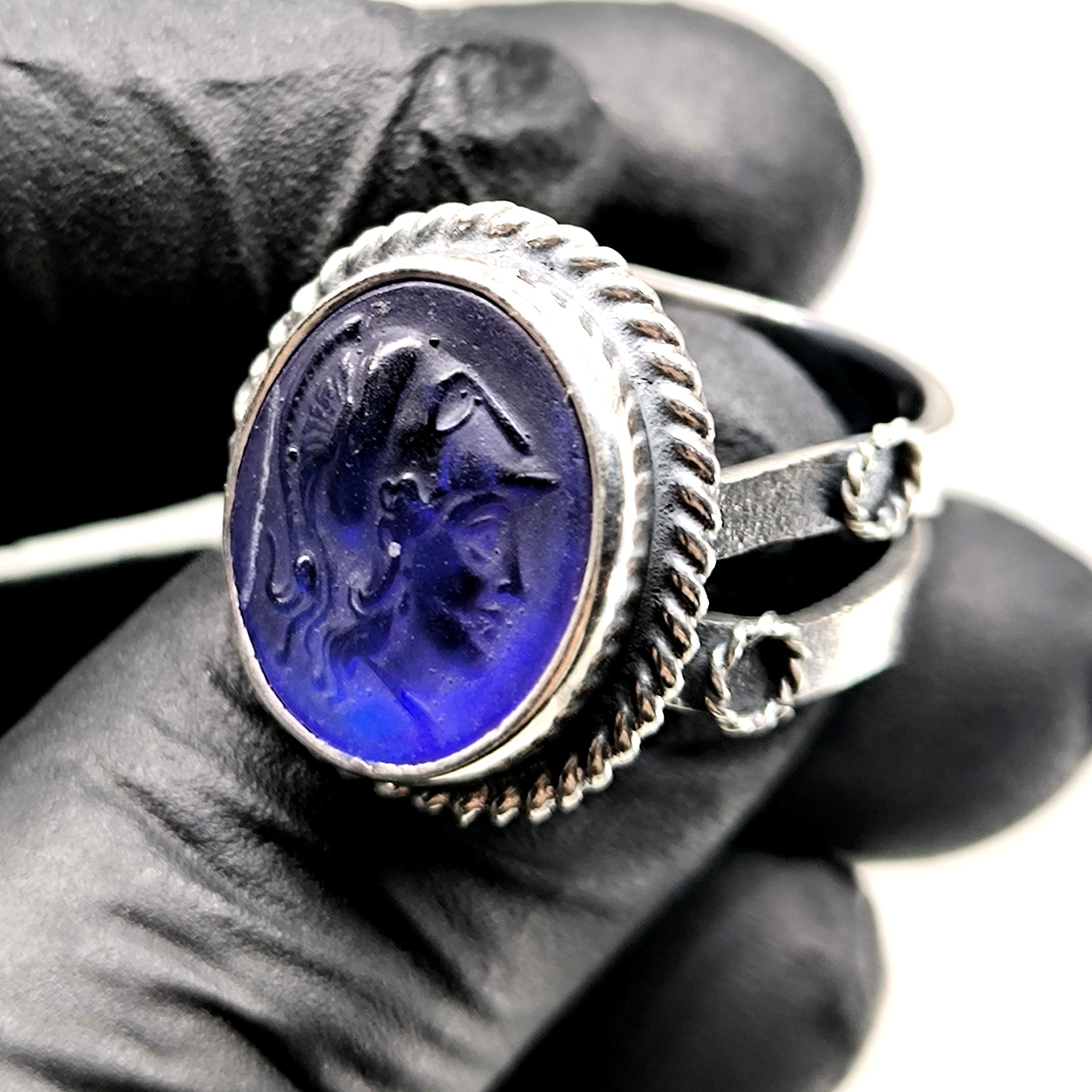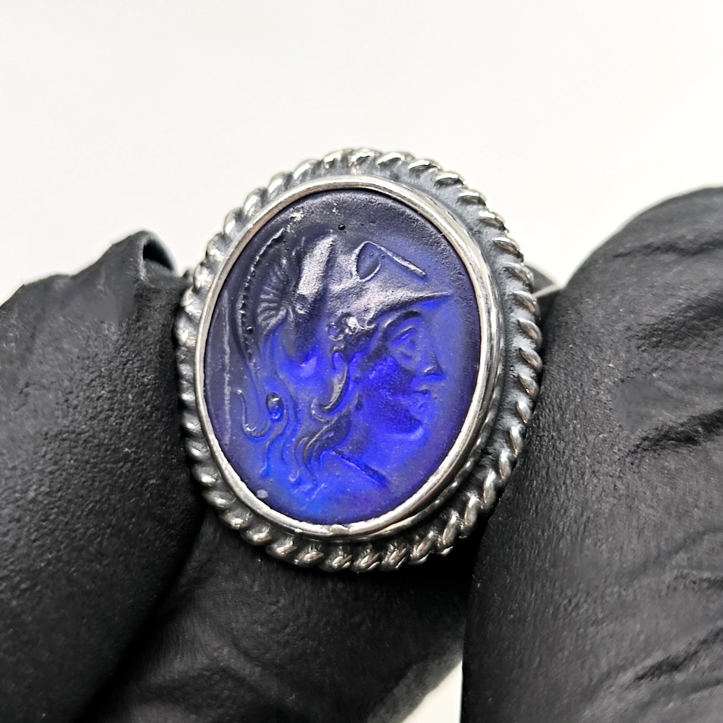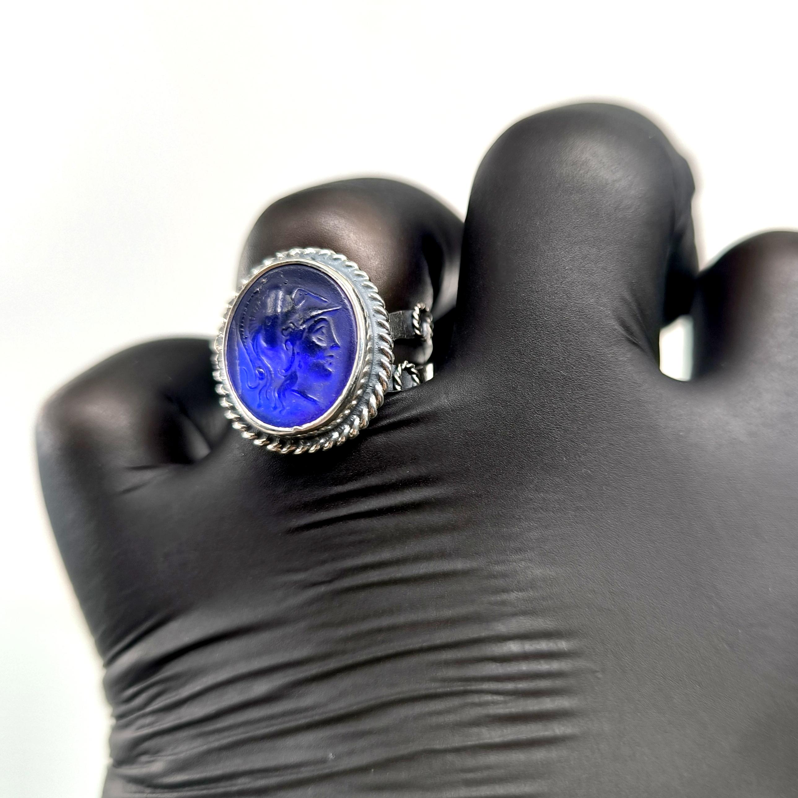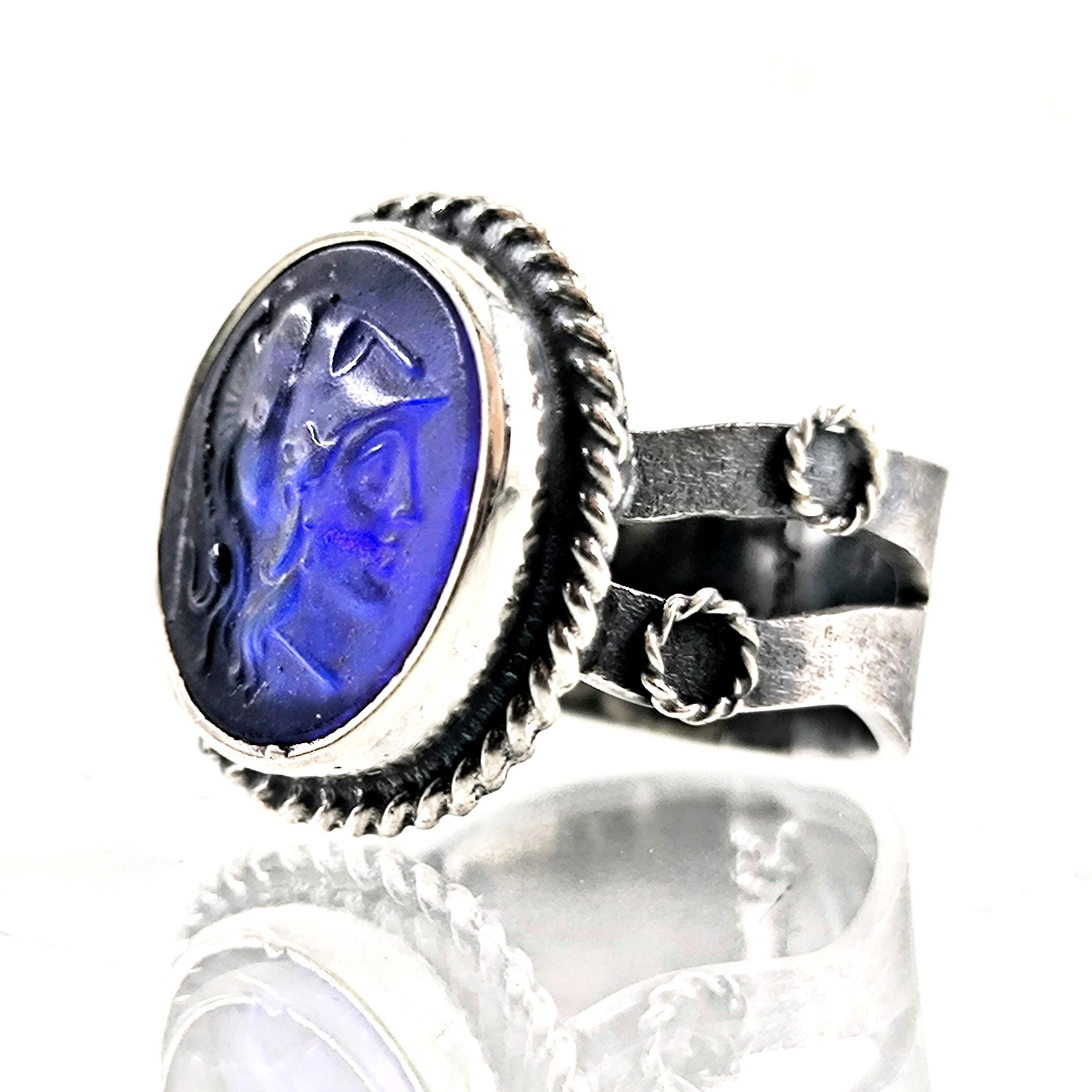 Bilgeliğin, stratejinin ve koruyucu aklın tanrıçası Athena, bu yüzükte antik dünyanın dingin ama sarsılmaz ifadesiyle yeniden hayat bulur. Profil formda çalışılan Athena kabartması; düşüncenin gücünü, doğru zamanda doğru kararı verebilmeyi ve zihinsel berraklığı simgelerken, mavi camın derin tonu tanrıçanın gökyüzüyle kurduğu kadim bağı çağrıştırır. Pres tekniği ile cam üzerine kabartma olarak uygulanan figür, altına yerleştirilen özel foya sayesinde ışıkla buluştuğunda janjanlı ve canlı yansımalar kazanır; böylece yüzük her açıdan farklı bir ruh ve karakter sergiler. Antik mühür yüzük geleneğinden ilham alan bu antik stil gümüş parça, yalnızca bir takı değil, taşıyan kişiyle anlam kazanan zamansız bir sembol ve sessiz bir bilgelik tılsımı niteliği taşır.