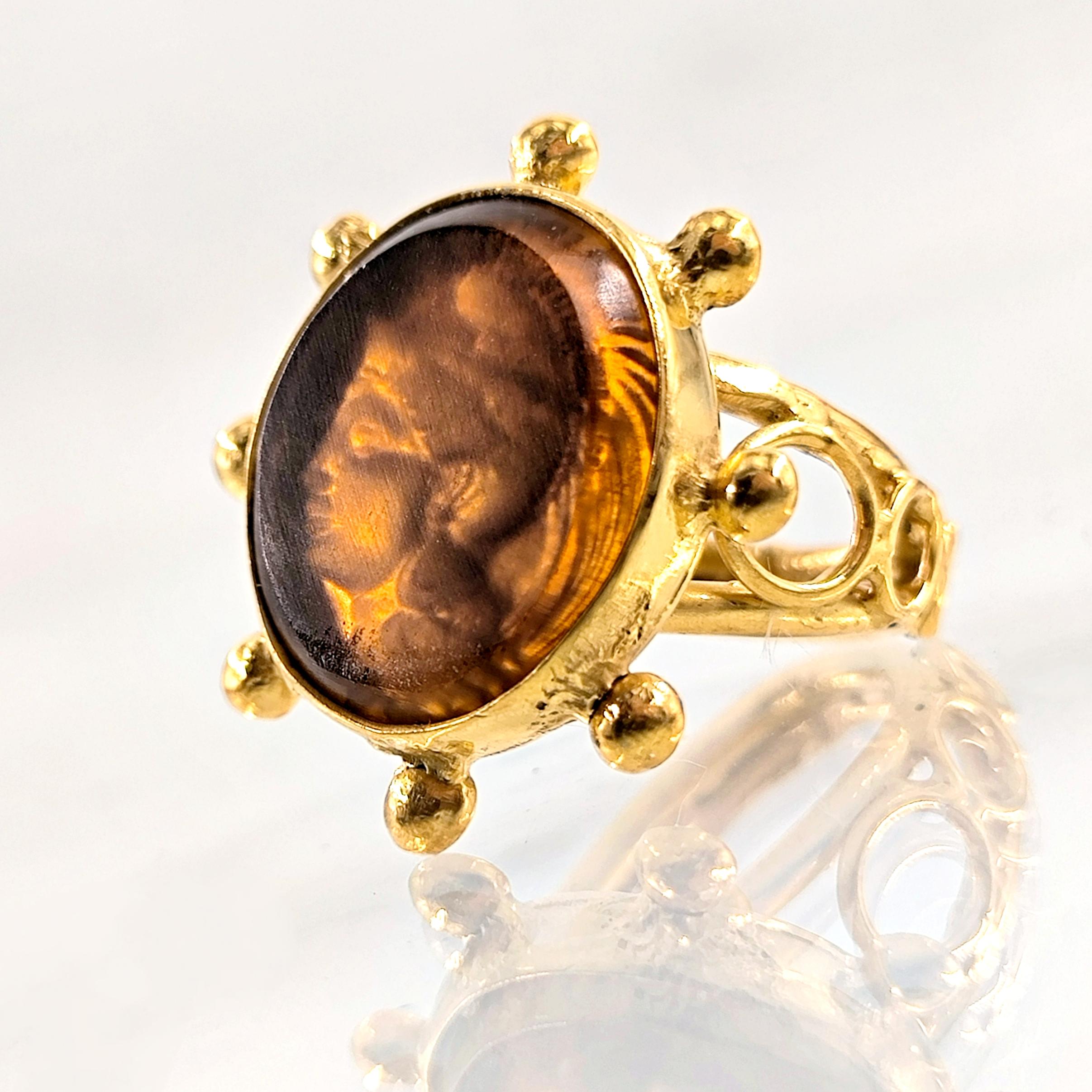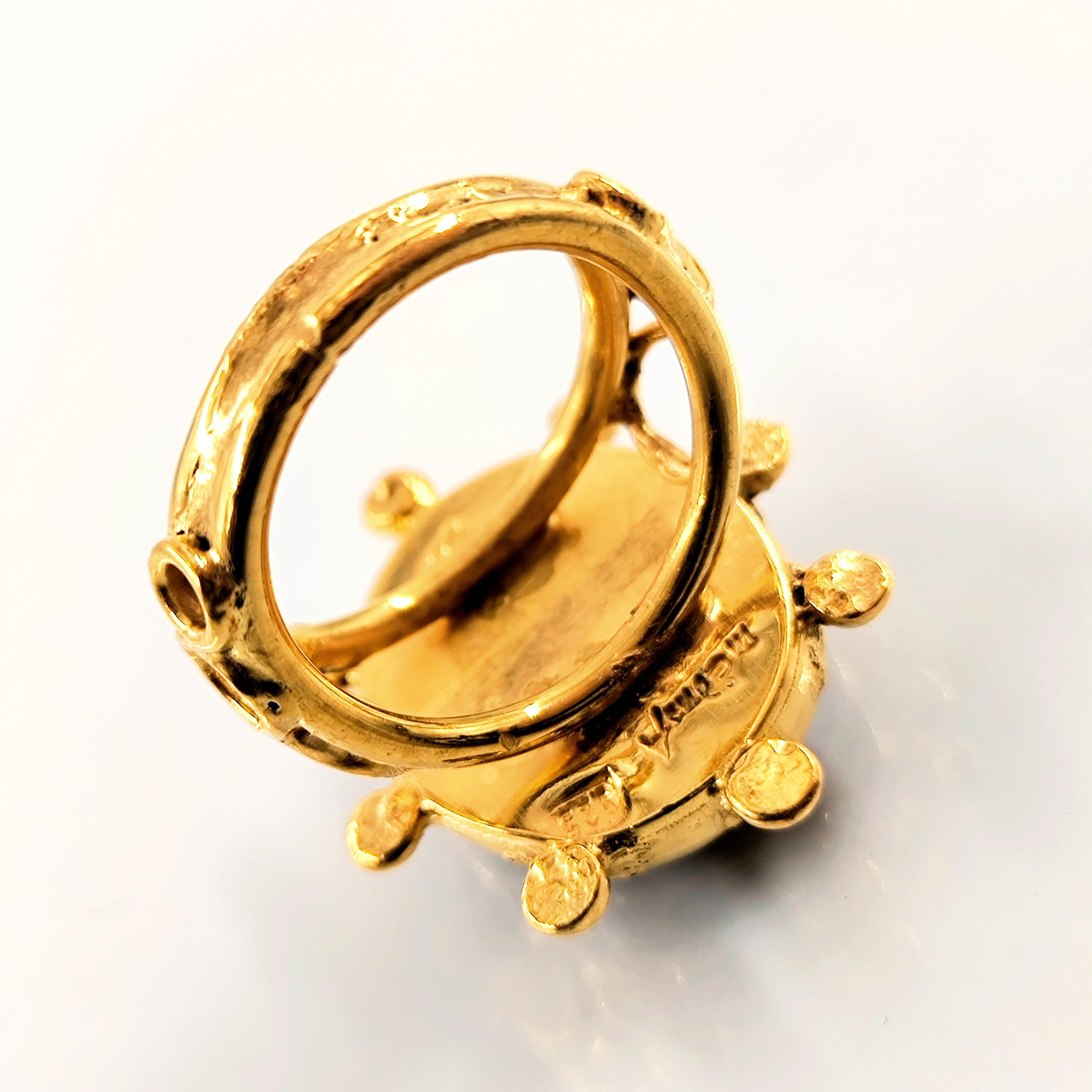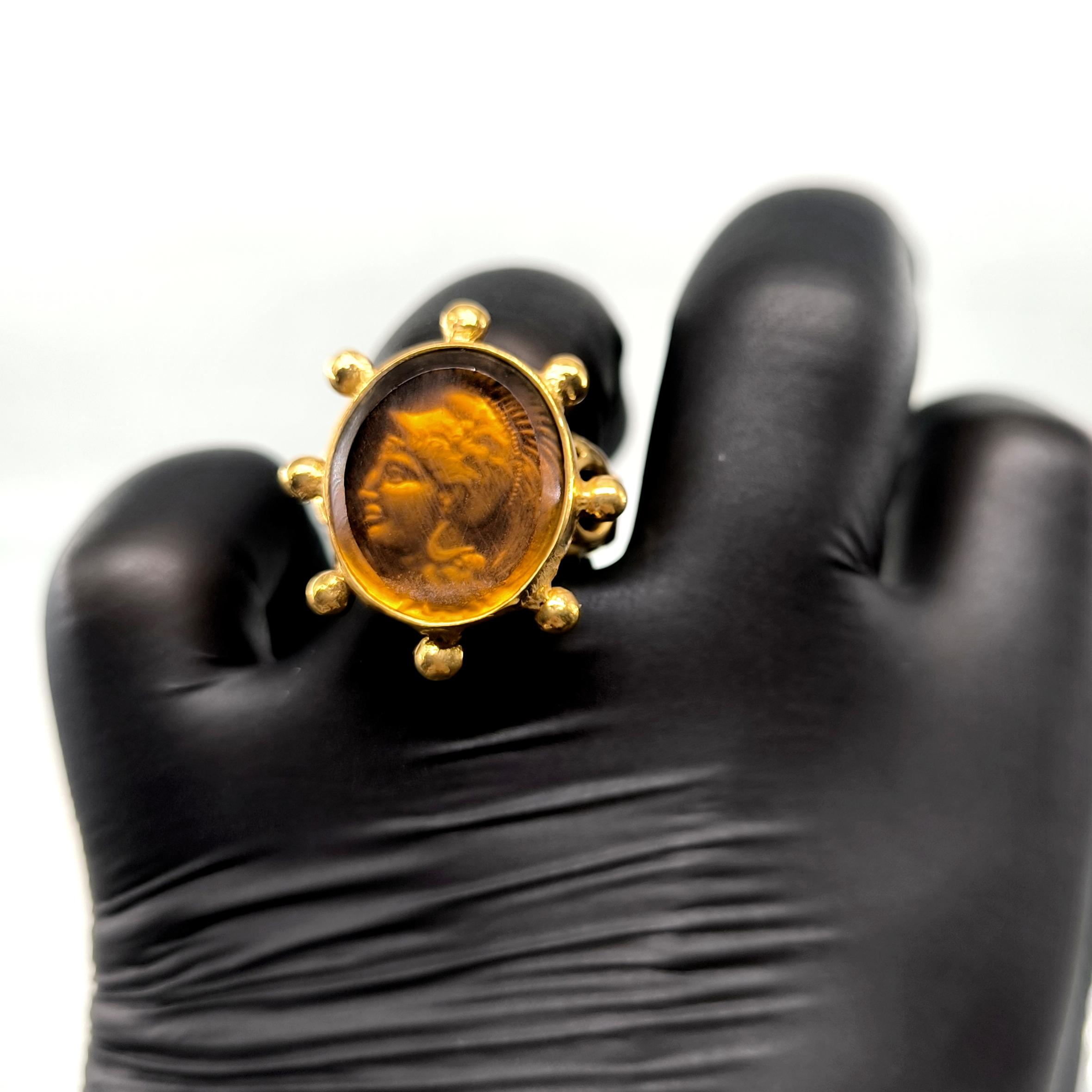 Antik dünyanın bilgelik ve koruyuculuk sembolü Athena, bu yüzükte pres tekniğiyle üretilmiş turuncu cam üzerine uygulanan negatif oyma intaglio tekniğiyle yeniden yorumlandı; oyma işlemi camın arka yüzünden yapıldığı için figür üstten bakıldığında derinlikli ve üç boyutlu bir etki kazanırken, altına yerleştirdiğim özel foya sayesinde turuncu tonlar ışıkla birlikte janjanlı ve canlı bir karaktere bürünüyor. Antik stil anlayışla tasarlanan gümüş gövde, yüzüğü yalnızca bir takı değil, ışıkla yaşayan bir sanat nesnesi hâline getirirken, camın şeffaflığı içinde beliren Athena kabartması her açıdan farklı bir ifade sunuyor; teknik ustalık ile tarihsel referansın buluştuğu bu parça, hem koleksiyonluk hem de güçlü bir görsel anlatım taşıyan özgün bir eser niteliğinde.