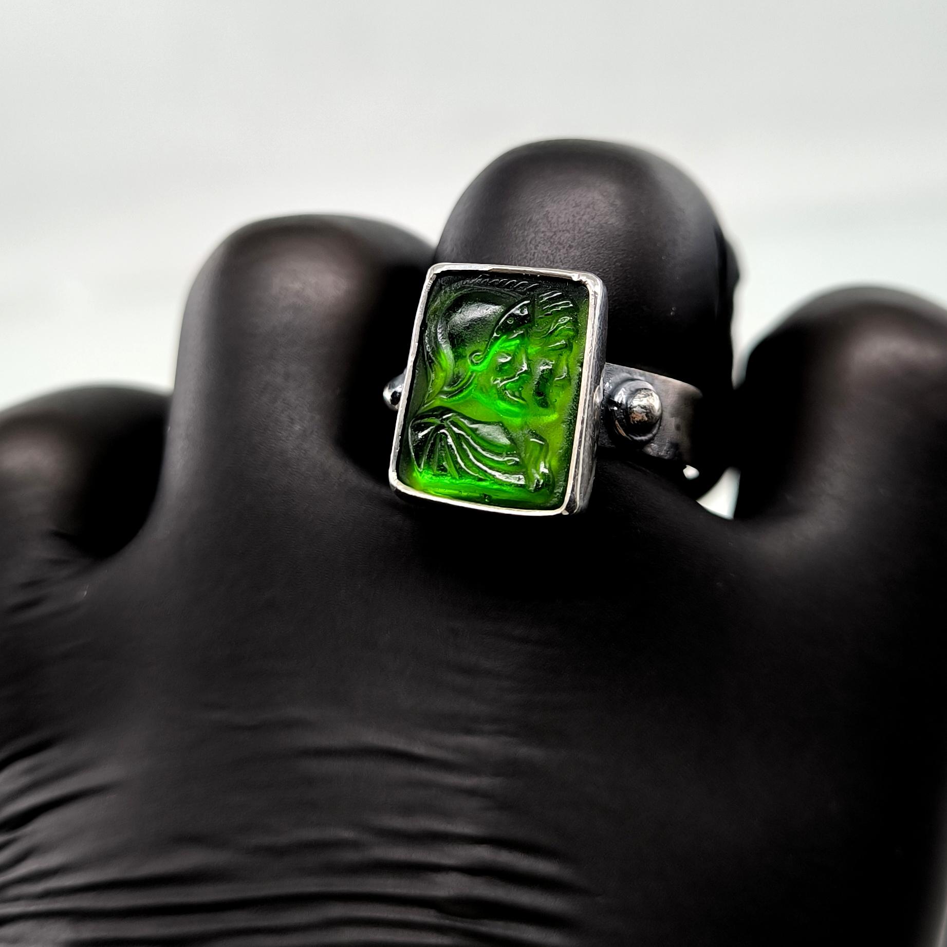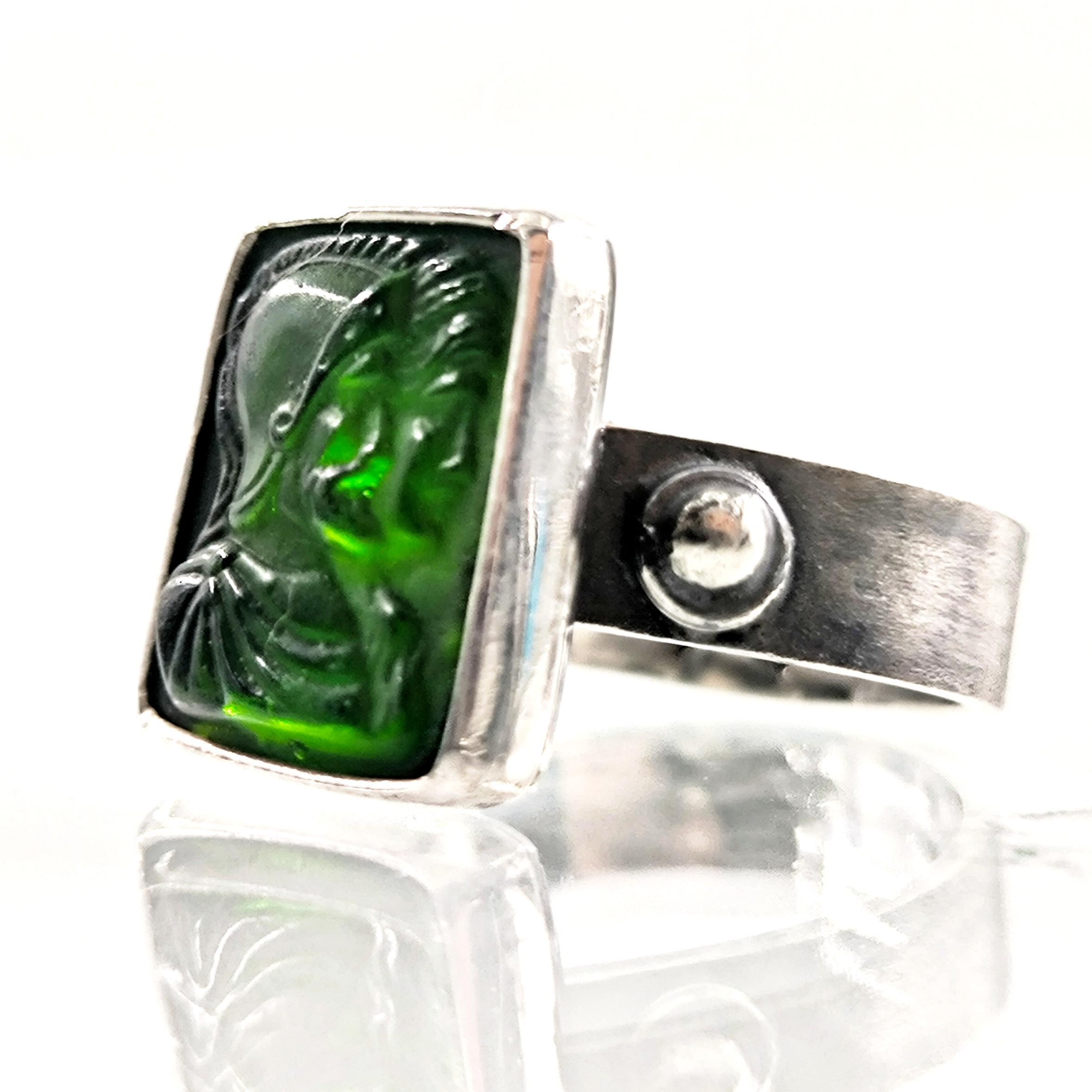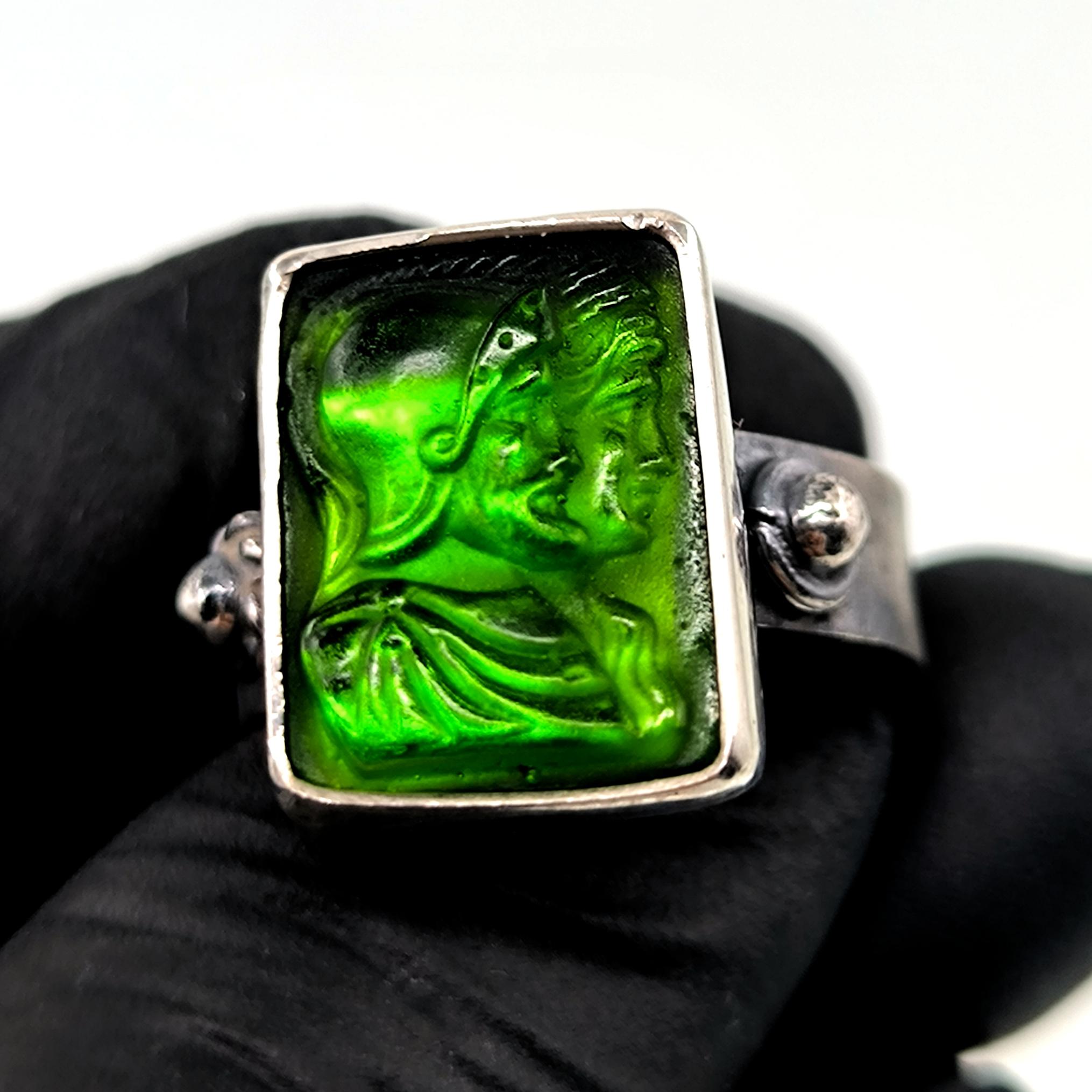 Bu yüzük 925 ayar gümüşten el işçiliğiyle üretilmiş olup, merkezinde pres tekniğiyle şekillendirilmiş yeşil cam üzerine uygulanan antik Mars (savaş tanrısı) ve Venüs (aşk tanrıçası) kabartmasını taşımaktadır; camın altına yerleştirilen özel foya sayesinde ışıkla birlikte derinlik kazanan yeşil tonlar janjanlı bir etki oluşturur ve figürlerin yüzeyde daha canlı, neredeyse üç boyutlu algılanmasını sağlar; antik dönem gem oymalarından ilham alan bu çalışma, mitolojik gücü ve estetik dengeyi bir araya getiren karakterli bir yüzük formu sunar.
