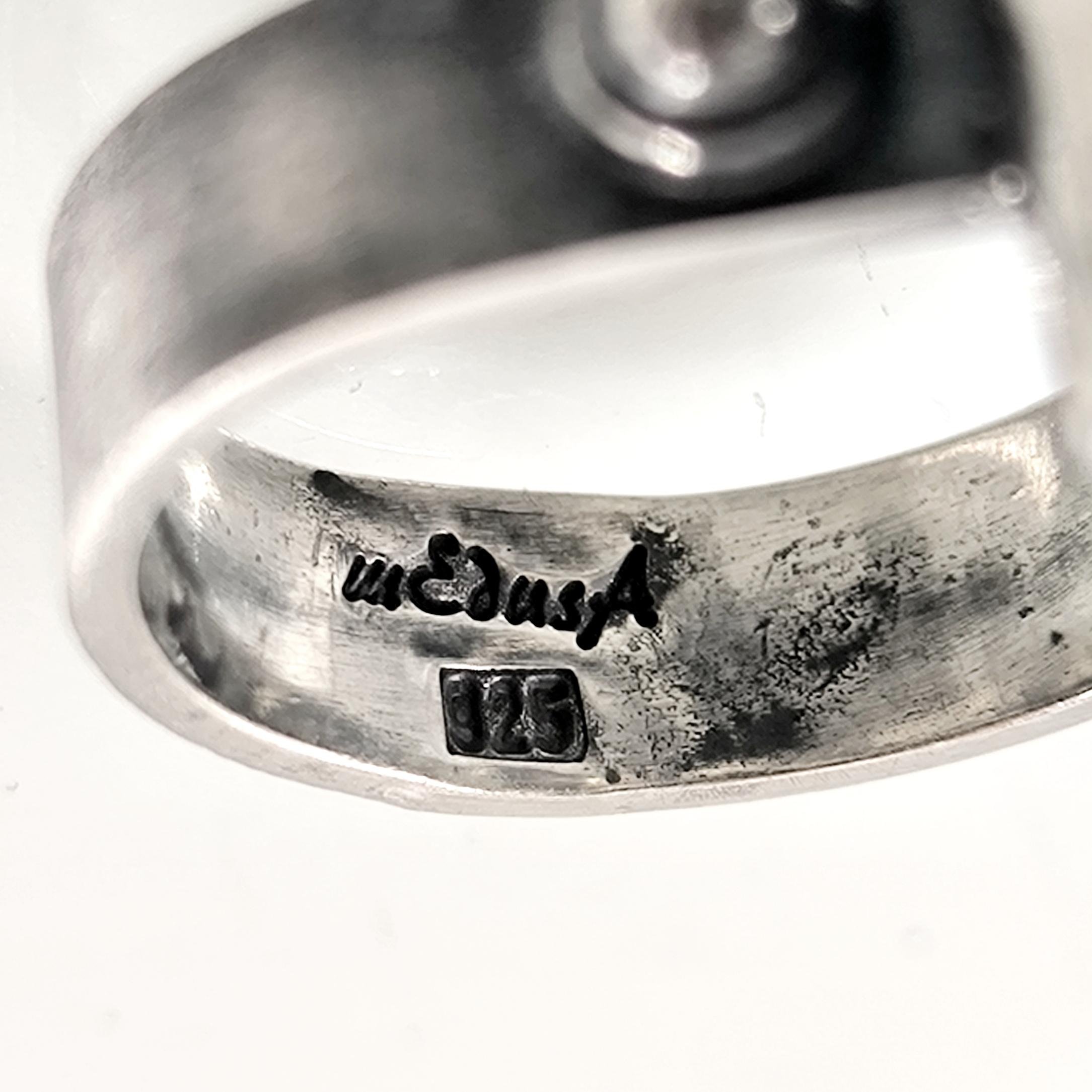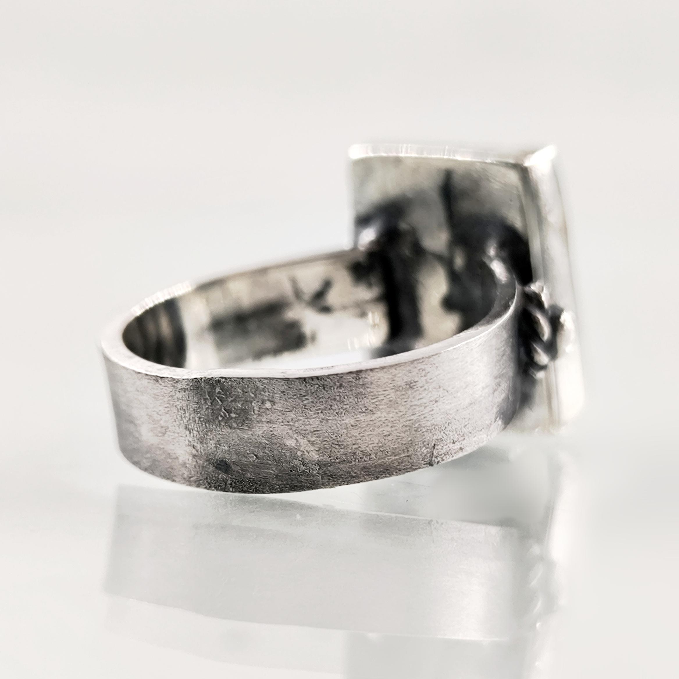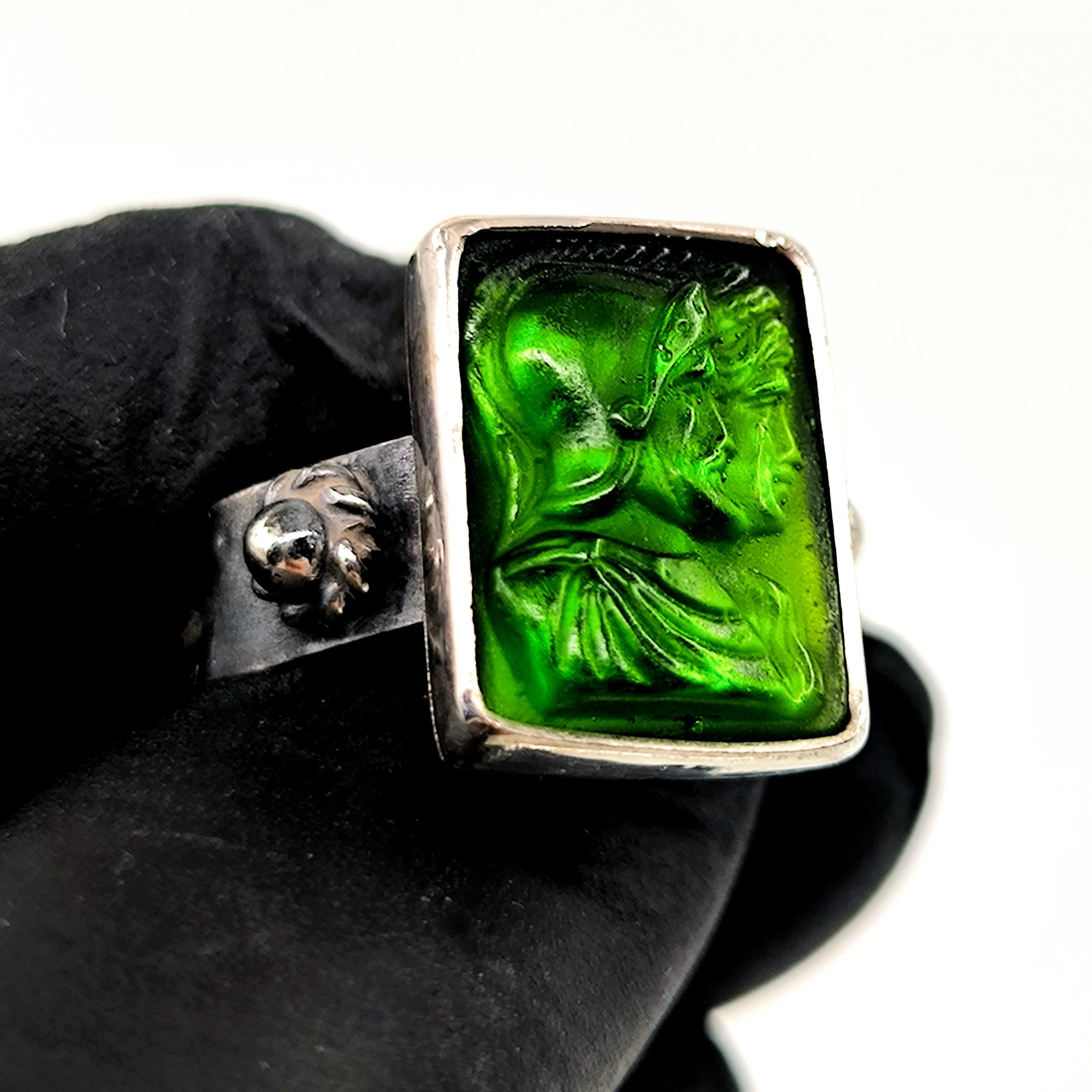 Bu yüzük 925 ayar gümüşten el işçiliğiyle üretilmiş olup, merkezinde pres tekniğiyle şekillendirilmiş yeşil cam üzerine uygulanan antik Mars (savaş tanrısı) ve Venüs (aşk tanrıçası) kabartmasını taşımaktadır; camın altına yerleştirilen özel foya sayesinde ışıkla birlikte derinlik kazanan yeşil tonlar janjanlı bir etki oluşturur ve figürlerin yüzeyde daha canlı, neredeyse üç boyutlu algılanmasını sağlar; antik dönem gem oymalarından ilham alan bu çalışma, mitolojik gücü ve estetik dengeyi bir araya getiren karakterli bir yüzük formu sunar.