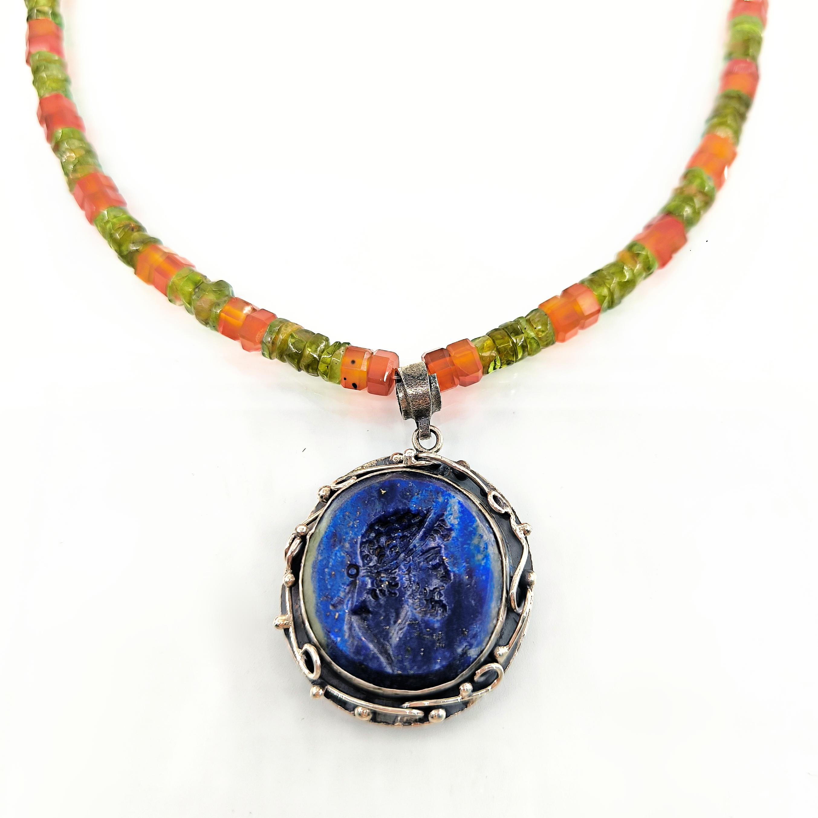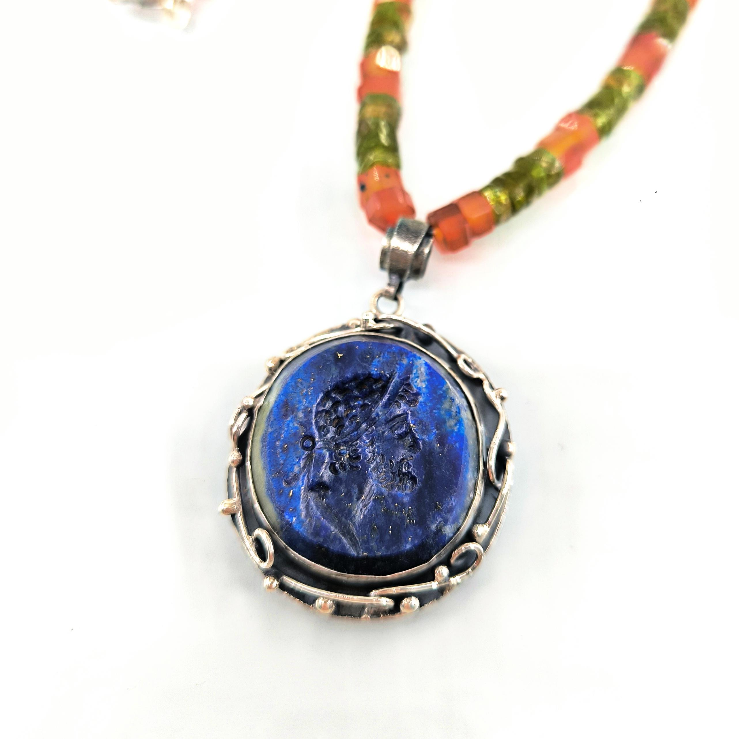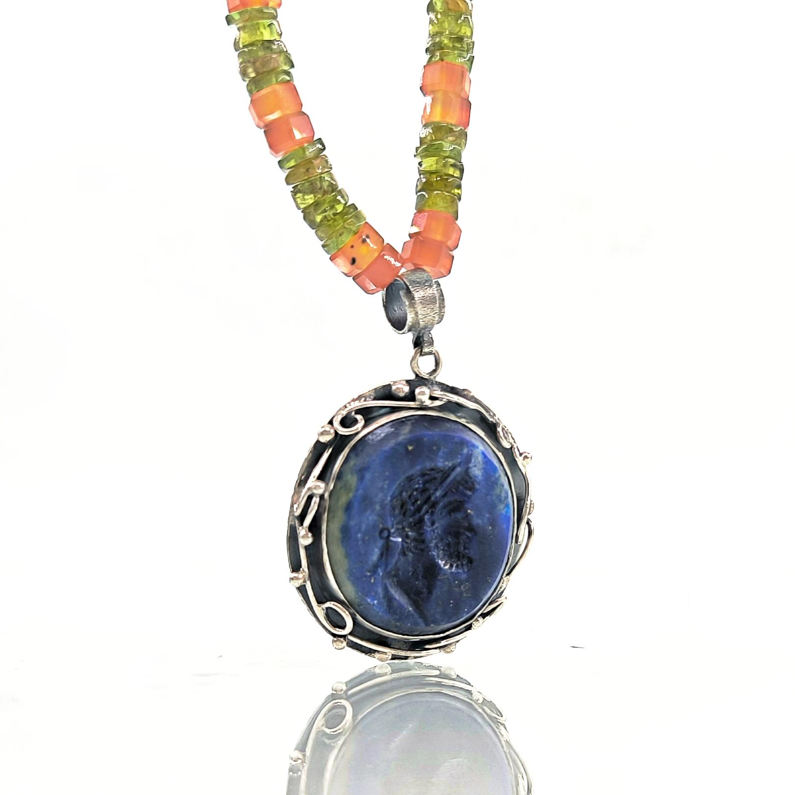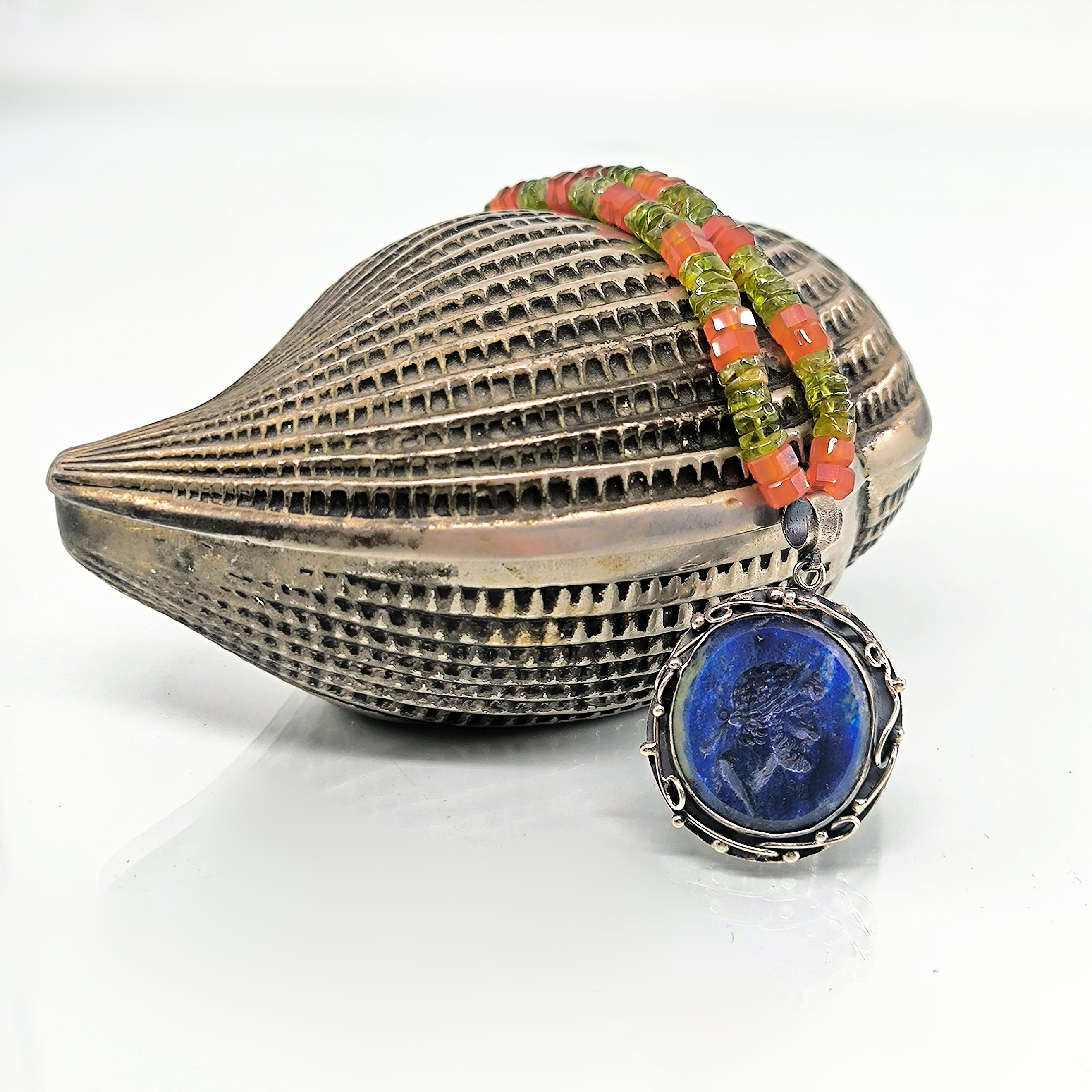 Tarih boyunca gücün, asaletin ve bilgelik mirasının simgesi olan soylu figürler, bugün hâlâ ruhuyla yaşamaya devam eder. Bu kolyede, lapis lazulinin derin gece mavisi üzerine el oyma intaglio tekniğiyle işlediğim antik bir Roma soylusunun portresi, geçmişin ihtişamlı sesini yeniden canlandırıyor. Mavinin sonsuzluğuyla birleşen yüz hatları, taşıdığı bilgeliğin ve hükümranlığın çağrısını fısıldıyor. Zincir bölümünde faset kesim akik taşın koruyucu enerjisiyle peridot taşın canlı, taze nefesi yan yana kullanıldı; böylece güç, huzur ve dönüşüm tek bir ruh içinde buluştu. El işçiliği gümüş çerçeve ise bu hikâyeyi zamansız bir hazineye dönüştürdü.
