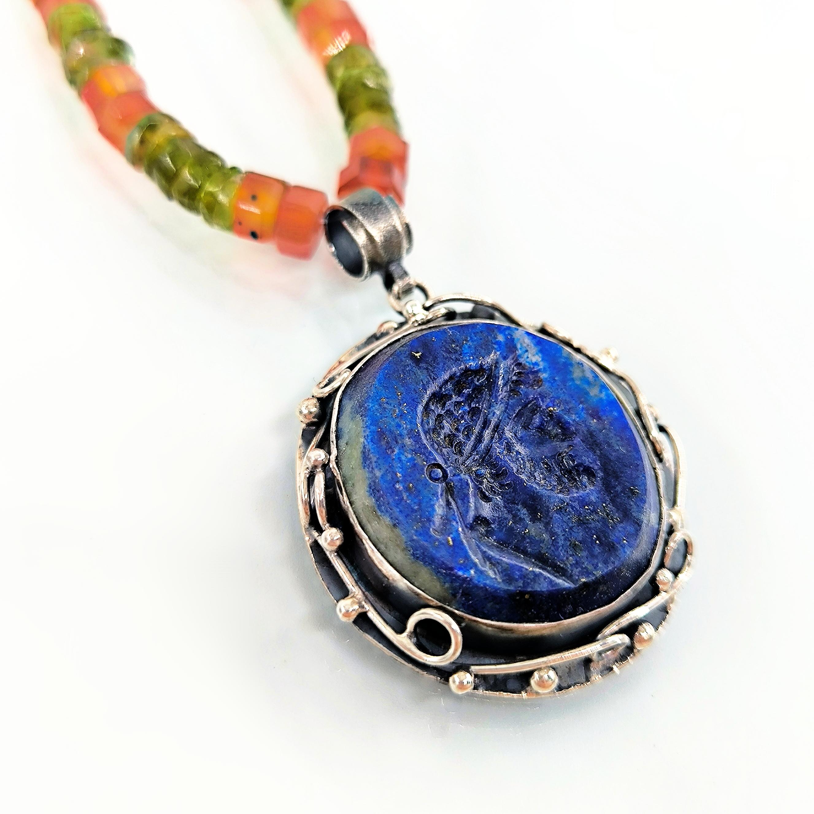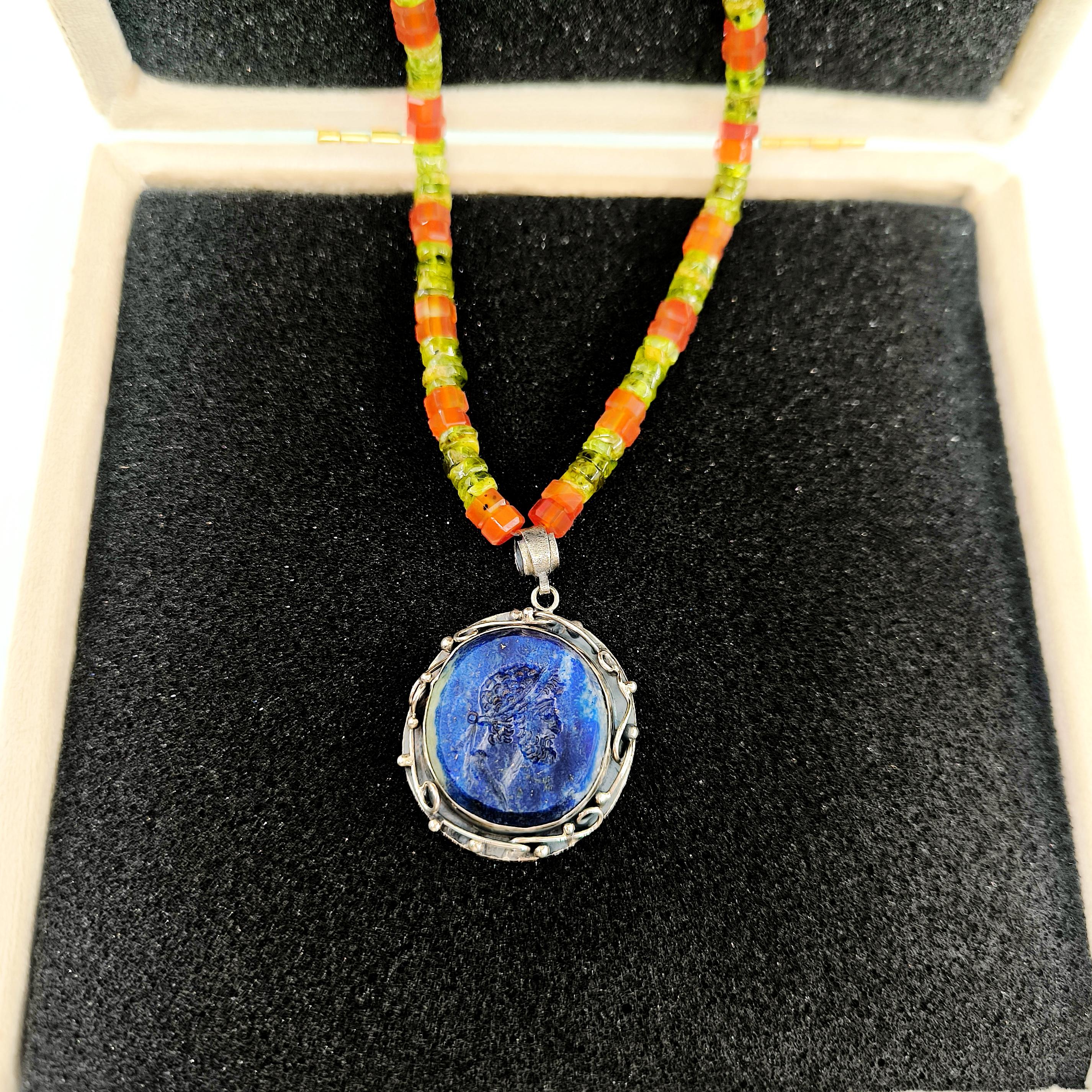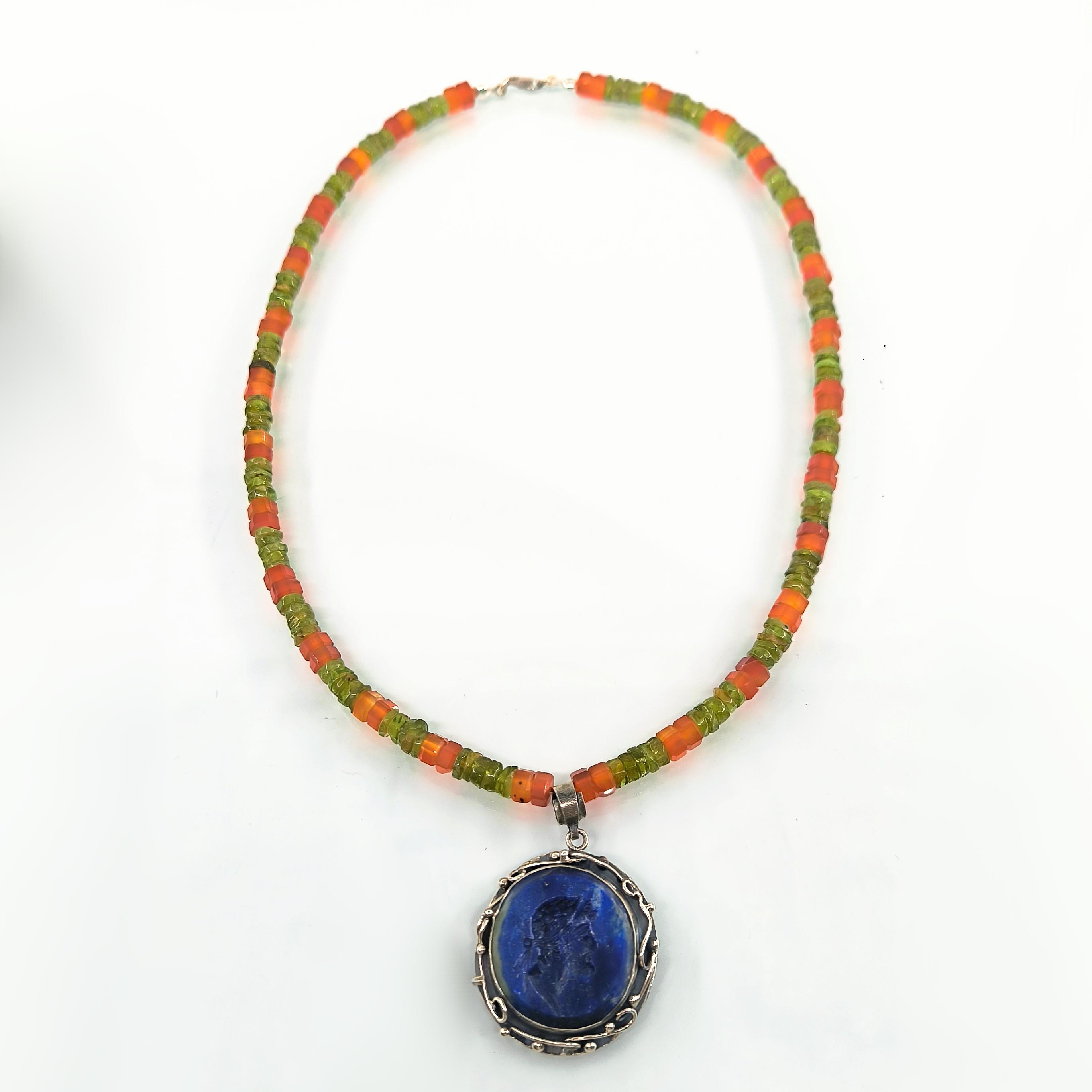 Tarih boyunca gücün, asaletin ve bilgelik mirasının simgesi olan soylu figürler, bugün hâlâ ruhuyla yaşamaya devam eder. Bu kolyede, lapis lazulinin derin gece mavisi üzerine el oyma intaglio tekniğiyle işlediğim antik bir Roma soylusunun portresi, geçmişin ihtişamlı sesini yeniden canlandırıyor. Mavinin sonsuzluğuyla birleşen yüz hatları, taşıdığı bilgeliğin ve hükümranlığın çağrısını fısıldıyor. Zincir bölümünde faset kesim akik taşın koruyucu enerjisiyle peridot taşın canlı, taze nefesi yan yana kullanıldı; böylece güç, huzur ve dönüşüm tek bir ruh içinde buluştu. El işçiliği gümüş çerçeve ise bu hikâyeyi zamansız bir hazineye dönüştürdü.