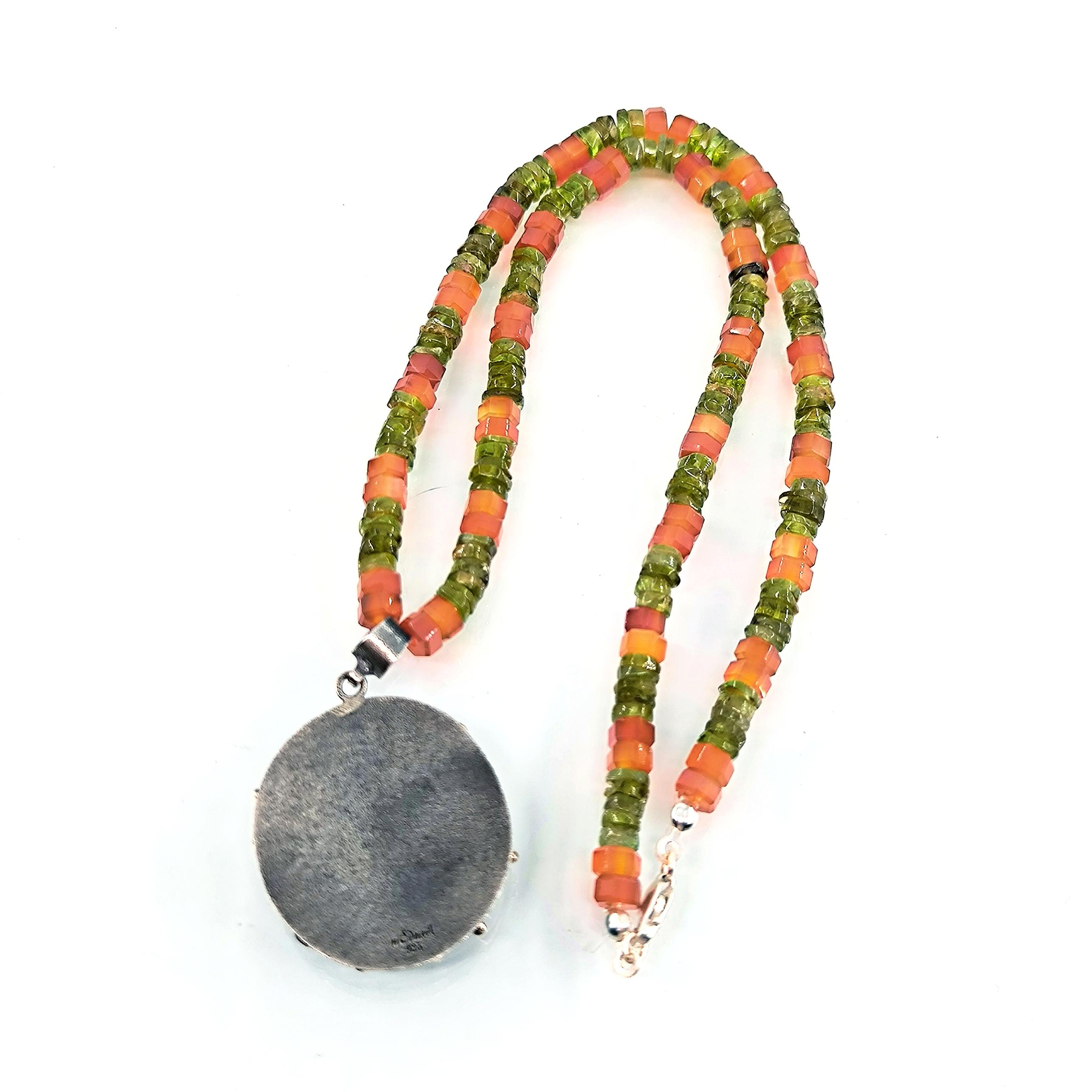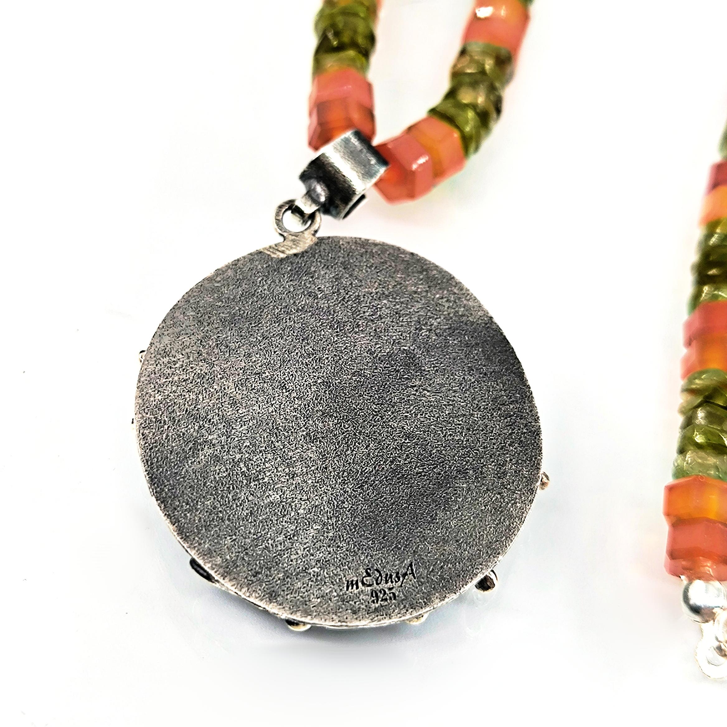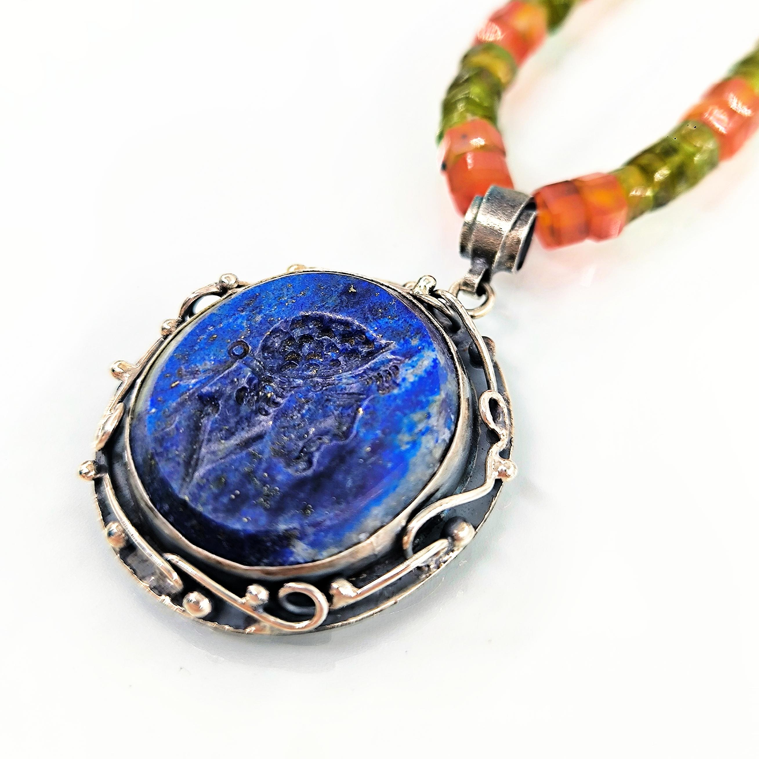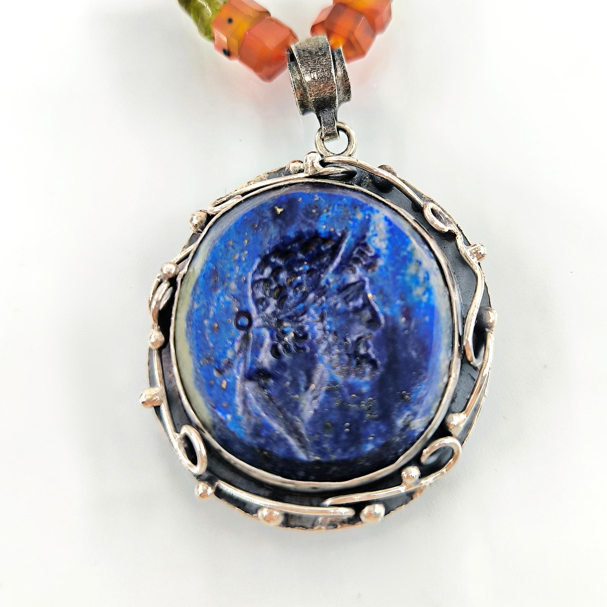 Tarih boyunca gücün, asaletin ve bilgelik mirasının simgesi olan soylu figürler, bugün hâlâ ruhuyla yaşamaya devam eder. Bu kolyede, lapis lazulinin derin gece mavisi üzerine el oyma intaglio tekniğiyle işlediğim antik bir Roma soylusunun portresi, geçmişin ihtişamlı sesini yeniden canlandırıyor. Mavinin sonsuzluğuyla birleşen yüz hatları, taşıdığı bilgeliğin ve hükümranlığın çağrısını fısıldıyor. Zincir bölümünde faset kesim akik taşın koruyucu enerjisiyle peridot taşın canlı, taze nefesi yan yana kullanıldı; böylece güç, huzur ve dönüşüm tek bir ruh içinde buluştu. El işçiliği gümüş çerçeve ise bu hikâyeyi zamansız bir hazineye dönüştürdü.