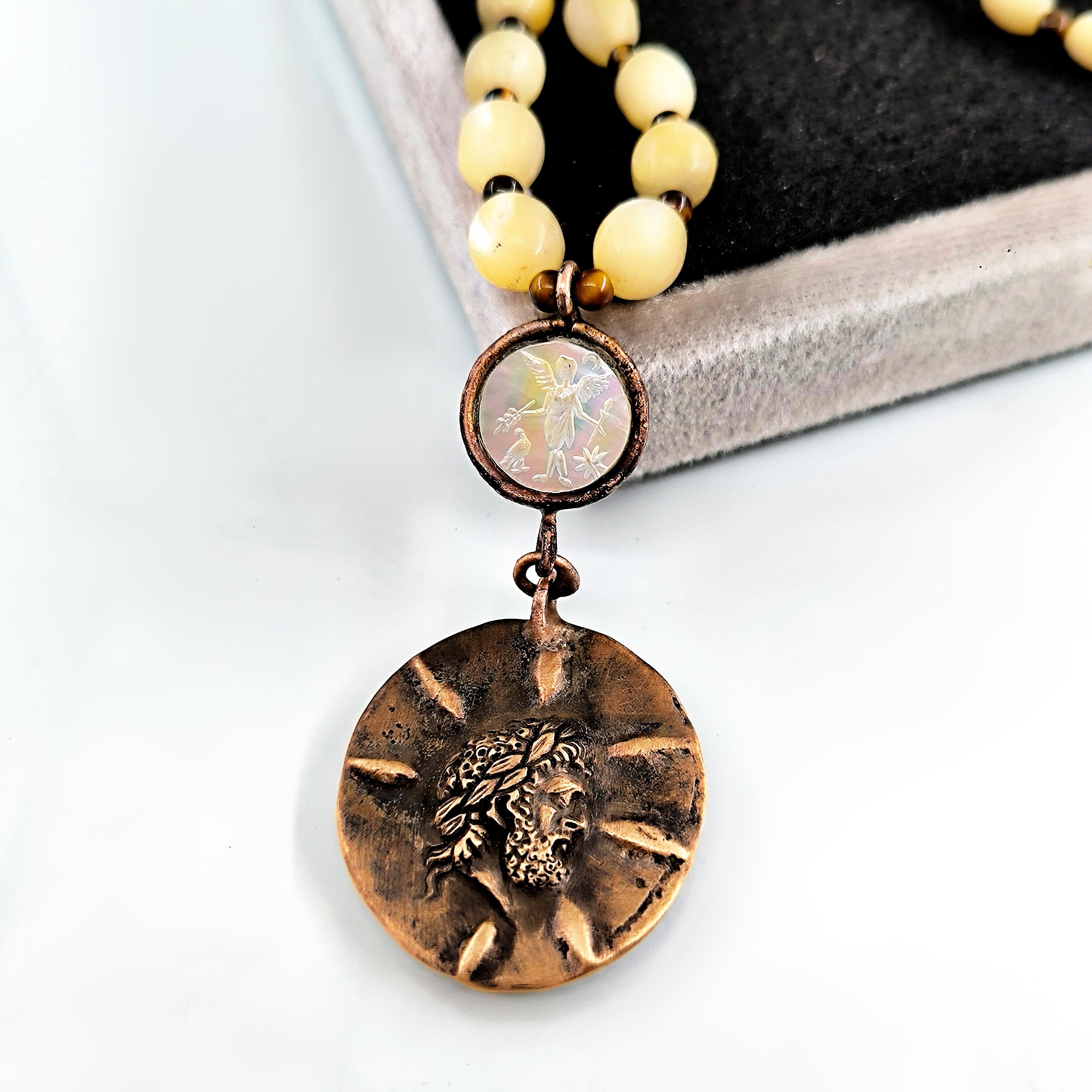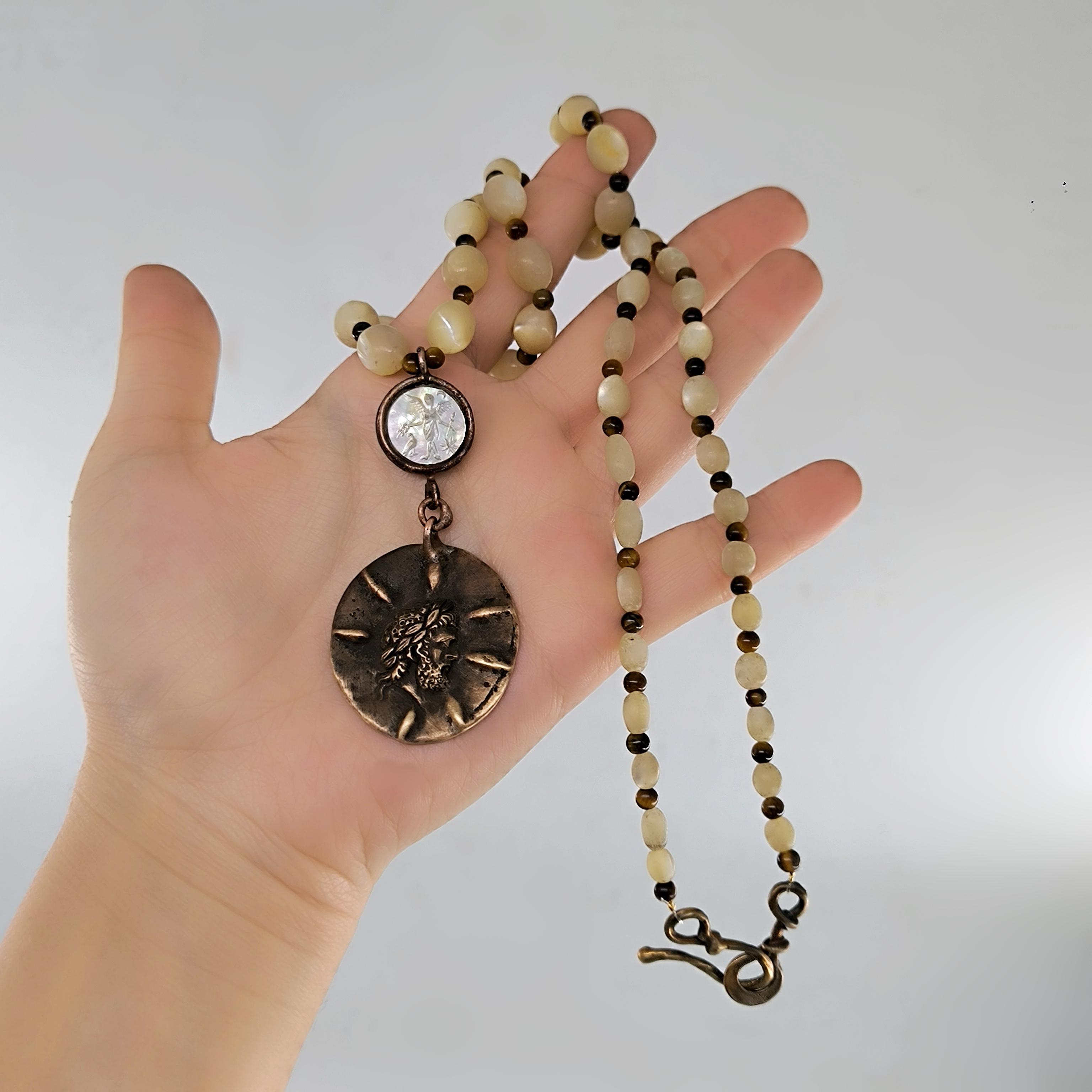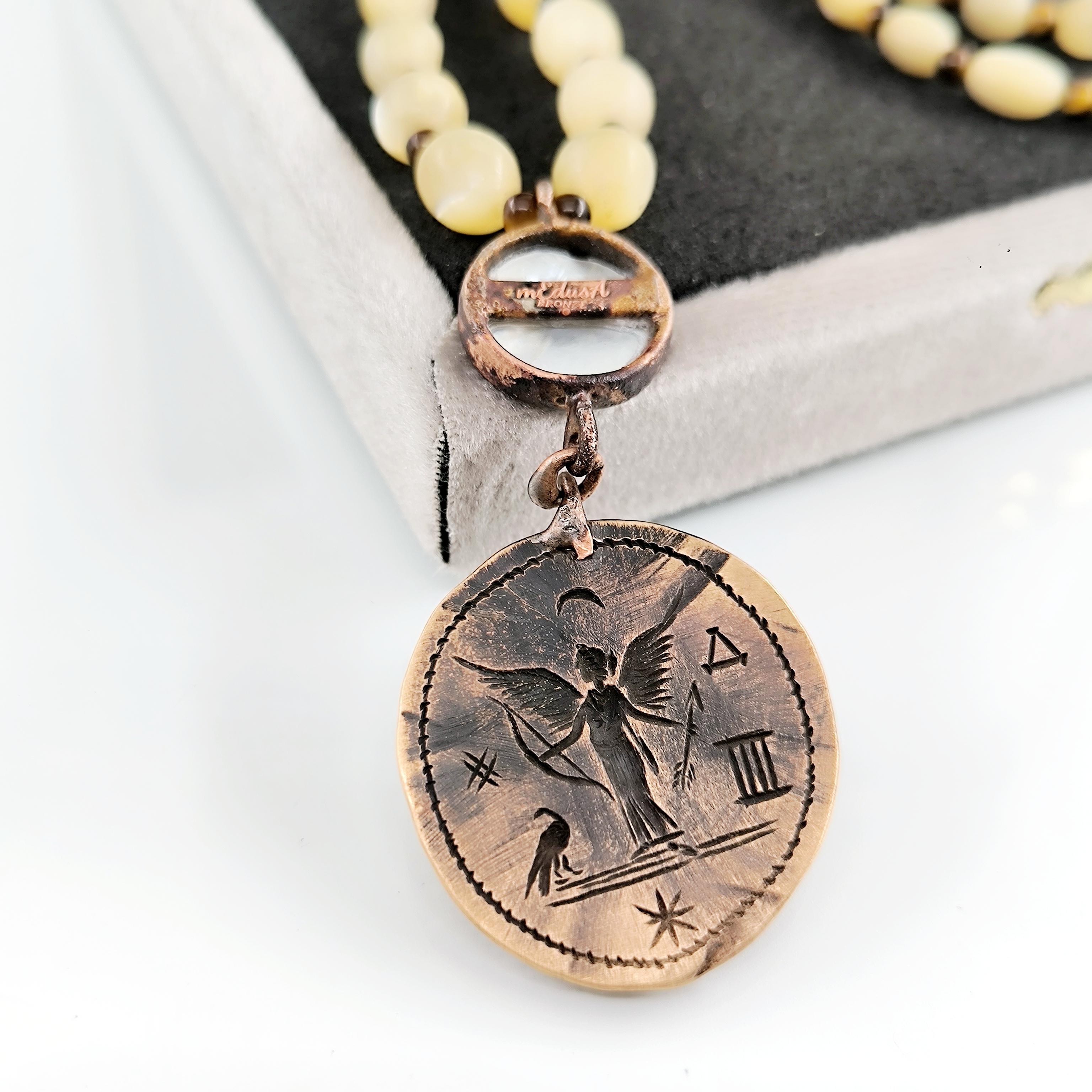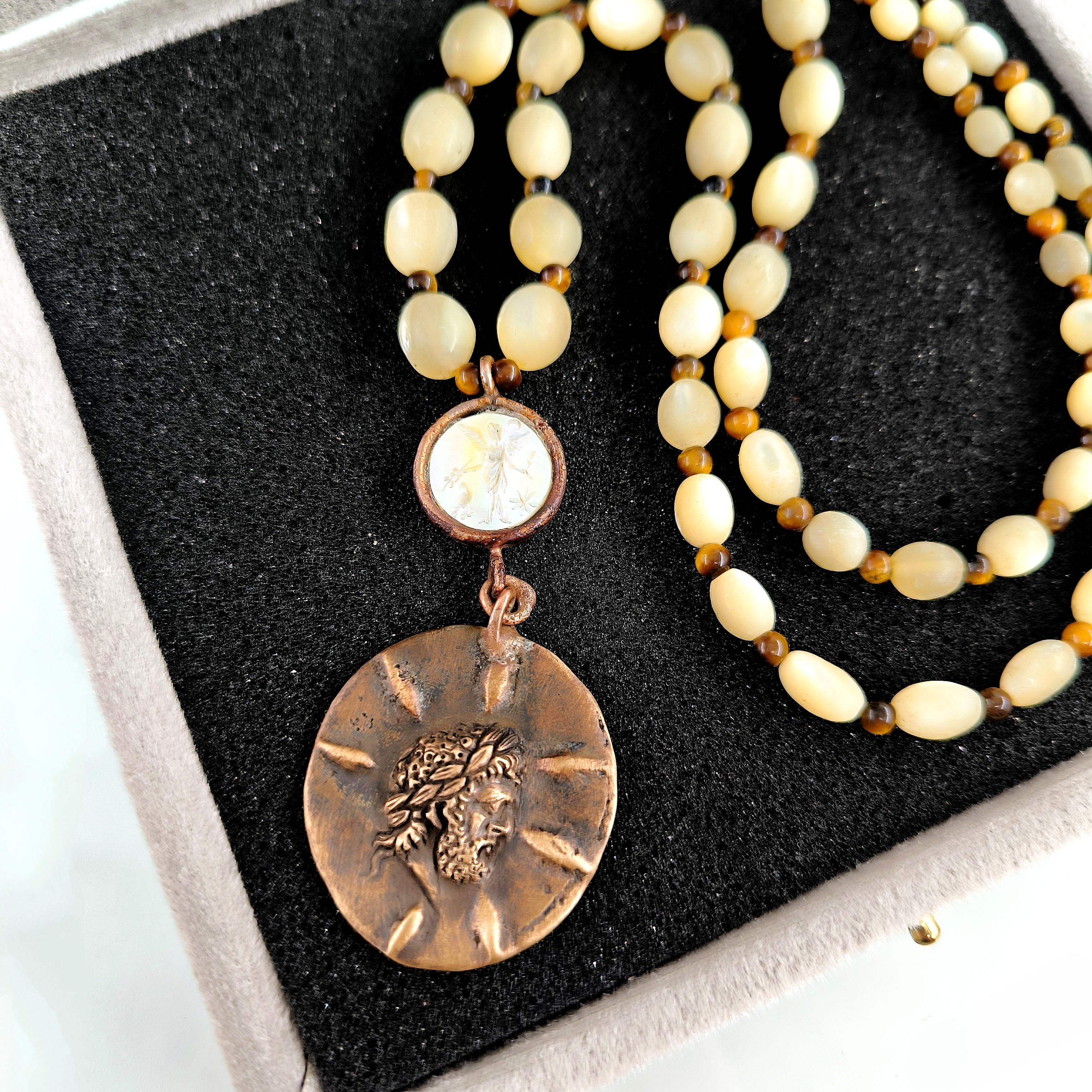 Antik Roma’da gücün ve asaletin sembolü olan aristokrat yüzü, bronz üzerine el işçiliğiyle kabartma olarak işlendi; geçmişin görkemli imparatorluklarının izlerini bugüne taşıyan zamansız bir hatıra niteliğinde. Sedef üzerine oyulmuş kanatlı tanrıça figürü ise hem ön yüzde hem de bronz plakanın arka kısmında gizli bir tılsım gibi yer alarak koruyucu ve rehberlik eden enerjiyi simgeler. Tanrıçanın kanatları, yolunu arayan ruhlara yön gösteren ilahi ışığı temsil ederken, antika sedef dizilim zincir saadet ve bereket anlamını taşır. Gerdanlık antika sedef dizilim zincir, bronz üzerine Roma soylu portresi kabartması, sedef üzeri kanatlı tanrıça intagliosu ve bronz arka yüzde ikinci tanrıça oymasıyla tasarlanmıştır. Ayrıca sedefin aralıklarıda kaplangözü taş ile dekore edilmiştir.