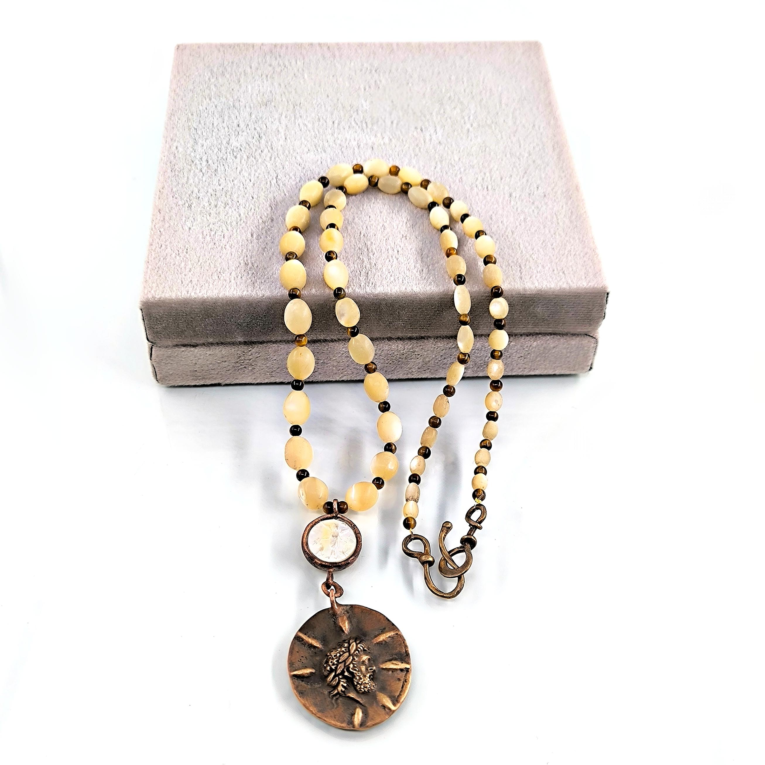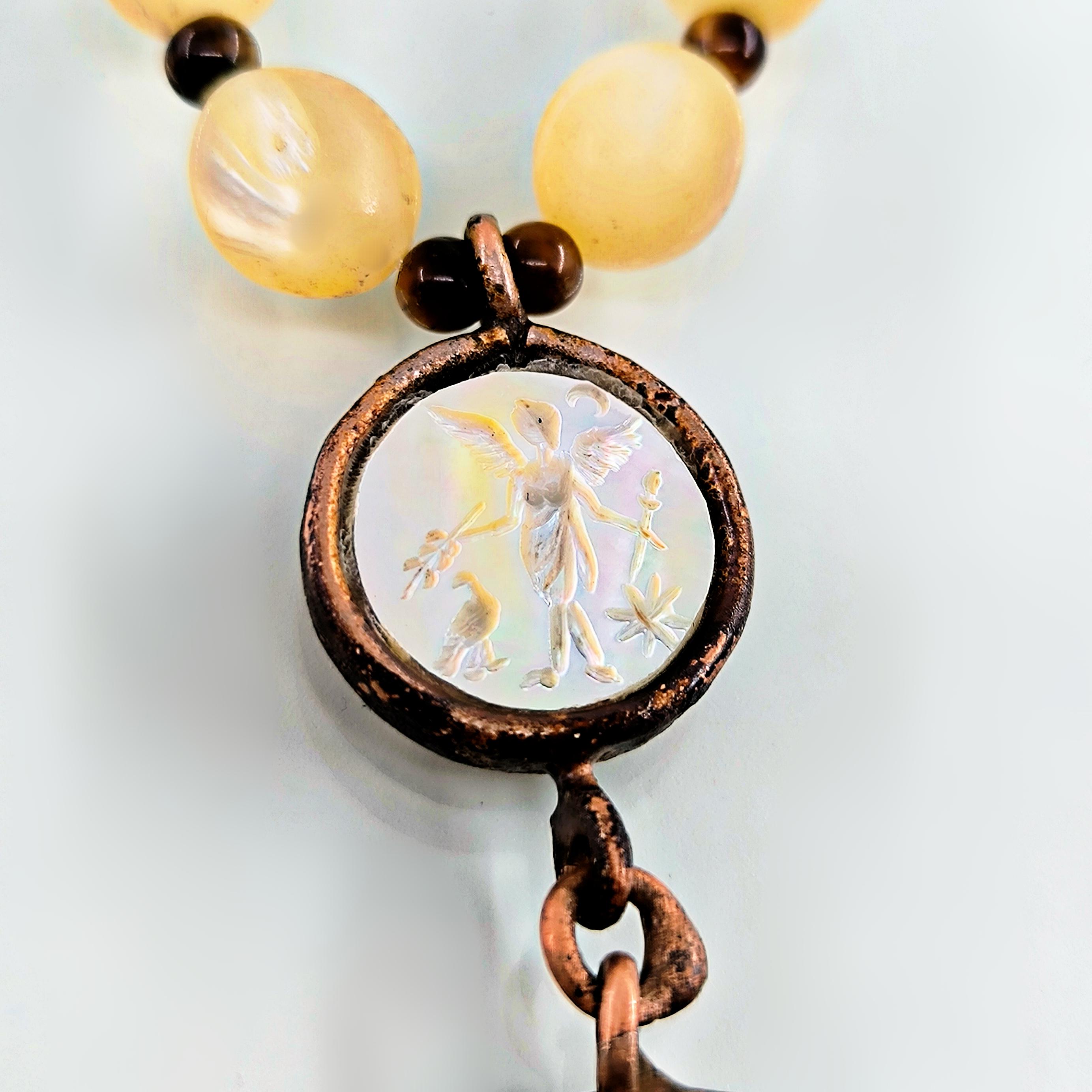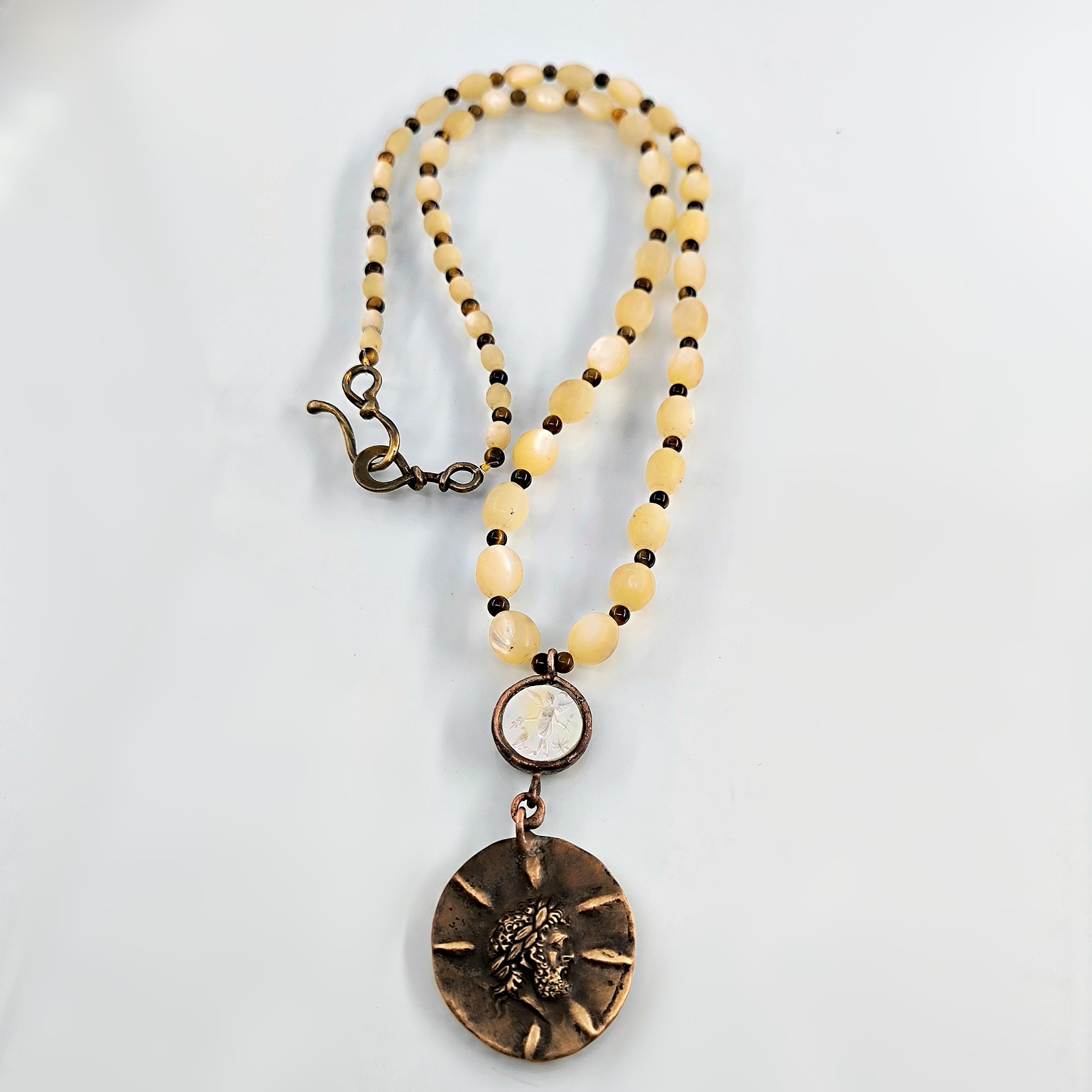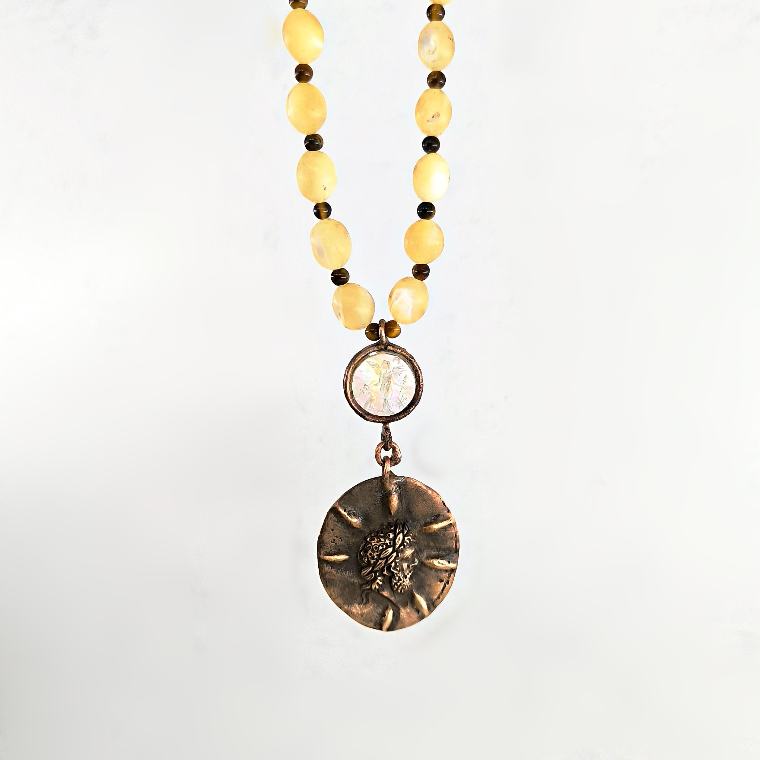 Antik Roma’da gücün ve asaletin sembolü olan aristokrat yüzü, bronz üzerine el işçiliğiyle kabartma olarak işlendi; geçmişin görkemli imparatorluklarının izlerini bugüne taşıyan zamansız bir hatıra niteliğinde. Sedef üzerine oyulmuş kanatlı tanrıça figürü ise hem ön yüzde hem de bronz plakanın arka kısmında gizli bir tılsım gibi yer alarak koruyucu ve rehberlik eden enerjiyi simgeler. Tanrıçanın kanatları, yolunu arayan ruhlara yön gösteren ilahi ışığı temsil ederken, antika sedef dizilim zincir saadet ve bereket anlamını taşır. Gerdanlık antika sedef dizilim zincir, bronz üzerine Roma soylu portresi kabartması, sedef üzeri kanatlı tanrıça intagliosu ve bronz arka yüzde ikinci tanrıça oymasıyla tasarlanmıştır. Ayrıca sedefin aralıklarıda kaplangözü taş ile dekore edilmiştir.