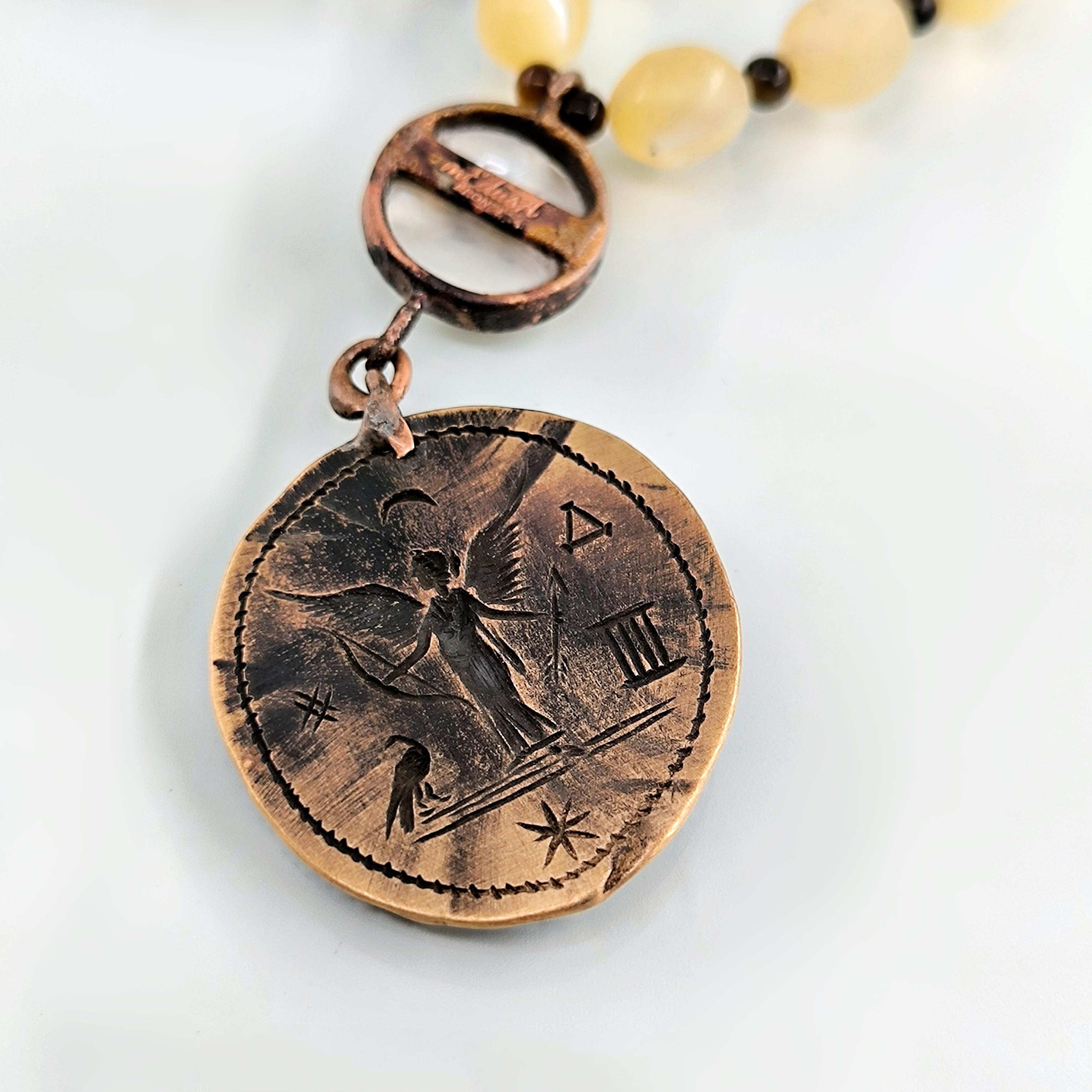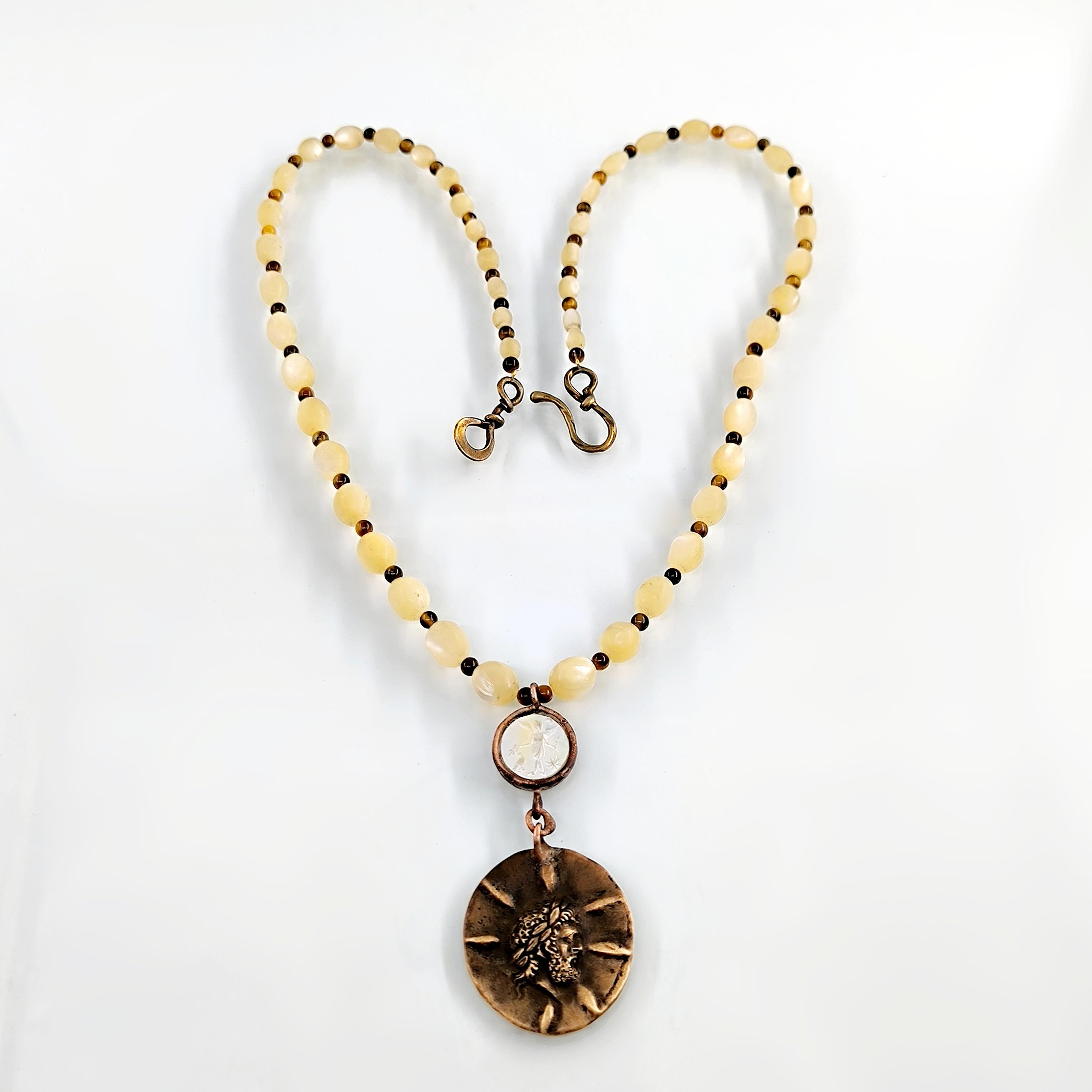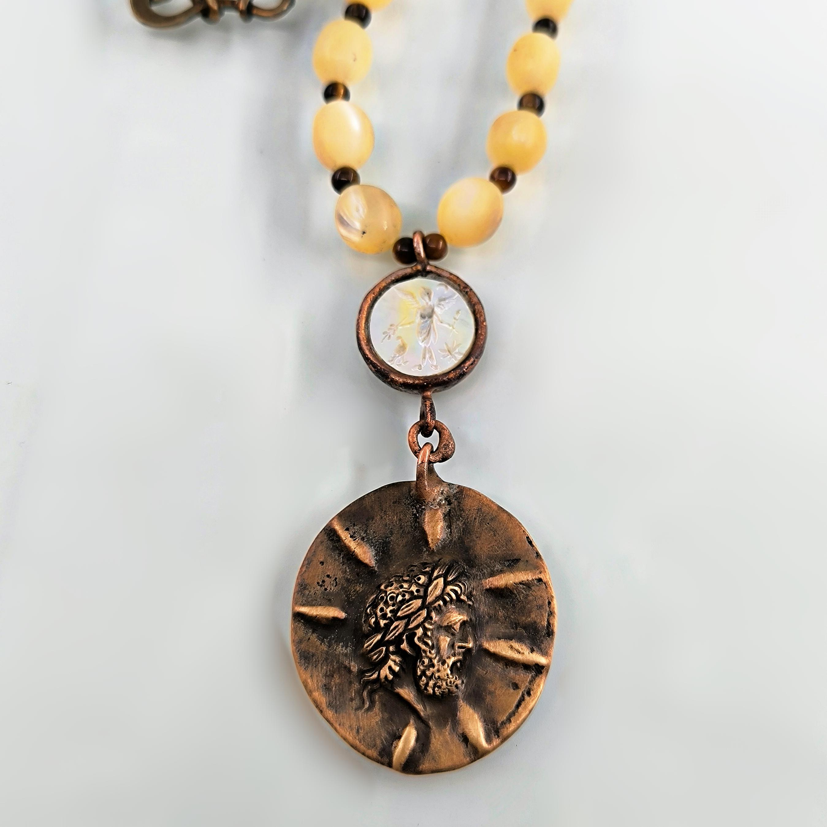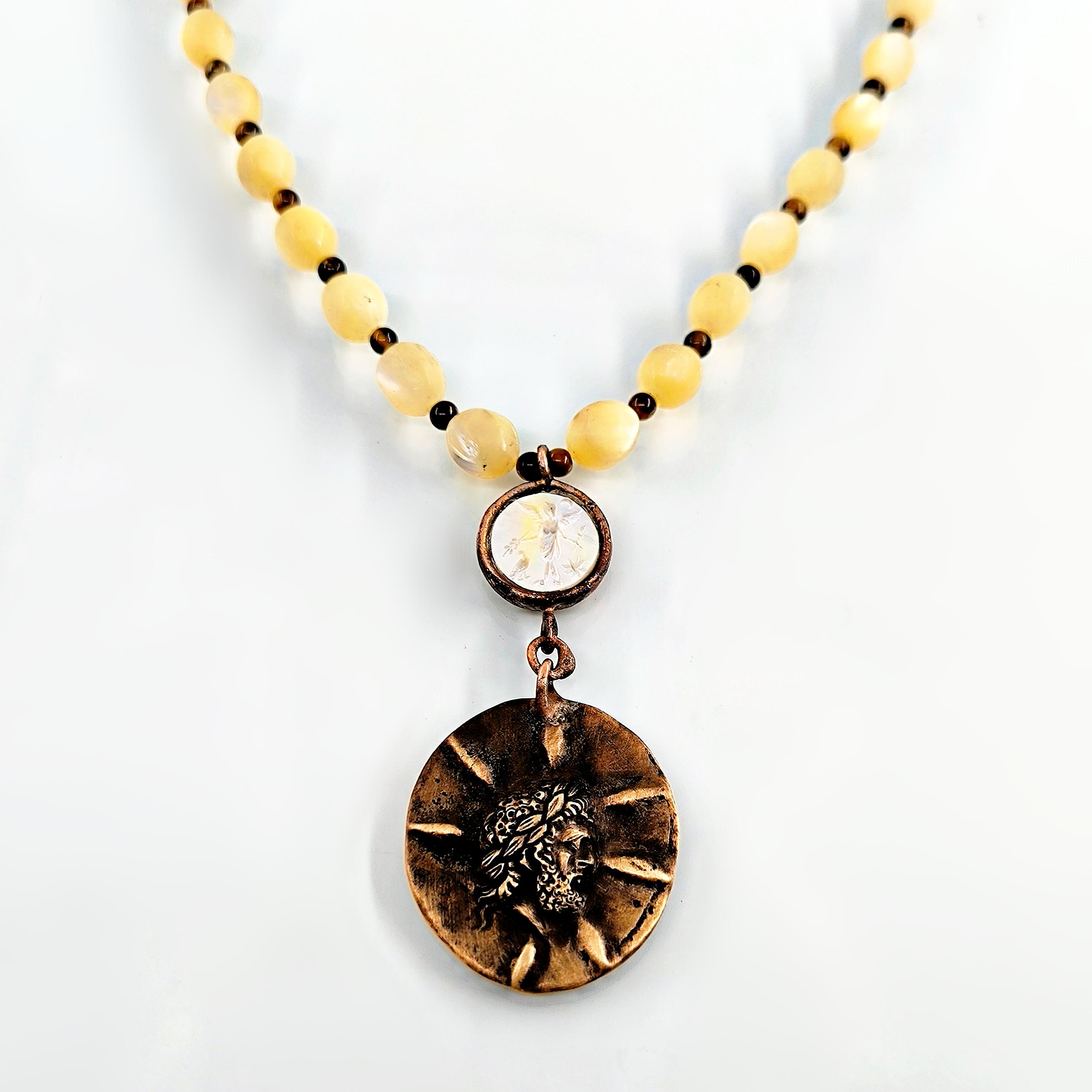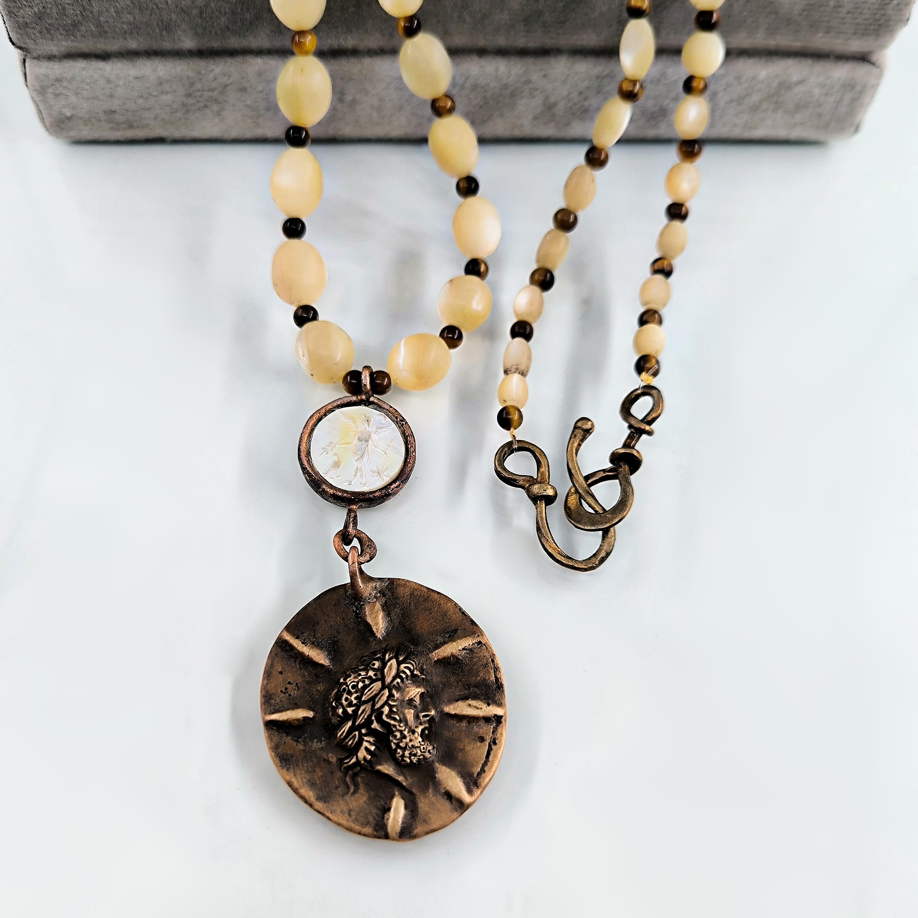 Antik Roma’da gücün ve asaletin sembolü olan aristokrat yüzü, bronz üzerine el işçiliğiyle kabartma olarak işlendi; geçmişin görkemli imparatorluklarının izlerini bugüne taşıyan zamansız bir hatıra niteliğinde. Sedef üzerine oyulmuş kanatlı tanrıça figürü ise hem ön yüzde hem de bronz plakanın arka kısmında gizli bir tılsım gibi yer alarak koruyucu ve rehberlik eden enerjiyi simgeler. Tanrıçanın kanatları, yolunu arayan ruhlara yön gösteren ilahi ışığı temsil ederken, antika sedef dizilim zincir saadet ve bereket anlamını taşır. Gerdanlık antika sedef dizilim zincir, bronz üzerine Roma soylu portresi kabartması, sedef üzeri kanatlı tanrıça intagliosu ve bronz arka yüzde ikinci tanrıça oymasıyla tasarlanmıştır. Ayrıca sedefin aralıklarıda kaplangözü taş ile dekore edilmiştir.