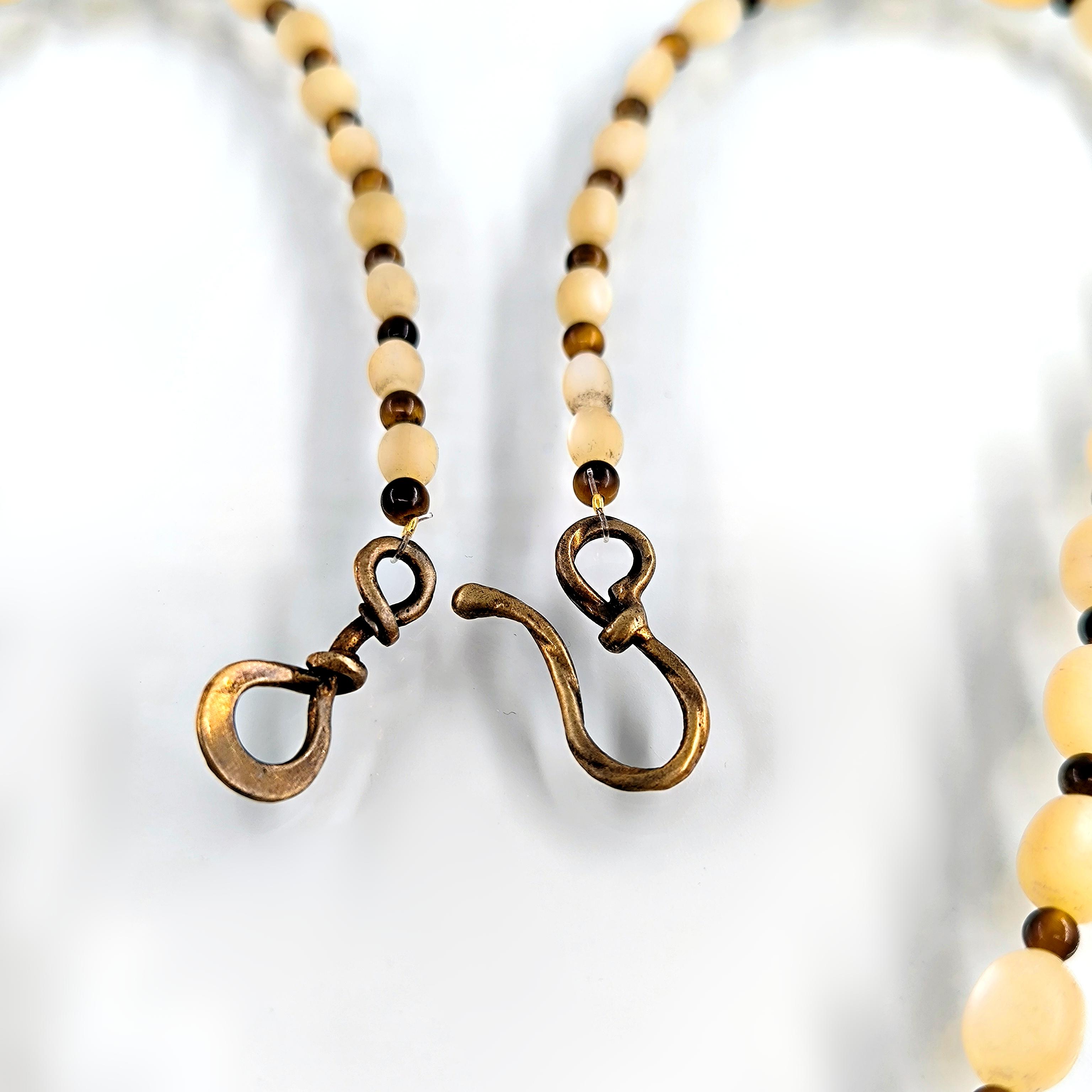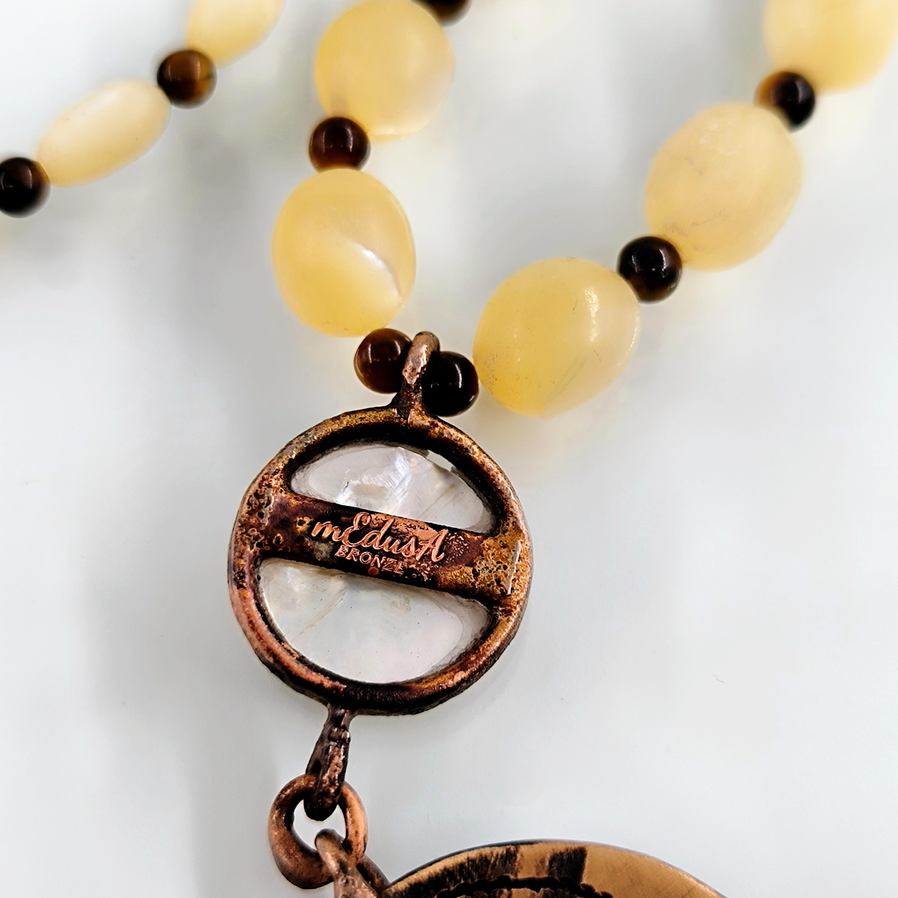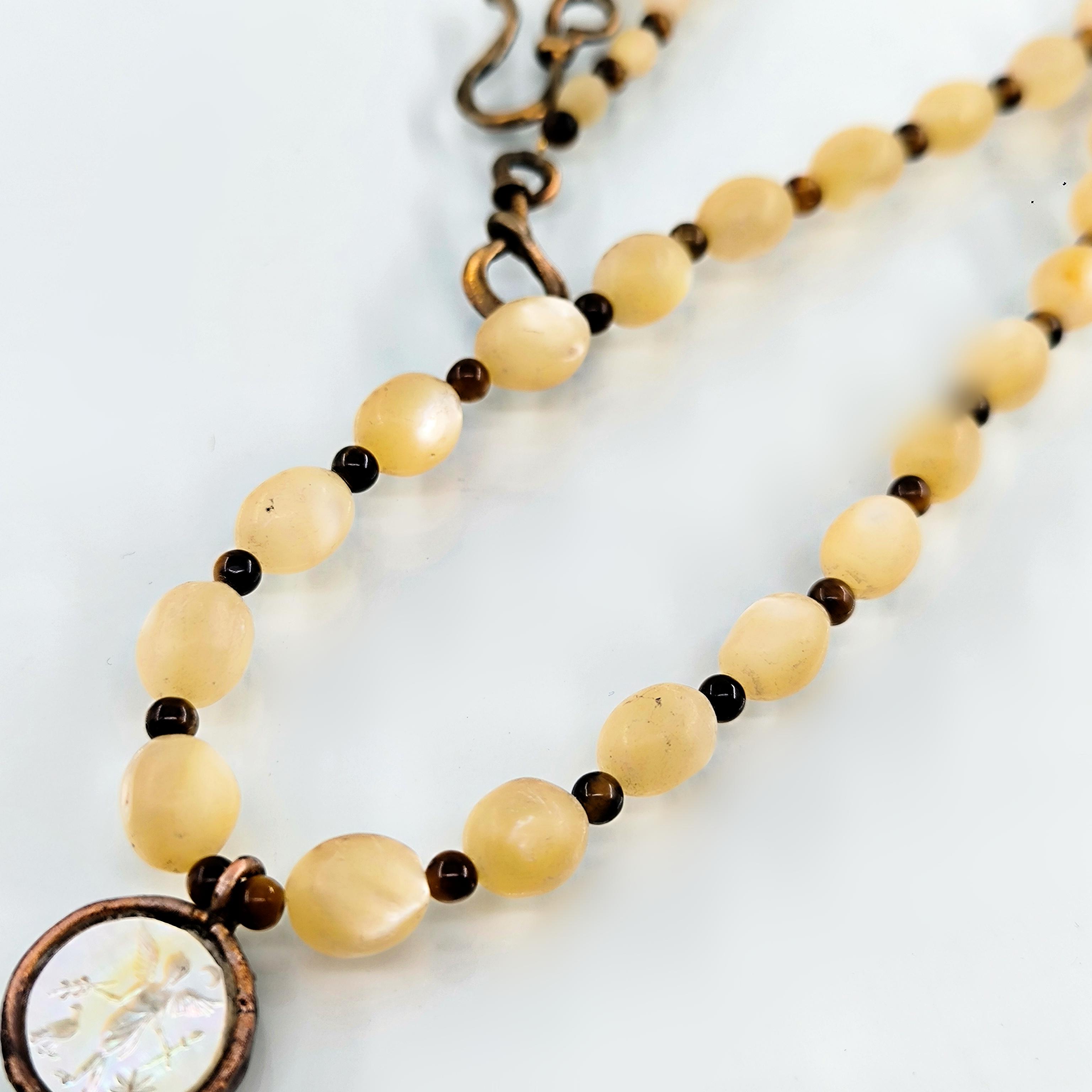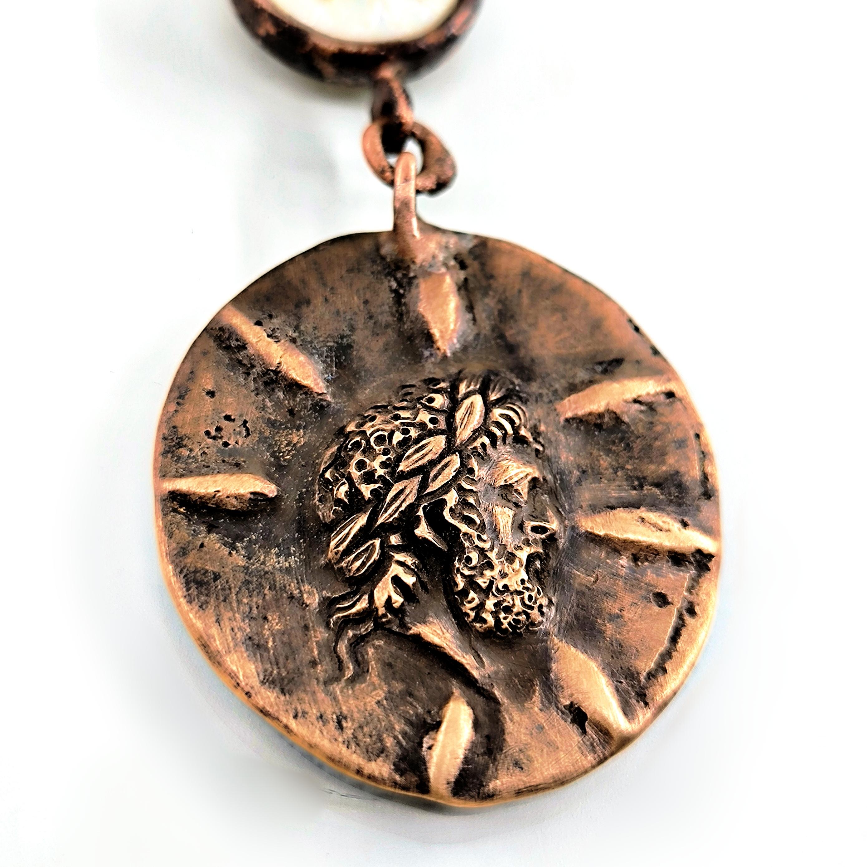 Antik Roma’da gücün ve asaletin sembolü olan aristokrat yüzü, bronz üzerine el işçiliğiyle kabartma olarak işlendi; geçmişin görkemli imparatorluklarının izlerini bugüne taşıyan zamansız bir hatıra niteliğinde. Sedef üzerine oyulmuş kanatlı tanrıça figürü ise hem ön yüzde hem de bronz plakanın arka kısmında gizli bir tılsım gibi yer alarak koruyucu ve rehberlik eden enerjiyi simgeler. Tanrıçanın kanatları, yolunu arayan ruhlara yön gösteren ilahi ışığı temsil ederken, antika sedef dizilim zincir saadet ve bereket anlamını taşır. Gerdanlık antika sedef dizilim zincir, bronz üzerine Roma soylu portresi kabartması, sedef üzeri kanatlı tanrıça intagliosu ve bronz arka yüzde ikinci tanrıça oymasıyla tasarlanmıştır. Ayrıca sedefin aralıklarıda kaplangözü taş ile dekore edilmiştir.