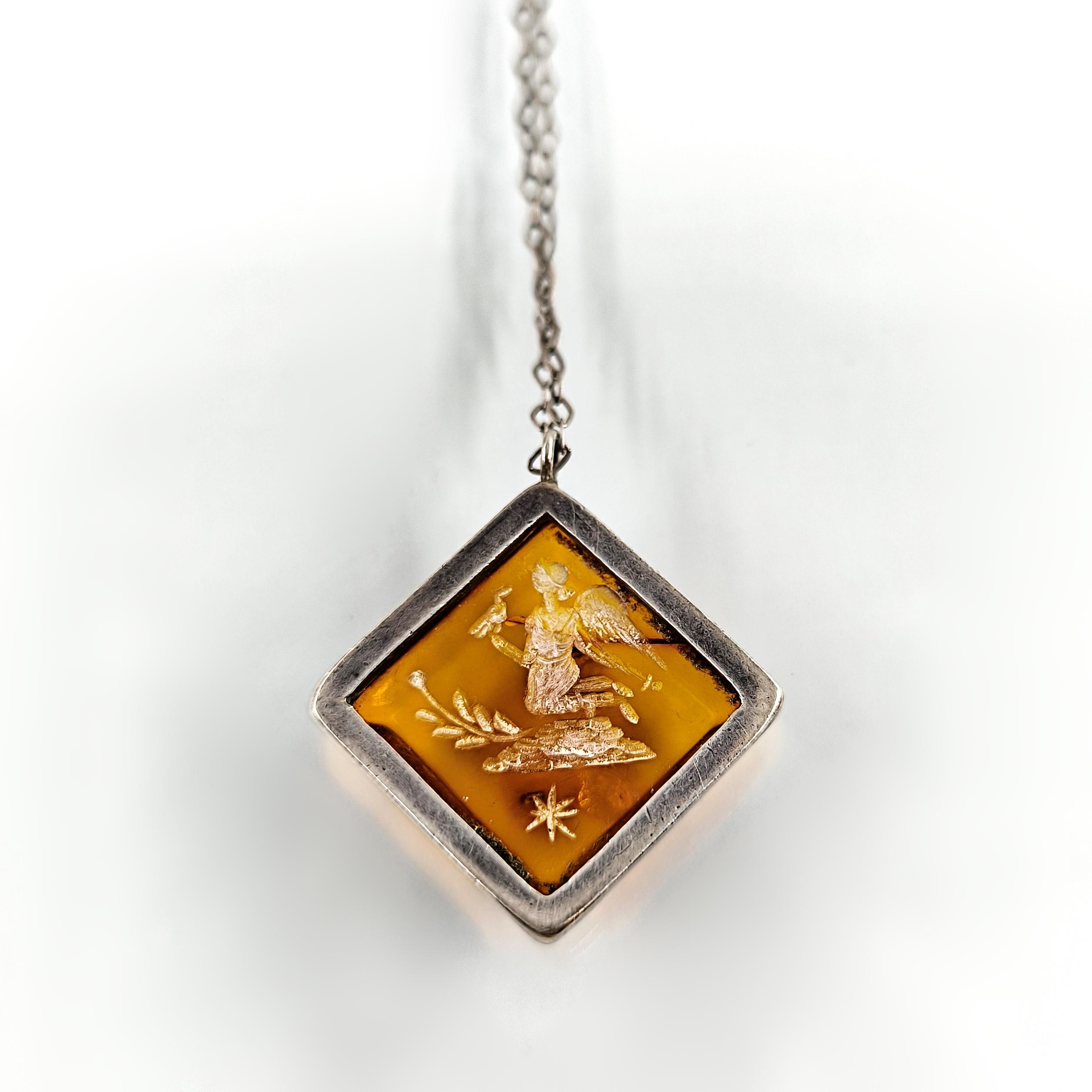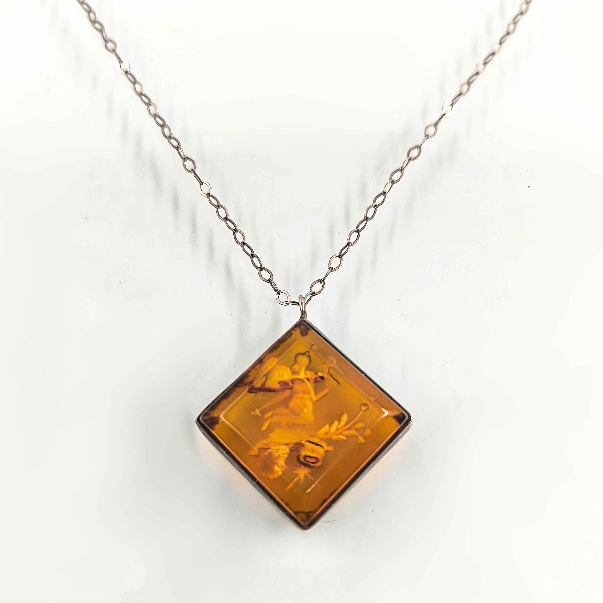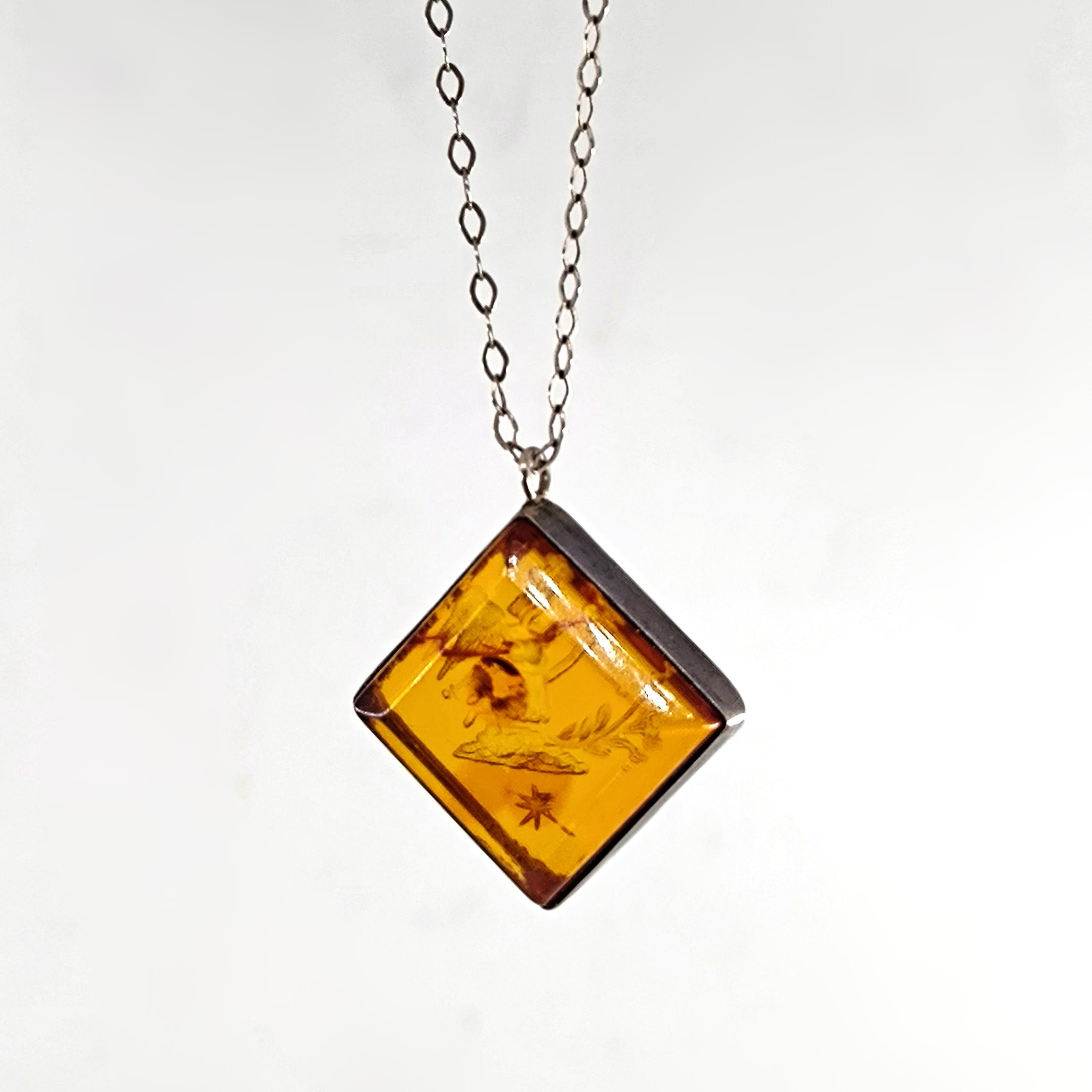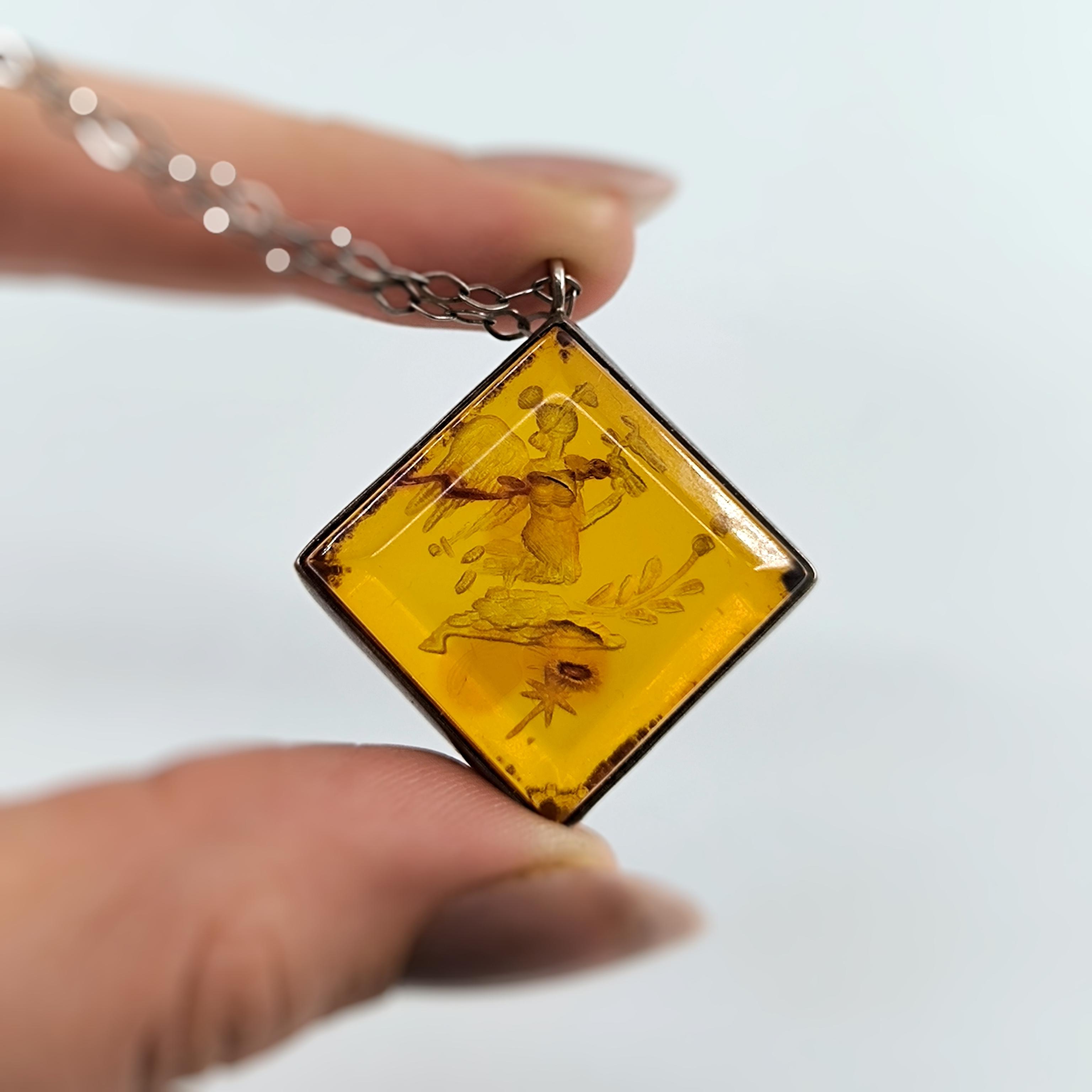 Bal rengi doğal kehribar içine özenle kazınmış zarif bir melek figürü… Hafiflik, huzur ve ilahi rehberlikle bütünleşen bir parça. Işığa tutulduğunda geçmişi fısıldayan büyülü bir yüzeyle karşılaşacaksınız.