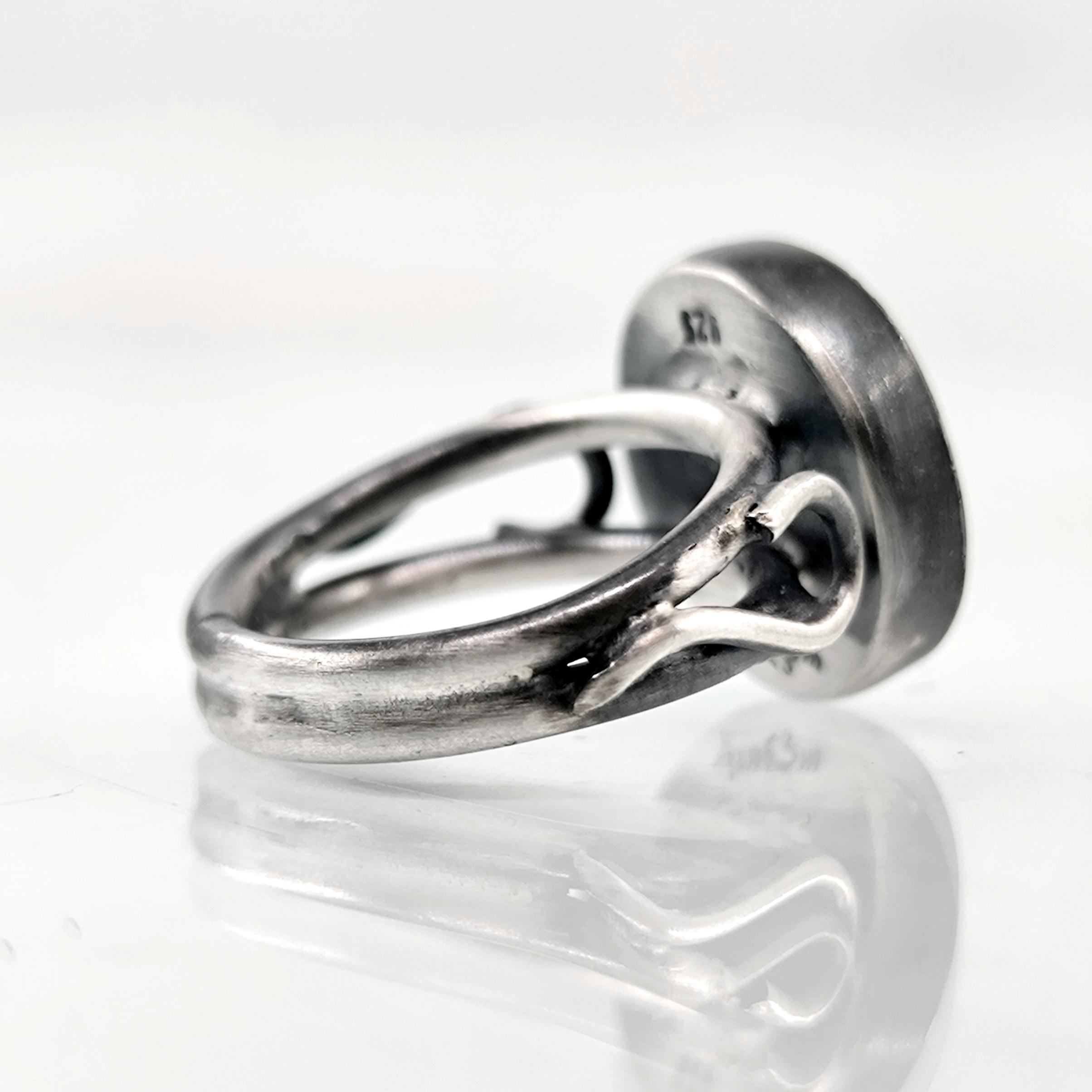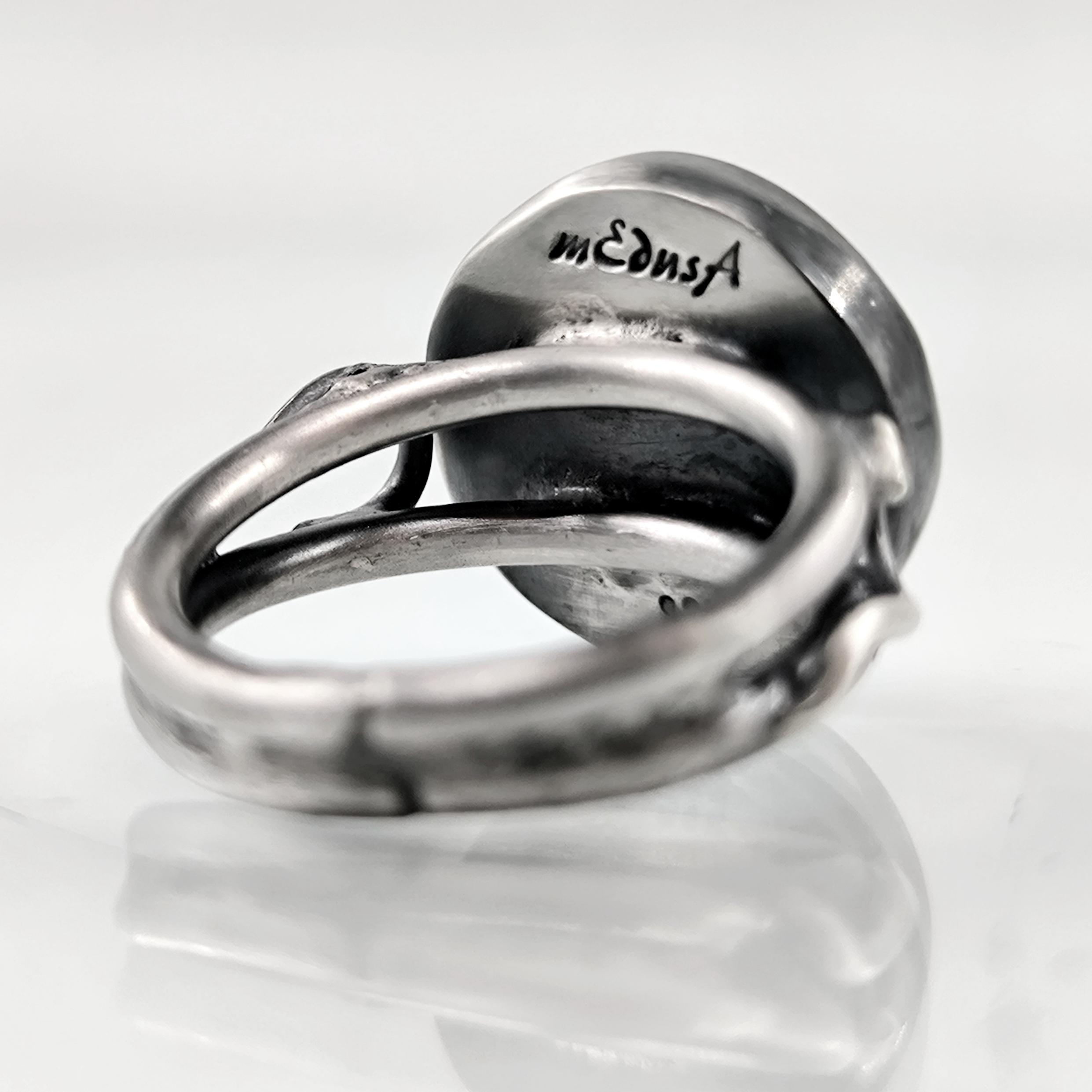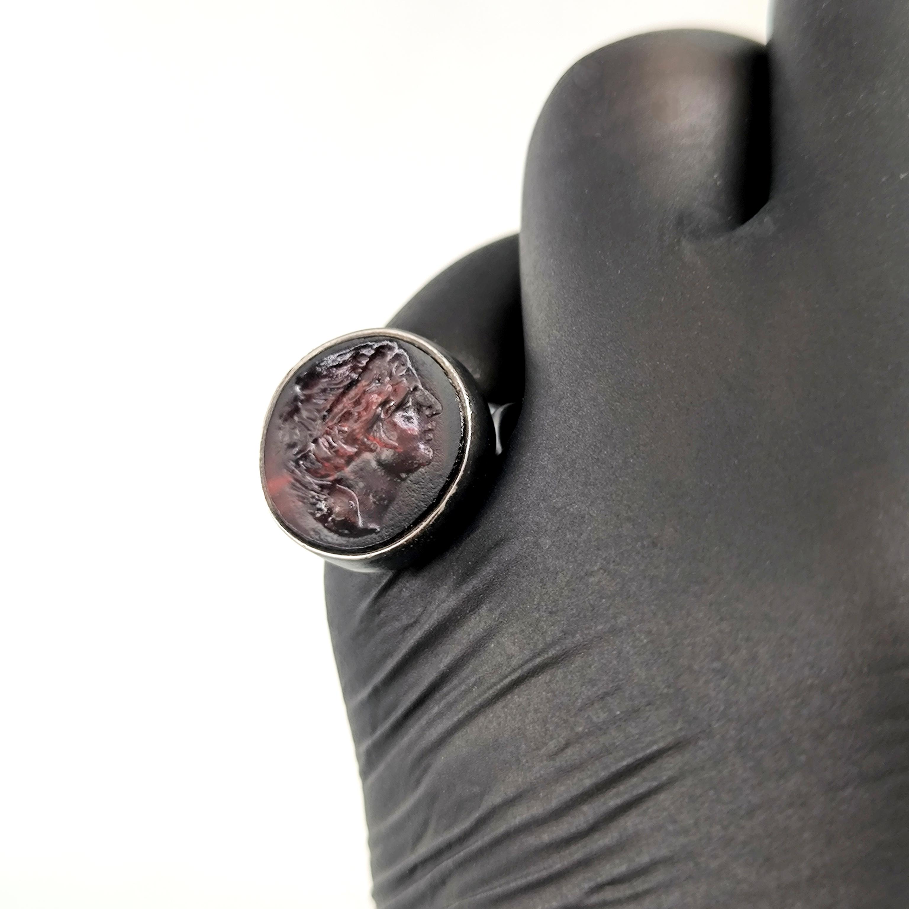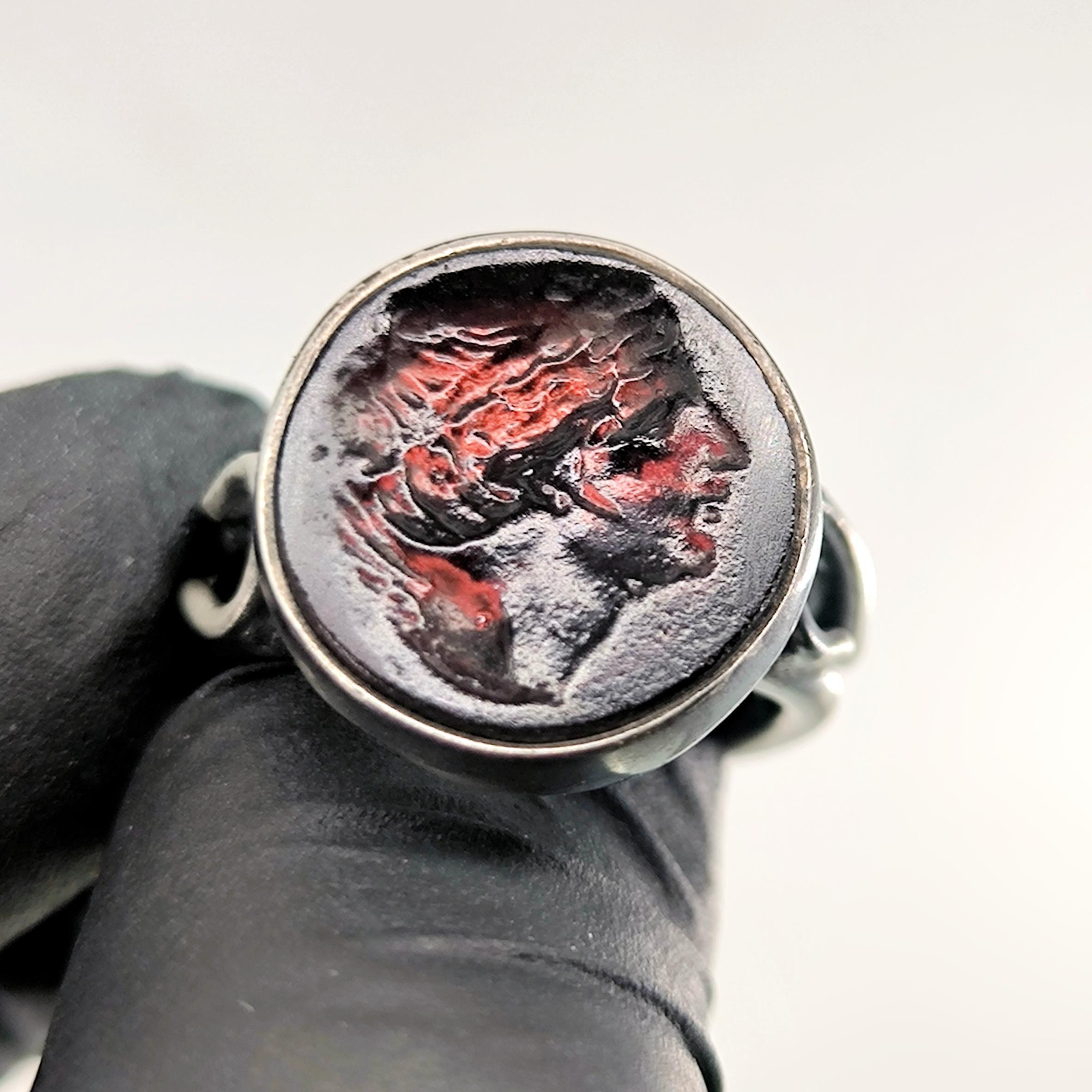 Zamanın derinliklerinden gelen bir fısıltı gibi, bu yüzük karanlıkla ateş arasındaki kadim dengeyi parmağınızda taşır. Antik Yunan dünyasının gizemli ruhunu yansıtan figür, ışıkla buluştuğunda ortaya çıkan kızıl parıltılarla adeta yaşayan bir mühür hissi uyandırır. İçine bakıldıkça farklı bir ifade kazanan bu kompozisyon, güç, koruma ve bilinmeyene açılan kapıların sembolü olarak tasarlandı. Minimal ama etkisi yüksek formu sayesinde hem koleksiyonluk hem de güçlü bir tılsım karakteri taşır. Orta taş camdır; pres tekniğiyle cam üzerine intaglio (negatif oyma) antik Yunan stilinde işlenmiş, kırmızı camın altına yerleştirilen özel foya sayesinde taş janjanlı ve derin bir parlaklık kazanmıştır, yüzük tamamı antik eskitme gümüşten üretilmiştir.