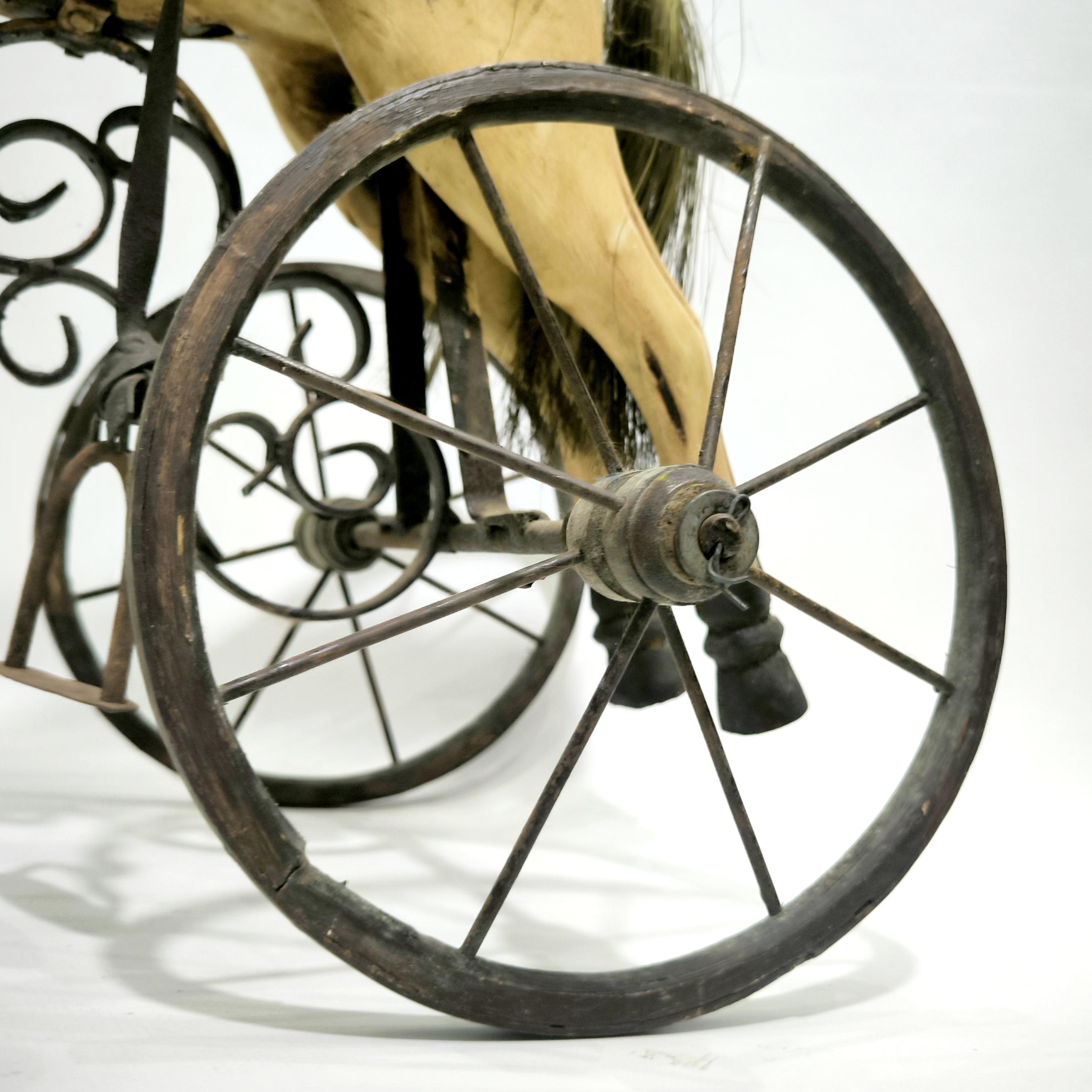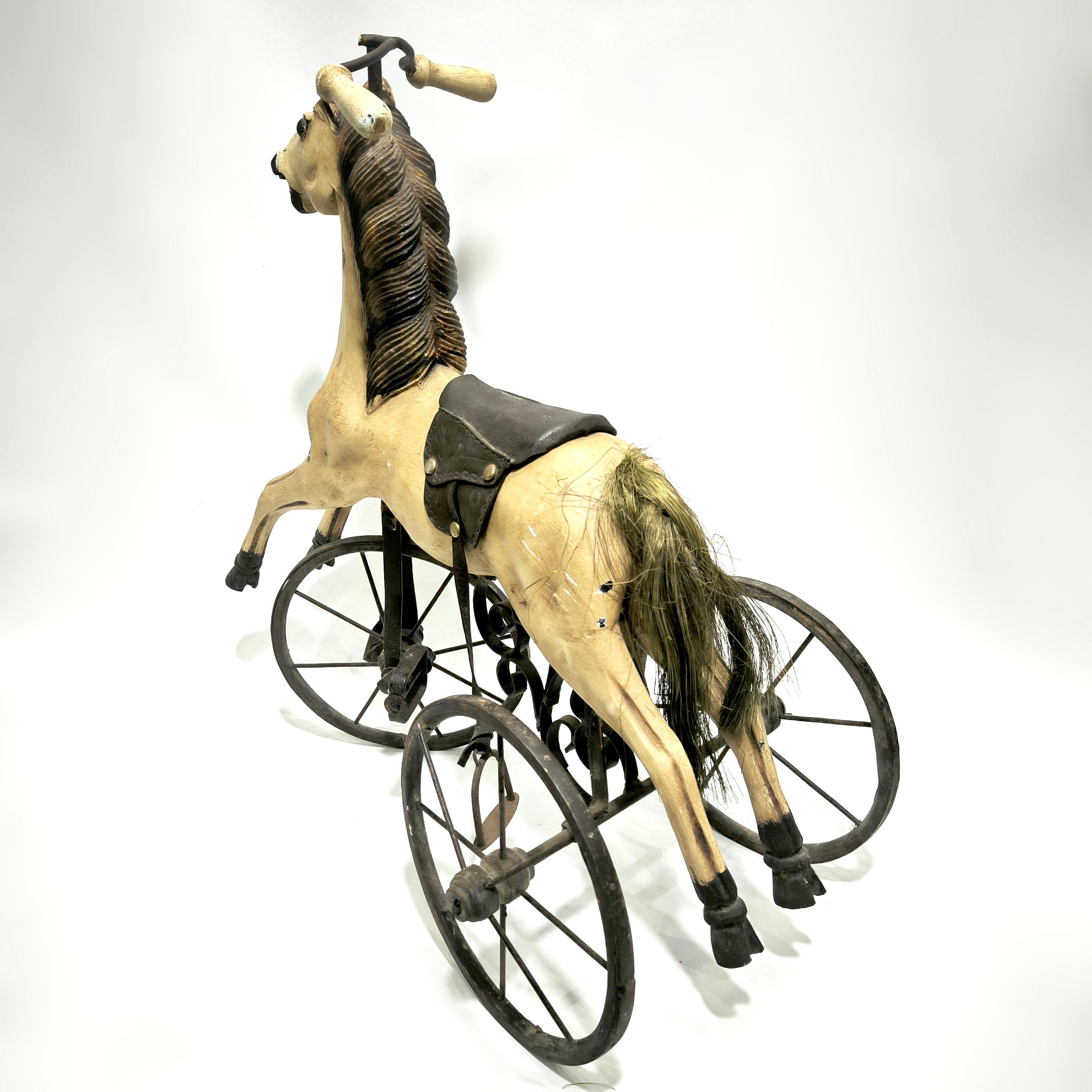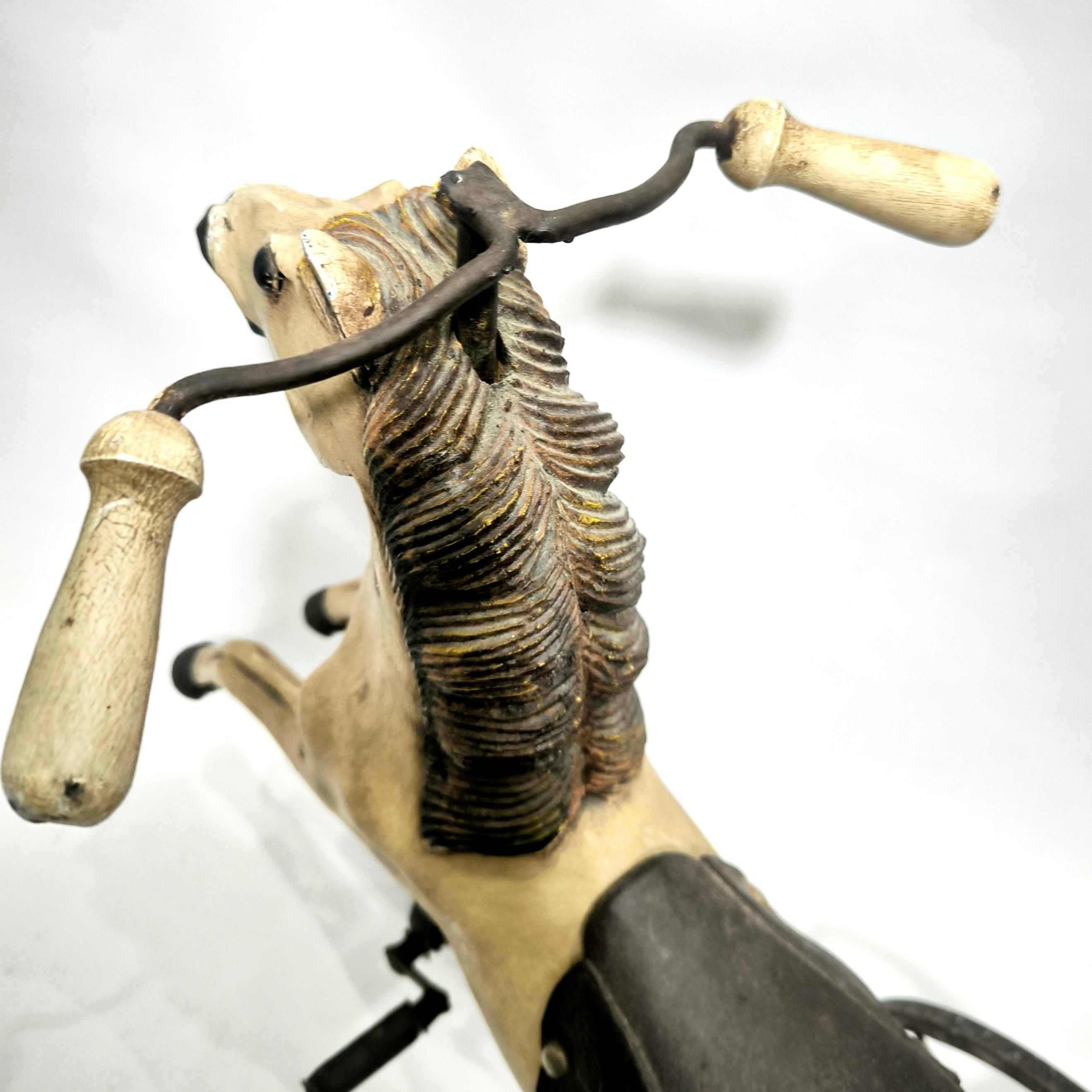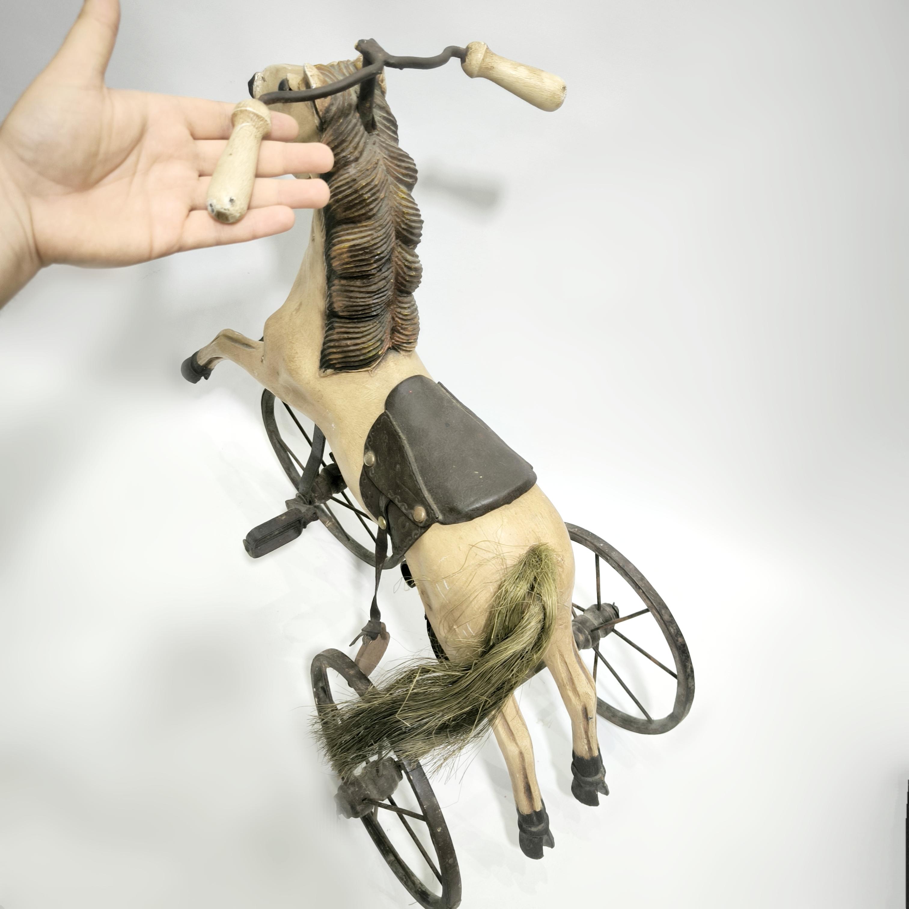 ESKİ AVRUPA İMALATI, TAMAMI EL İŞÇİLİĞİ OLAN AHŞAP ATLI, TAKRİBEN 1900'LÜ YILLARIN İLK YILLARINA AİT AT FORMUNDA ANTİKA ÇOCUK BİSİKLETİ. AKSAMLARI ÇALIŞIR DURUMDA ANCAK BİRAZ BAKIM İSTER. GERÇEK VE MUAZZAM SANATTA BİR ANTİKA OYUNCAK!