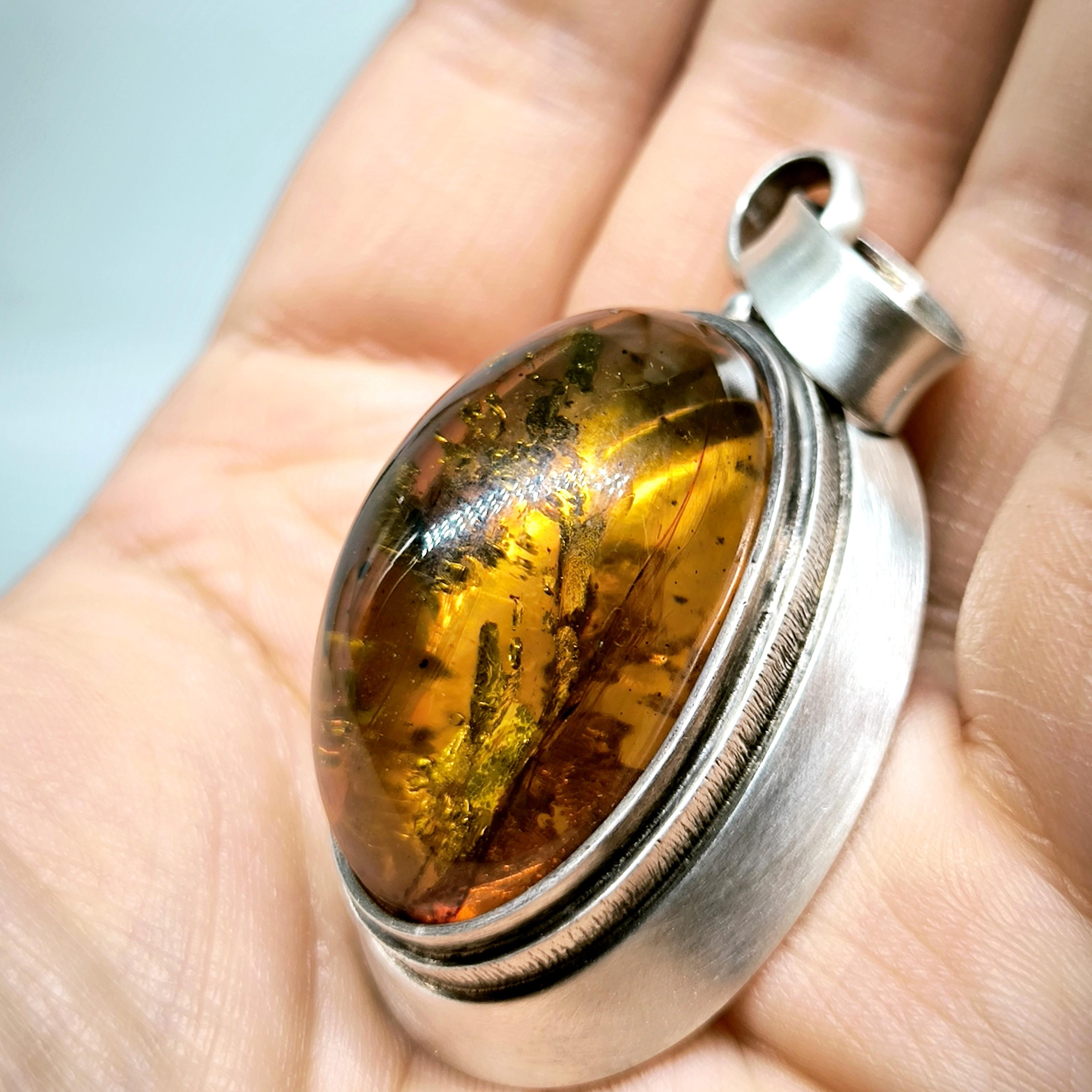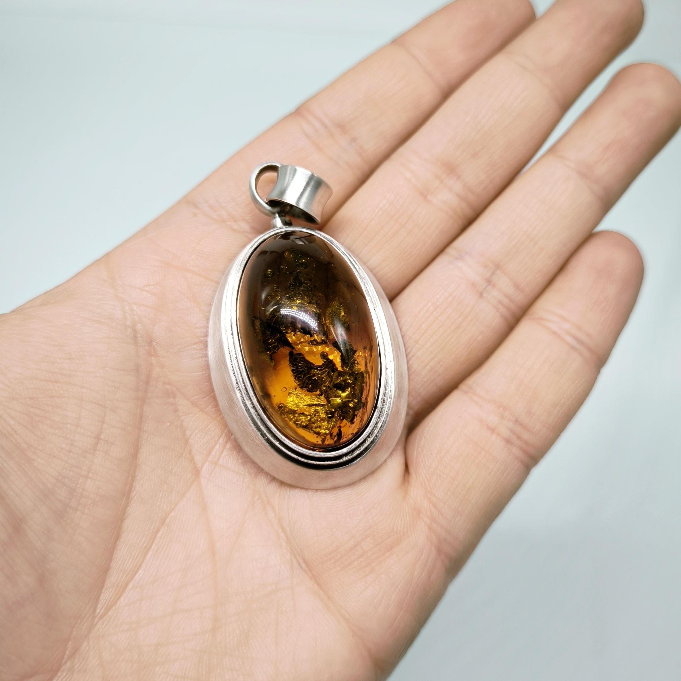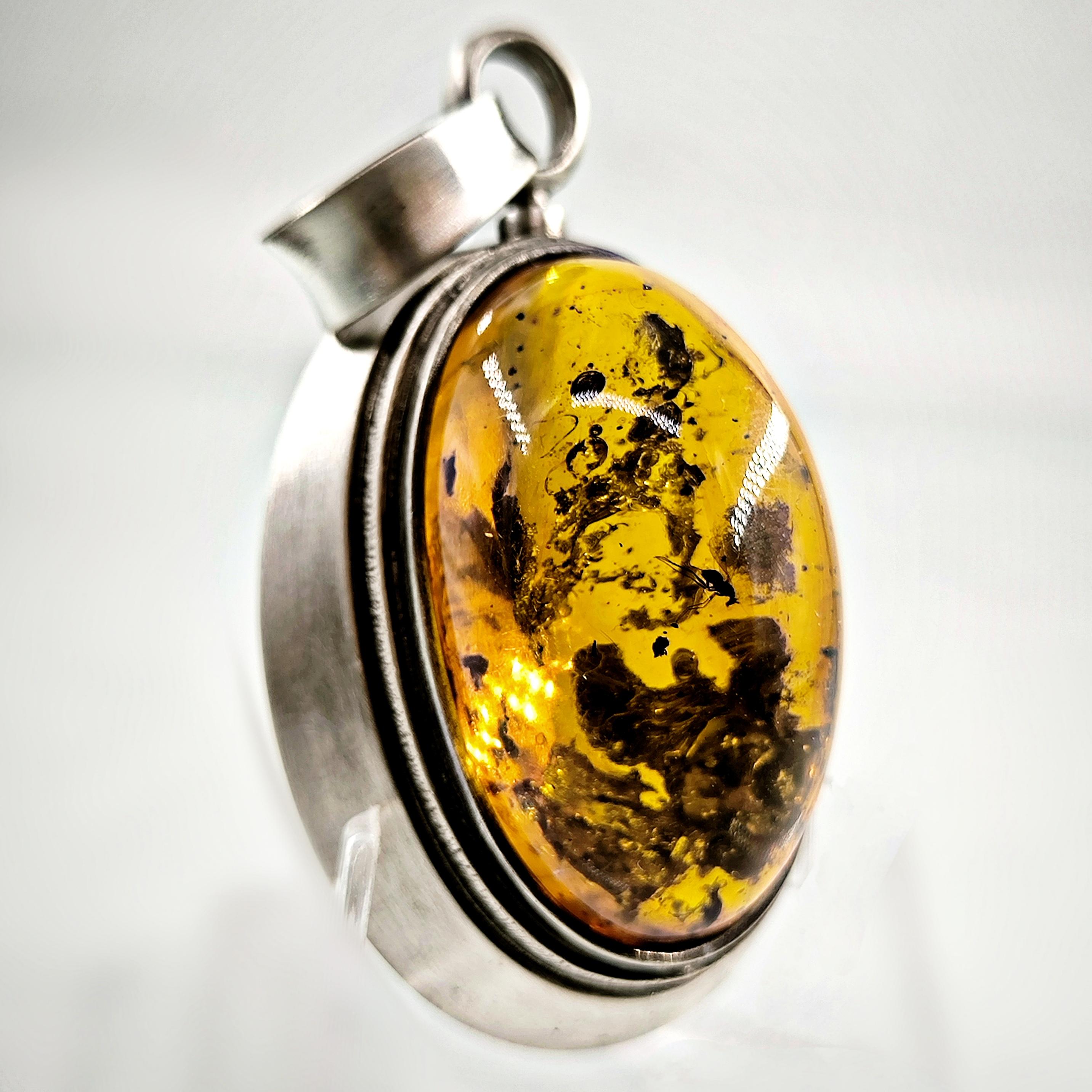 İçerisinde doğanın mumyaladığı sivrisinek fosili bulunan Natürel Damla Kehribar 1960'lardan Gümüş çerçeveli kallavi boyda antika vintage fosilli kehribar kolyemiz!