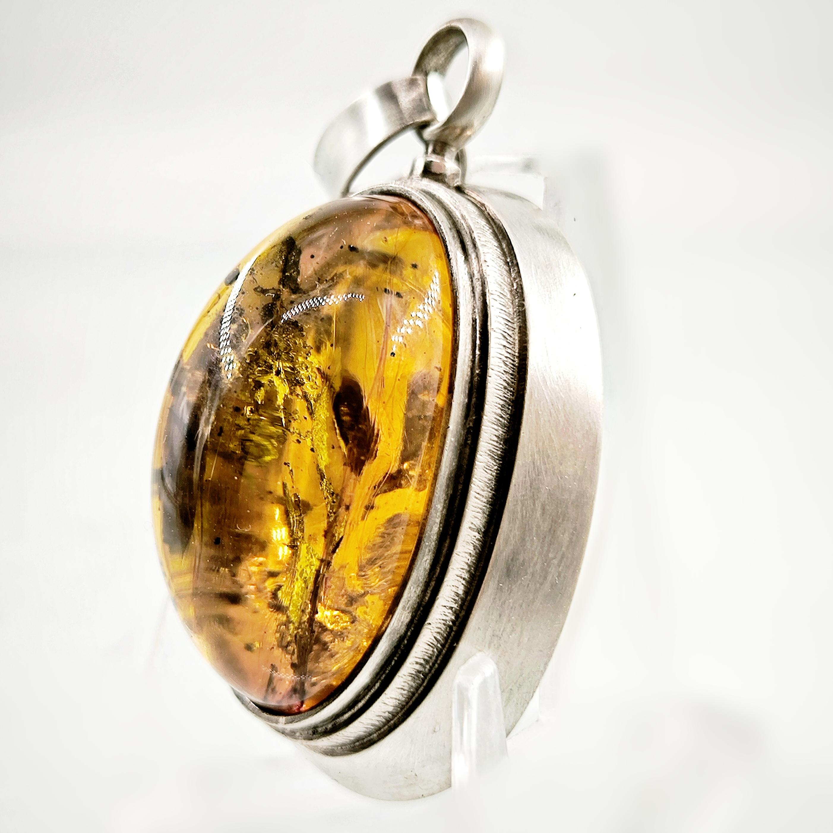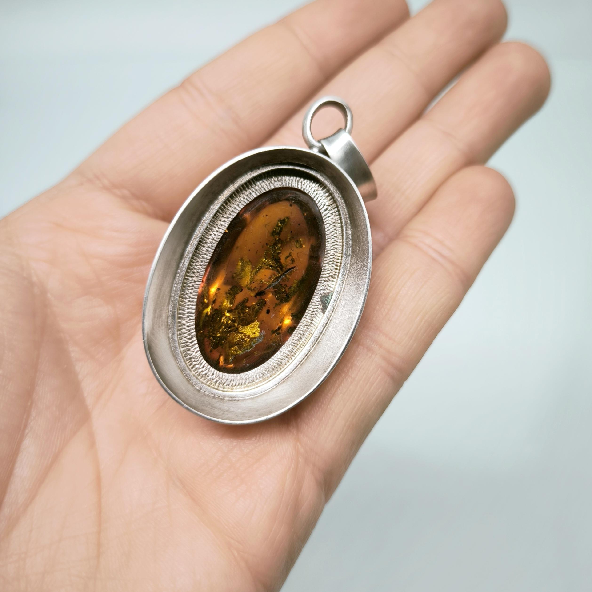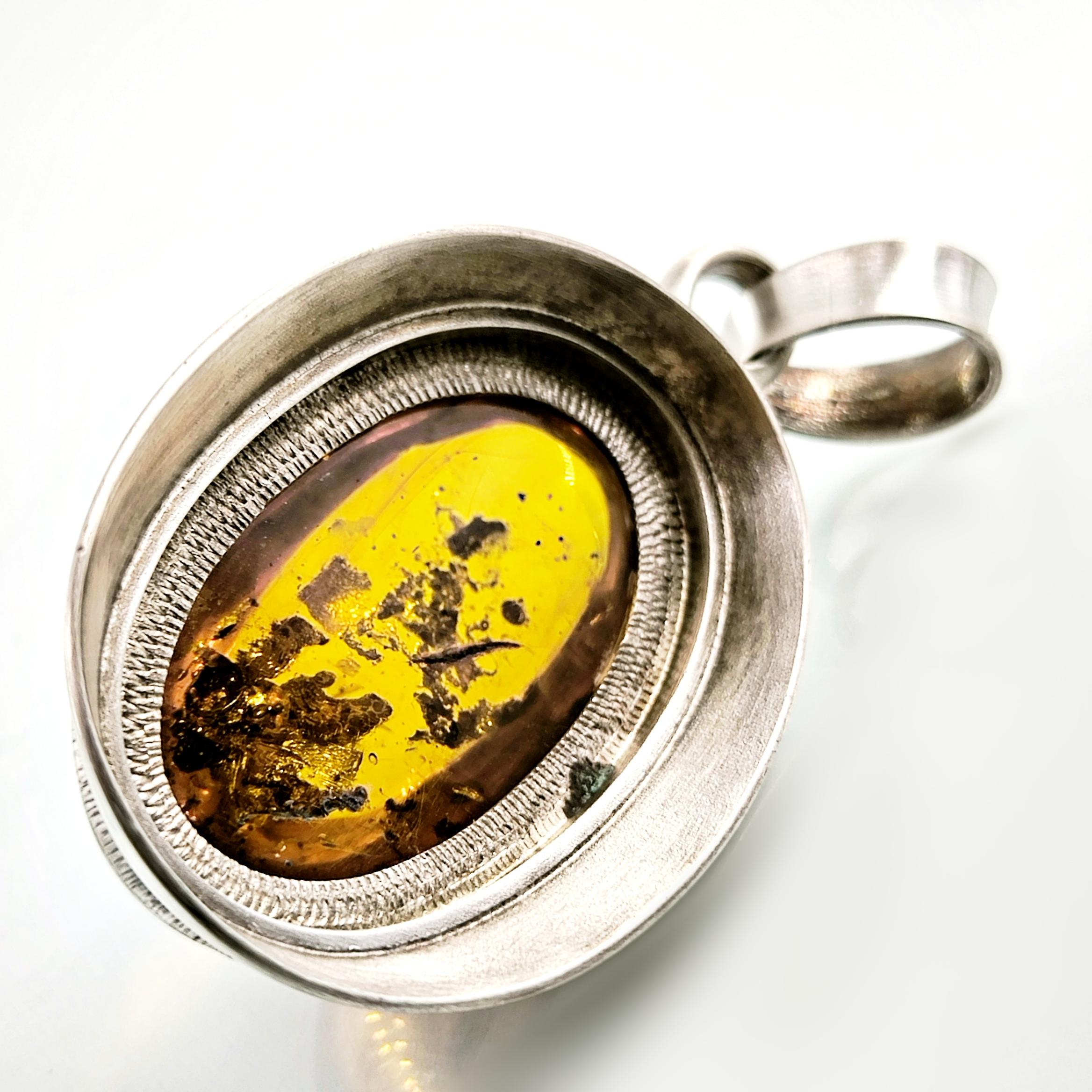İçerisinde doğanın mumyaladığı sivrisinek fosili bulunan Natürel Damla Kehribar 1960'lardan Gümüş çerçeveli kallavi boyda antika vintage fosilli kehribar kolyemiz!