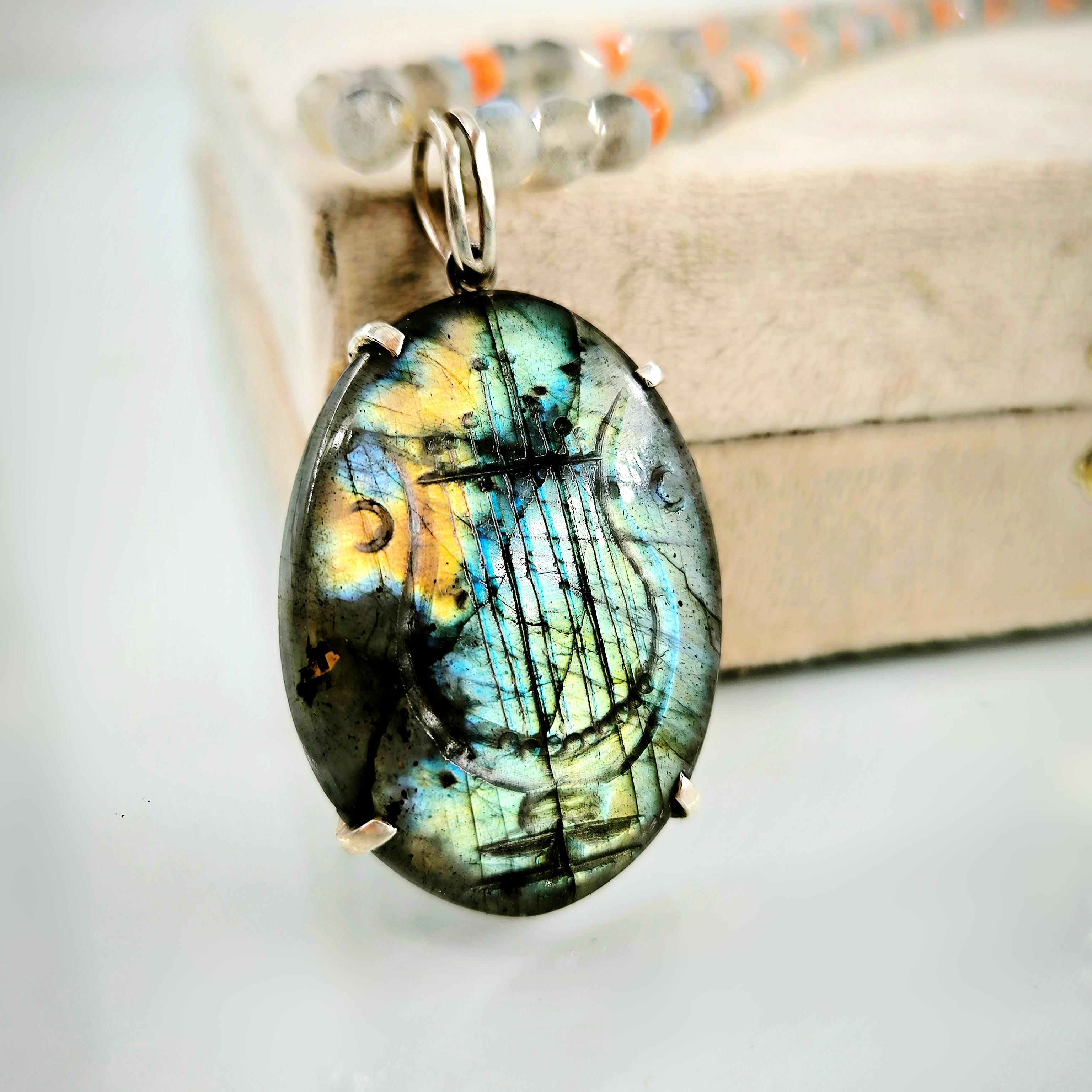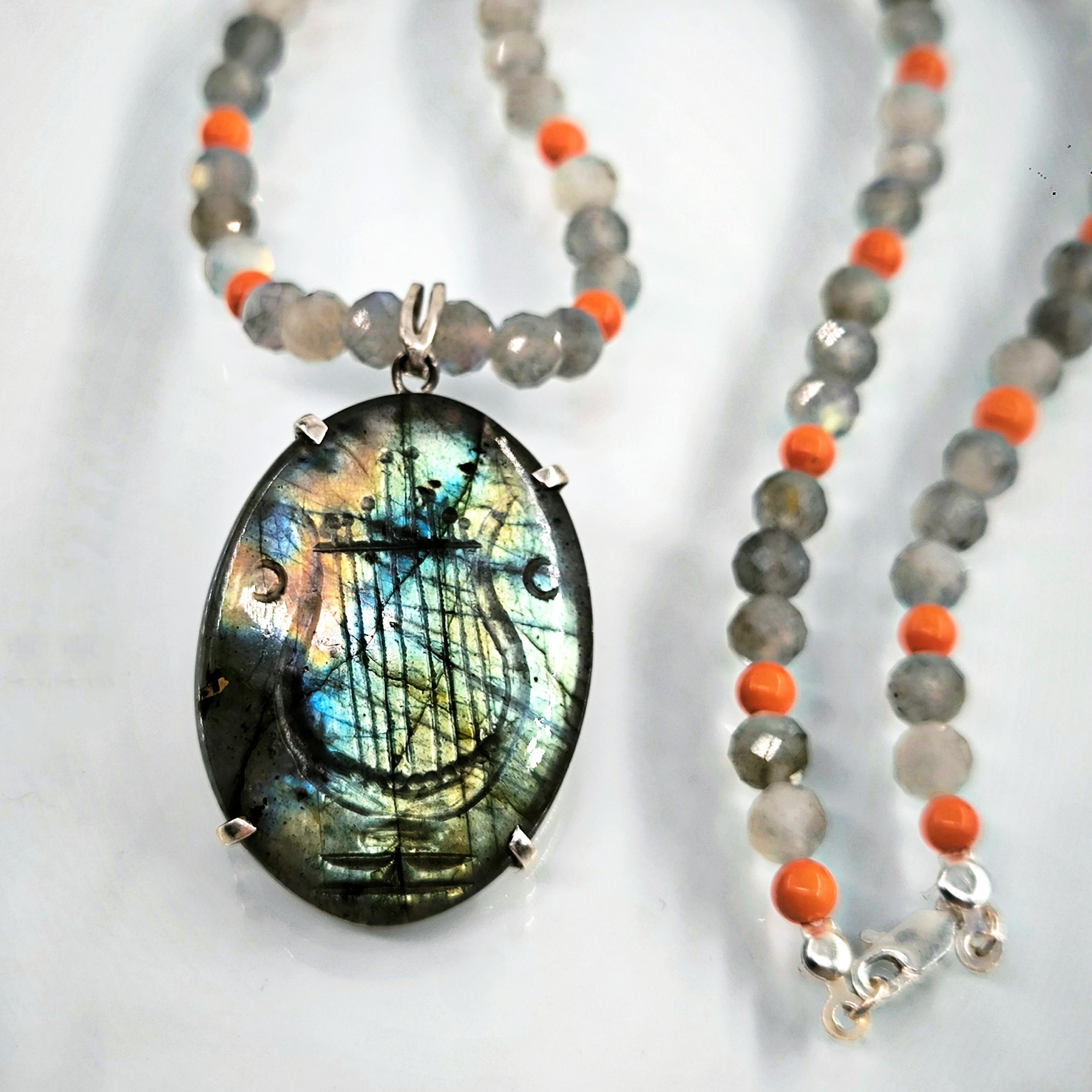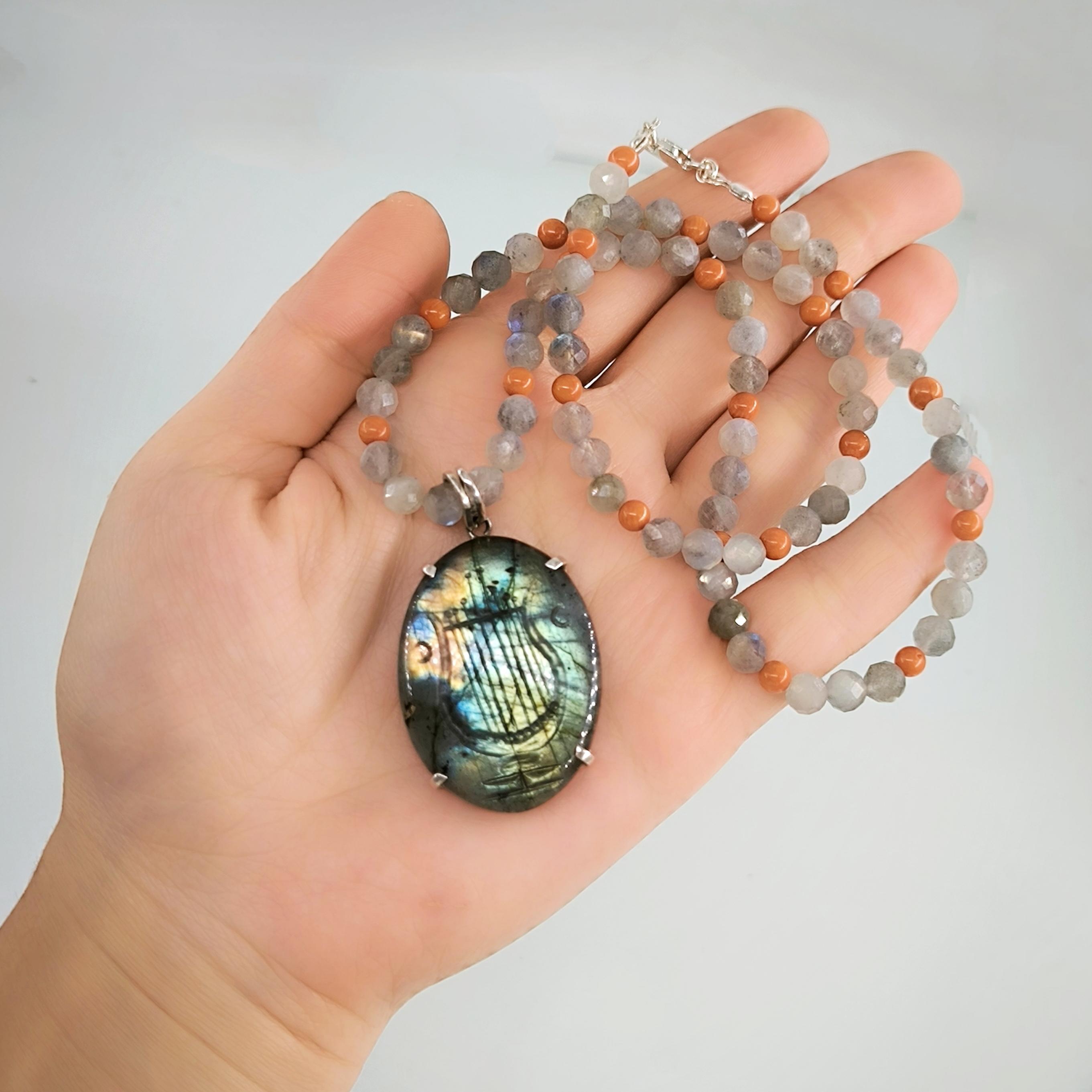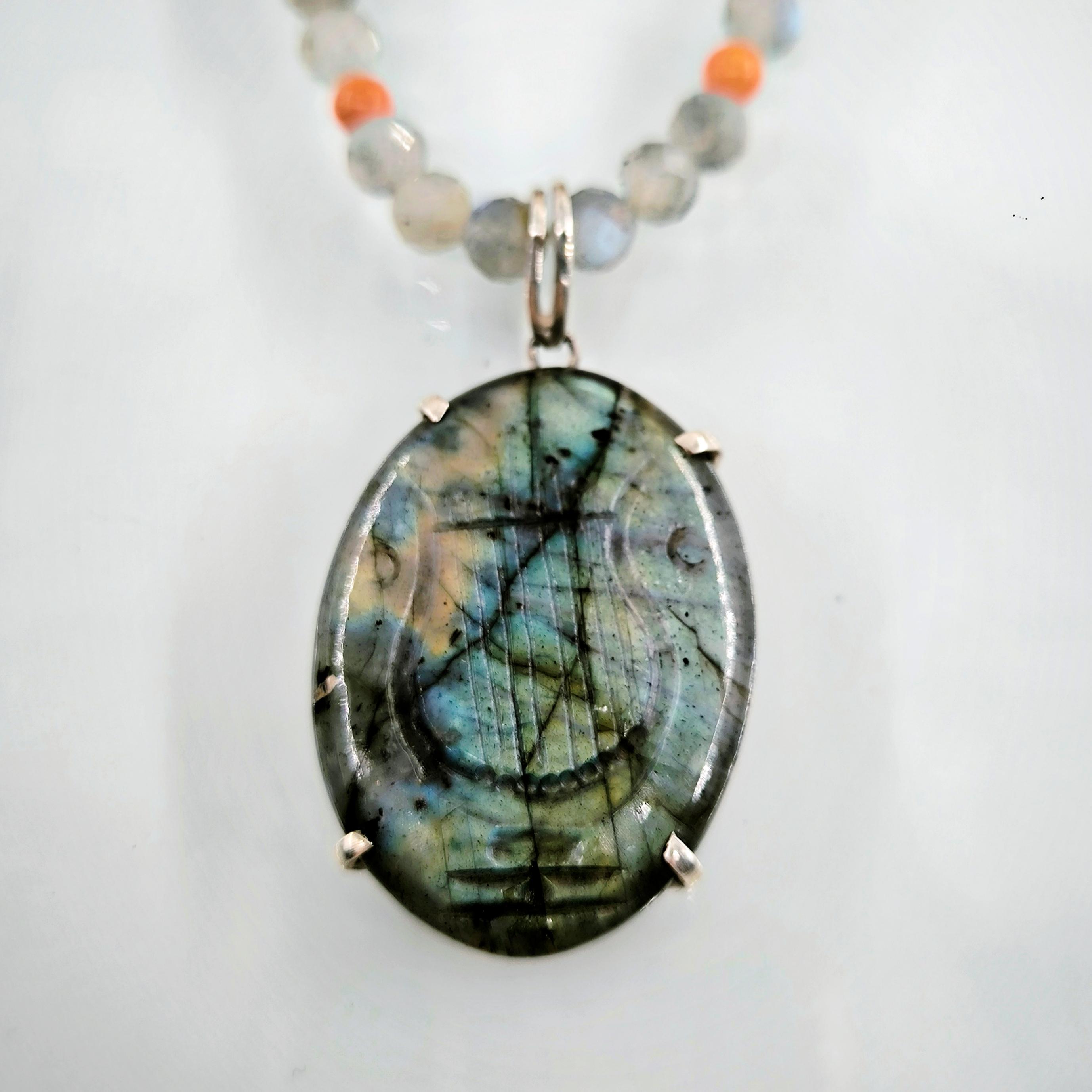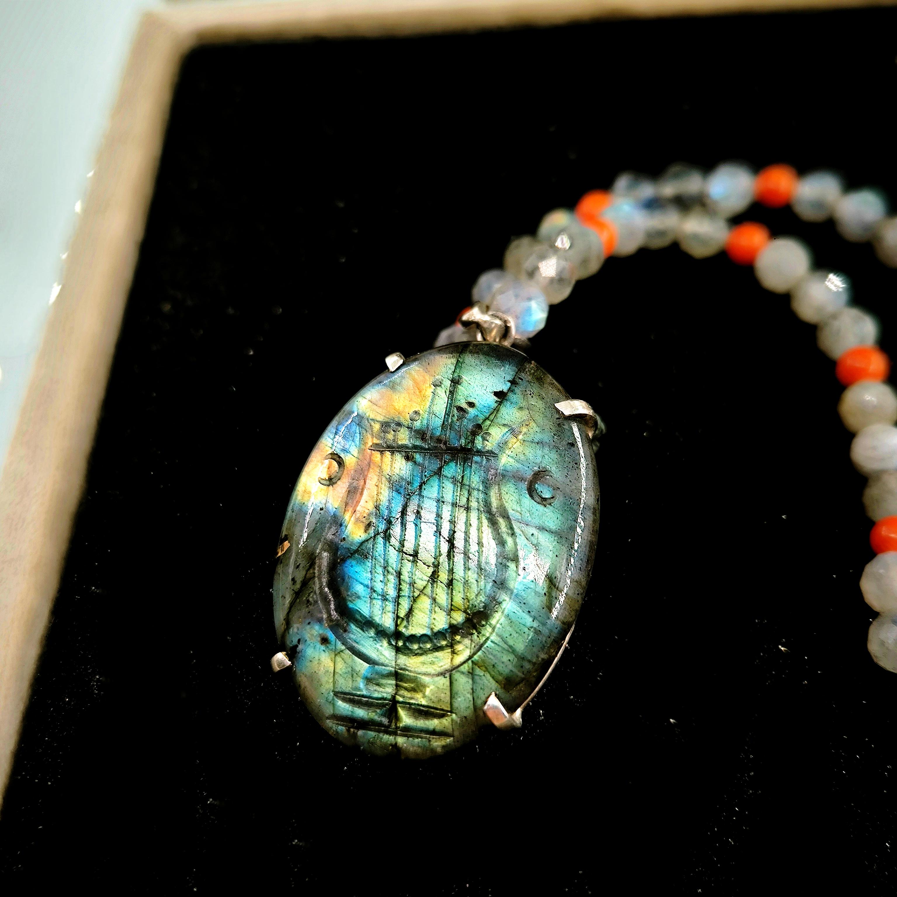 Yunan mitolojisinde lir, tanrı Apollon’un göksel enstrümanı, düzenin ve ilahi armoninin sembolüdür; sesinin titreşimiyle evreni dengeye getirdiğine inanılırdı. Bu özel kolyede, labradorit taşın içindeki büyülü ışık oyunları üzerine el işçiliğiyle oyulan antik lir figürü, görünmez melodilerin ruhu titreten gücünü taşır. Taşın her açıdan değişen mavi-yeşil yanar döner yansımaları, tıpkı bir müziğin ritmi gibi ışıkla dans eder. 925 ayar gümüş çerçeve, antik bir arma gibi tasarımı sararak esere asil bir duruş kazandırır. Zincir kısmında kullanılan fasetli labradorit ve mercan, sezgiyi güçlendirme ve yaşam enerjisini yükseltme anlamlarıyla kompozisyonu tamamlar. Koleksiyon değeri yüksek, eşsiz bir sanat eseri.