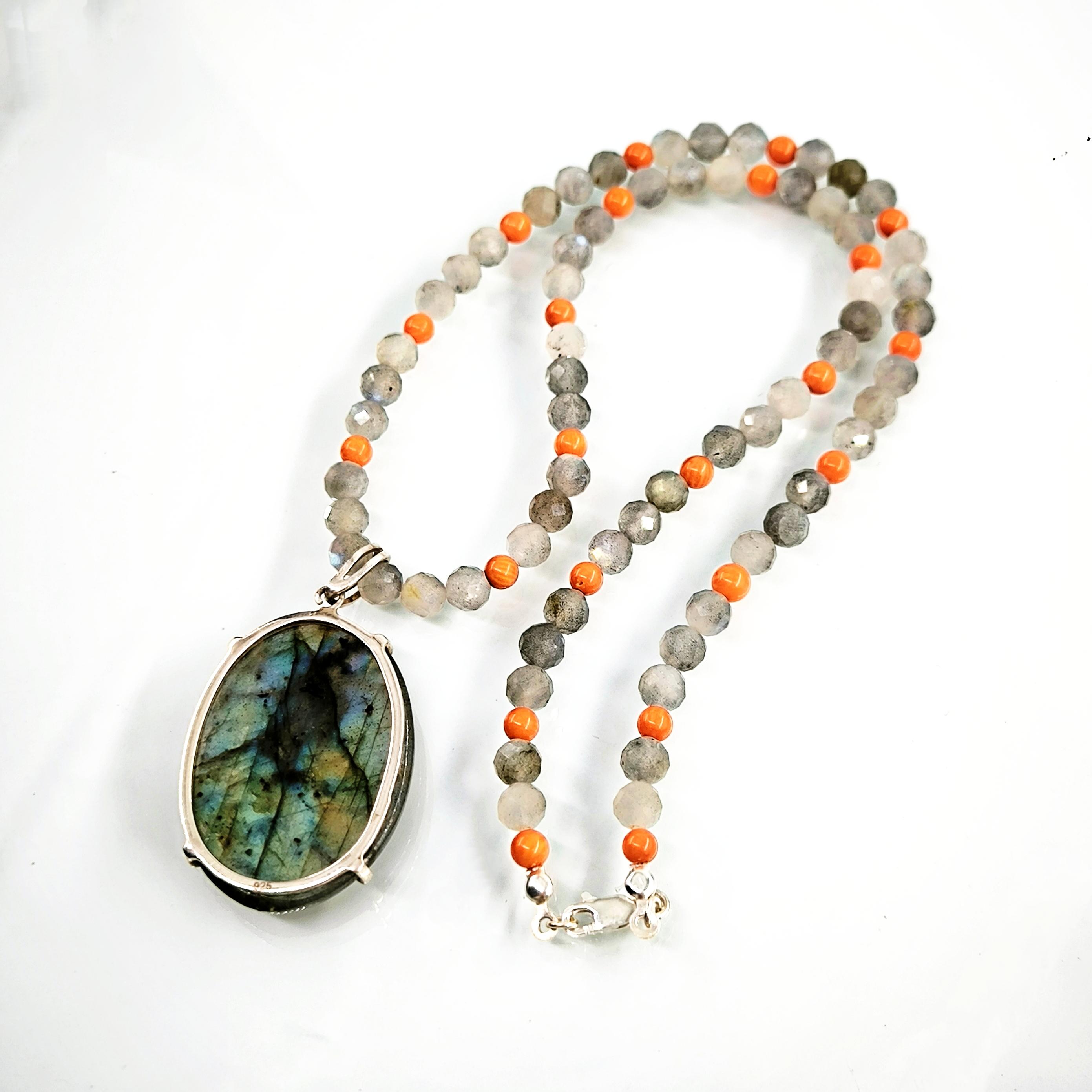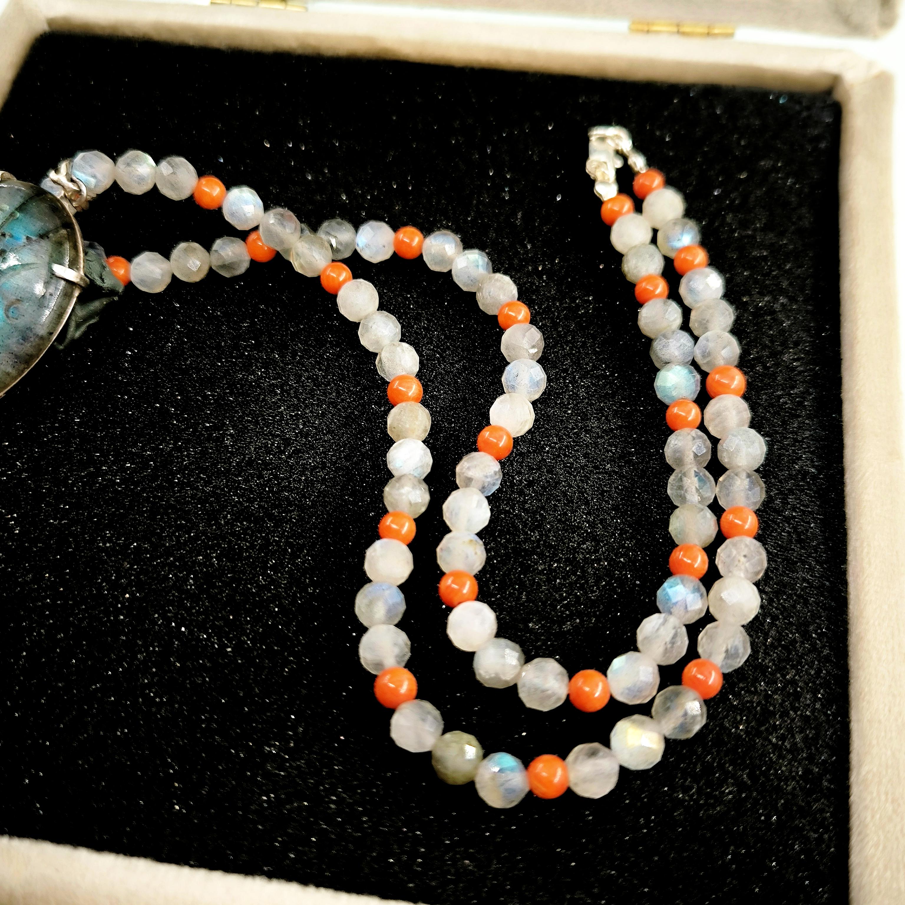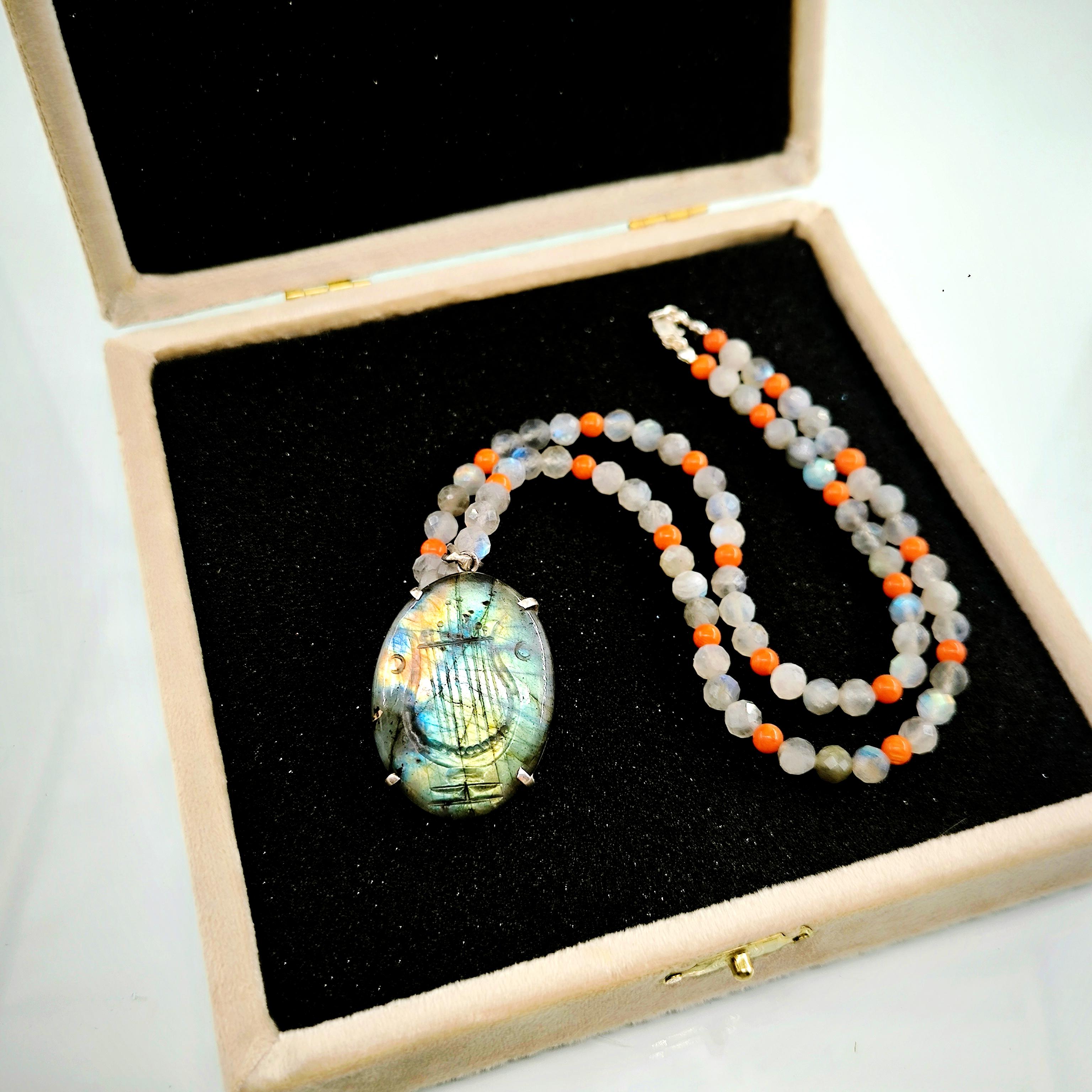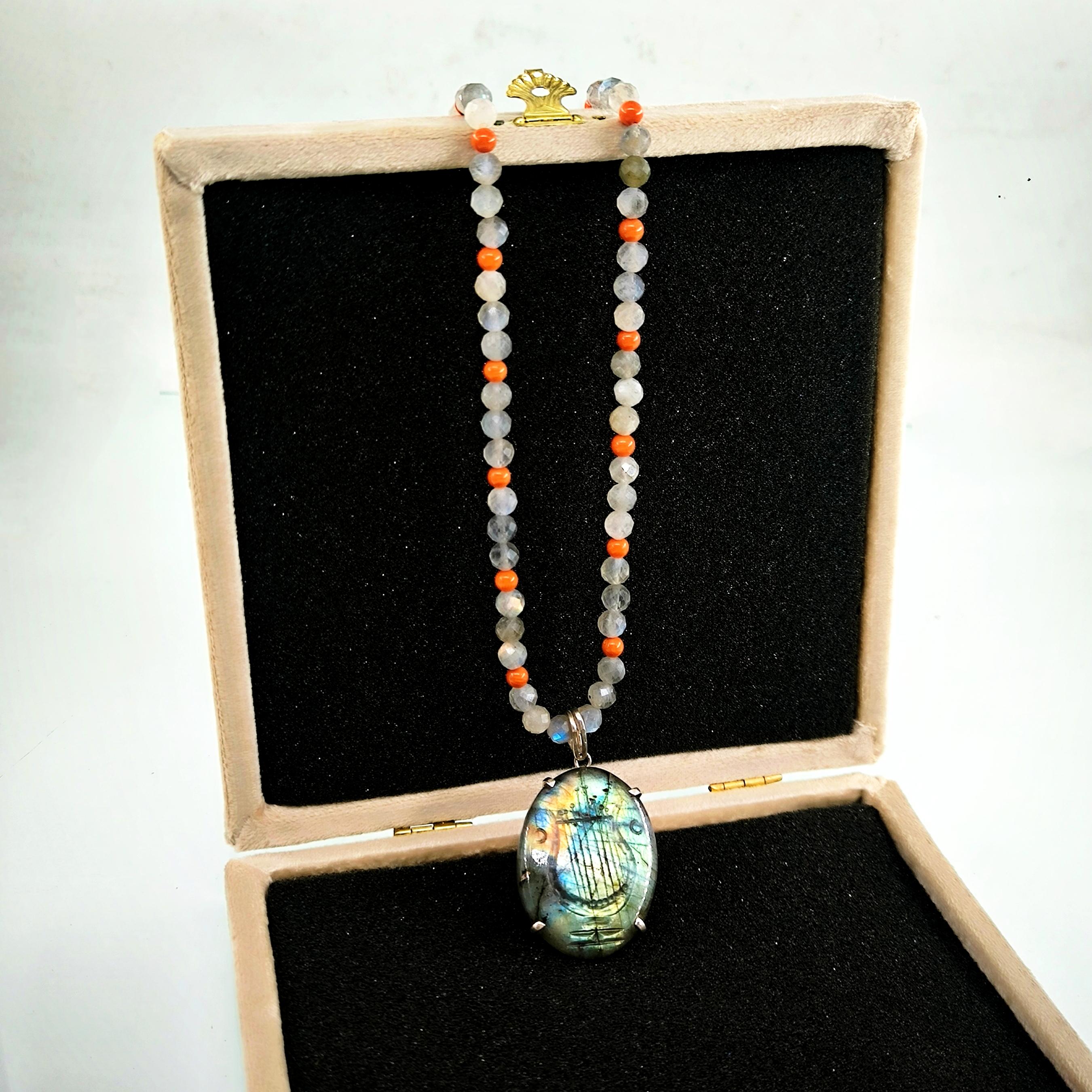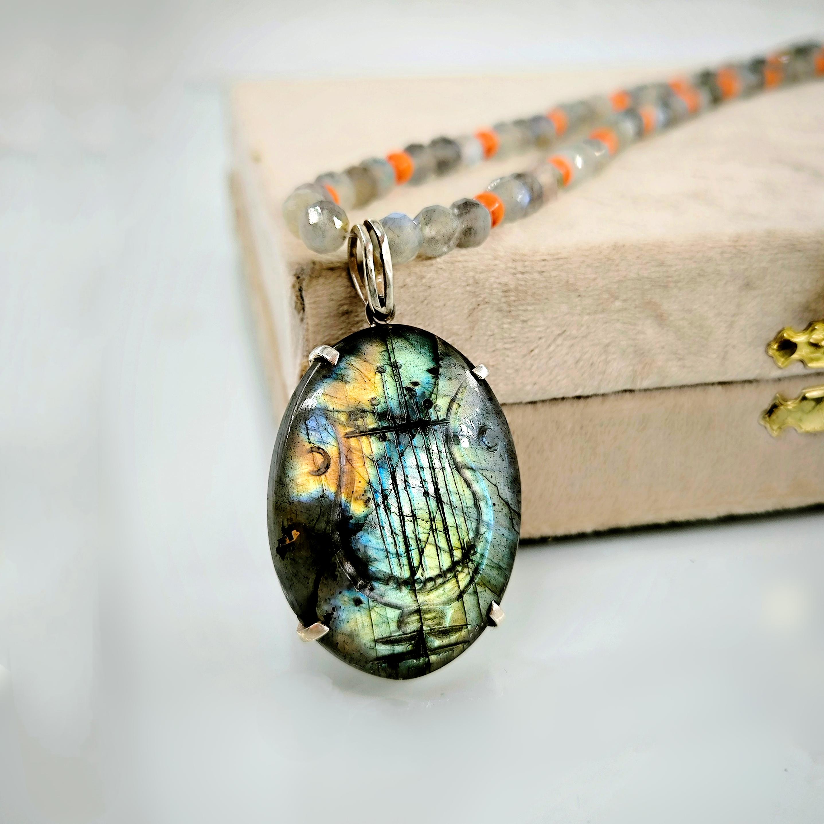 Yunan mitolojisinde lir, tanrı Apollon’un göksel enstrümanı, düzenin ve ilahi armoninin sembolüdür; sesinin titreşimiyle evreni dengeye getirdiğine inanılırdı. Bu özel kolyede, labradorit taşın içindeki büyülü ışık oyunları üzerine el işçiliğiyle oyulan antik lir figürü, görünmez melodilerin ruhu titreten gücünü taşır. Taşın her açıdan değişen mavi-yeşil yanar döner yansımaları, tıpkı bir müziğin ritmi gibi ışıkla dans eder. 925 ayar gümüş çerçeve, antik bir arma gibi tasarımı sararak esere asil bir duruş kazandırır. Zincir kısmında kullanılan fasetli labradorit ve mercan, sezgiyi güçlendirme ve yaşam enerjisini yükseltme anlamlarıyla kompozisyonu tamamlar. Koleksiyon değeri yüksek, eşsiz bir sanat eseri.