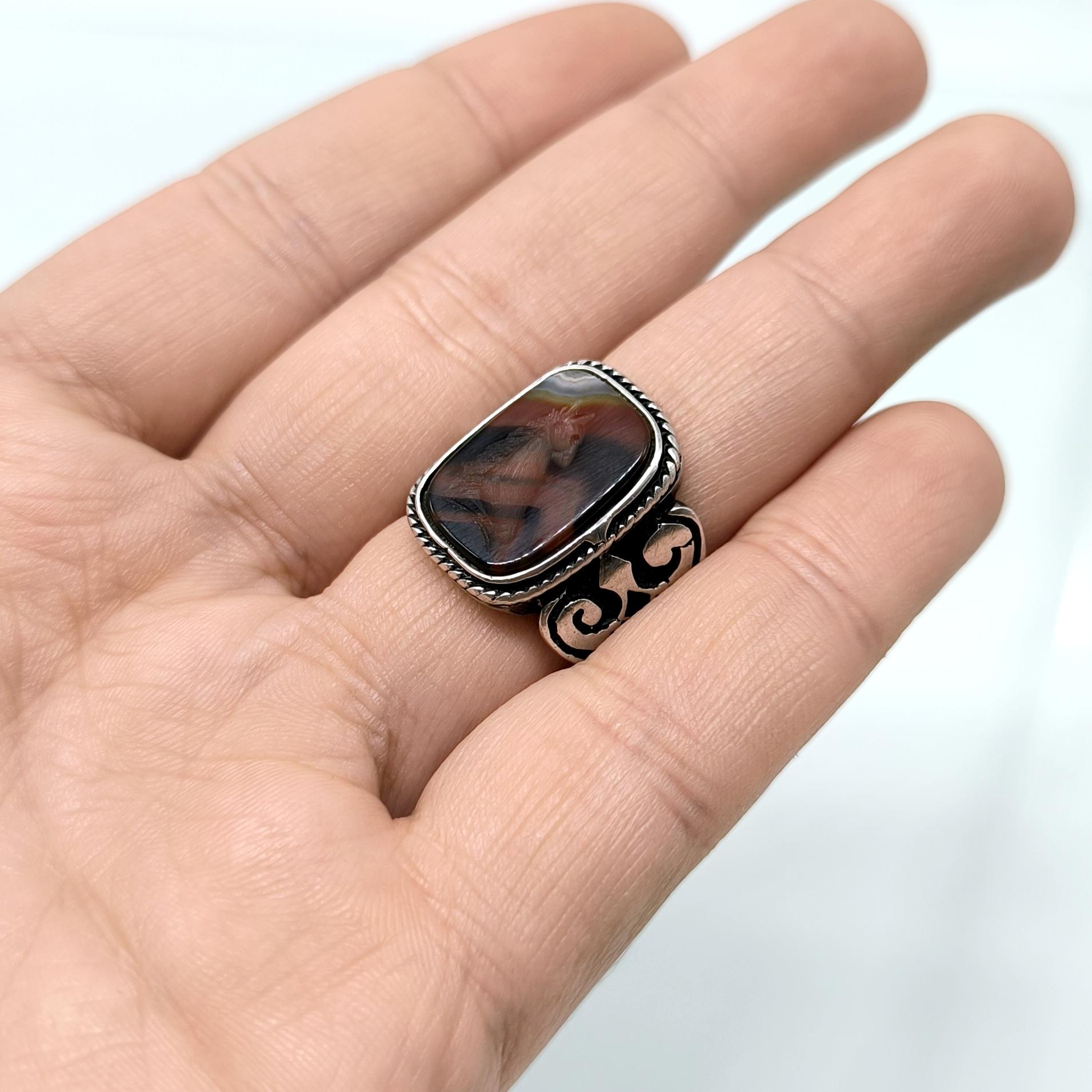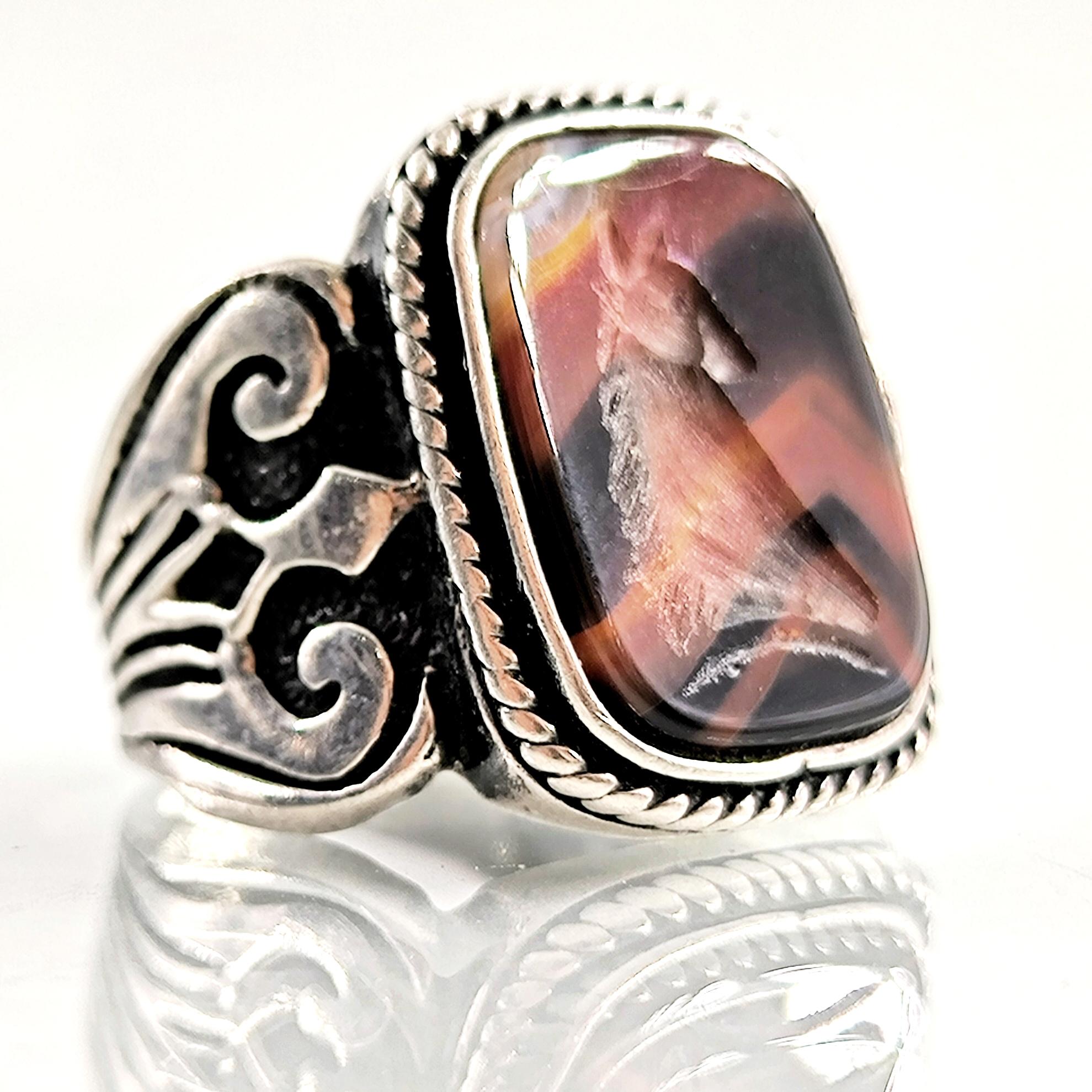 925 ayar gümüşten üretilmiş bu yüzük, üzerindeki akik taşına işlenmiş at intagliosu ile dikkat çekiyor. Atın zarif hatları, taşın doğal renk geçişleriyle birleşerek hareket ve güç hissi veriyor. Yan kısımlardaki kabartma motifler, yüzüğe hem klasik hem de güçlü bir karakter katıyor. Asaletin, özgürlüğün ve cesaretin sembolü olan bu parça, zamansız bir şıklık sunuyor.