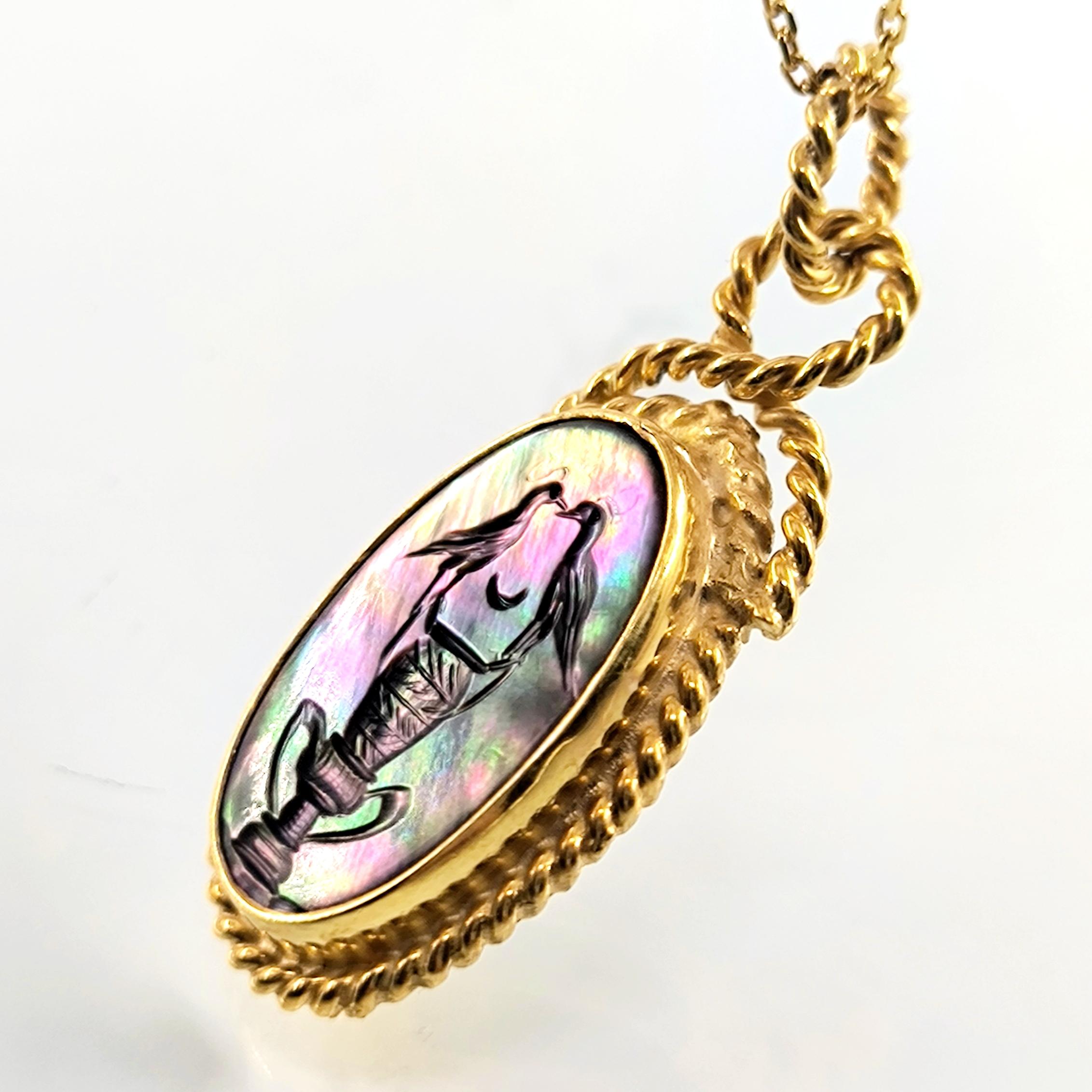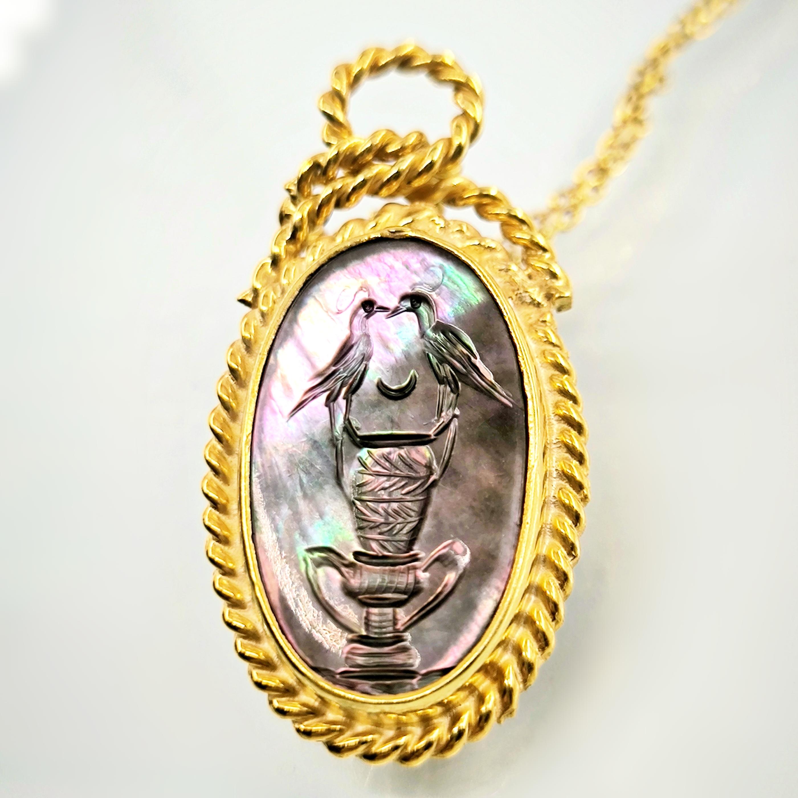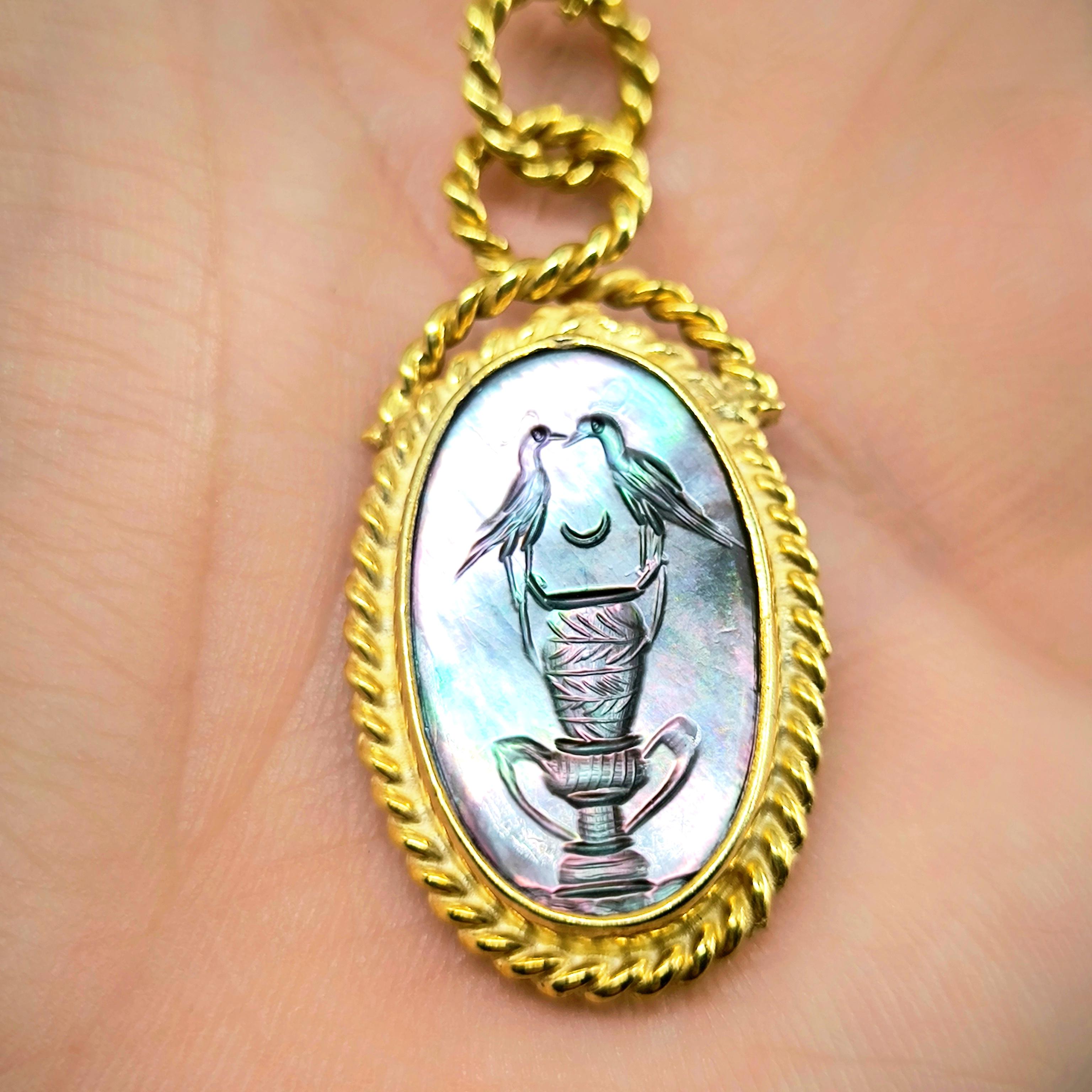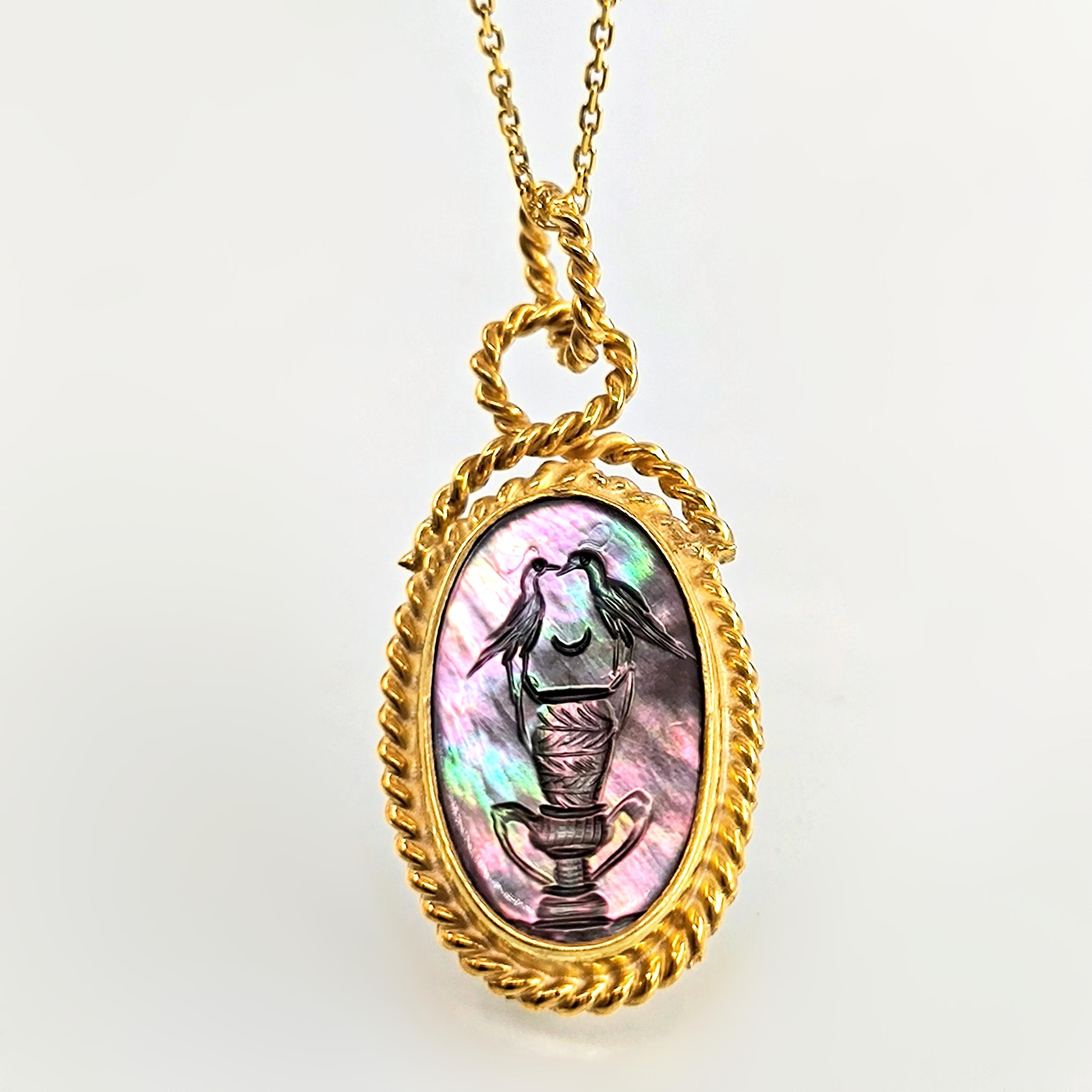 Bu tasarımda romantizmi ve zarafeti antik mücevher sanatının diliyle anlatmak istedim. Tamamı 925 ayar gümüşten hazırlanıp 22 ayar altınla kaplanan zarif çerçeve, merkezdeki doğal sedef taşın büyüleyici renk oyununu ön plana çıkarıyor. Sedef üzerine intaglio tekniğiyle işlediğim küp üzerinde birbirine yaklaşan iki kuş, sadakati, sevgiyi ve birlikteliğin zarif sembolünü anlatır. Işıkla birlikte değişen sedefin pastel tonları sahneye adeta canlı bir ruh kazandırır. Boyunda taşındığında hem romantik hem de sanat değeri yüksek bir parça olarak dikkat çeken bu kolye, duygunun ve estetiğin birleştiği özel bir tasarımdır.