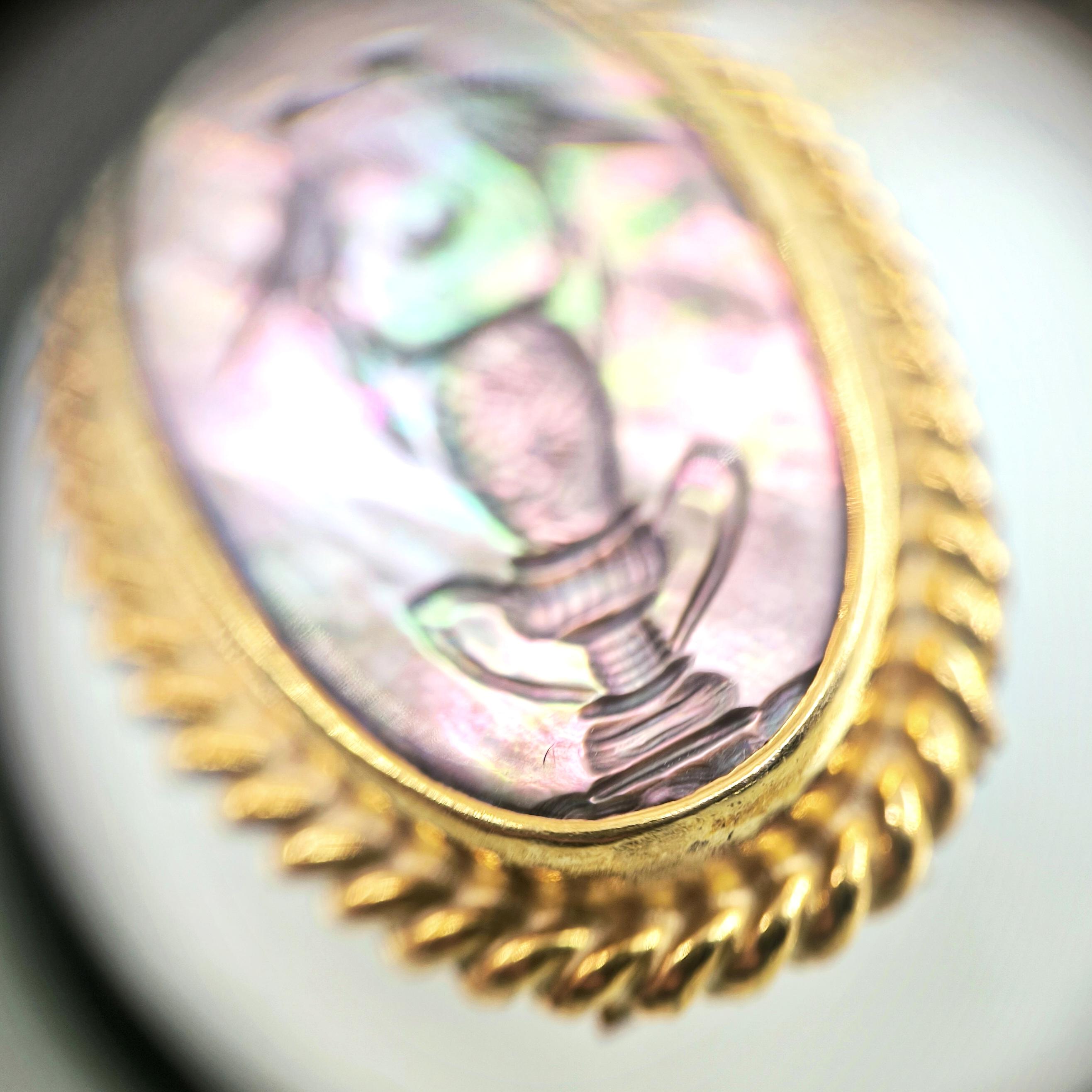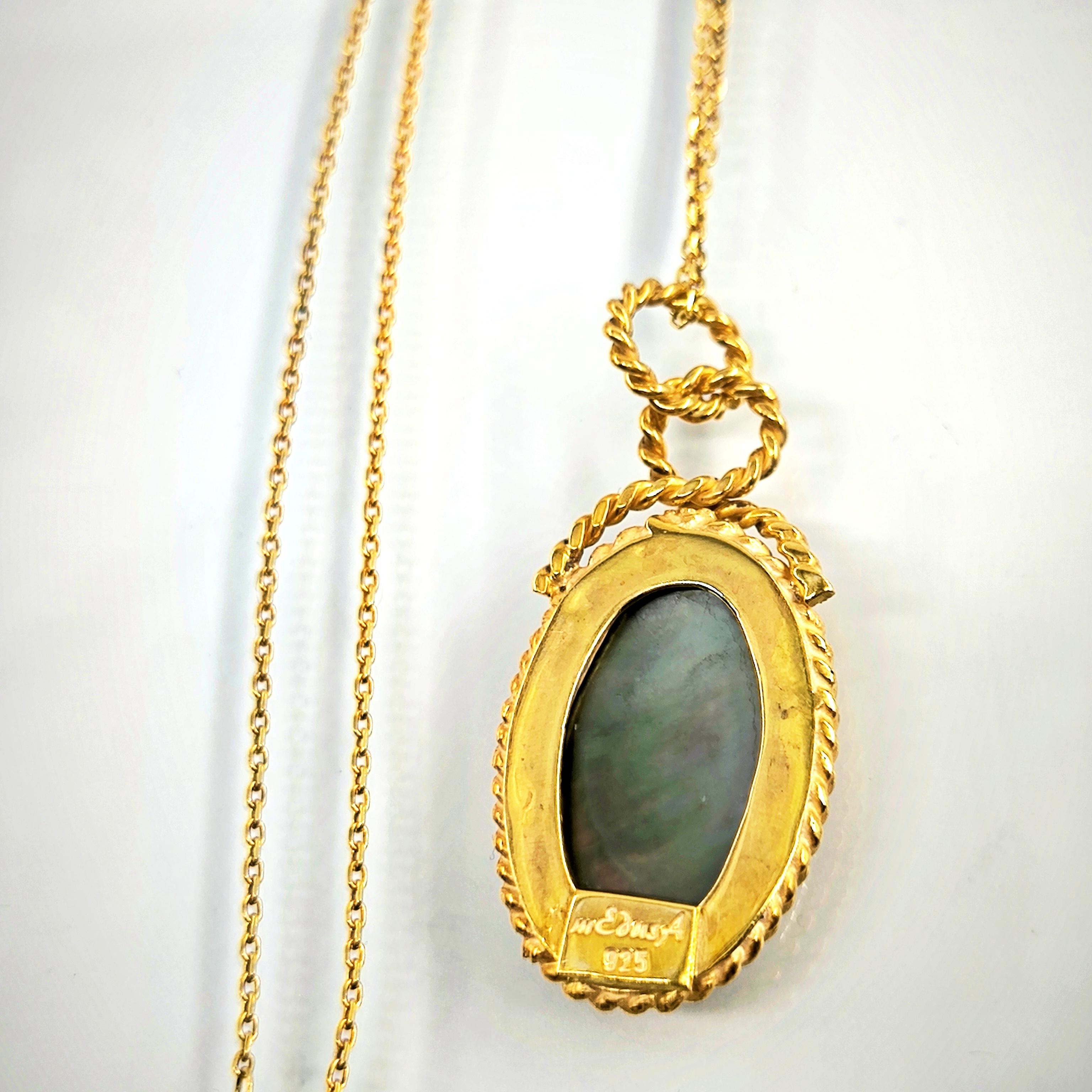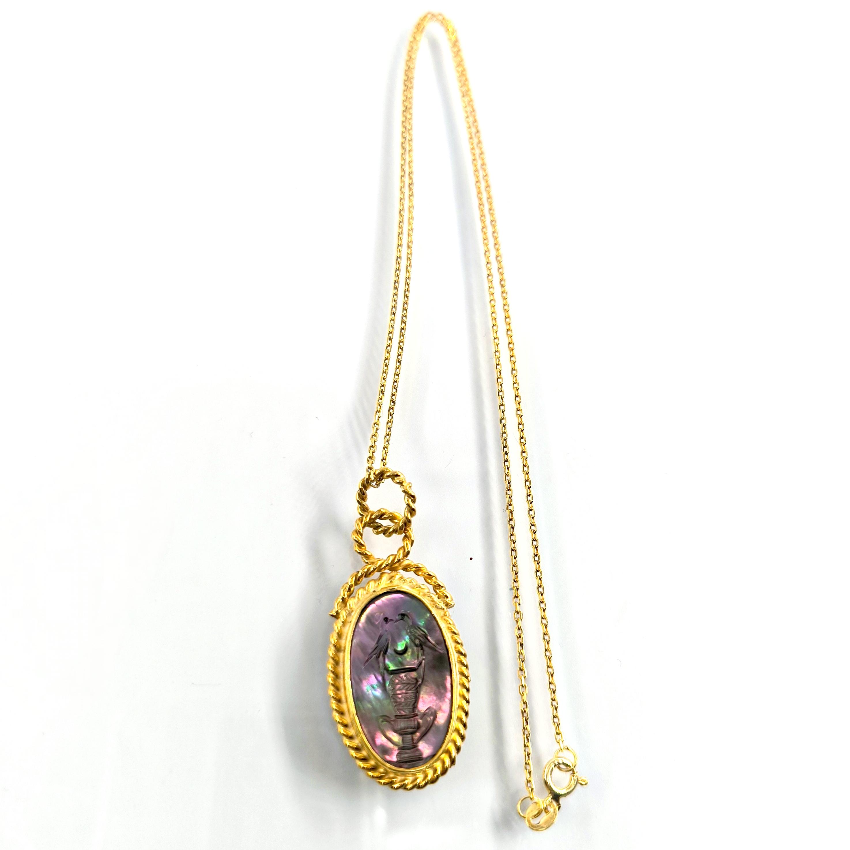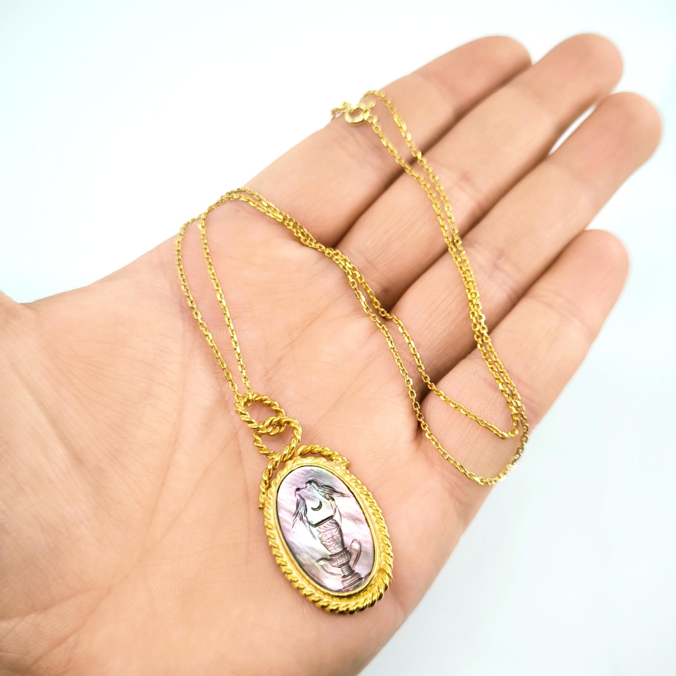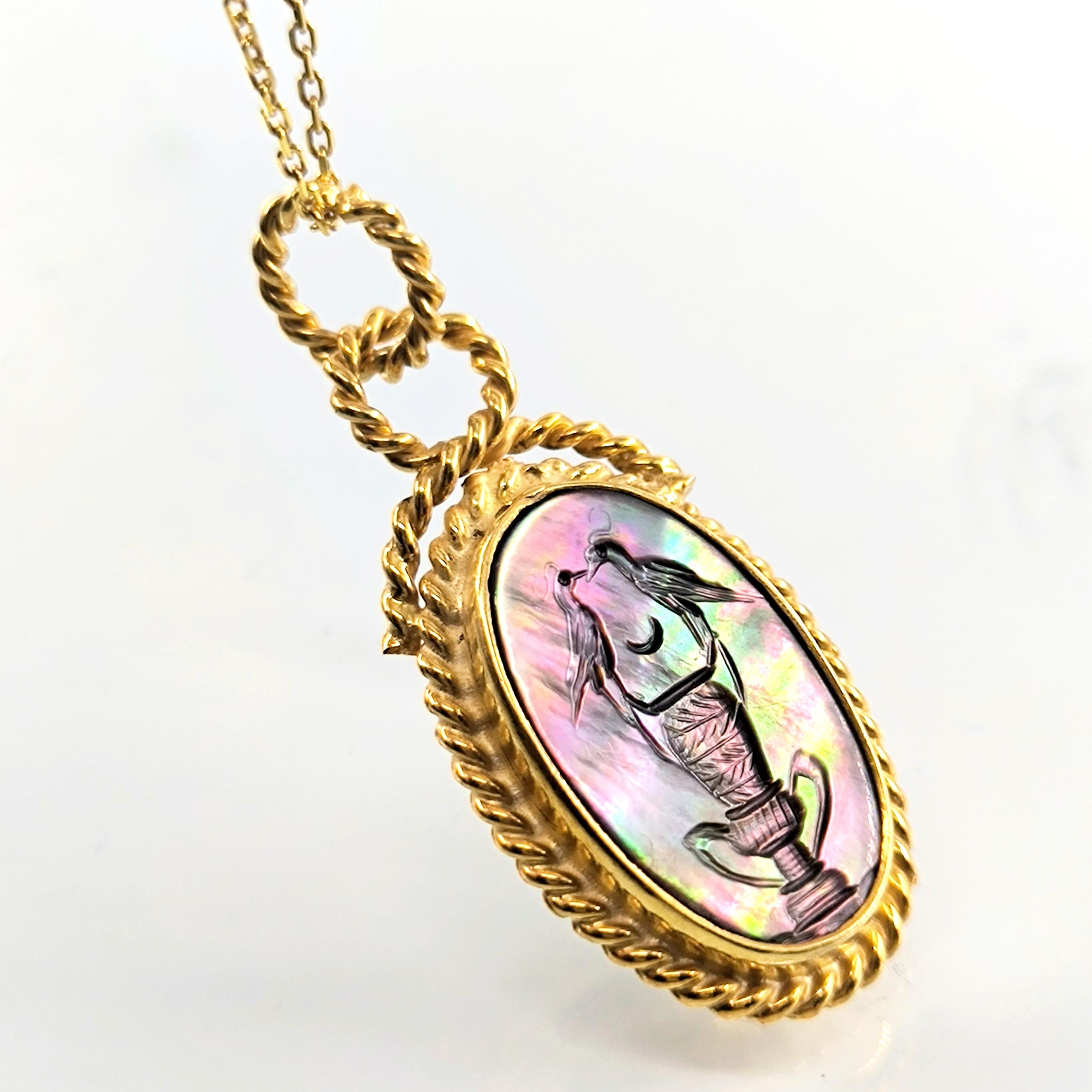 Bu tasarımda romantizmi ve zarafeti antik mücevher sanatının diliyle anlatmak istedim. Tamamı 925 ayar gümüşten hazırlanıp 22 ayar altınla kaplanan zarif çerçeve, merkezdeki doğal sedef taşın büyüleyici renk oyununu ön plana çıkarıyor. Sedef üzerine intaglio tekniğiyle işlediğim küp üzerinde birbirine yaklaşan iki kuş, sadakati, sevgiyi ve birlikteliğin zarif sembolünü anlatır. Işıkla birlikte değişen sedefin pastel tonları sahneye adeta canlı bir ruh kazandırır. Boyunda taşındığında hem romantik hem de sanat değeri yüksek bir parça olarak dikkat çeken bu kolye, duygunun ve estetiğin birleştiği özel bir tasarımdır.