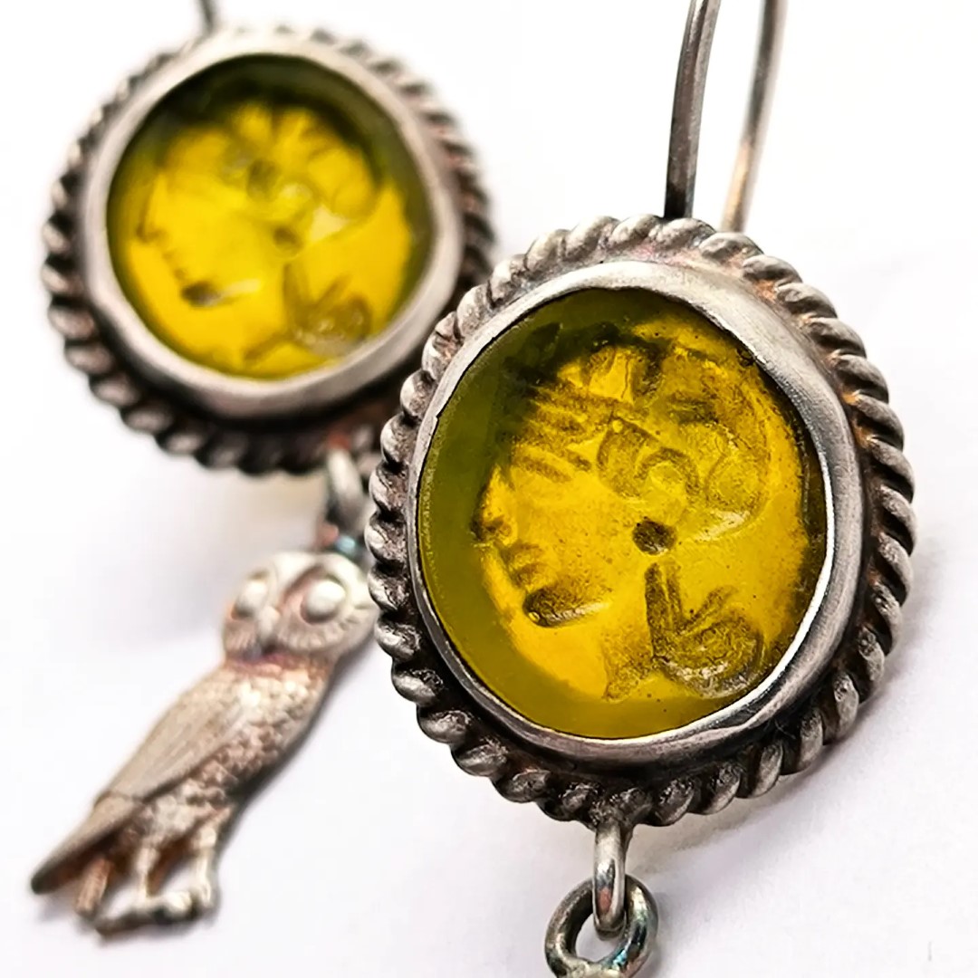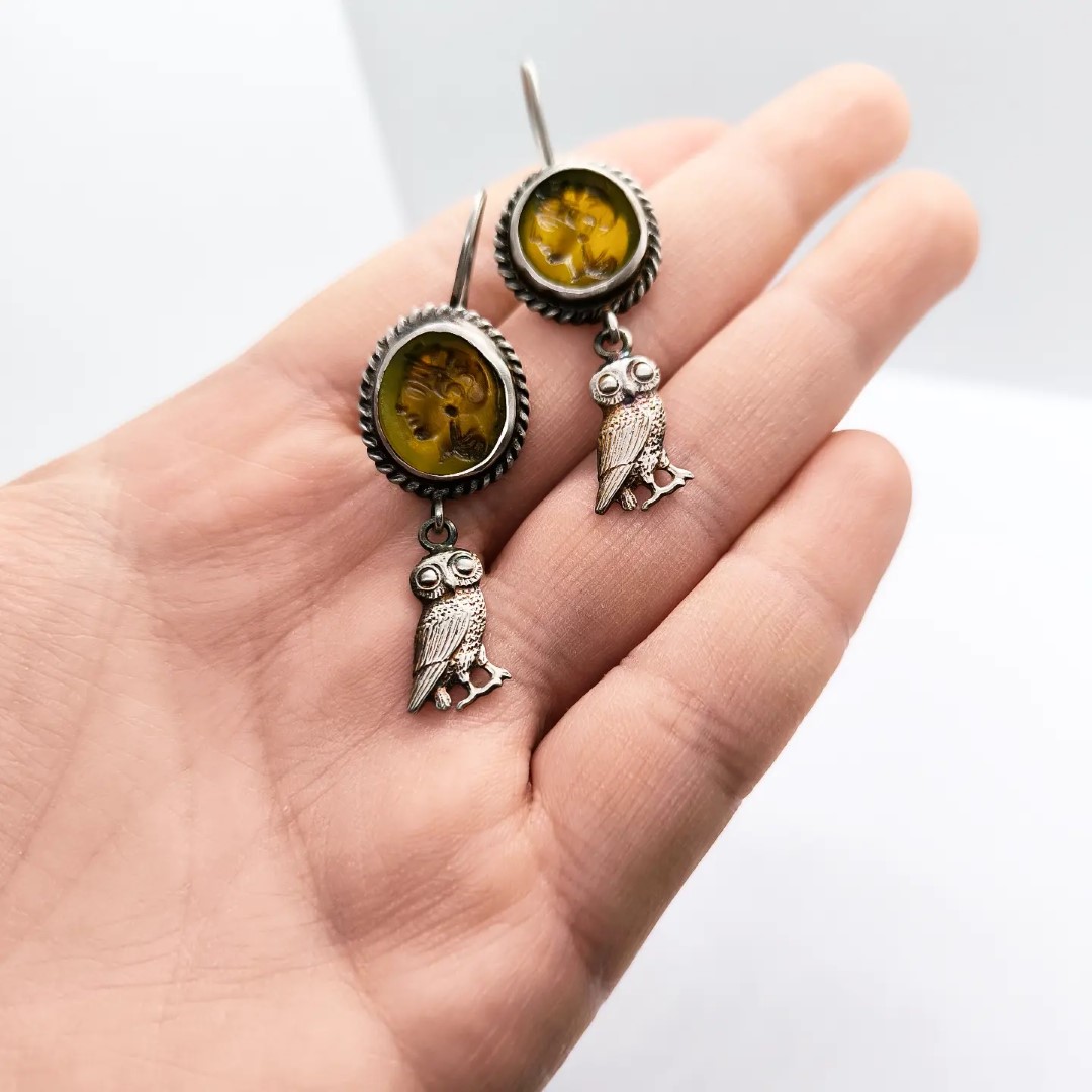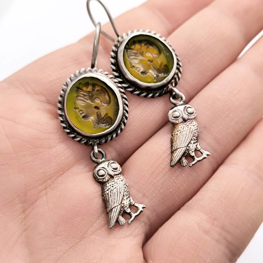 Athena ve Baykuş! Dünyaca ünlü Antik Grek sikkesinden esinlenerek tasarladığımız @medusantik eseri muhteşem küpemiz! Taşı sarı renkte preslenmiş negatif intaglio camdır, cam üzeri intaglio Athena başı oyulup alt kısmını ise sallanan baykuş ile süslediğimiz antik Grek stilde gümüş küpemiz!