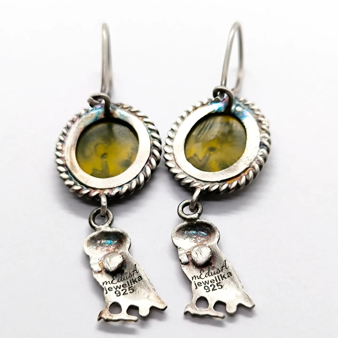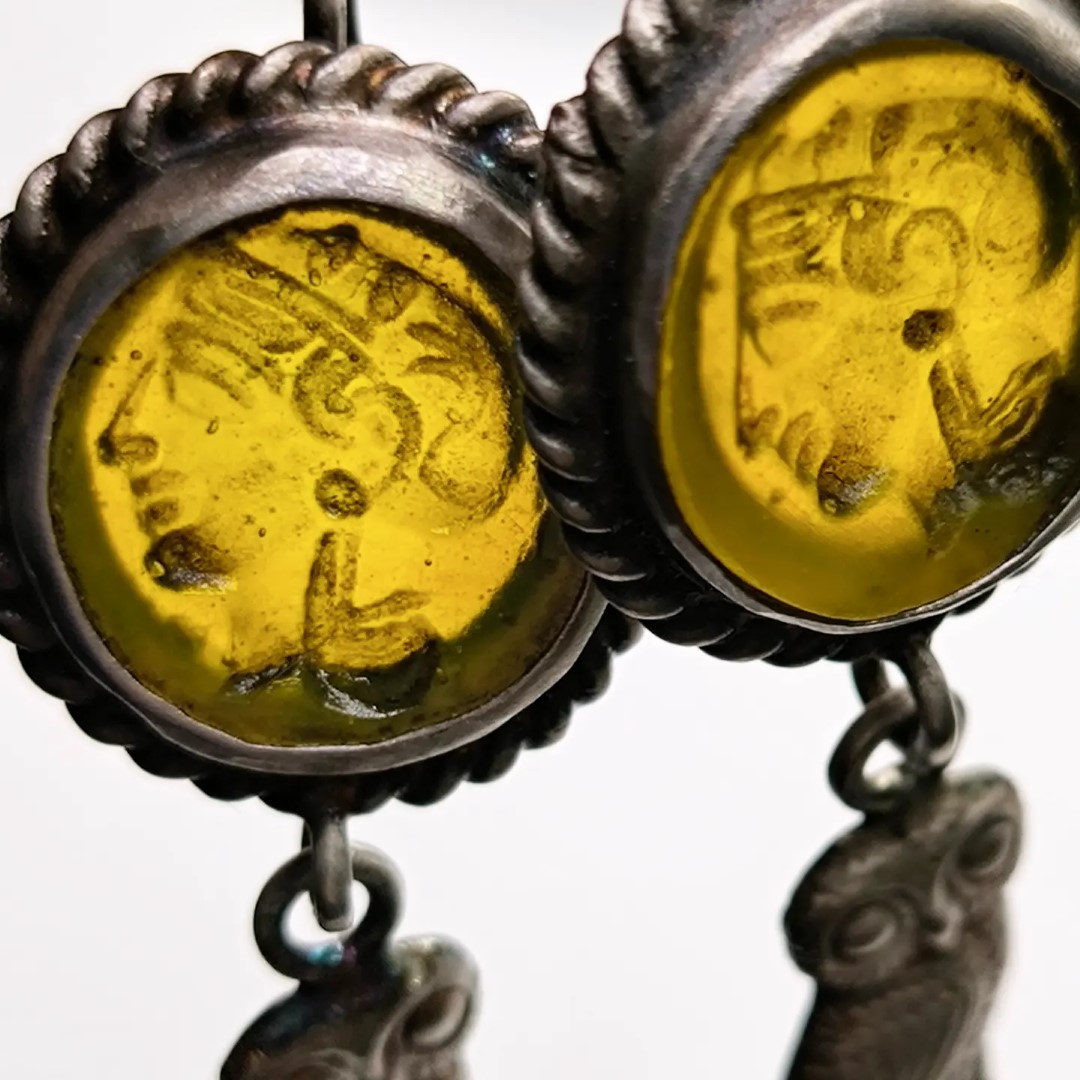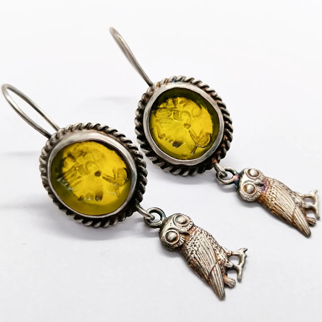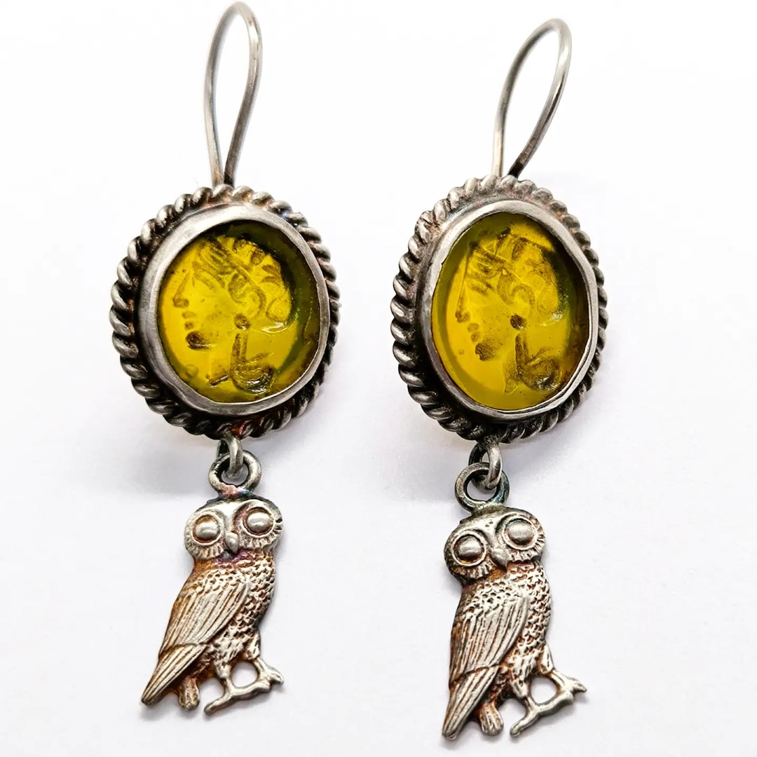 Athena ve Baykuş! Dünyaca ünlü Antik Grek sikkesinden esinlenerek tasarladığımız @medusantik eseri muhteşem küpemiz! Taşı sarı renkte preslenmiş negatif intaglio camdır, cam üzeri intaglio Athena başı oyulup alt kısmını ise sallanan baykuş ile süslediğimiz antik Grek stilde gümüş küpemiz!