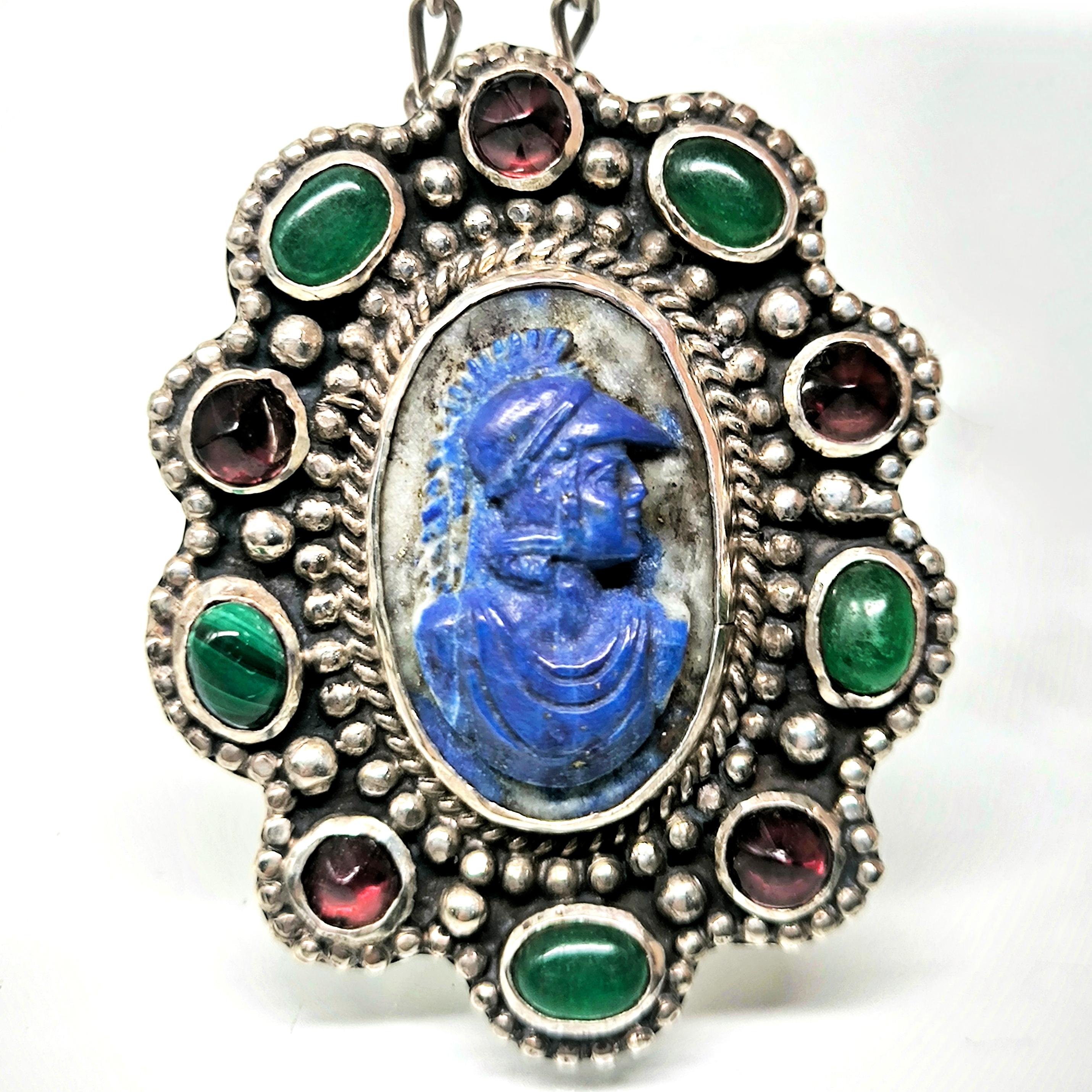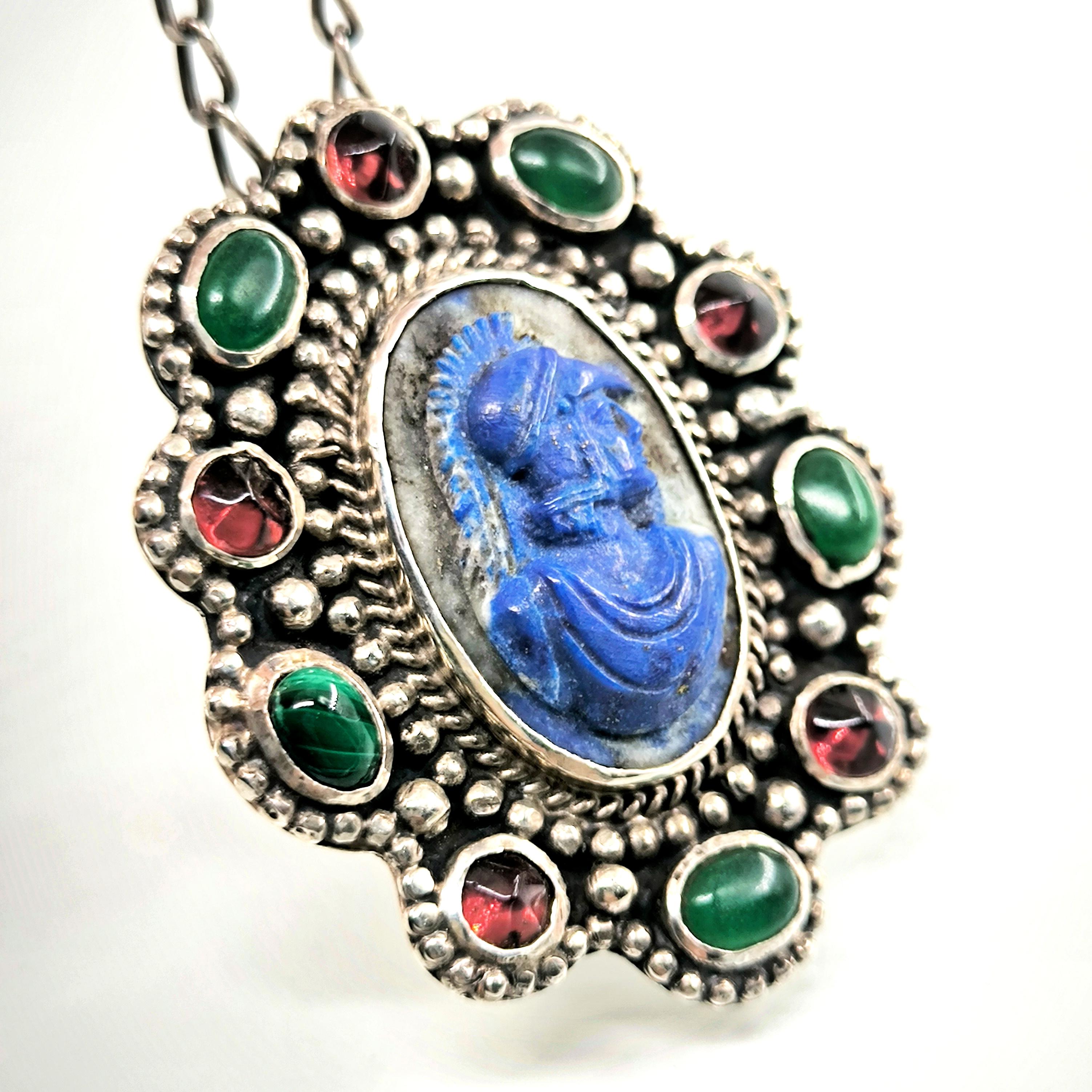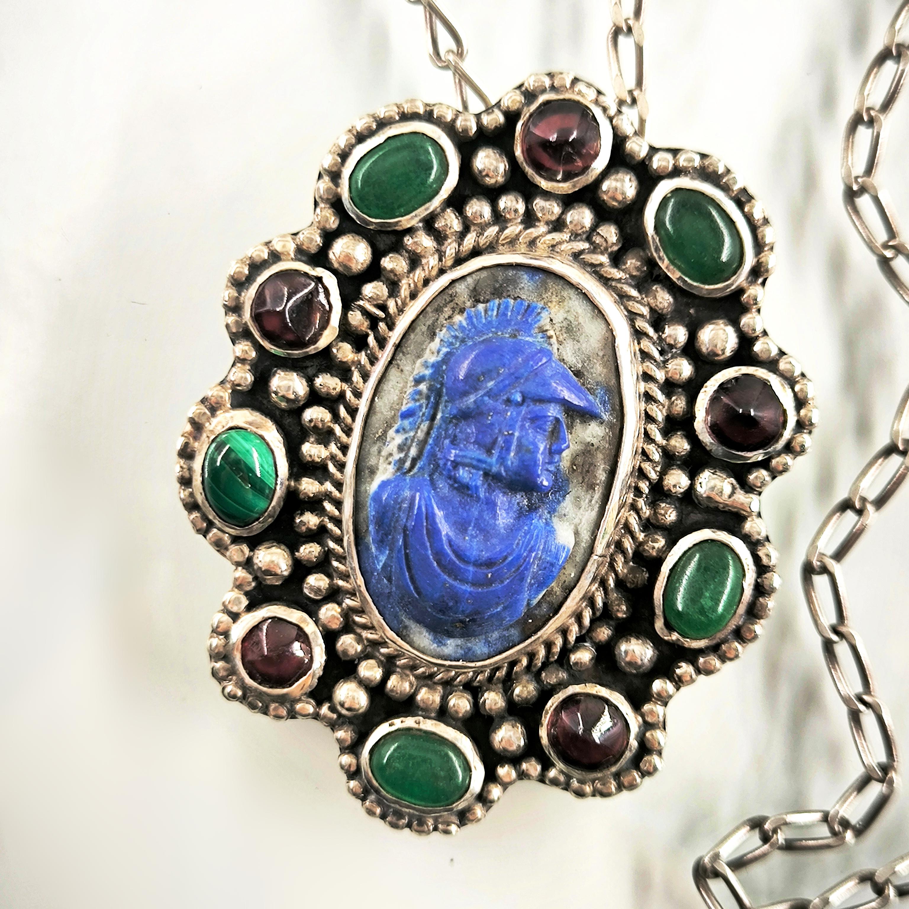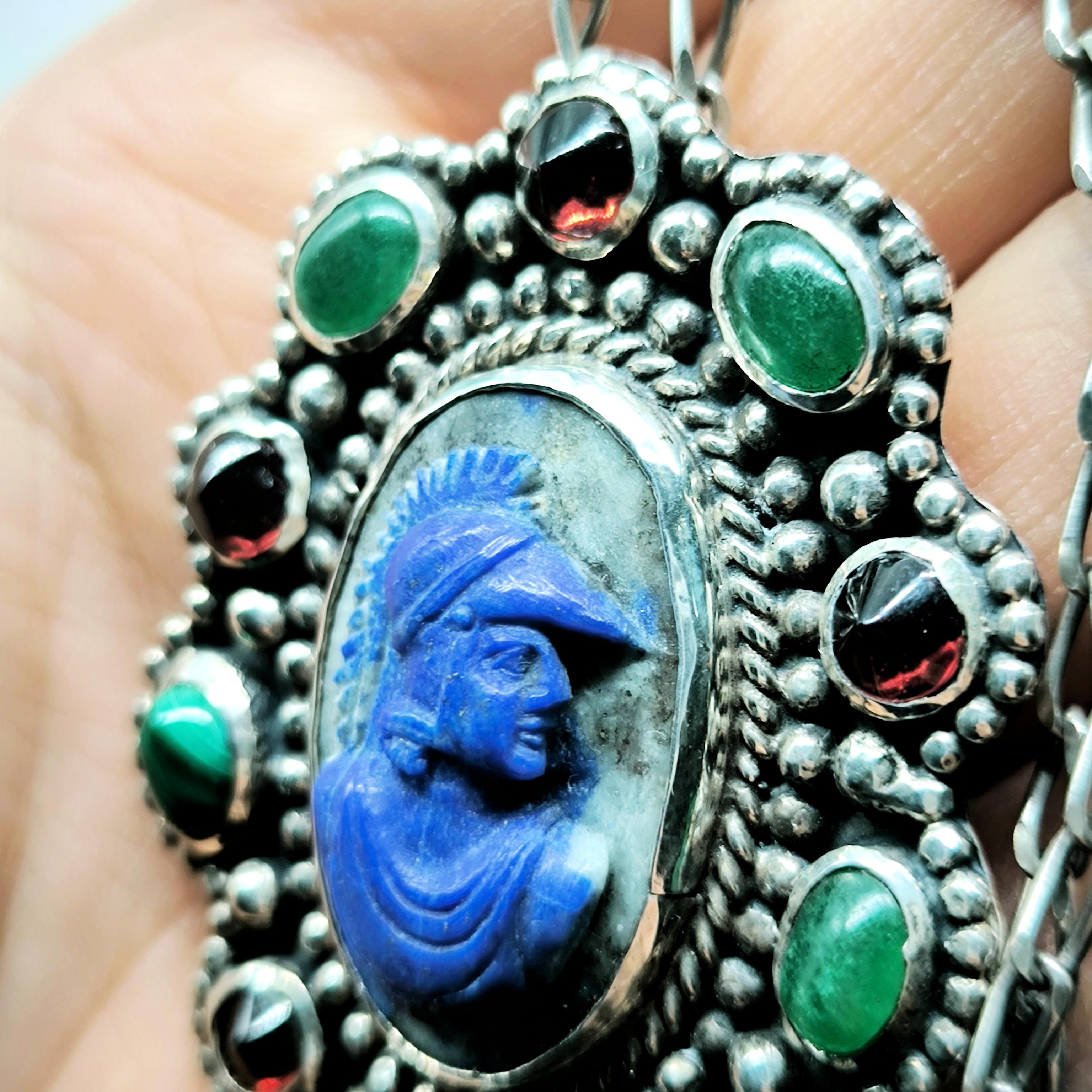 Bu kolye benim için sıradan bir tasarım değil; adeta antik dünyanın ruhunu taşıyan küçük bir sanat eseri. Tamamı 925 ayar gümüşten hazırladığım çerçevenin merkezinde, nadir rastlanan iki renkli lapis lazuli üzerinde çalıştığım Athena kabartması yer alıyor. İki renkli cameo tekniği sayesinde tanrıçanın silueti taşın içinden doğar gibi ortaya çıkar. Etrafını saran malahit ve garnet taşlar ise hem renk hem de enerji olarak bu kadim figürü güçlü bir şekilde tamamlar. Athena’nın bilgeliğini, savaşçı ruhunu ve koruyucu gücünü temsil eden bu eser, boyunda taşınan bir mücevherden çok daha fazlasıdır. Koleksiyon değeri taşıyan, karakteri olan ve bakıldıkça hikâyesi derinleşen özel bir parça. Böyle bir taş ve işçilik birleşimi ise gerçekten nadir bulunur.