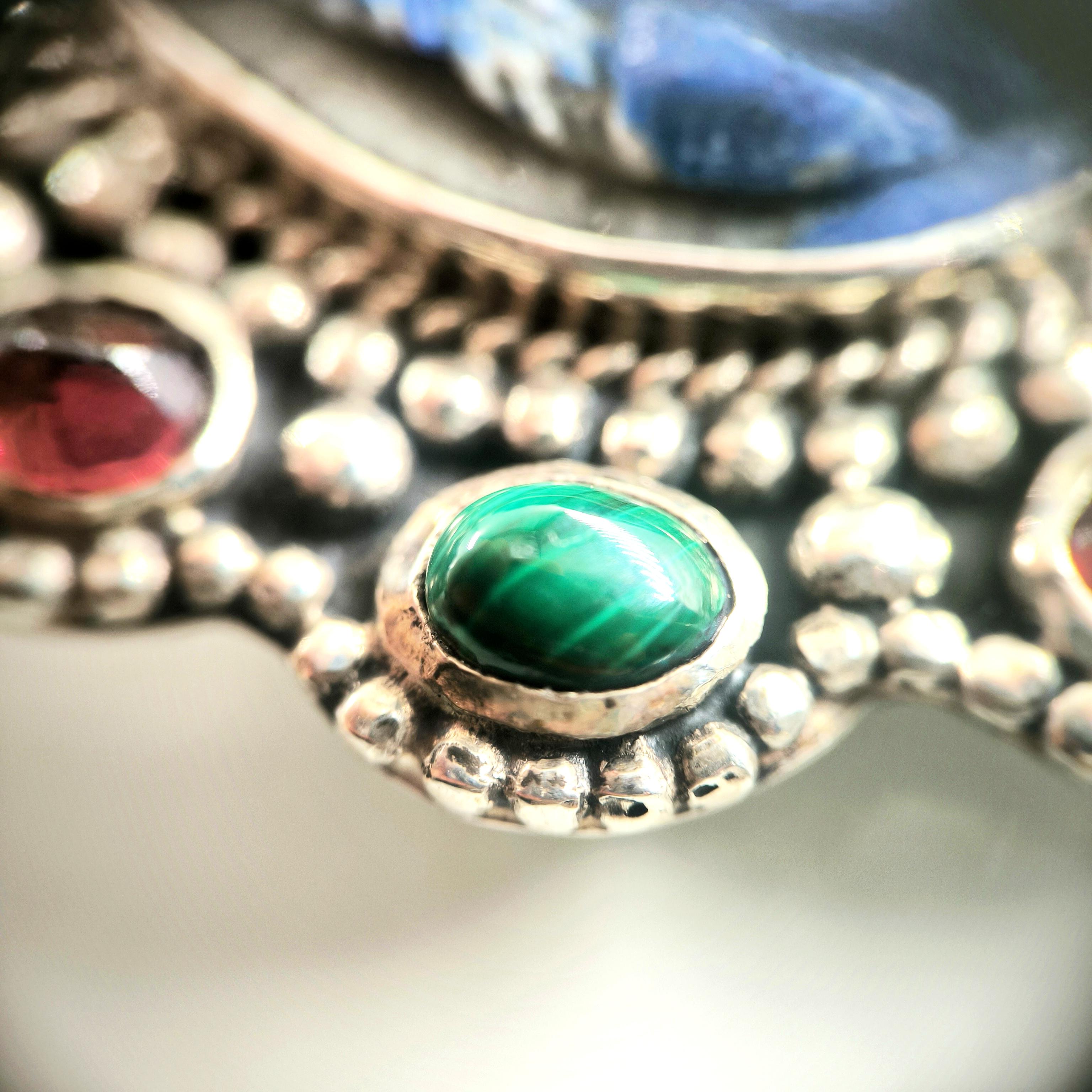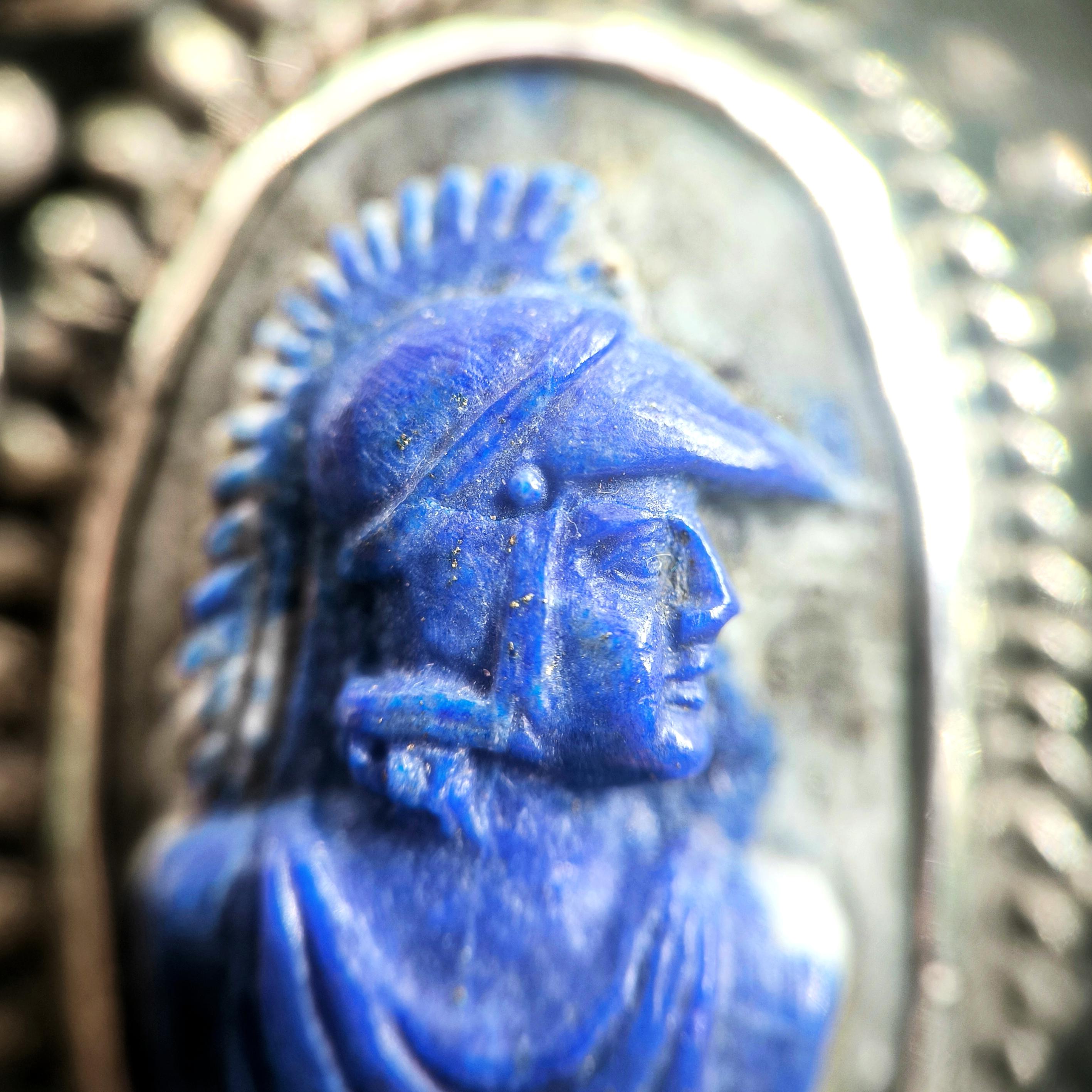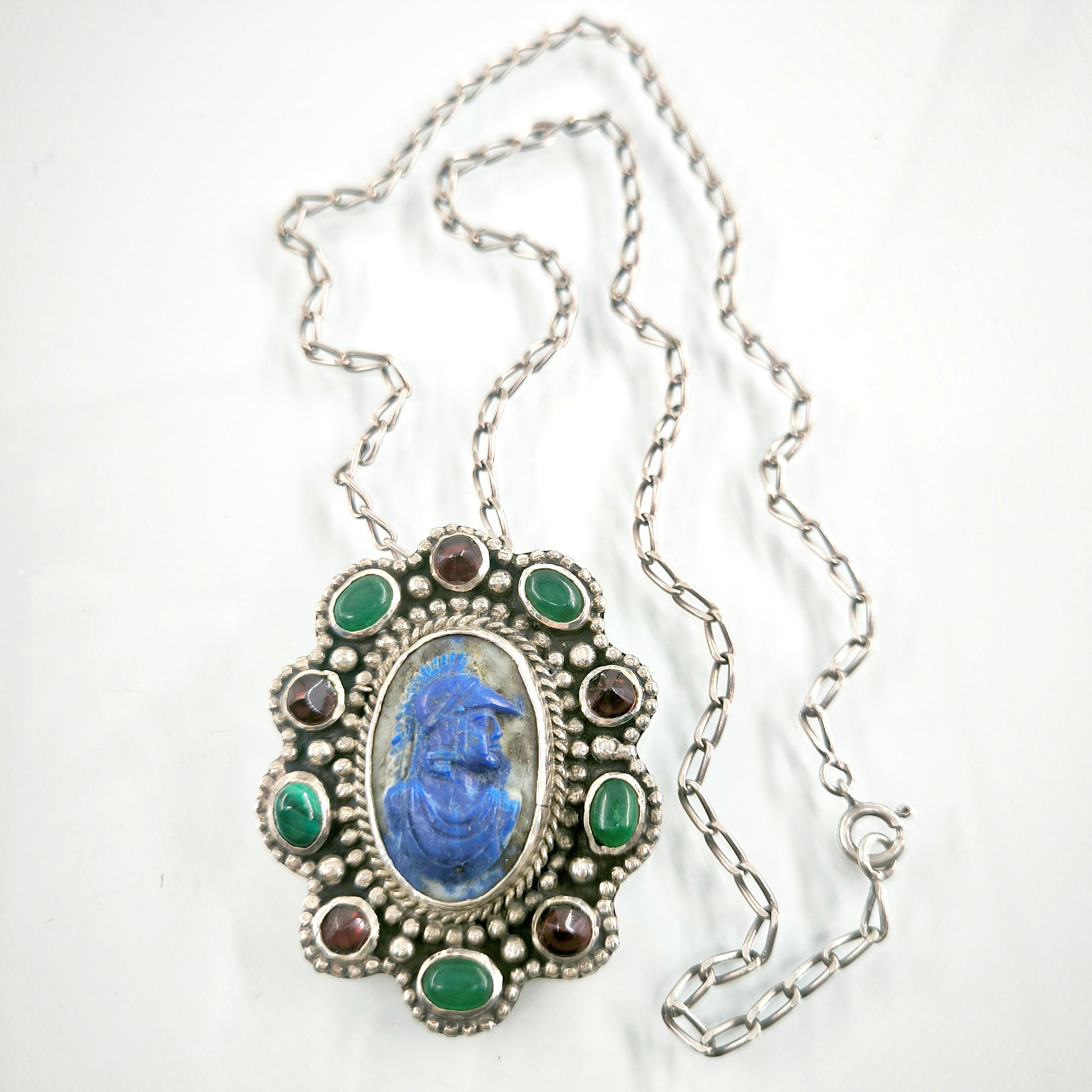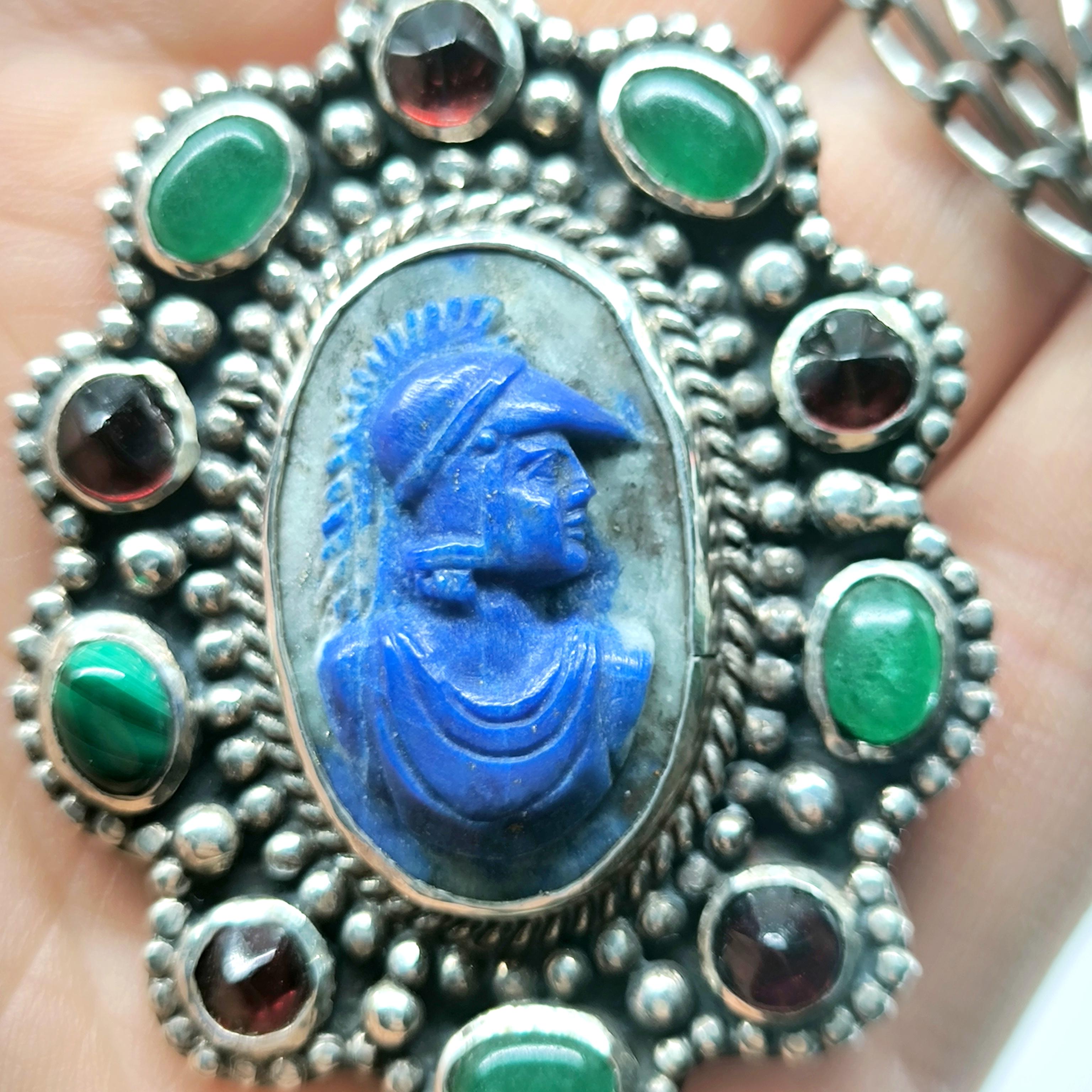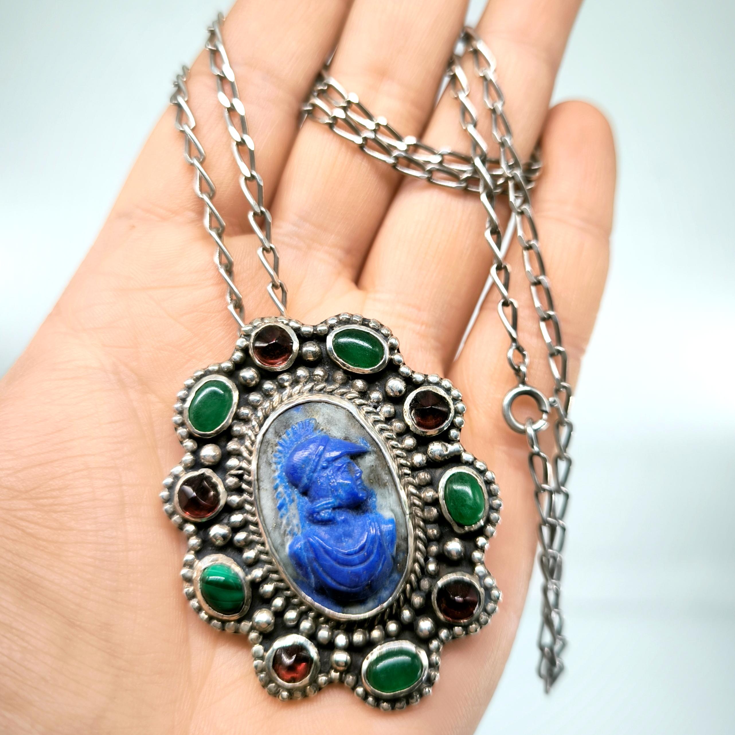 Bu kolye benim için sıradan bir tasarım değil; adeta antik dünyanın ruhunu taşıyan küçük bir sanat eseri. Tamamı 925 ayar gümüşten hazırladığım çerçevenin merkezinde, nadir rastlanan iki renkli lapis lazuli üzerinde çalıştığım Athena kabartması yer alıyor. İki renkli cameo tekniği sayesinde tanrıçanın silueti taşın içinden doğar gibi ortaya çıkar. Etrafını saran malahit ve garnet taşlar ise hem renk hem de enerji olarak bu kadim figürü güçlü bir şekilde tamamlar. Athena’nın bilgeliğini, savaşçı ruhunu ve koruyucu gücünü temsil eden bu eser, boyunda taşınan bir mücevherden çok daha fazlasıdır. Koleksiyon değeri taşıyan, karakteri olan ve bakıldıkça hikâyesi derinleşen özel bir parça. Böyle bir taş ve işçilik birleşimi ise gerçekten nadir bulunur.