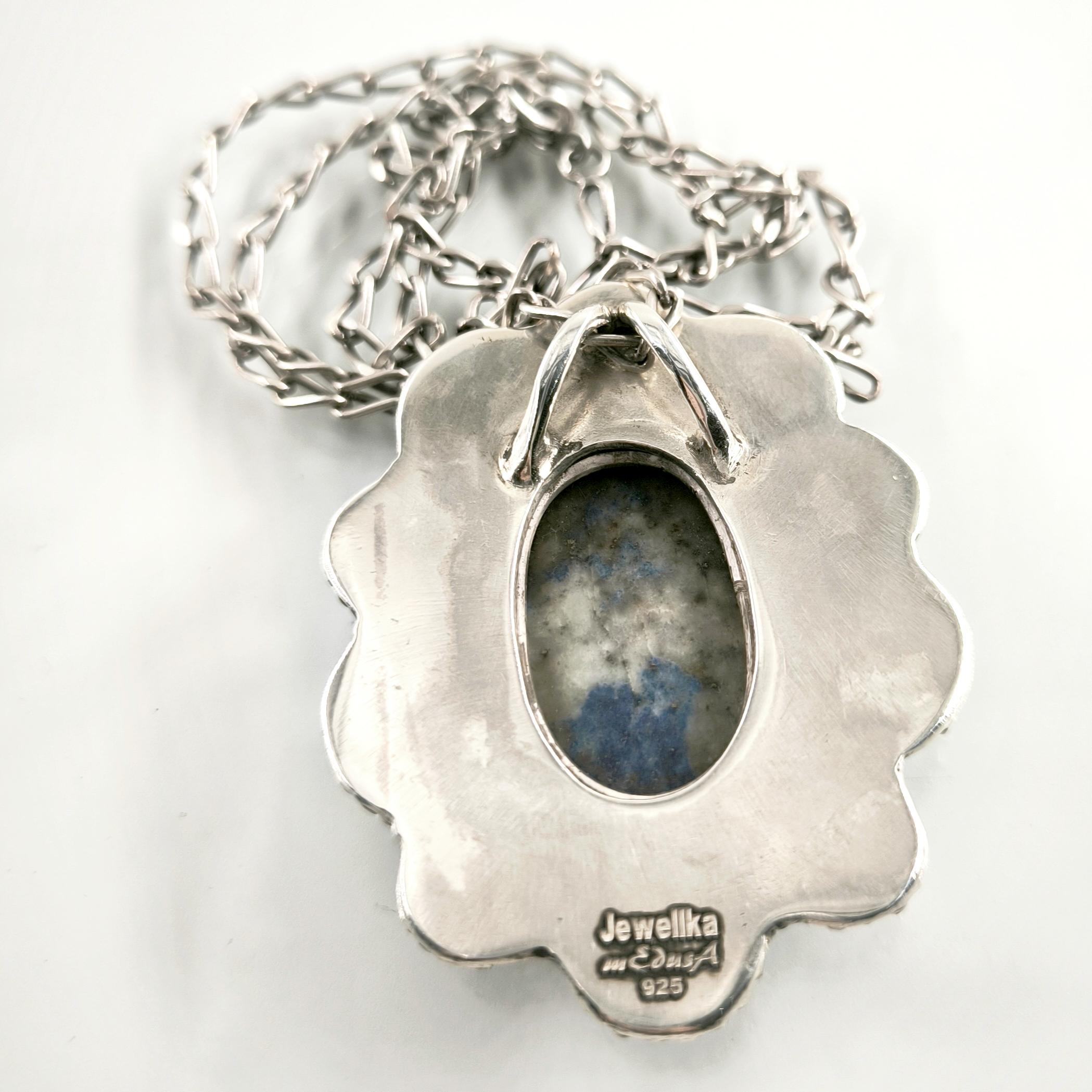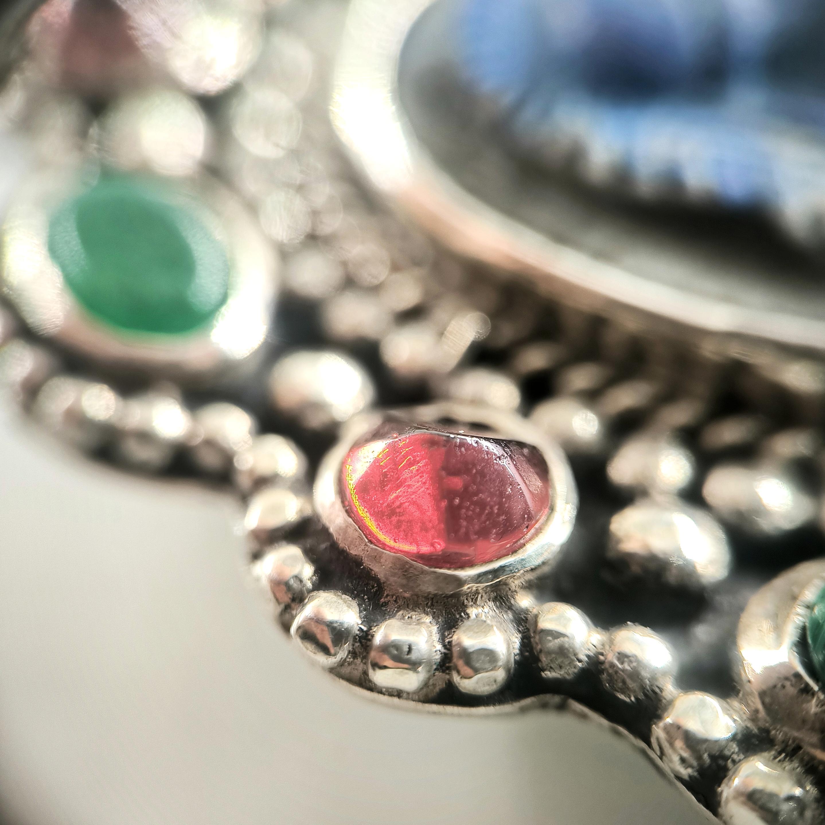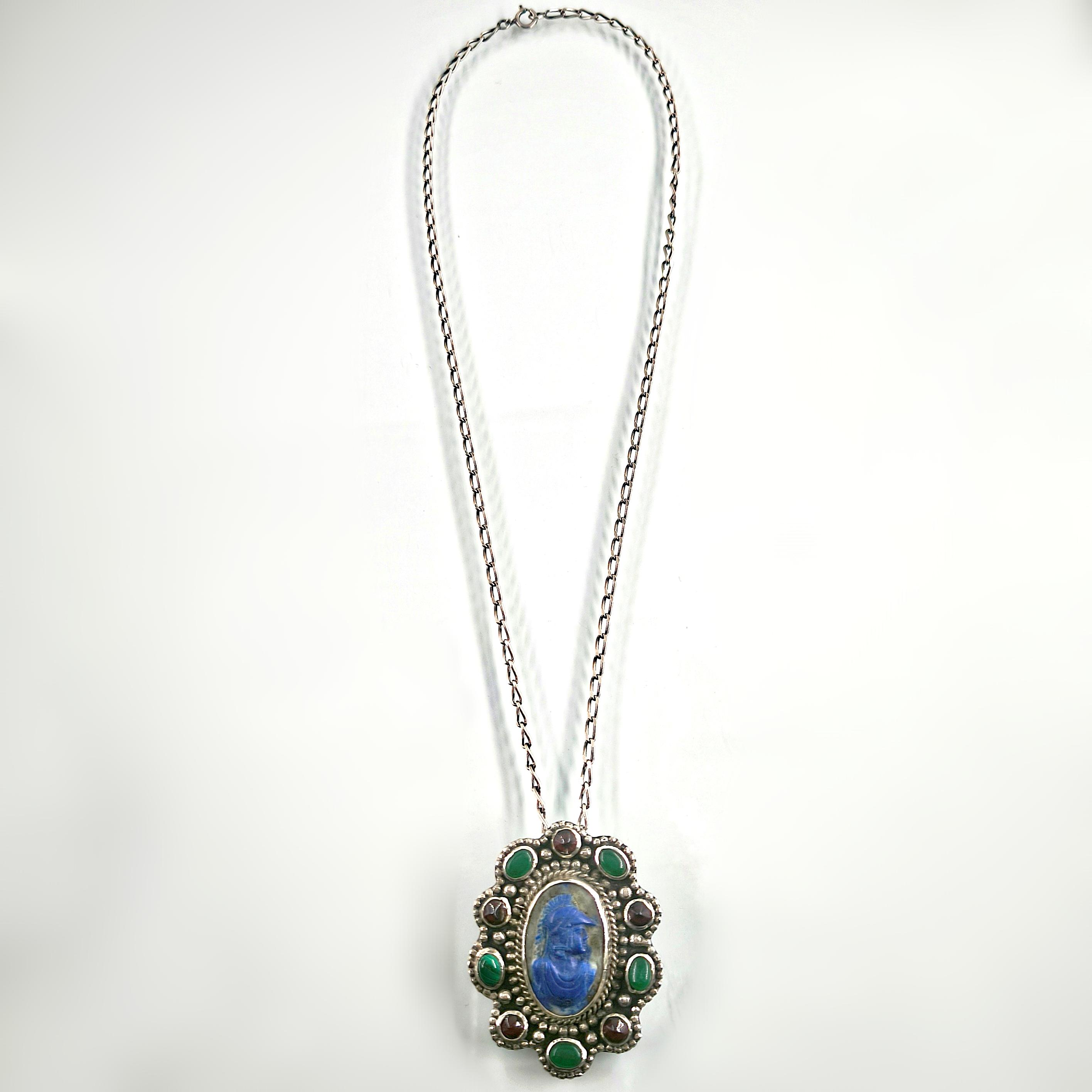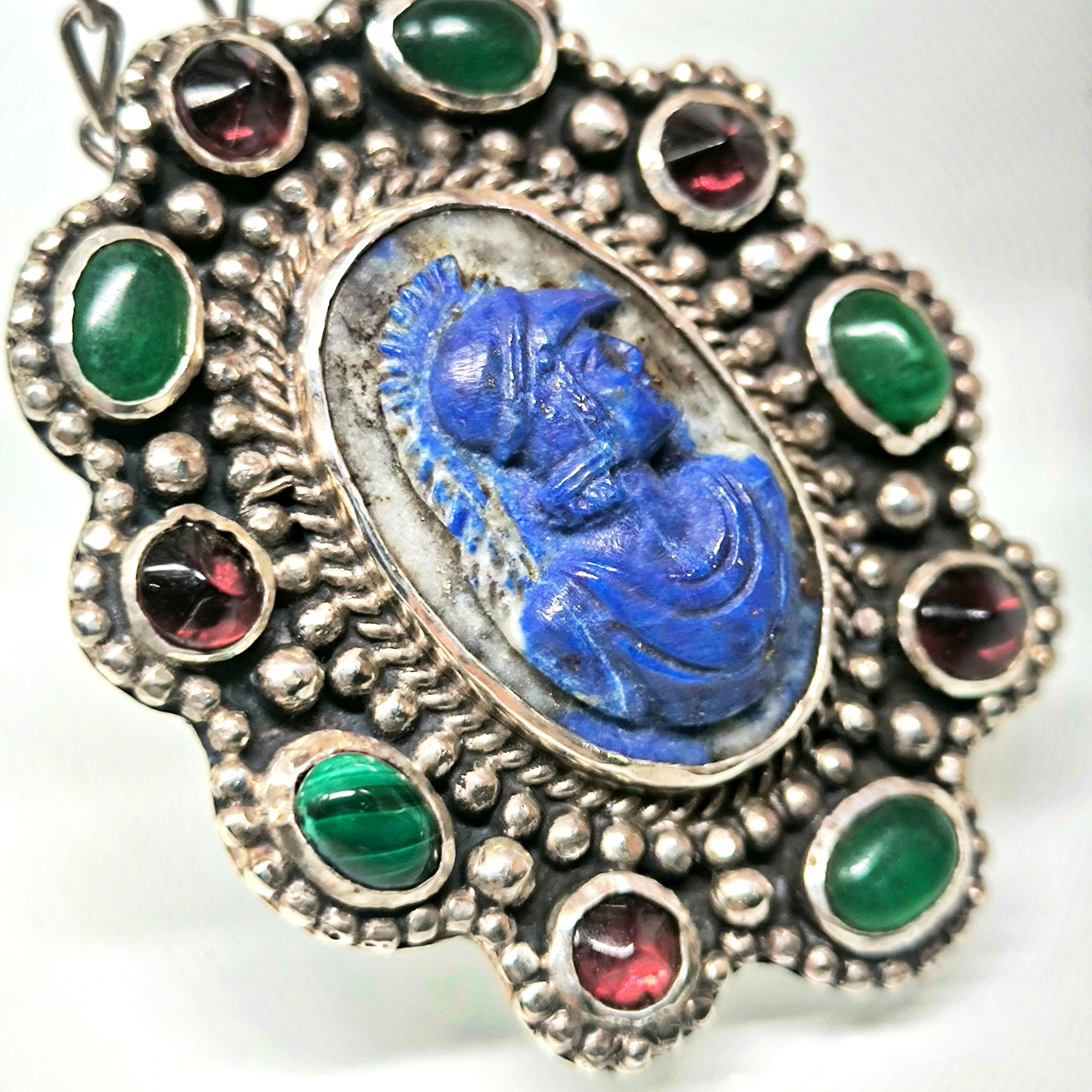 Bu kolye benim için sıradan bir tasarım değil; adeta antik dünyanın ruhunu taşıyan küçük bir sanat eseri. Tamamı 925 ayar gümüşten hazırladığım çerçevenin merkezinde, nadir rastlanan iki renkli lapis lazuli üzerinde çalıştığım Athena kabartması yer alıyor. İki renkli cameo tekniği sayesinde tanrıçanın silueti taşın içinden doğar gibi ortaya çıkar. Etrafını saran malahit ve garnet taşlar ise hem renk hem de enerji olarak bu kadim figürü güçlü bir şekilde tamamlar. Athena’nın bilgeliğini, savaşçı ruhunu ve koruyucu gücünü temsil eden bu eser, boyunda taşınan bir mücevherden çok daha fazlasıdır. Koleksiyon değeri taşıyan, karakteri olan ve bakıldıkça hikâyesi derinleşen özel bir parça. Böyle bir taş ve işçilik birleşimi ise gerçekten nadir bulunur.