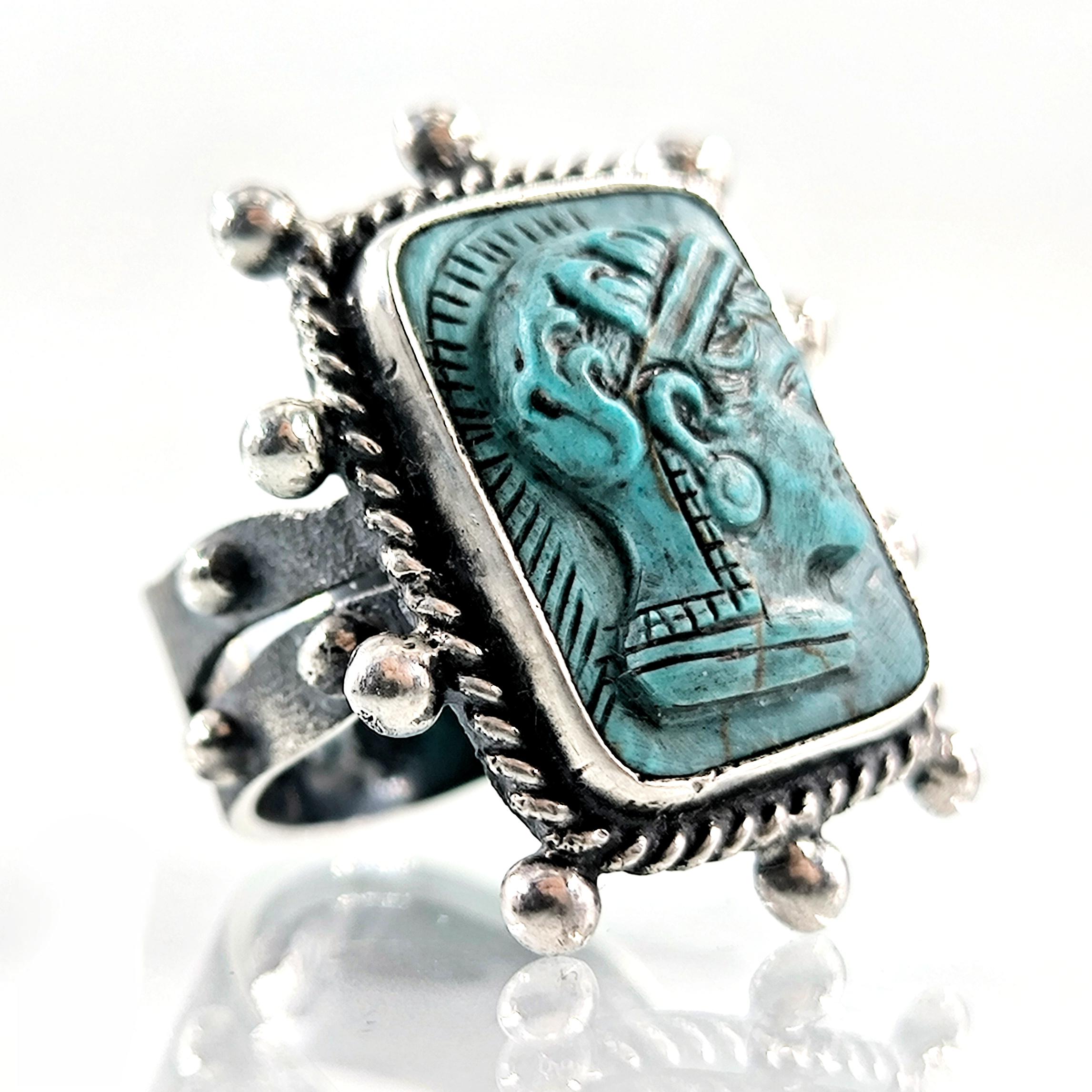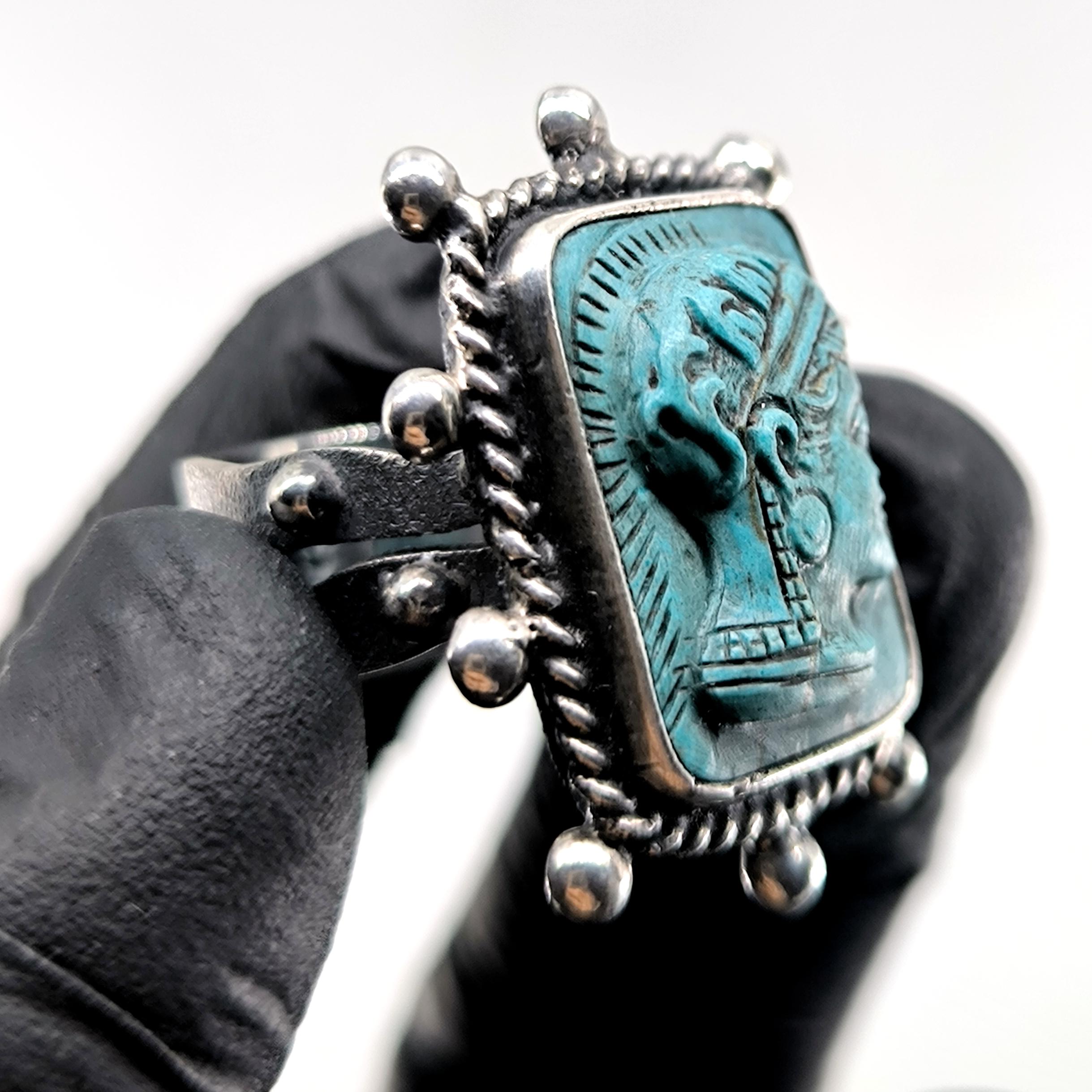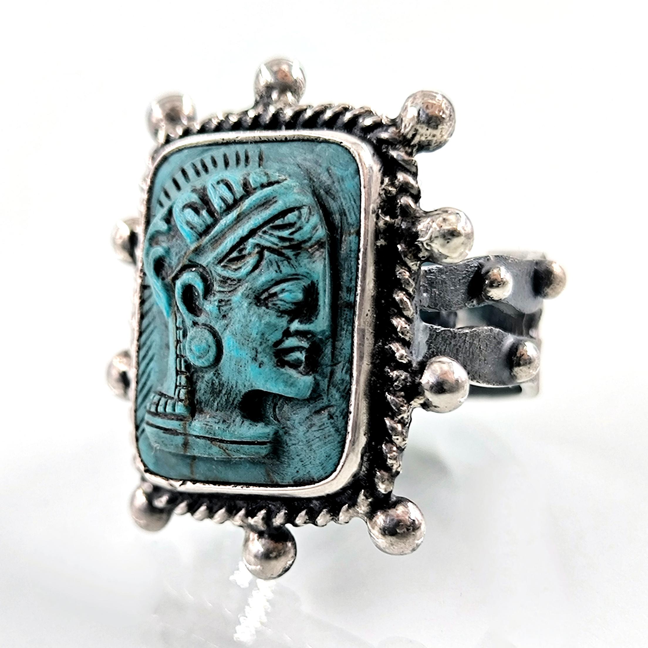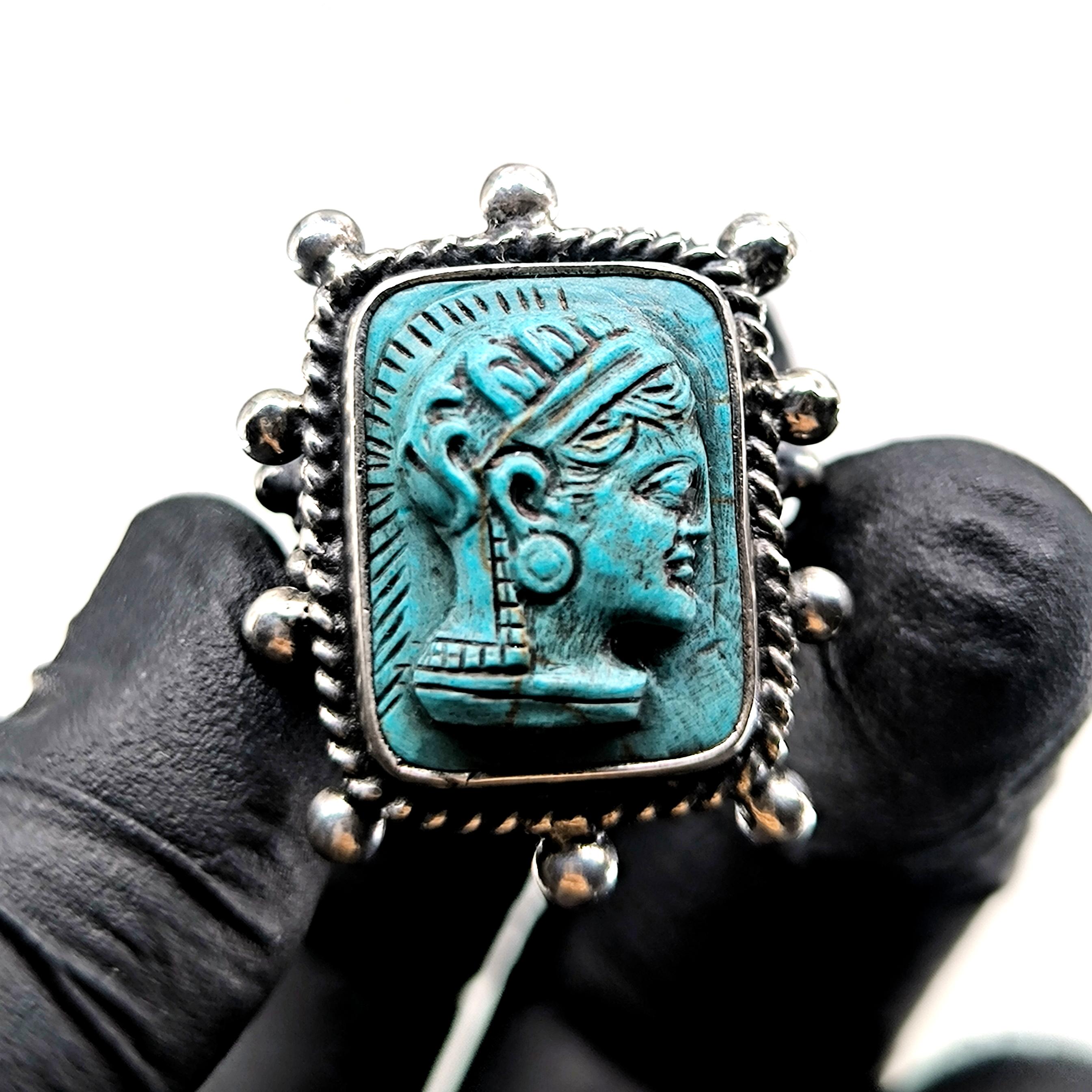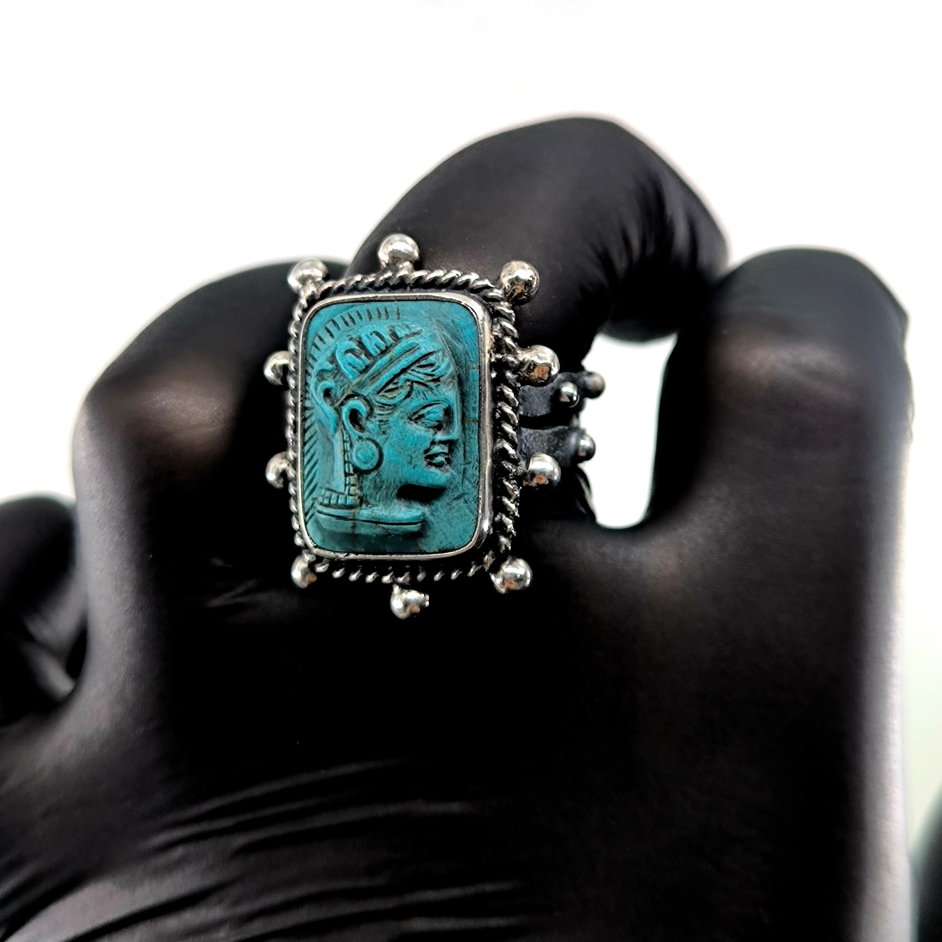 Bilgeliğin, stratejinin ve içsel gücün tanrıçası Athena, bu yüzükte kadim bir mühür gibi yeniden vücut buluyor. Antik dünyada aklın ve savaşın dengesiyle anılan Athena figürü, yüzüğün merkezinde zamana meydan okuyan bir sessizlikle bakışlarını taşıyor; her açıdan bakıldığında farklı bir ruh hâli fısıldıyor. Kabartmanın net çizgileri ve yüz ifadesindeki derinlik, eseri yalnızca bir takı değil, sembolik bir güç nesnesine dönüştürüyor. Yüzüğün etrafını saran gümüş detaylar ve eskitme dokular, antik bir arkeolojik buluntu hissini bilinçli olarak güçlendiriyor. Teknik olarak yüzük 925 ayar gümüşten tamamen el işçiliğiyle üretilmiştir; taş kısmı laboratuvar üretimi sentetik firuze olup üzerine Athena kabartması uygulanmıştır. Eskitme yüzey işlemi sayesinde detaylar daha derin ve karakterli bir görünüm kazanmıştır.