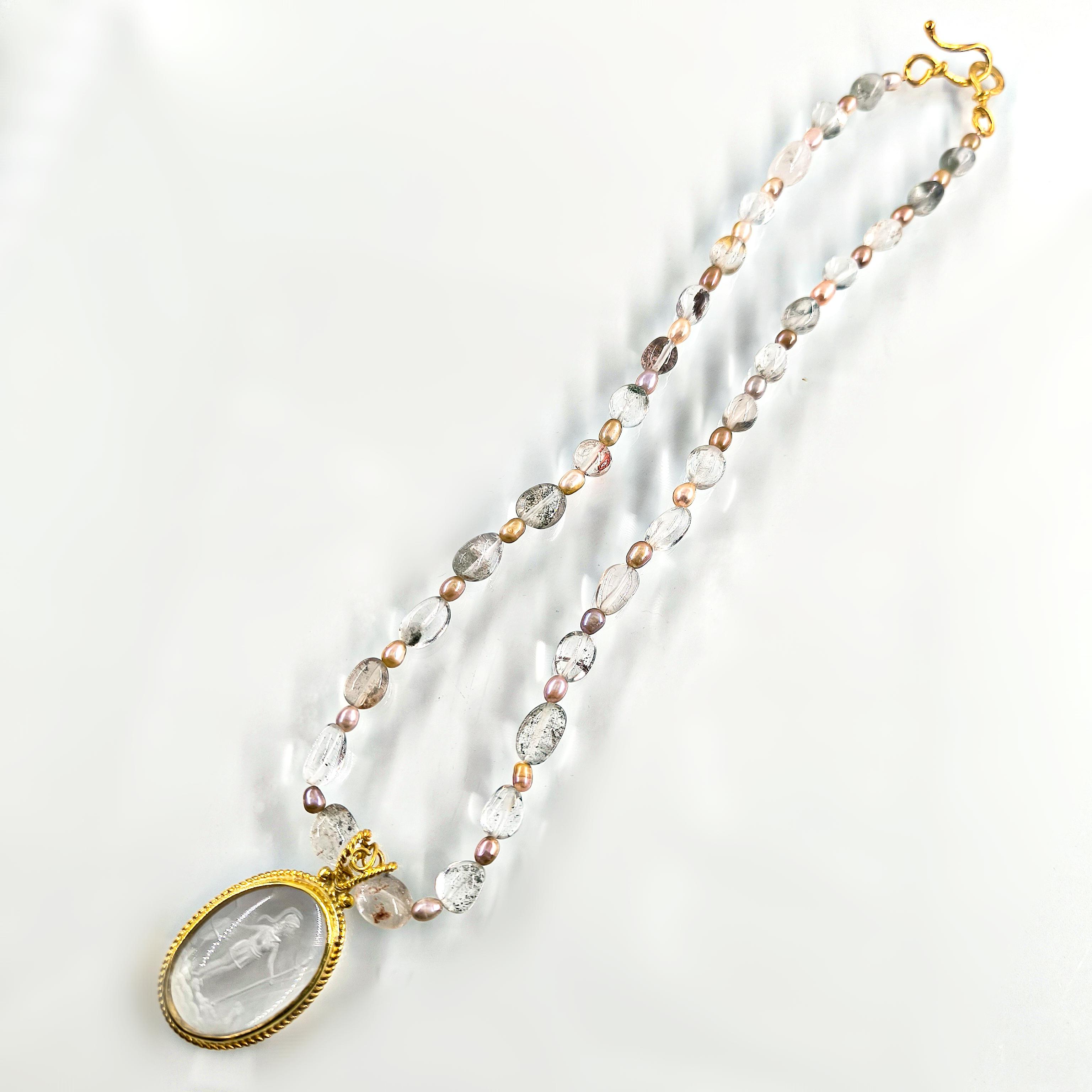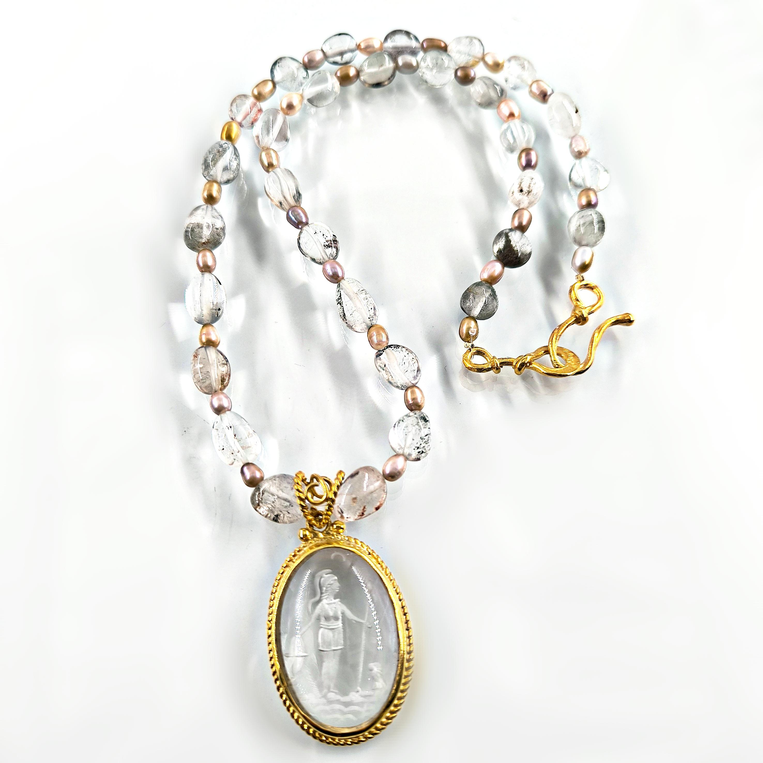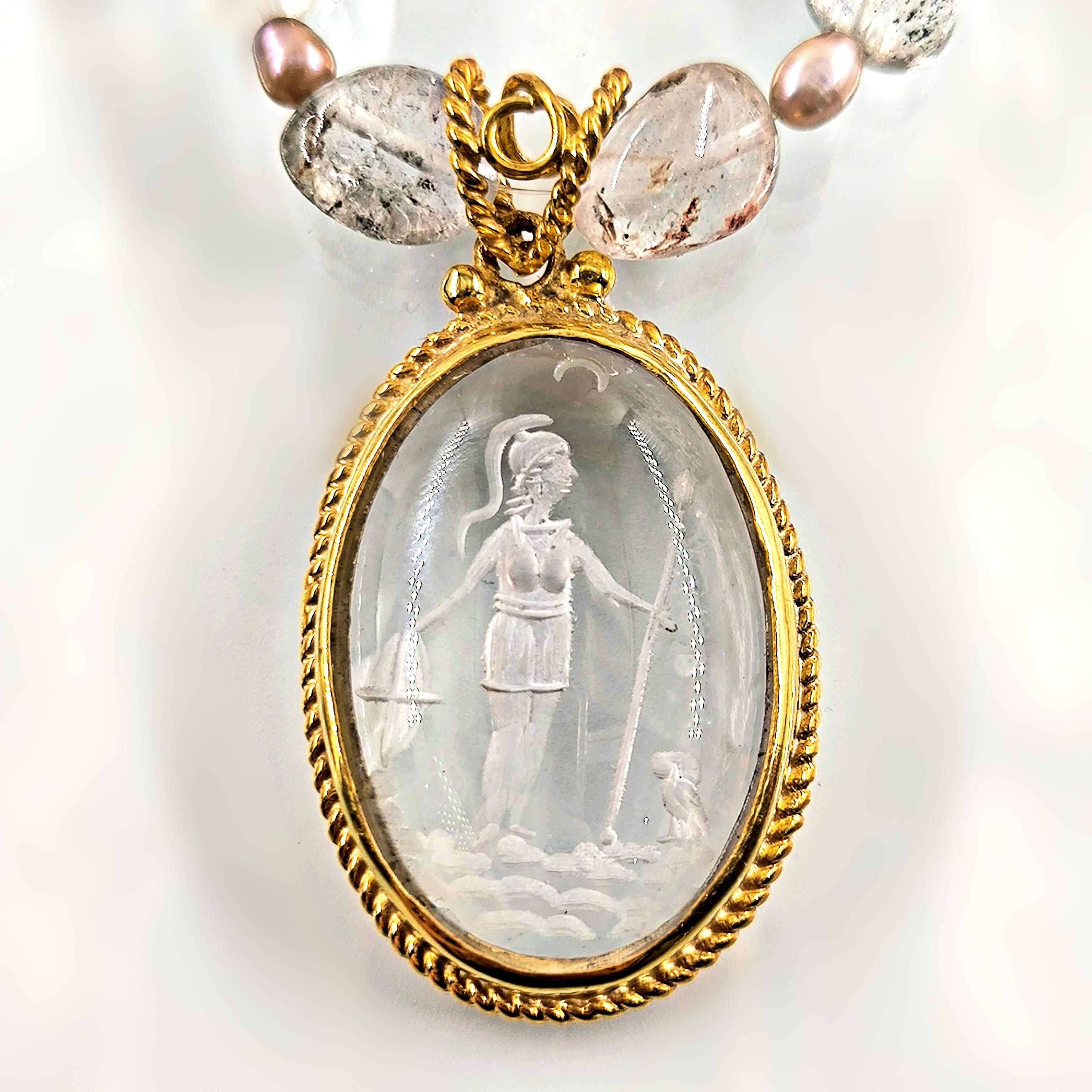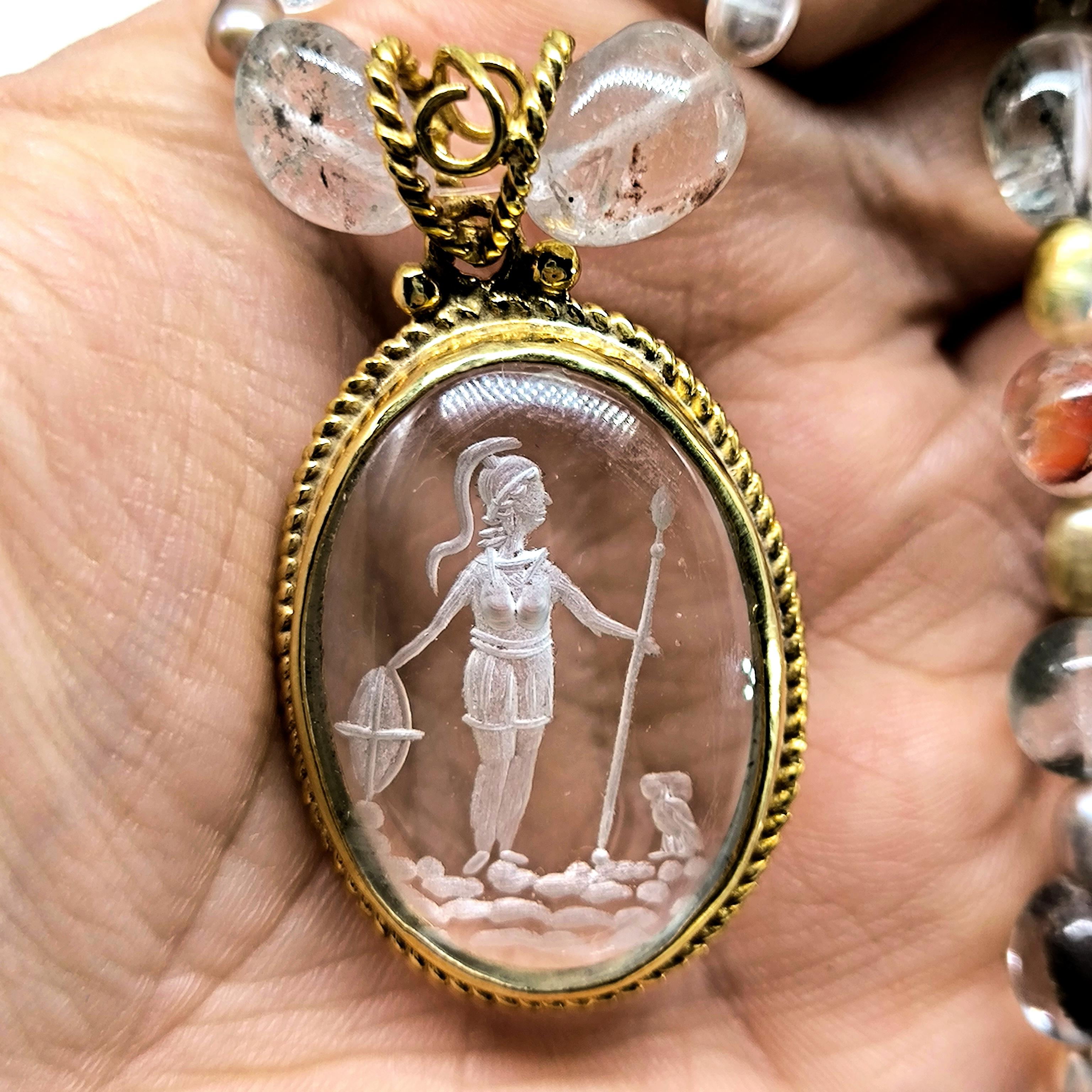 Bu tasarımda antik dünyanın zarafetini ve doğal taşların büyüsünü bir araya getirdim. Zincir bölümünde yer alan amorf kesim garden kuvars taşlar, içlerindeki doğal izlerle her taneyi benzersiz kılarken aralarındaki natürel inciler kolyeye zarif bir ışıltı katıyor. Kolye ucu tamamen 925 ayar gümüşten hazırlanmış ve 22 ayar altın kaplama ile zengin bir karakter kazanmıştır. Merkezdeki krsital kabeşon cam taş üzerine negatif intaglio tekniği ile işlediğim Athena figürü, bilgeliğin ve koruyucu gücün kadim sembolünü taşır. Antik mücevher estetiğinden ilham alan bu parça, boyunda hem zarif hem de güçlü bir sanat eseri gibi duran özel bir Medusa tasarımıdır.