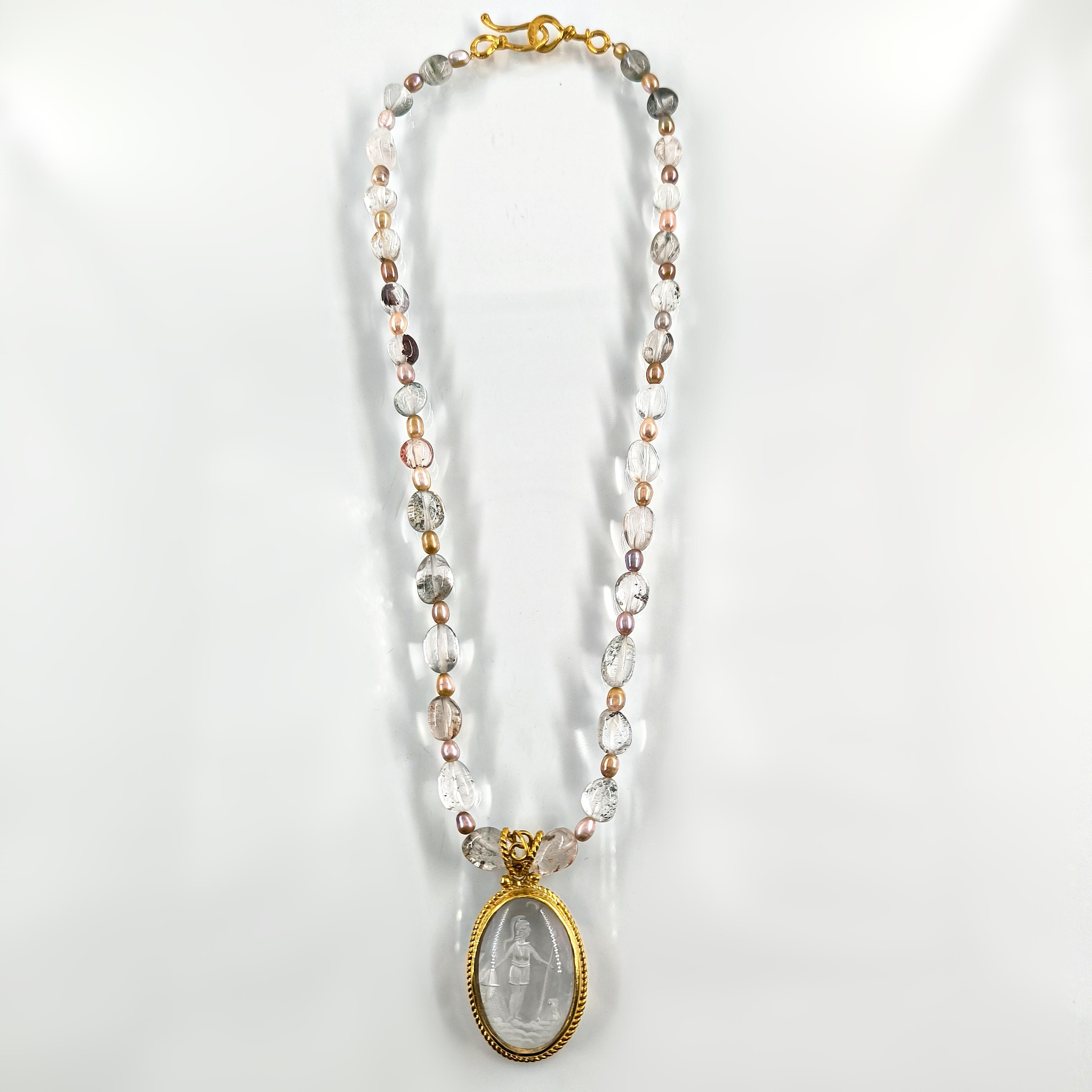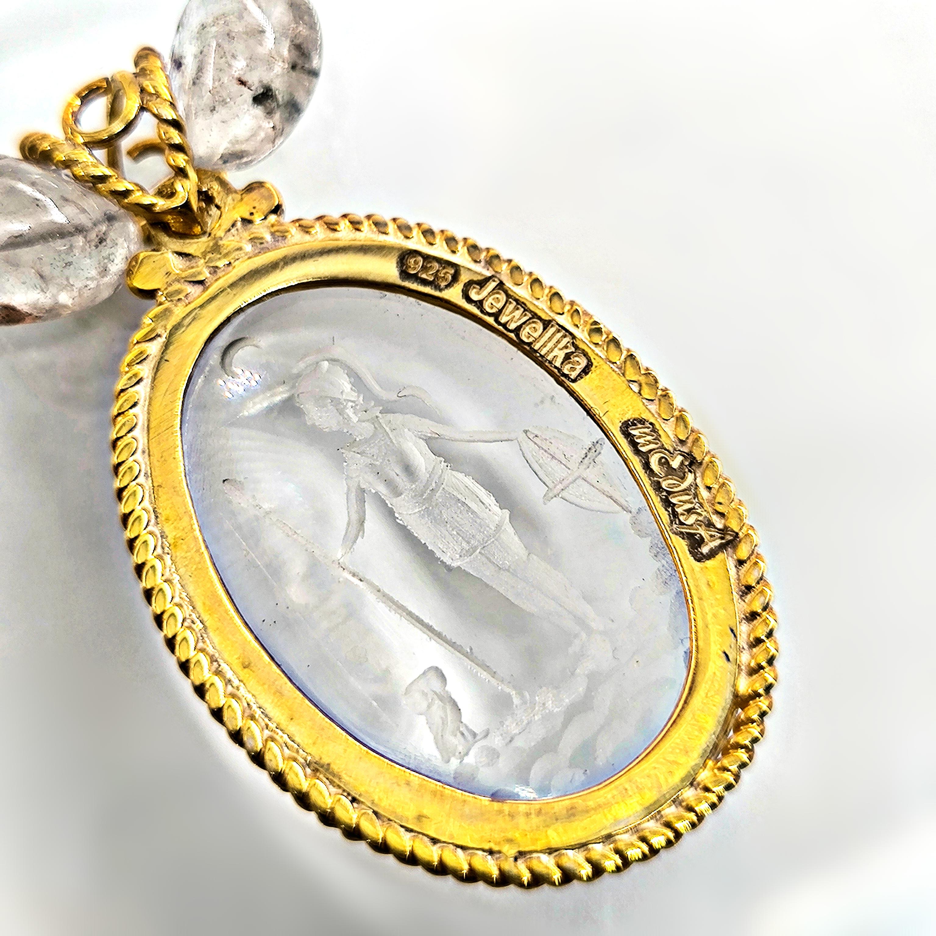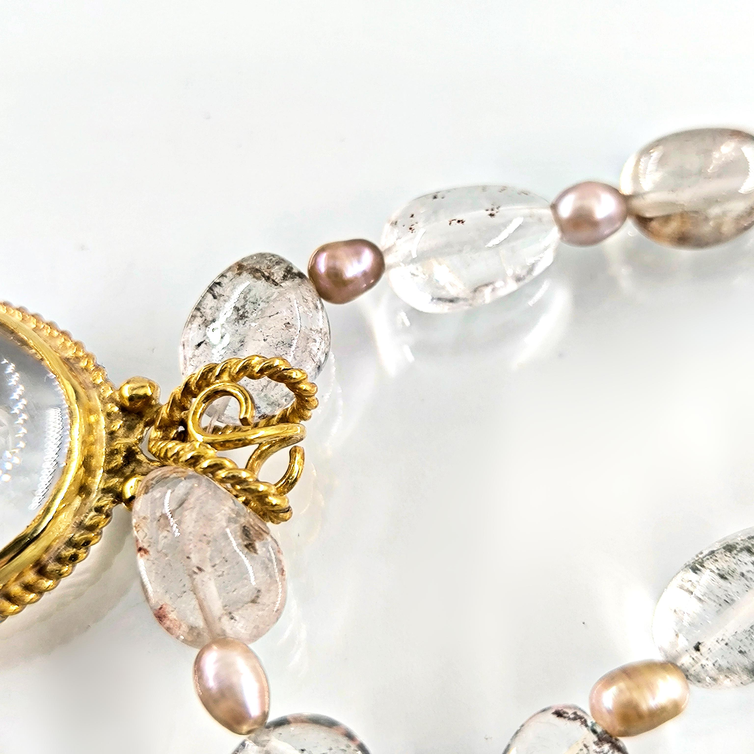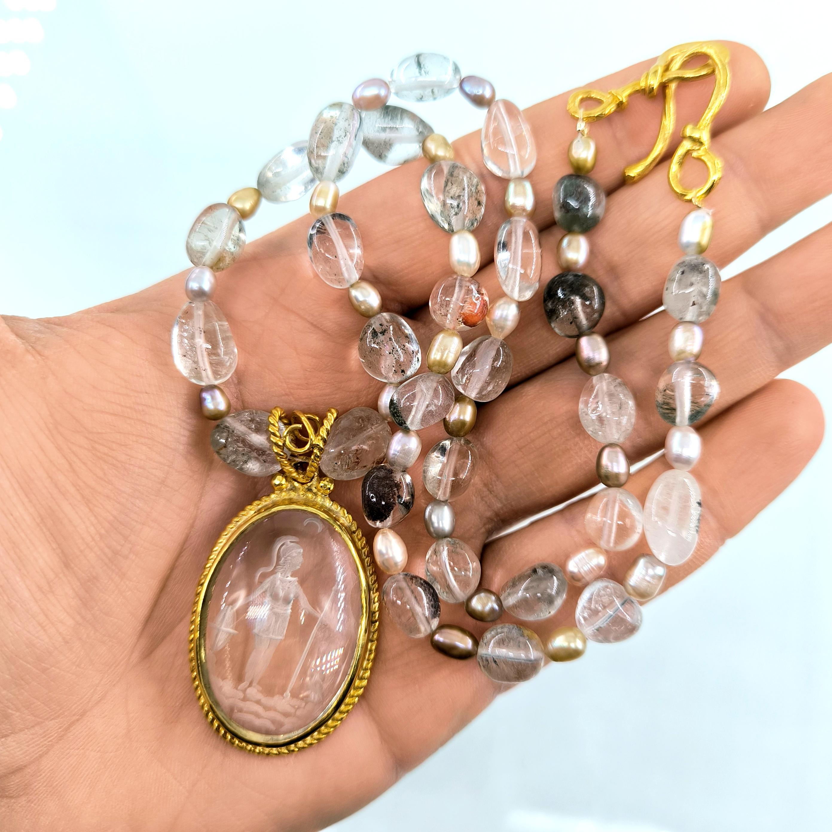 Bu tasarımda antik dünyanın zarafetini ve doğal taşların büyüsünü bir araya getirdim. Zincir bölümünde yer alan amorf kesim garden kuvars taşlar, içlerindeki doğal izlerle her taneyi benzersiz kılarken aralarındaki natürel inciler kolyeye zarif bir ışıltı katıyor. Kolye ucu tamamen 925 ayar gümüşten hazırlanmış ve 22 ayar altın kaplama ile zengin bir karakter kazanmıştır. Merkezdeki krsital kabeşon cam taş üzerine negatif intaglio tekniği ile işlediğim Athena figürü, bilgeliğin ve koruyucu gücün kadim sembolünü taşır. Antik mücevher estetiğinden ilham alan bu parça, boyunda hem zarif hem de güçlü bir sanat eseri gibi duran özel bir Medusa tasarımıdır.