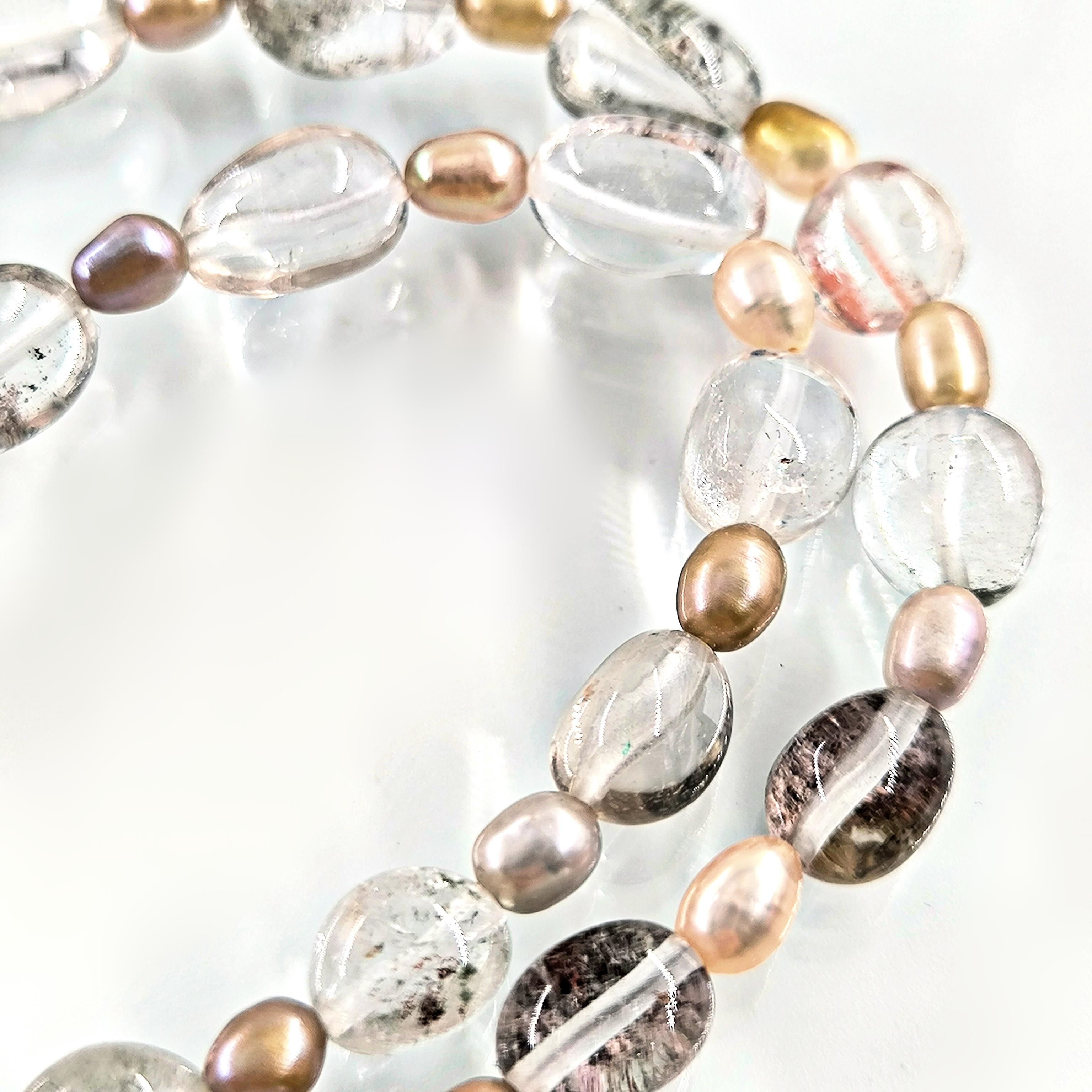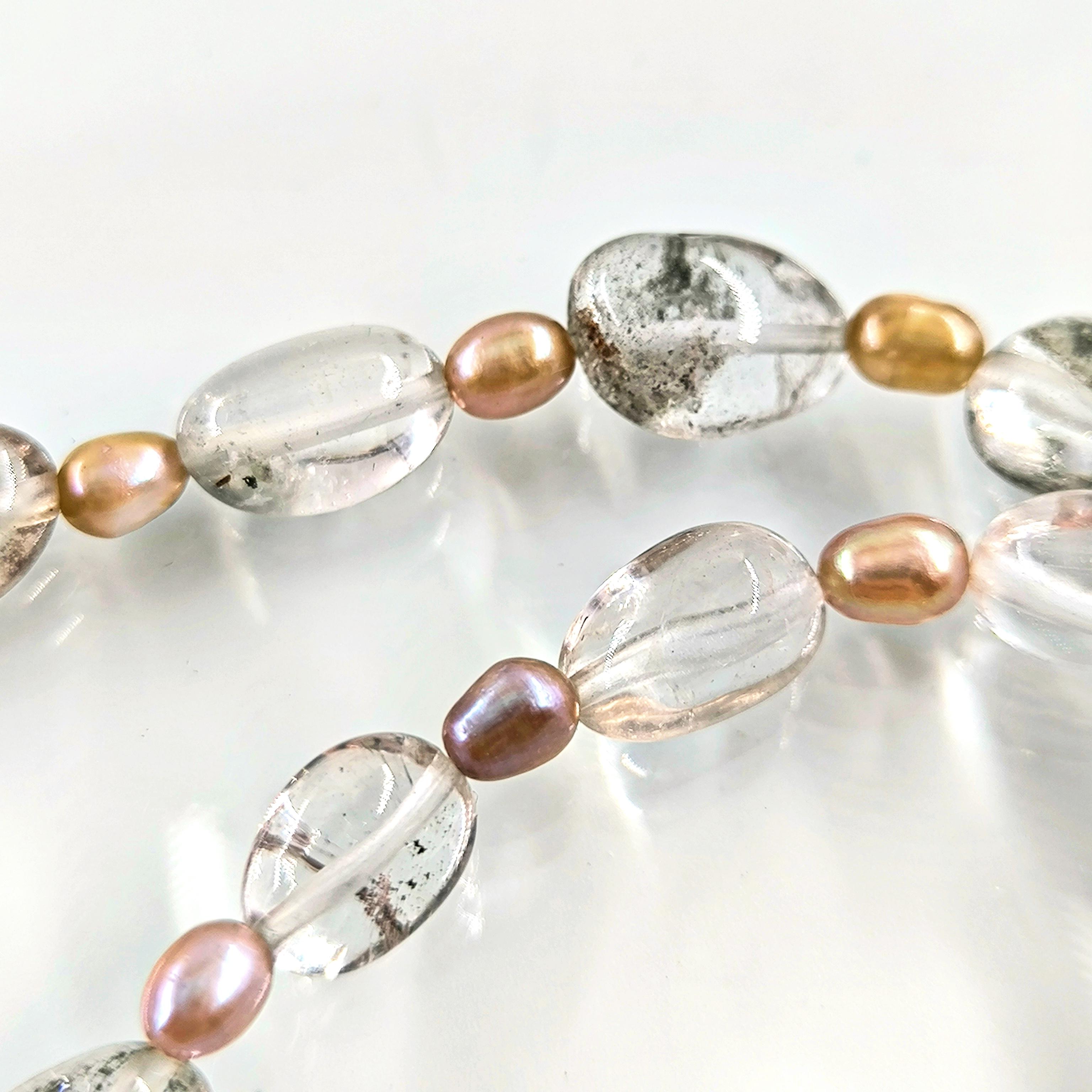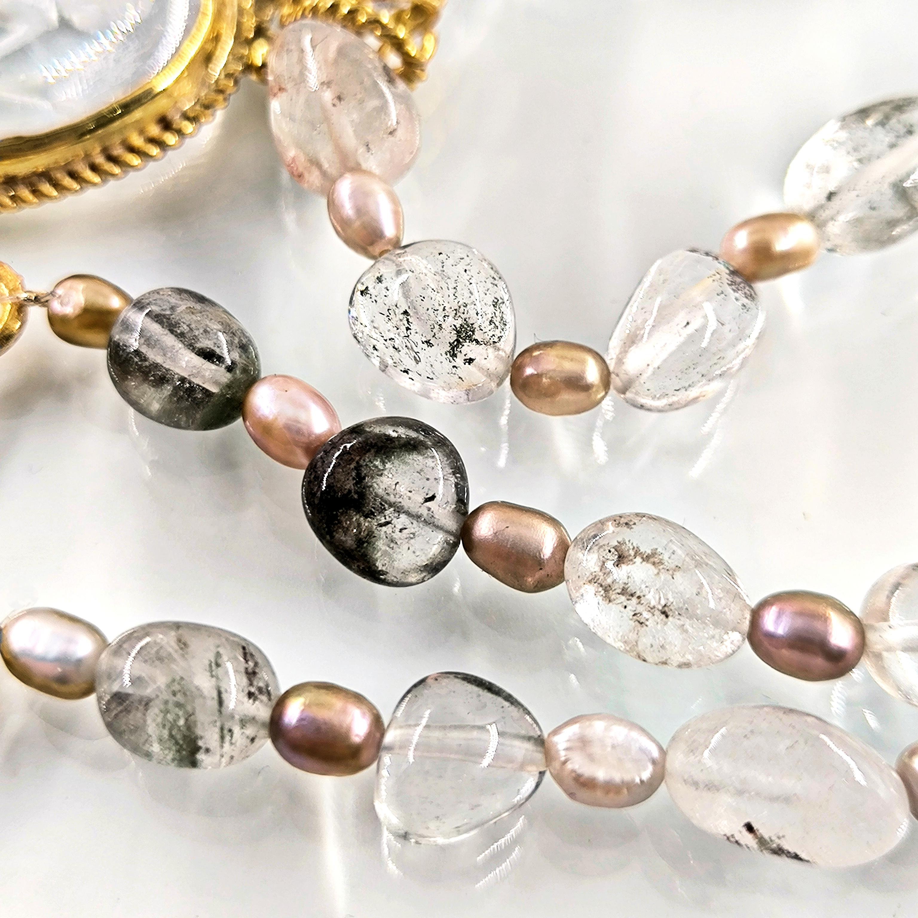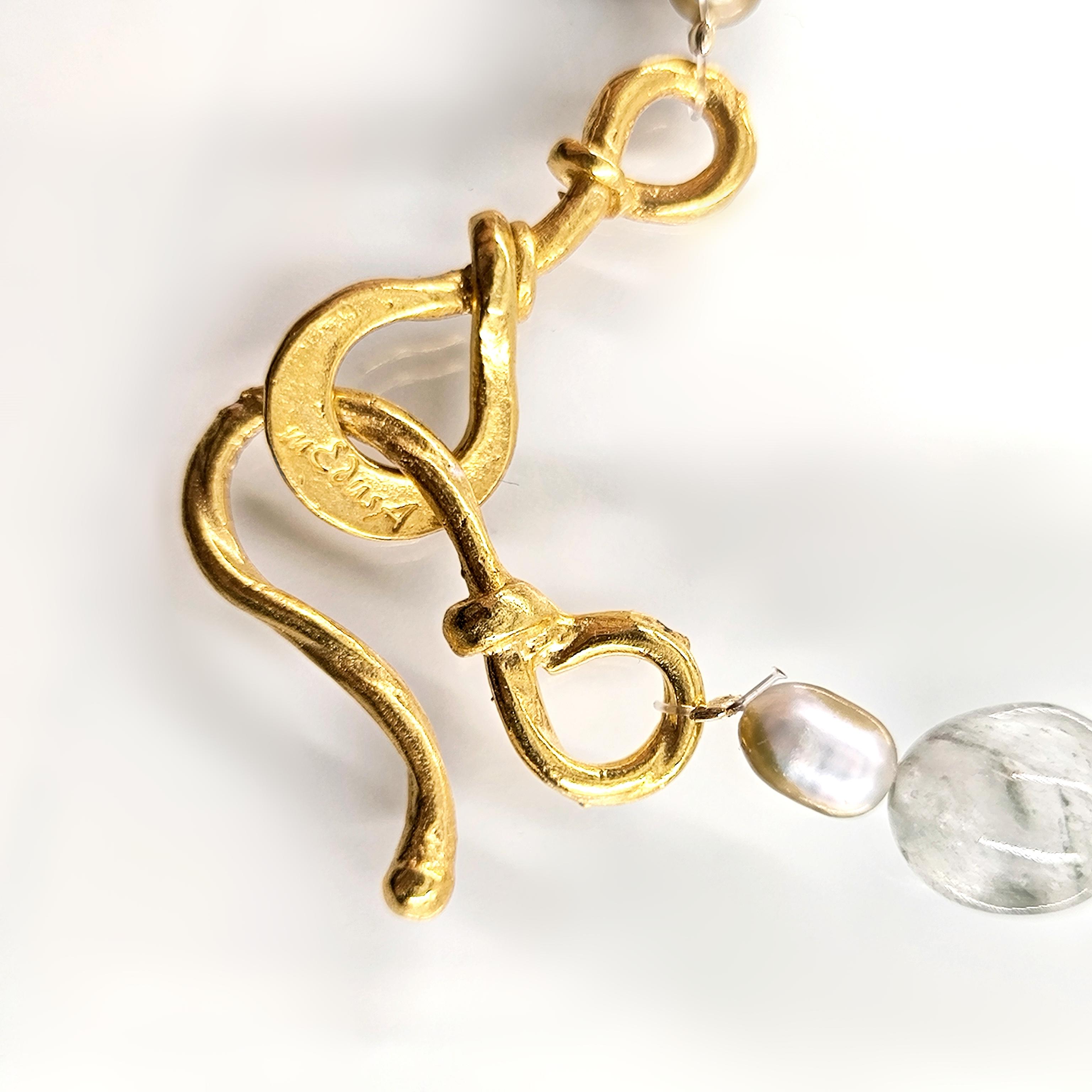 Bu tasarımda antik dünyanın zarafetini ve doğal taşların büyüsünü bir araya getirdim. Zincir bölümünde yer alan amorf kesim garden kuvars taşlar, içlerindeki doğal izlerle her taneyi benzersiz kılarken aralarındaki natürel inciler kolyeye zarif bir ışıltı katıyor. Kolye ucu tamamen 925 ayar gümüşten hazırlanmış ve 22 ayar altın kaplama ile zengin bir karakter kazanmıştır. Merkezdeki krsital kabeşon cam taş üzerine negatif intaglio tekniği ile işlediğim Athena figürü, bilgeliğin ve koruyucu gücün kadim sembolünü taşır. Antik mücevher estetiğinden ilham alan bu parça, boyunda hem zarif hem de güçlü bir sanat eseri gibi duran özel bir Medusa tasarımıdır.