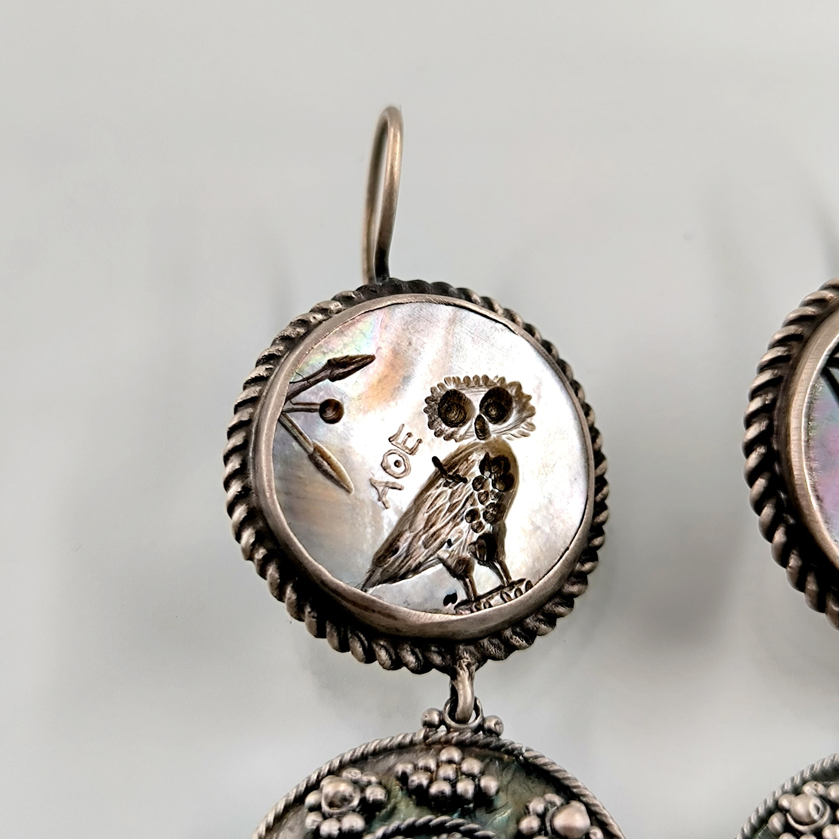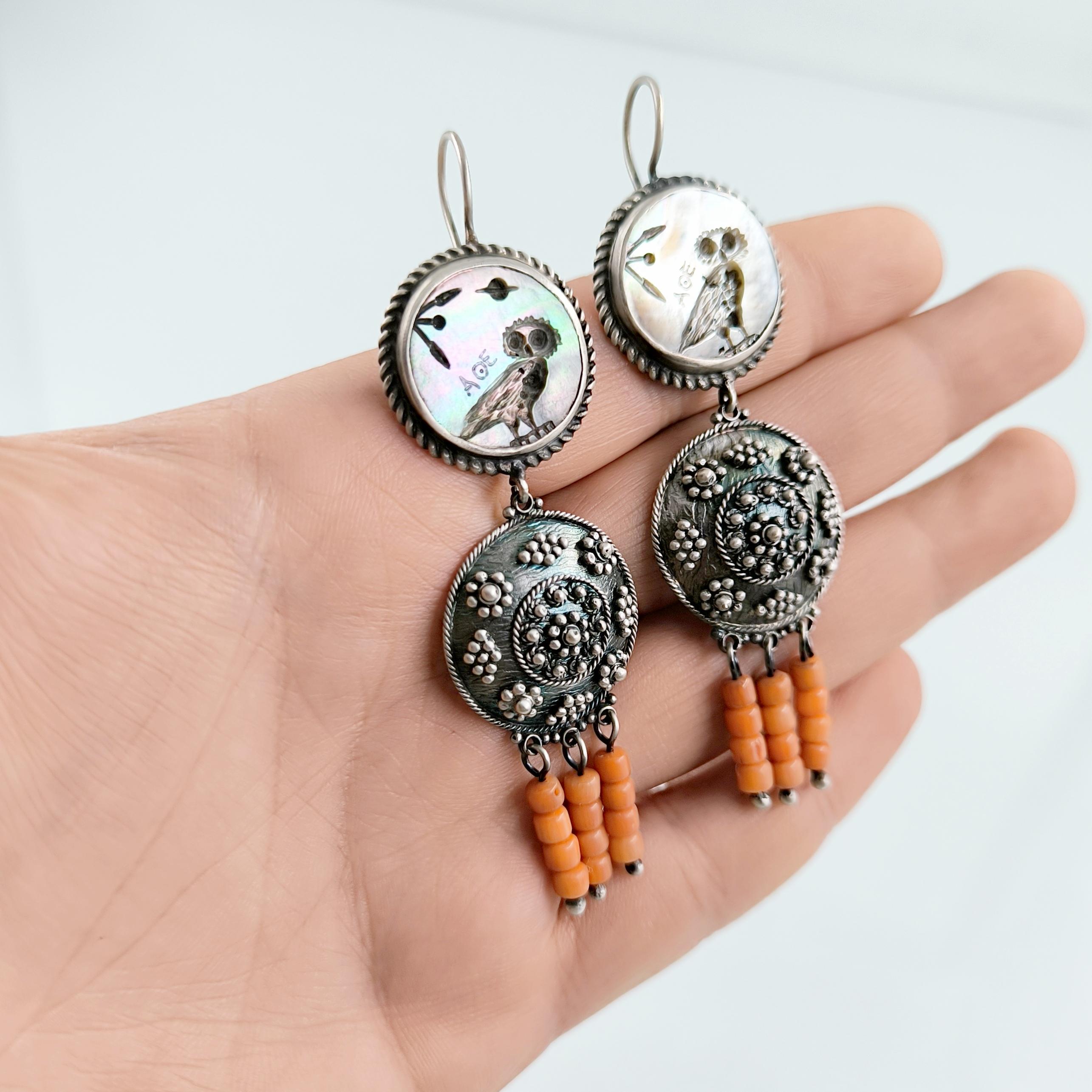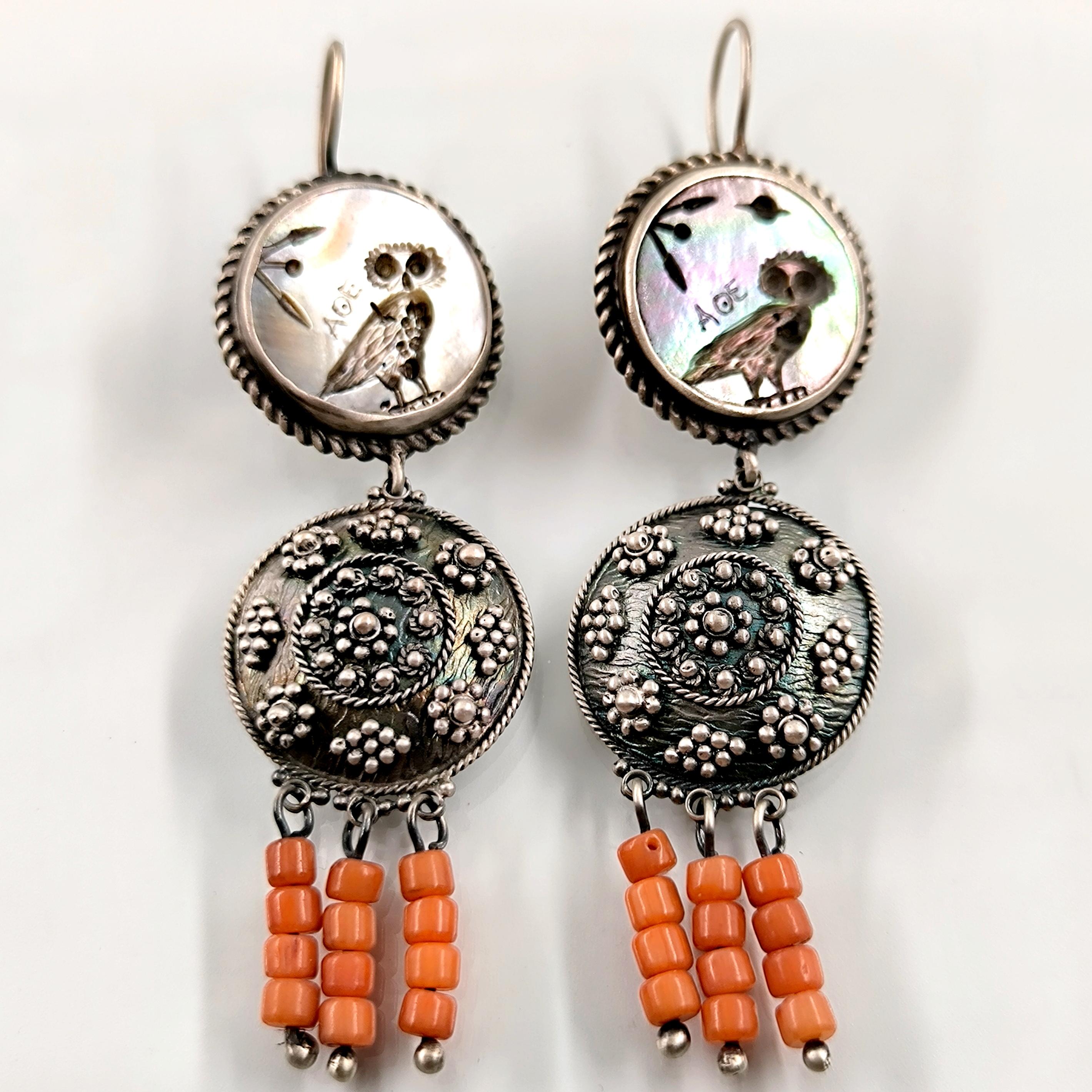 Dünyaca ünlü antik Grek sikkesi üzerindeki Athana'yı temsil eden ''baykuş'' simgesini sedef üzerine intaglio çalıştığımız tamamen gümüş, Tunus mercanları ile süslediğimiz telkari işçilikli gümüş küpelerimiz!