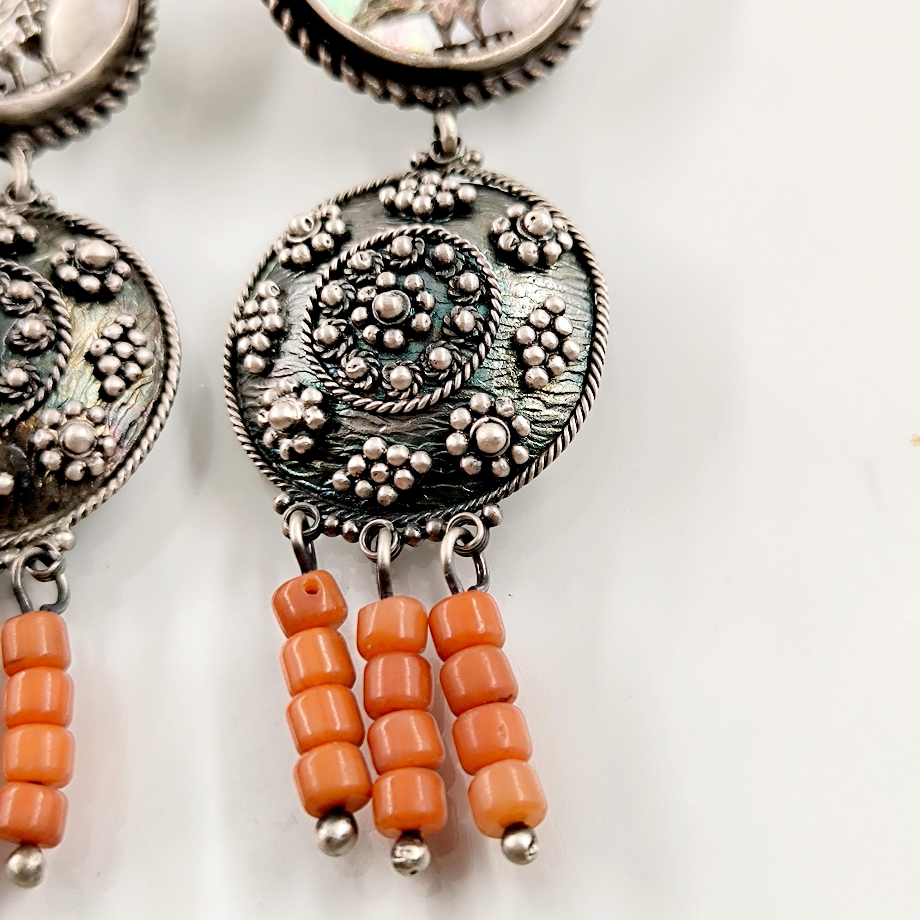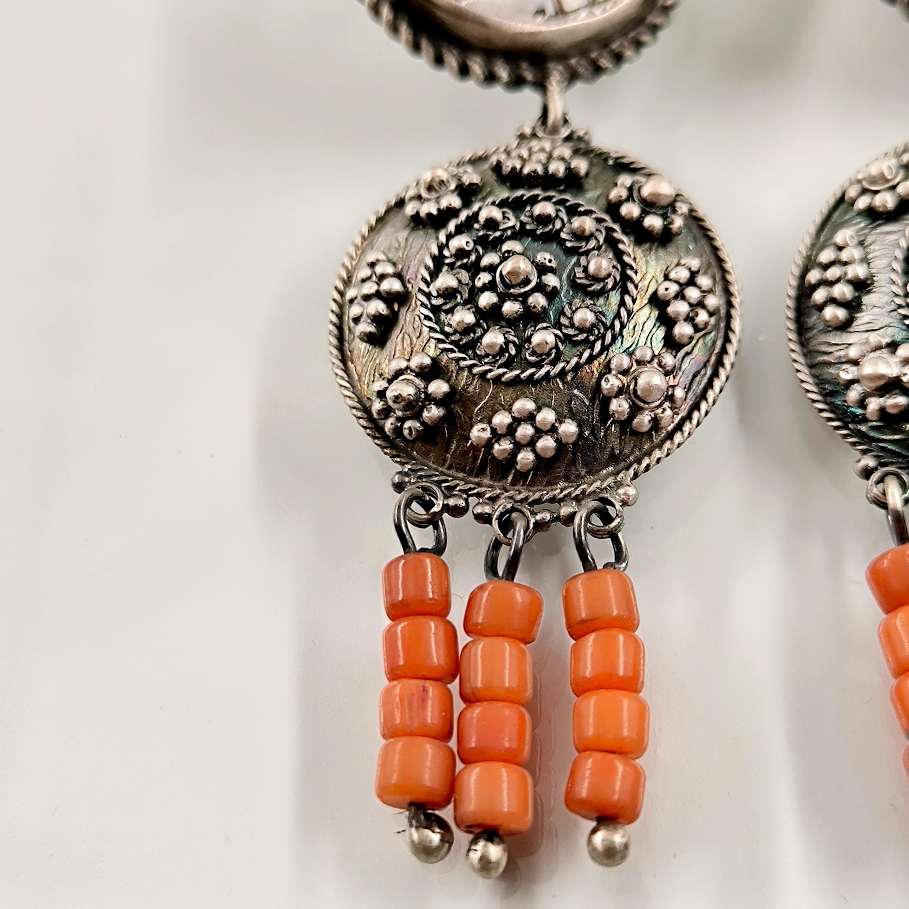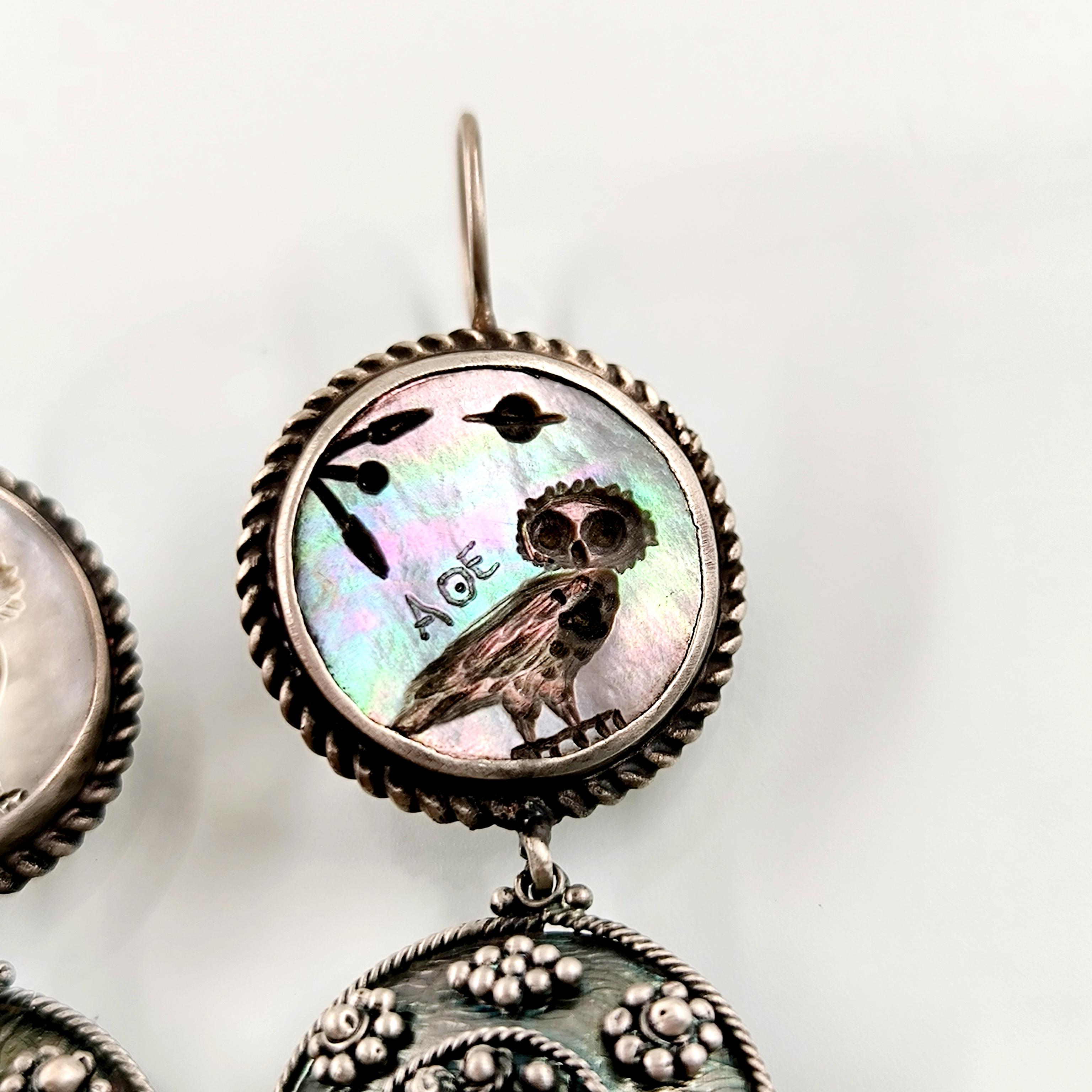 Dünyaca ünlü antik Grek sikkesi üzerindeki Athana'yı temsil eden ''baykuş'' simgesini sedef üzerine intaglio çalıştığımız tamamen gümüş, Tunus mercanları ile süslediğimiz telkari işçilikli gümüş küpelerimiz!