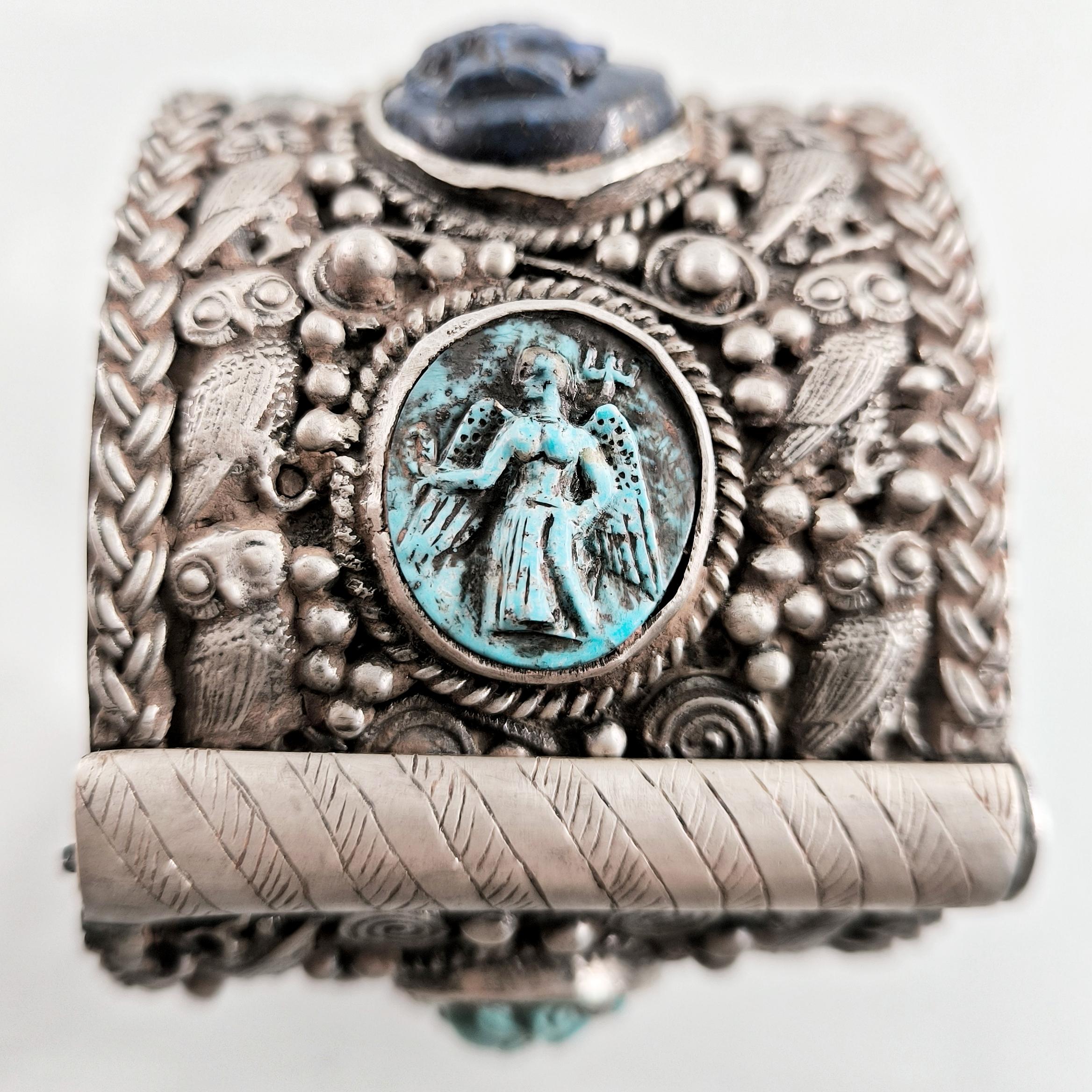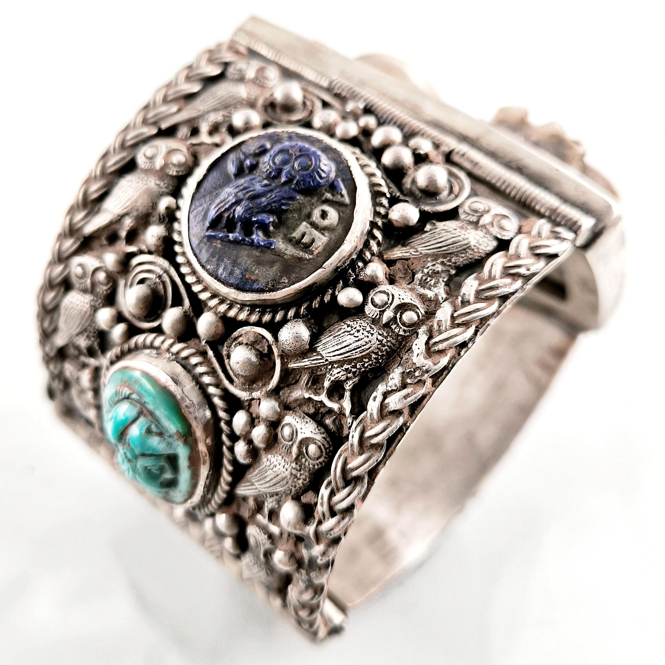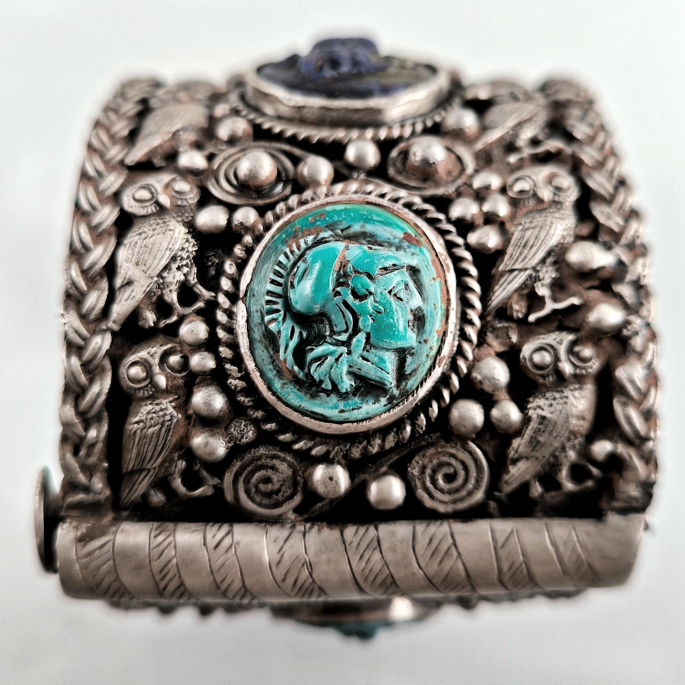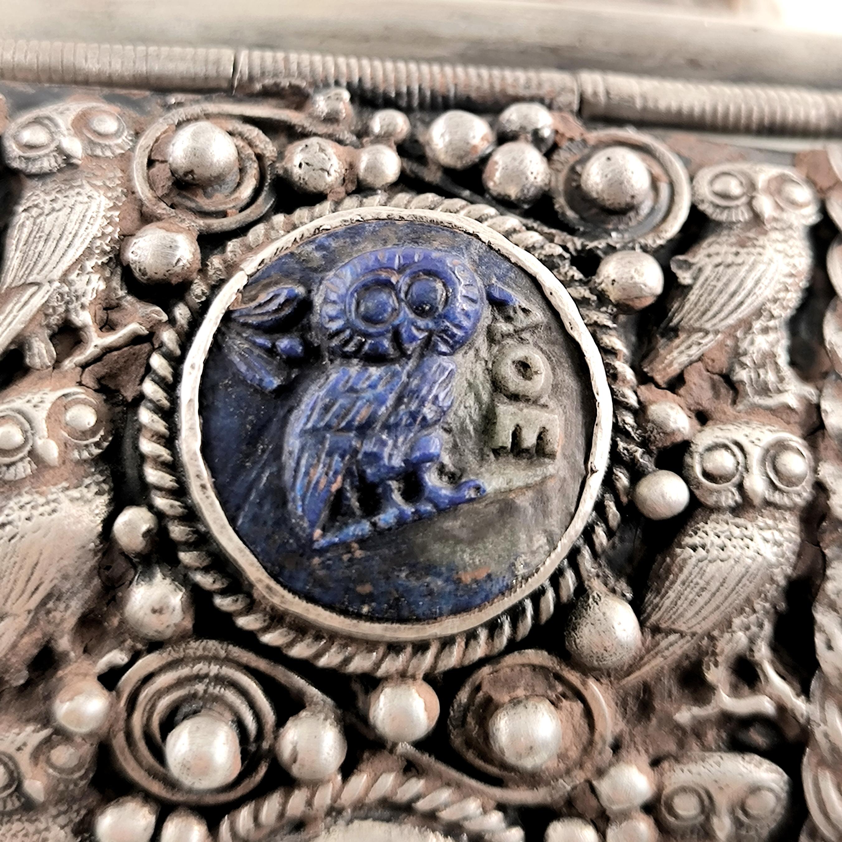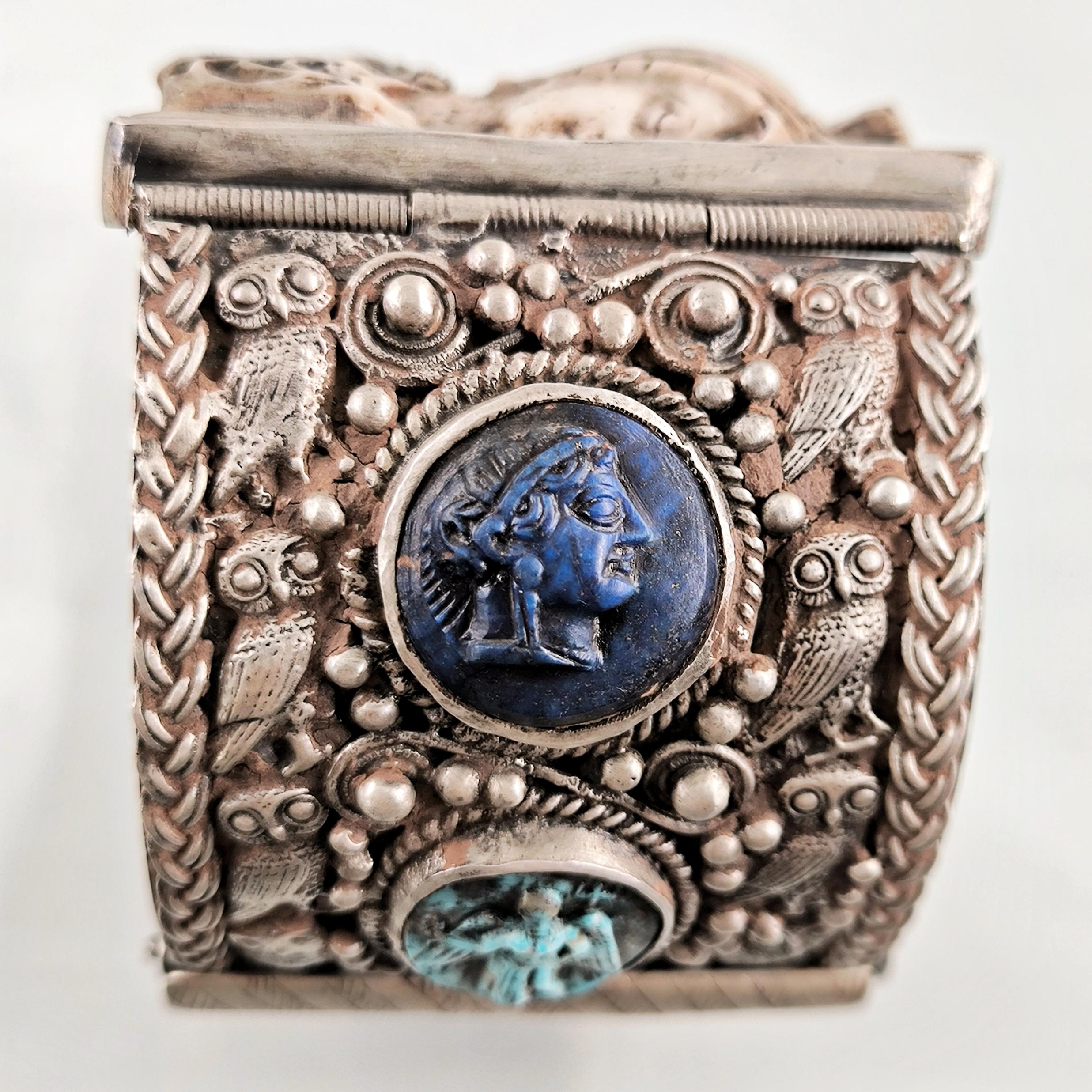 Bu eşsiz güzellik, modern çağda yeniden doğan bir antik zırh gibi!.. Tamamı 320 gram 925 Ayar gümüşten el işçiliğiyle şekillendirildi. Merkezinde beyaz mermer üzerine oyulmuş Athena kabartması yer alıyor; bilgelik, cesaret ve stratejinin simgesi. Yan yüzeylerde ise lapis ve firuze taşlar üzerine işlenen Athena sikkelerinin ön ve arka yüz rölyefleri, antik dünyanın ruhunu taşın kalbinde yeniden canlandırıyor. Tüm çerçeve telkari detaylarla zenginleştirilmiş, gümüş baykuş rölyefleriyle çevrelenmiş. Her figür, her kabartma, bir medeniyetin sanat anlayışını bugüne taşıyor. Aylar süren emekle tamamlanan bu eser, yalnızca bir bileklik değil; bilgelik, kudret ve ustalığın birleşiminden doğmuş bir başyapıt...