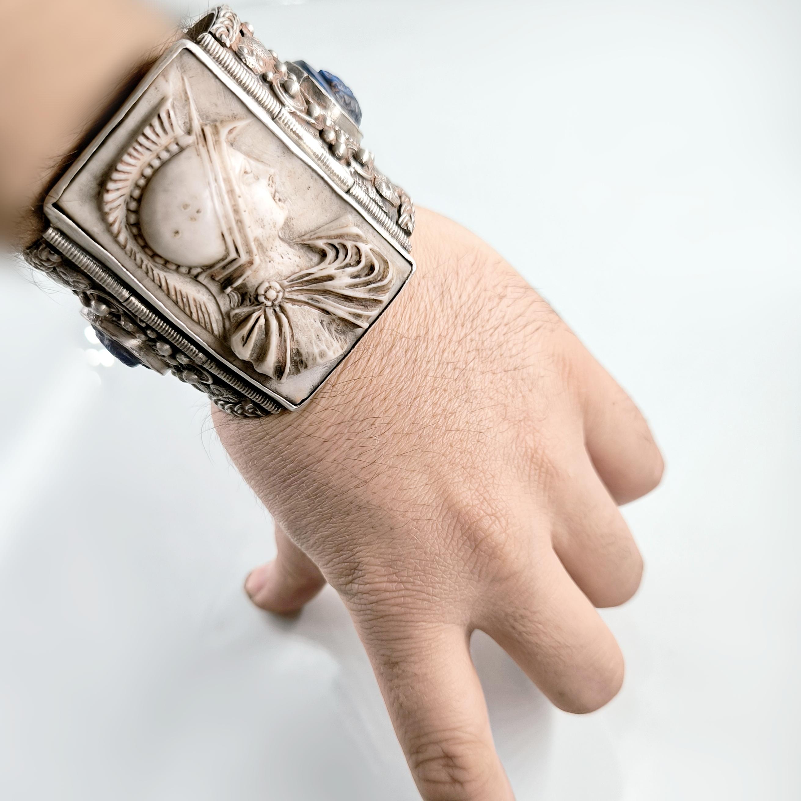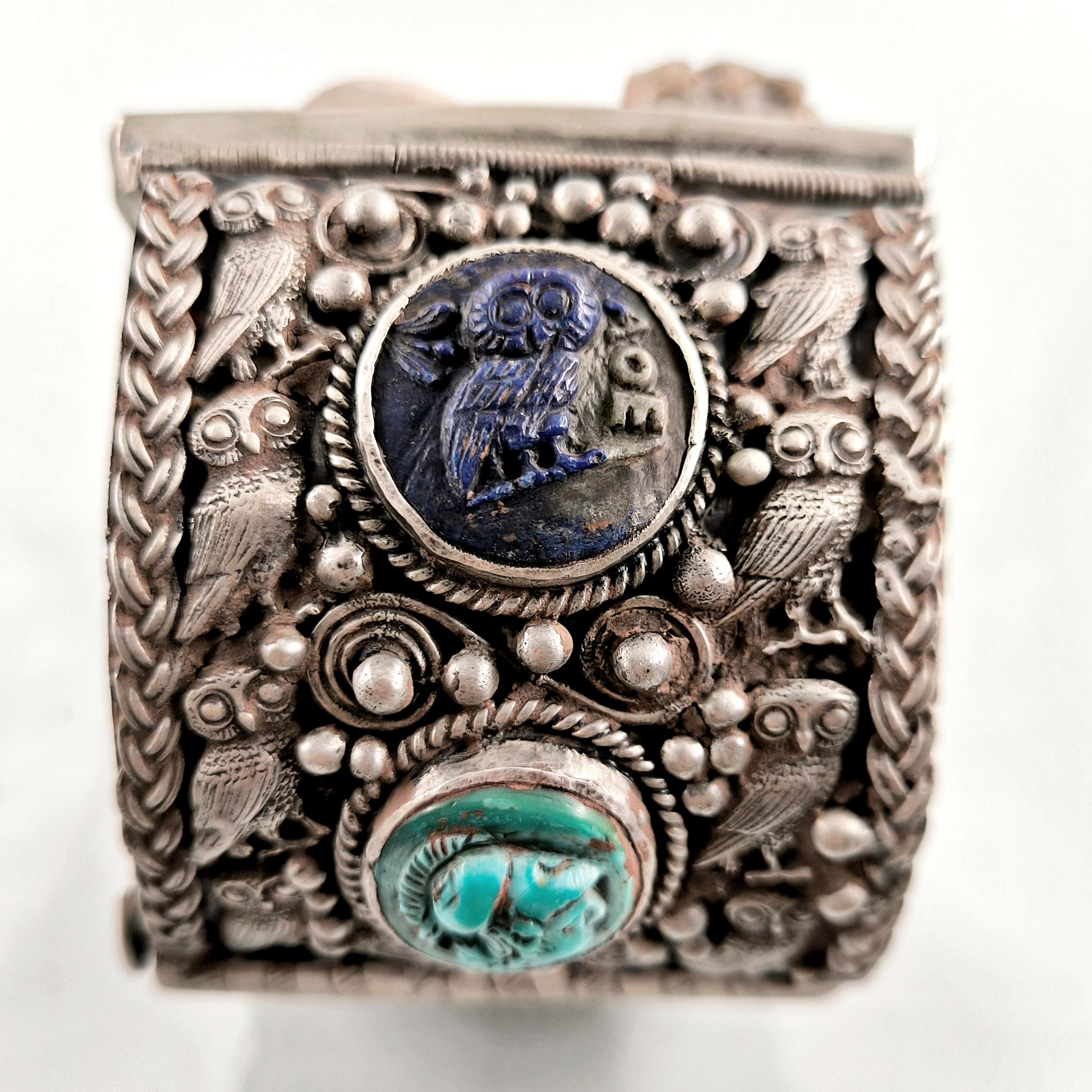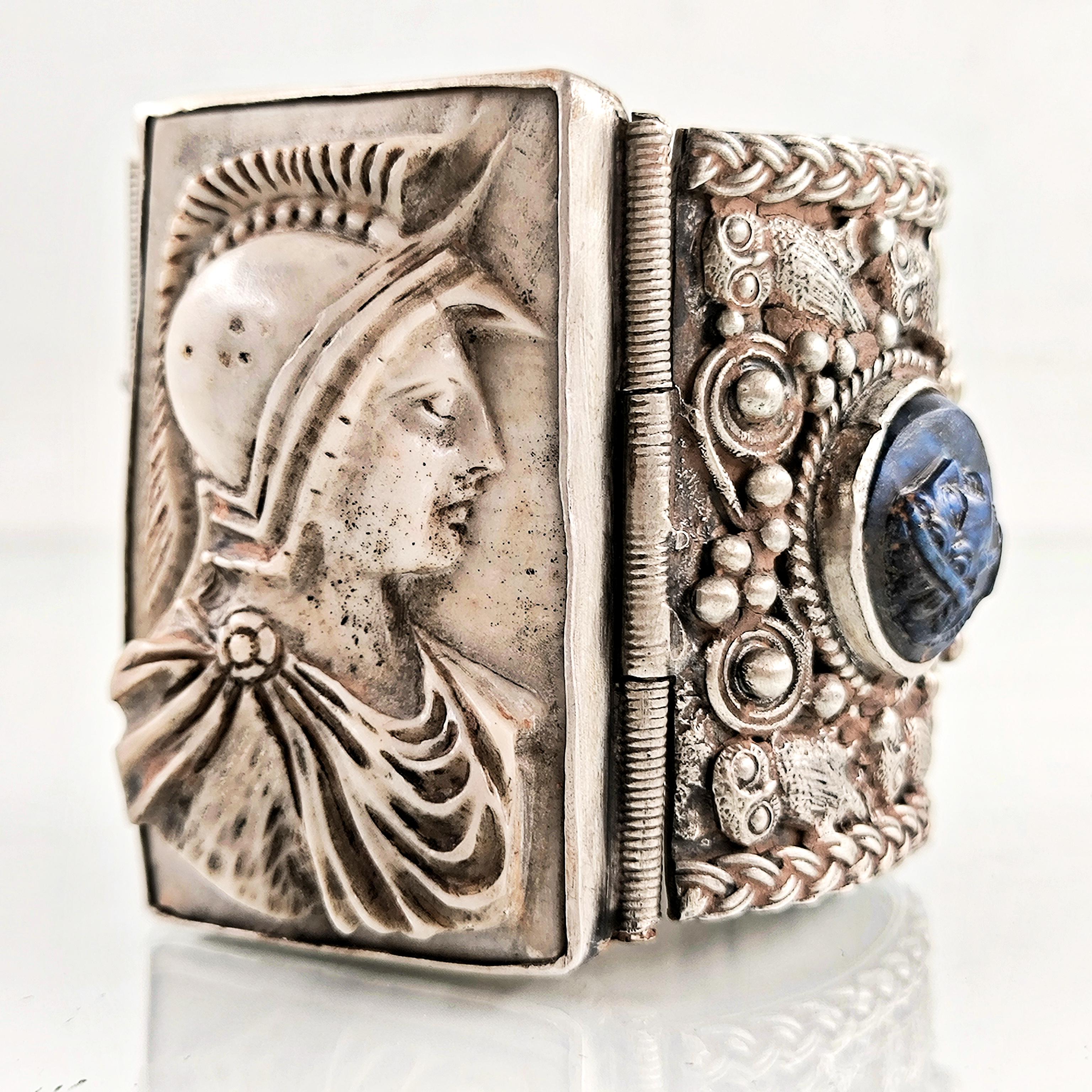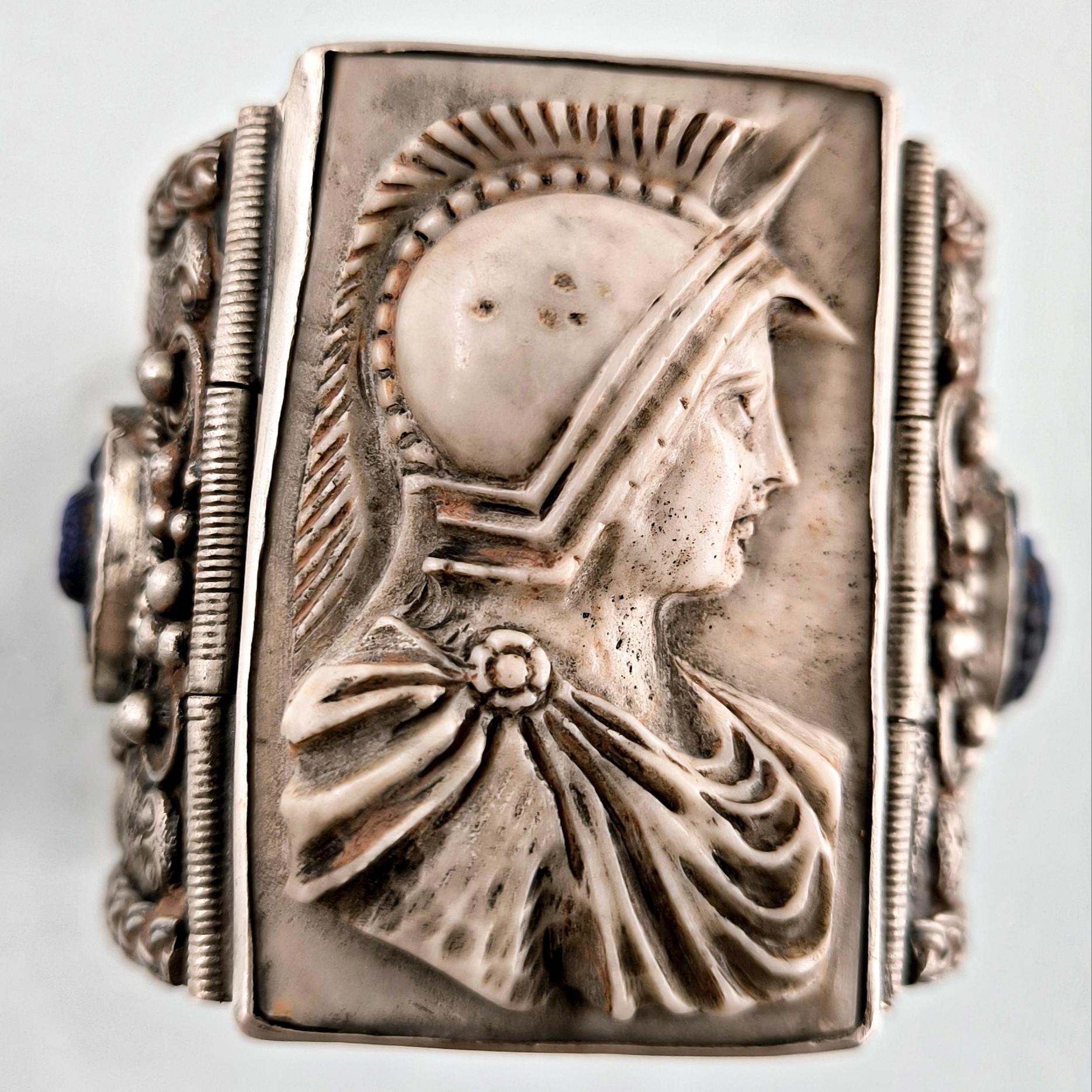 Bu eşsiz güzellik, modern çağda yeniden doğan bir antik zırh gibi!.. Tamamı 320 gram 925 Ayar gümüşten el işçiliğiyle şekillendirildi. Merkezinde beyaz mermer üzerine oyulmuş Athena kabartması yer alıyor; bilgelik, cesaret ve stratejinin simgesi. Yan yüzeylerde ise lapis ve firuze taşlar üzerine işlenen Athena sikkelerinin ön ve arka yüz rölyefleri, antik dünyanın ruhunu taşın kalbinde yeniden canlandırıyor. Tüm çerçeve telkari detaylarla zenginleştirilmiş, gümüş baykuş rölyefleriyle çevrelenmiş. Her figür, her kabartma, bir medeniyetin sanat anlayışını bugüne taşıyor. Aylar süren emekle tamamlanan bu eser, yalnızca bir bileklik değil; bilgelik, kudret ve ustalığın birleşiminden doğmuş bir başyapıt...