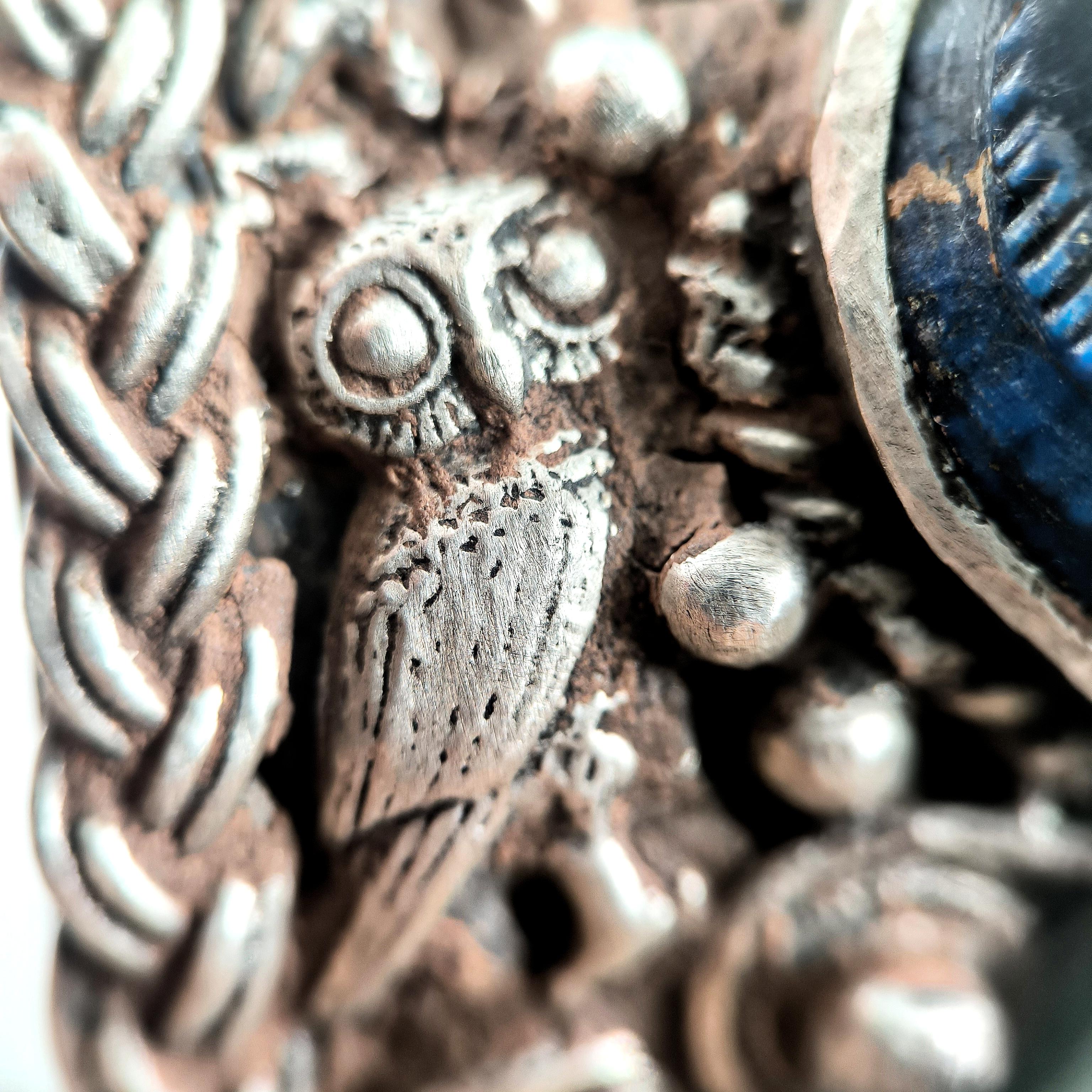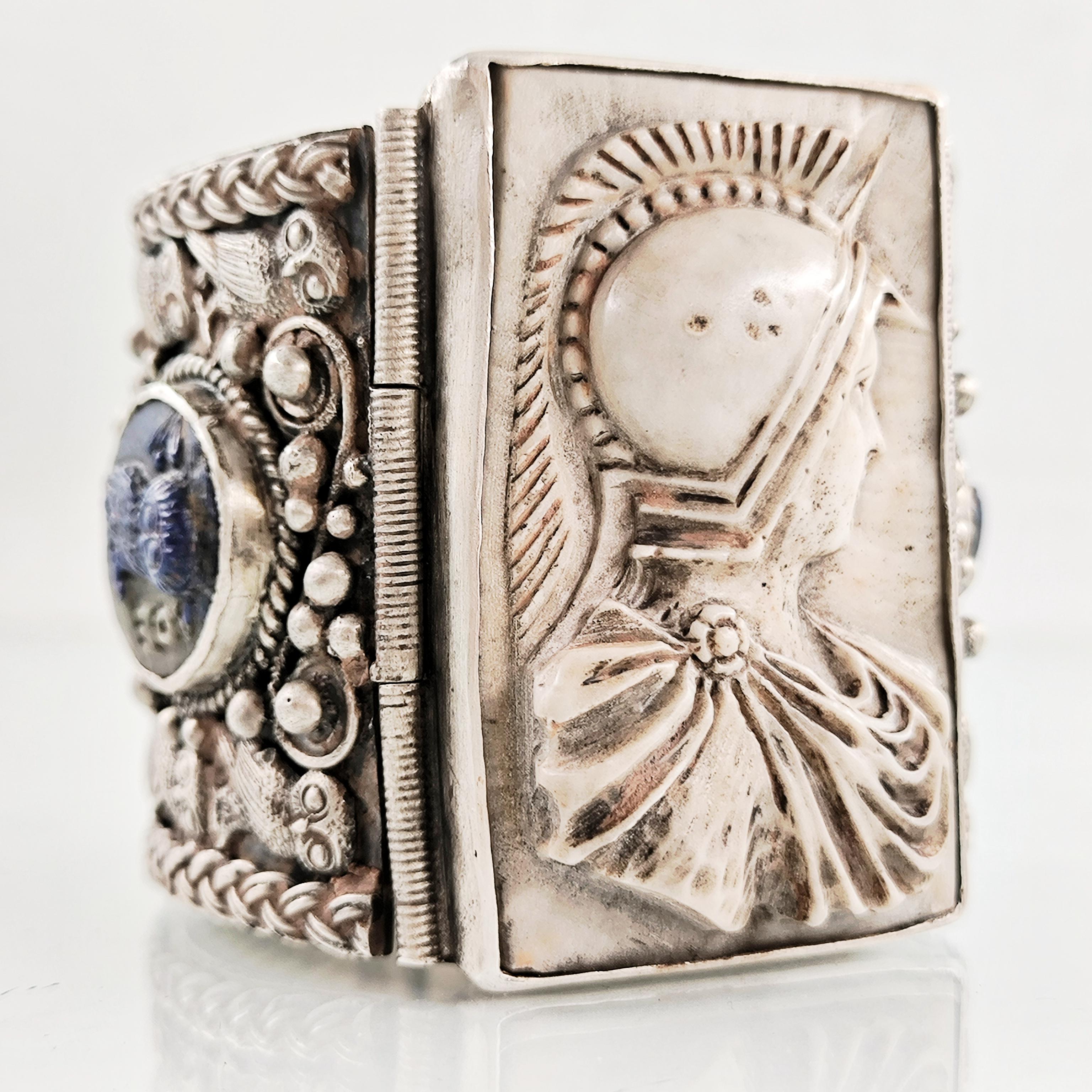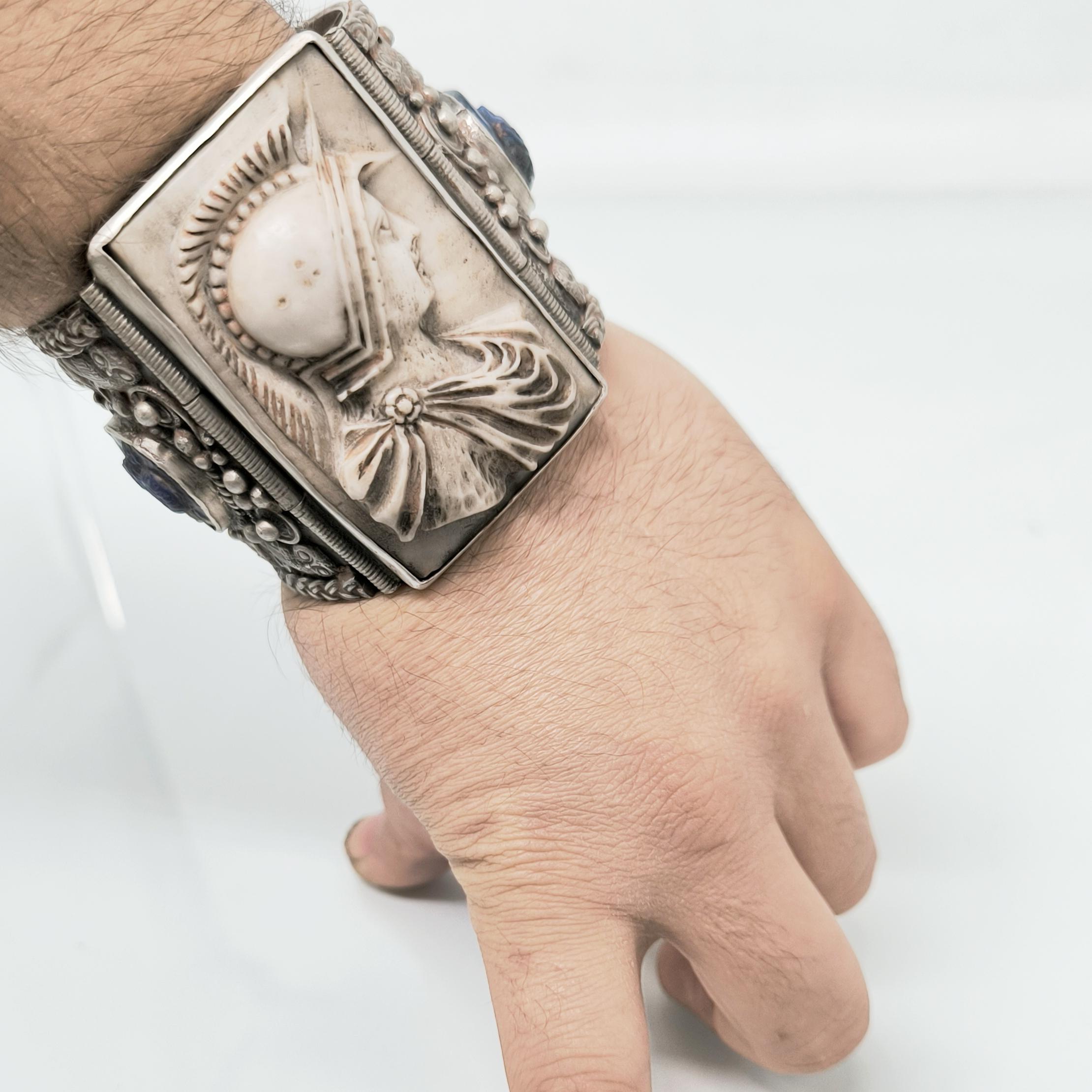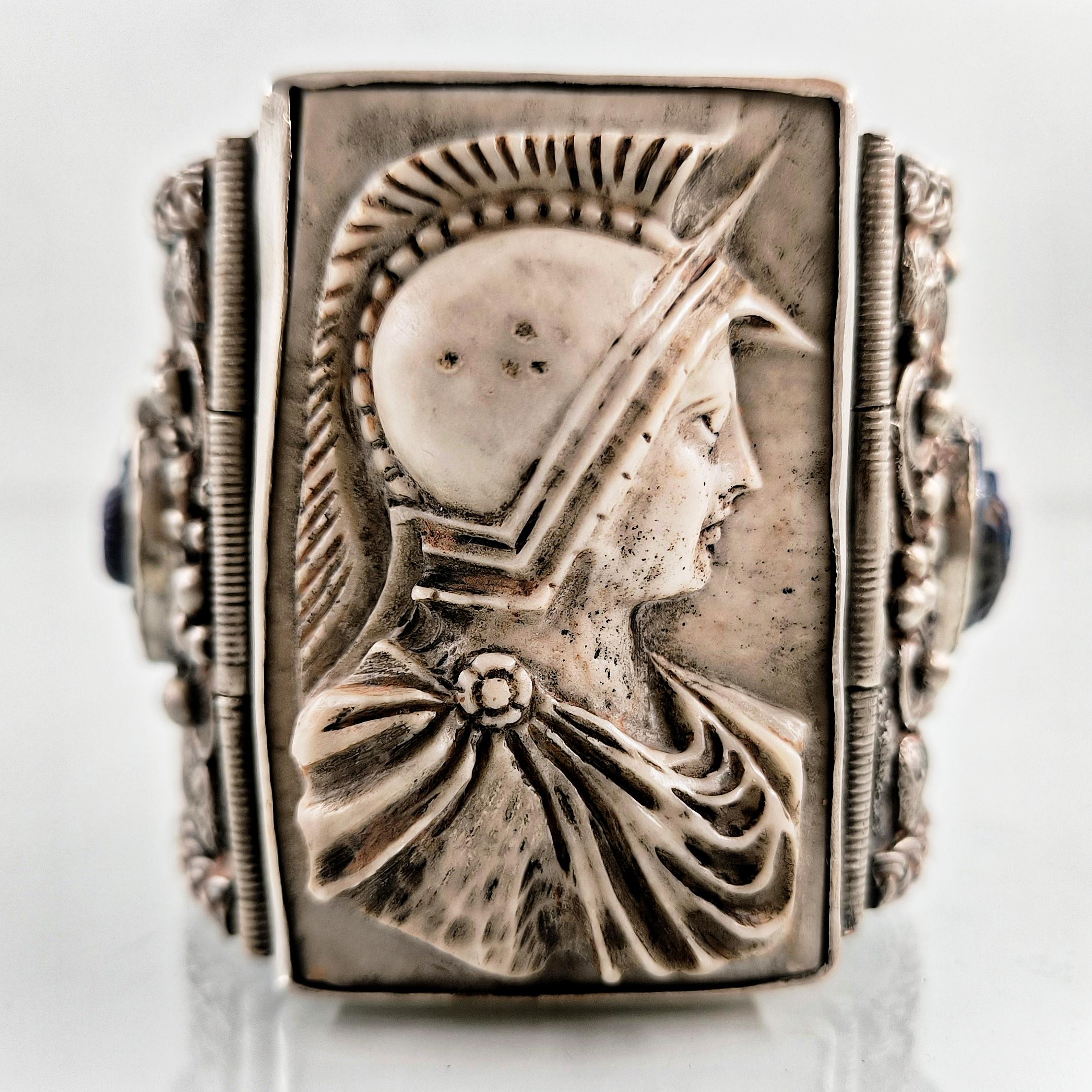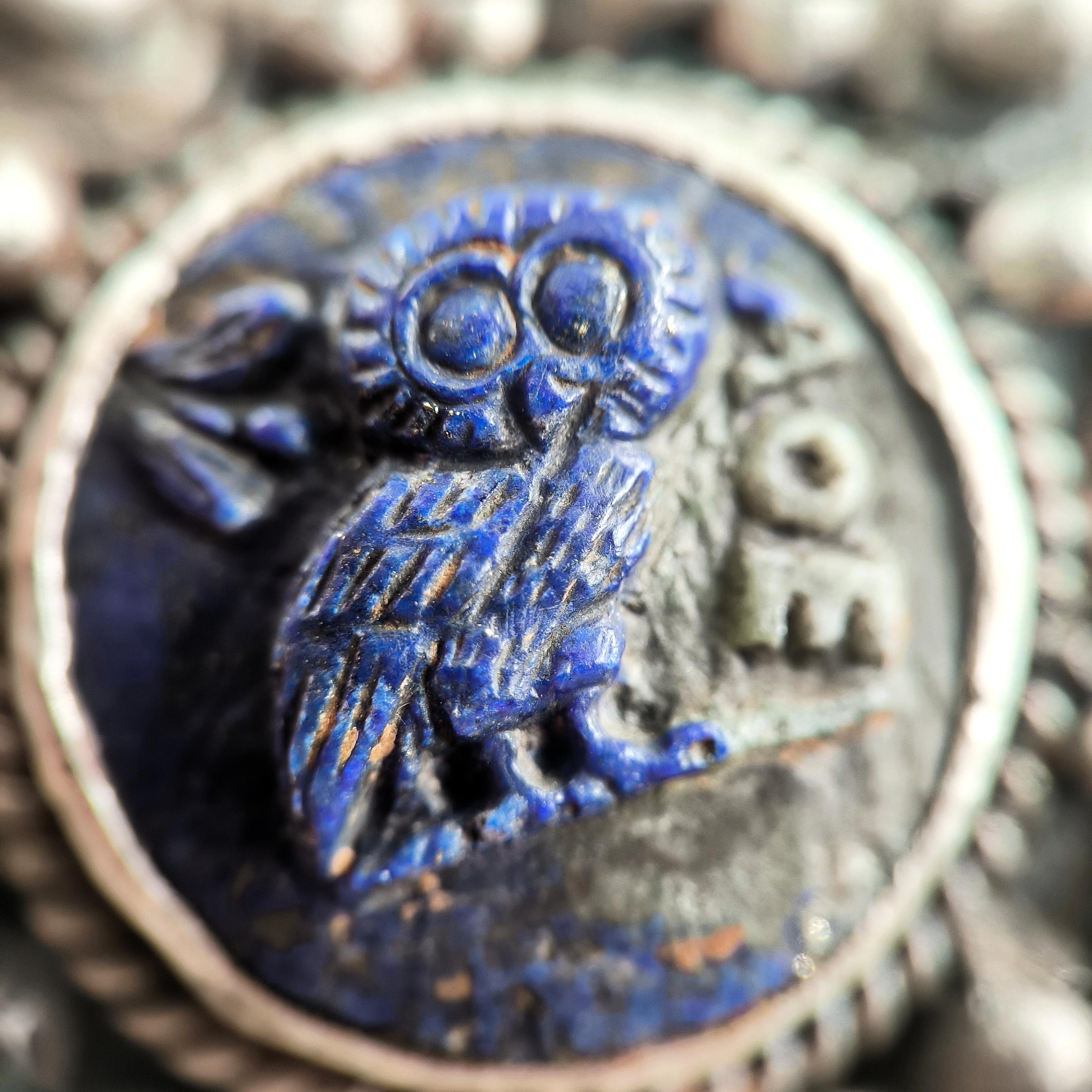 Bu eşsiz güzellik, modern çağda yeniden doğan bir antik zırh gibi!.. Tamamı 320 gram 925 Ayar gümüşten el işçiliğiyle şekillendirildi. Merkezinde beyaz mermer üzerine oyulmuş Athena kabartması yer alıyor; bilgelik, cesaret ve stratejinin simgesi. Yan yüzeylerde ise lapis ve firuze taşlar üzerine işlenen Athena sikkelerinin ön ve arka yüz rölyefleri, antik dünyanın ruhunu taşın kalbinde yeniden canlandırıyor. Tüm çerçeve telkari detaylarla zenginleştirilmiş, gümüş baykuş rölyefleriyle çevrelenmiş. Her figür, her kabartma, bir medeniyetin sanat anlayışını bugüne taşıyor. Aylar süren emekle tamamlanan bu eser, yalnızca bir bileklik değil; bilgelik, kudret ve ustalığın birleşiminden doğmuş bir başyapıt...