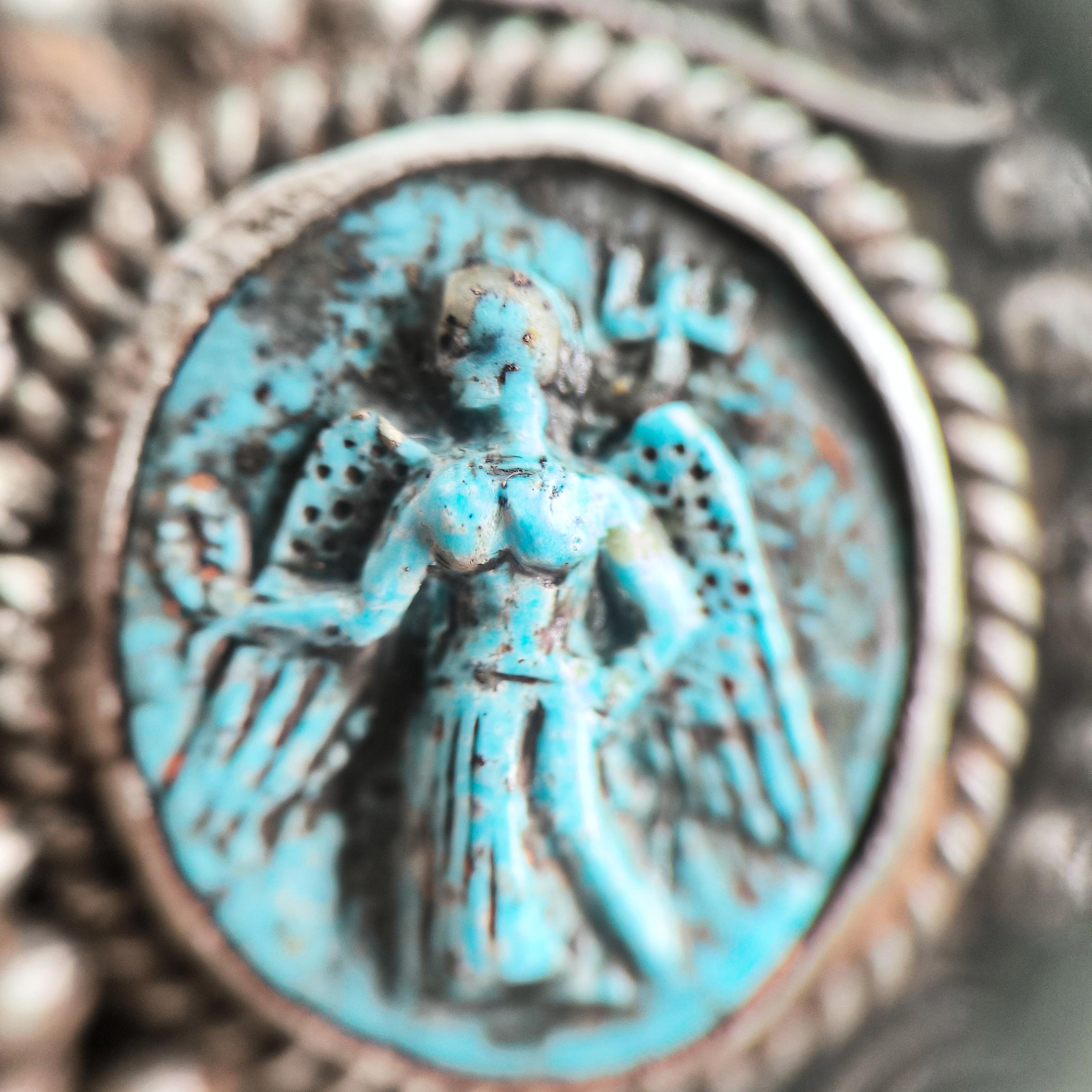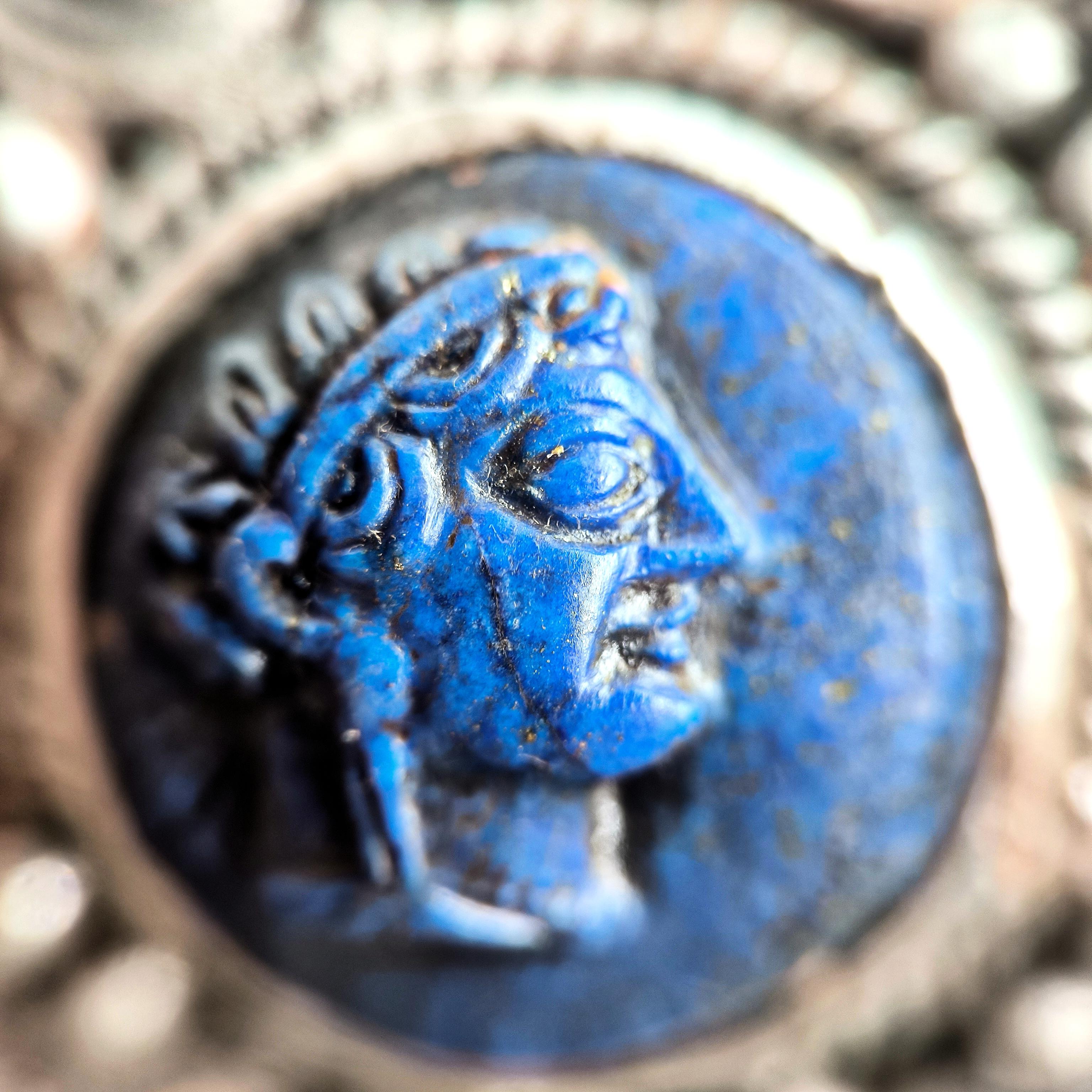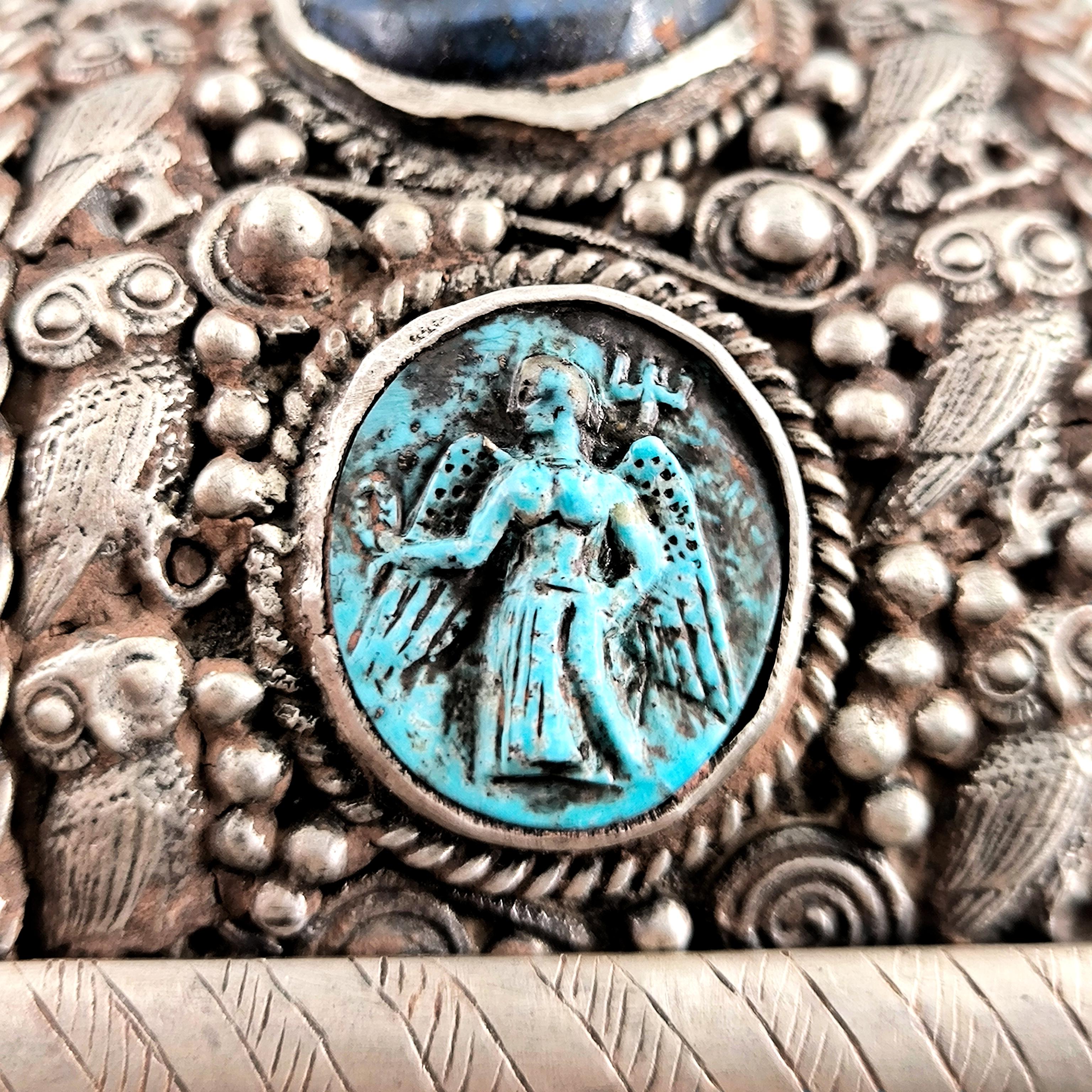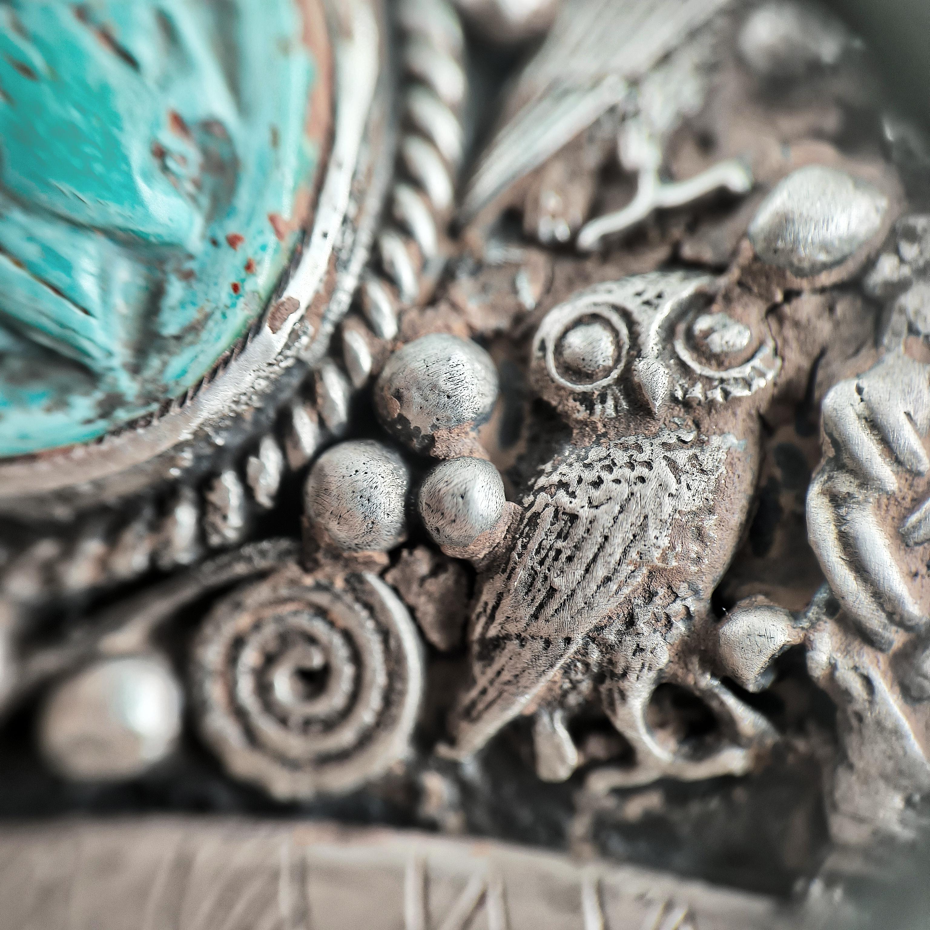 Bu eşsiz güzellik, modern çağda yeniden doğan bir antik zırh gibi!.. Tamamı 320 gram 925 Ayar gümüşten el işçiliğiyle şekillendirildi. Merkezinde beyaz mermer üzerine oyulmuş Athena kabartması yer alıyor; bilgelik, cesaret ve stratejinin simgesi. Yan yüzeylerde ise lapis ve firuze taşlar üzerine işlenen Athena sikkelerinin ön ve arka yüz rölyefleri, antik dünyanın ruhunu taşın kalbinde yeniden canlandırıyor. Tüm çerçeve telkari detaylarla zenginleştirilmiş, gümüş baykuş rölyefleriyle çevrelenmiş. Her figür, her kabartma, bir medeniyetin sanat anlayışını bugüne taşıyor. Aylar süren emekle tamamlanan bu eser, yalnızca bir bileklik değil; bilgelik, kudret ve ustalığın birleşiminden doğmuş bir başyapıt...