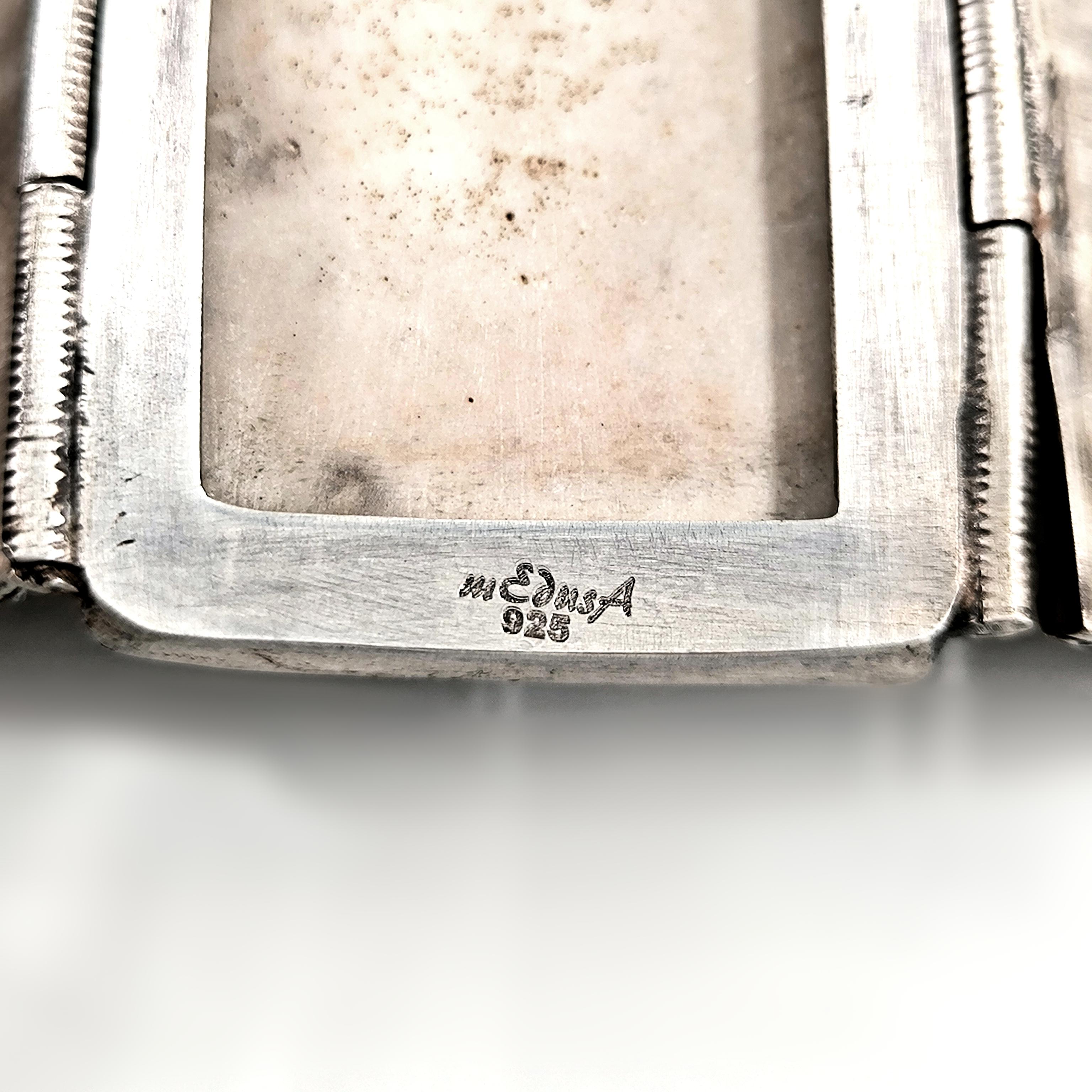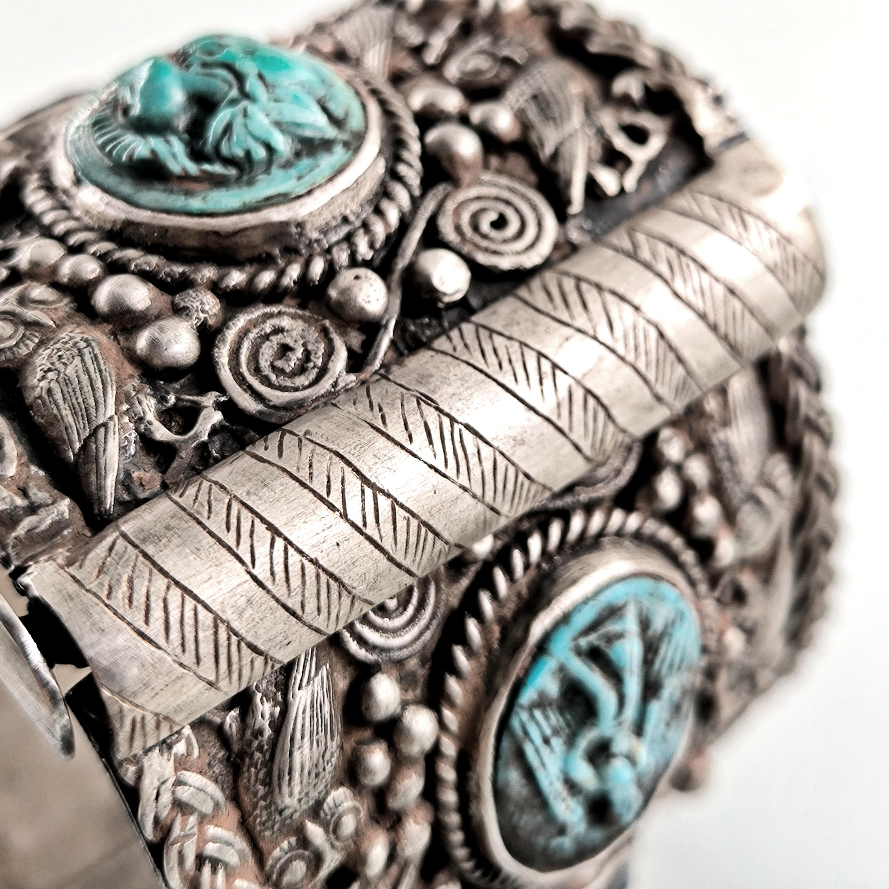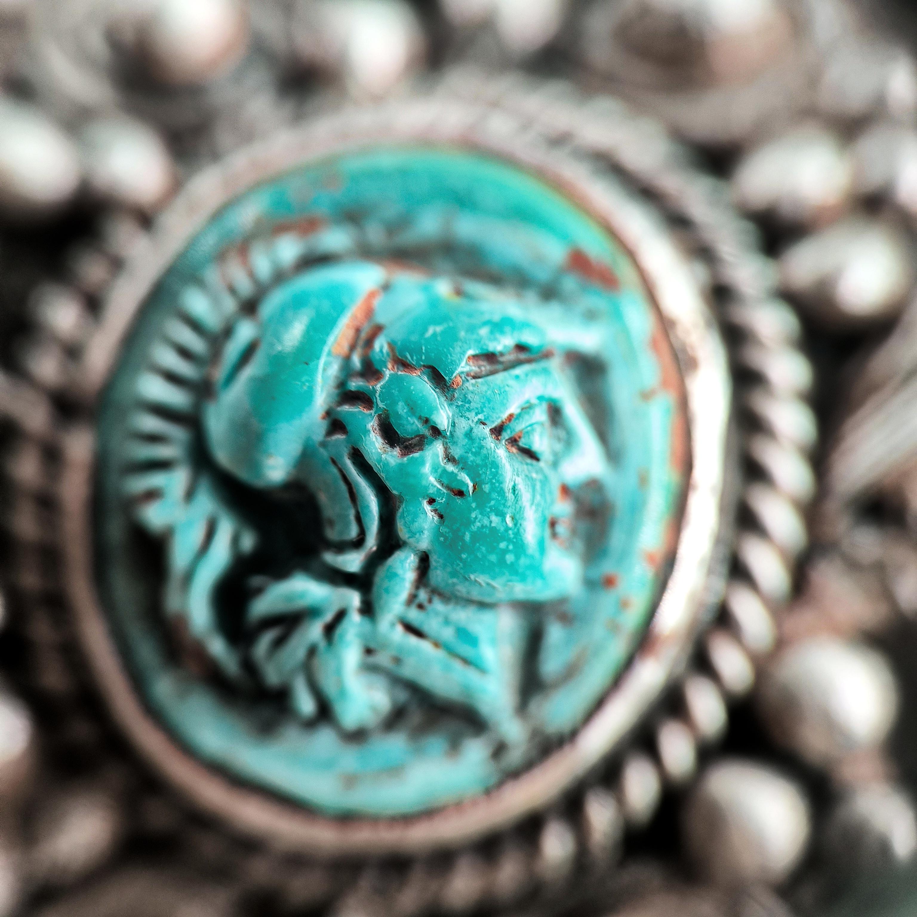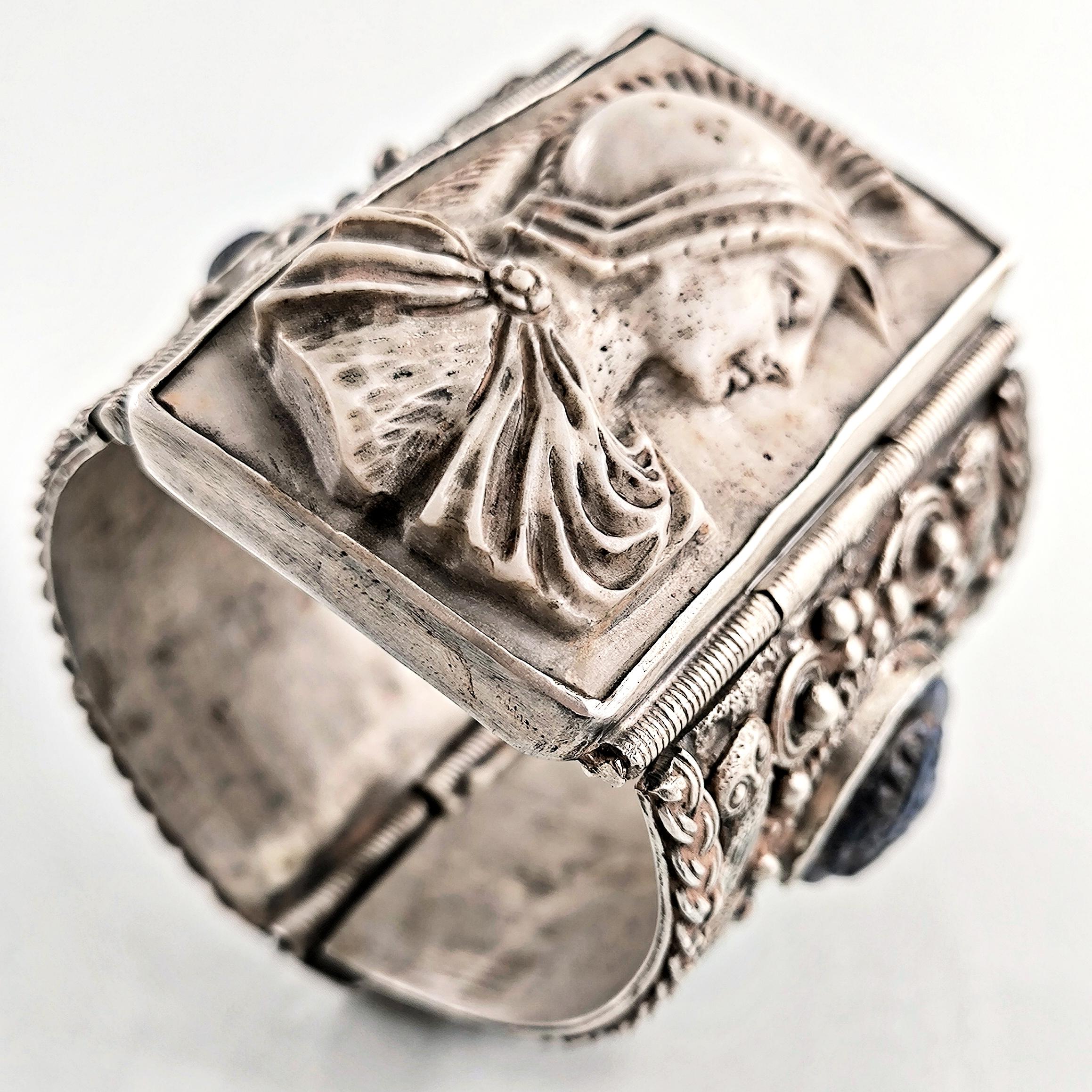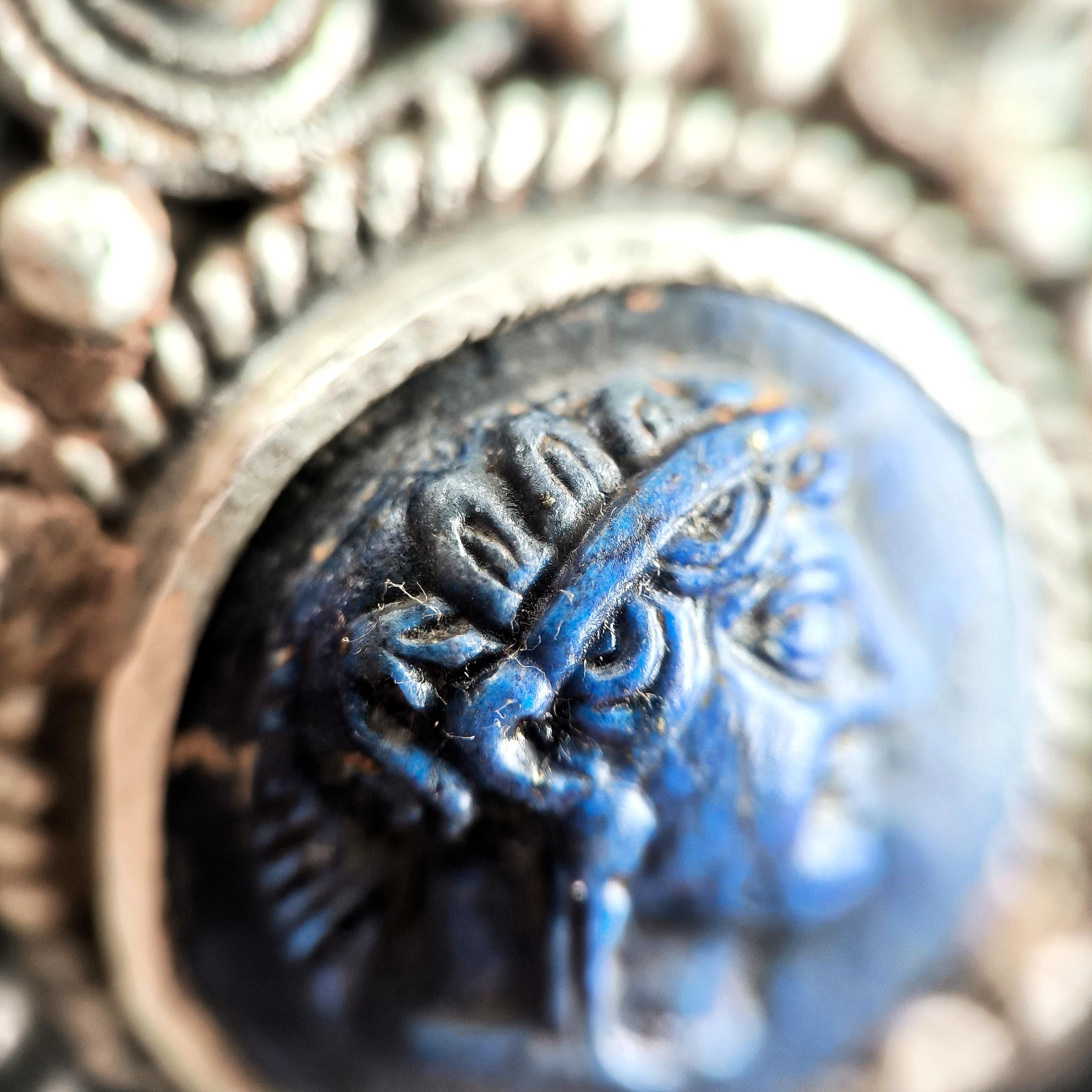 Bu eşsiz güzellik, modern çağda yeniden doğan bir antik zırh gibi!.. Tamamı 320 gram 925 Ayar gümüşten el işçiliğiyle şekillendirildi. Merkezinde beyaz mermer üzerine oyulmuş Athena kabartması yer alıyor; bilgelik, cesaret ve stratejinin simgesi. Yan yüzeylerde ise lapis ve firuze taşlar üzerine işlenen Athena sikkelerinin ön ve arka yüz rölyefleri, antik dünyanın ruhunu taşın kalbinde yeniden canlandırıyor. Tüm çerçeve telkari detaylarla zenginleştirilmiş, gümüş baykuş rölyefleriyle çevrelenmiş. Her figür, her kabartma, bir medeniyetin sanat anlayışını bugüne taşıyor. Aylar süren emekle tamamlanan bu eser, yalnızca bir bileklik değil; bilgelik, kudret ve ustalığın birleşiminden doğmuş bir başyapıt...