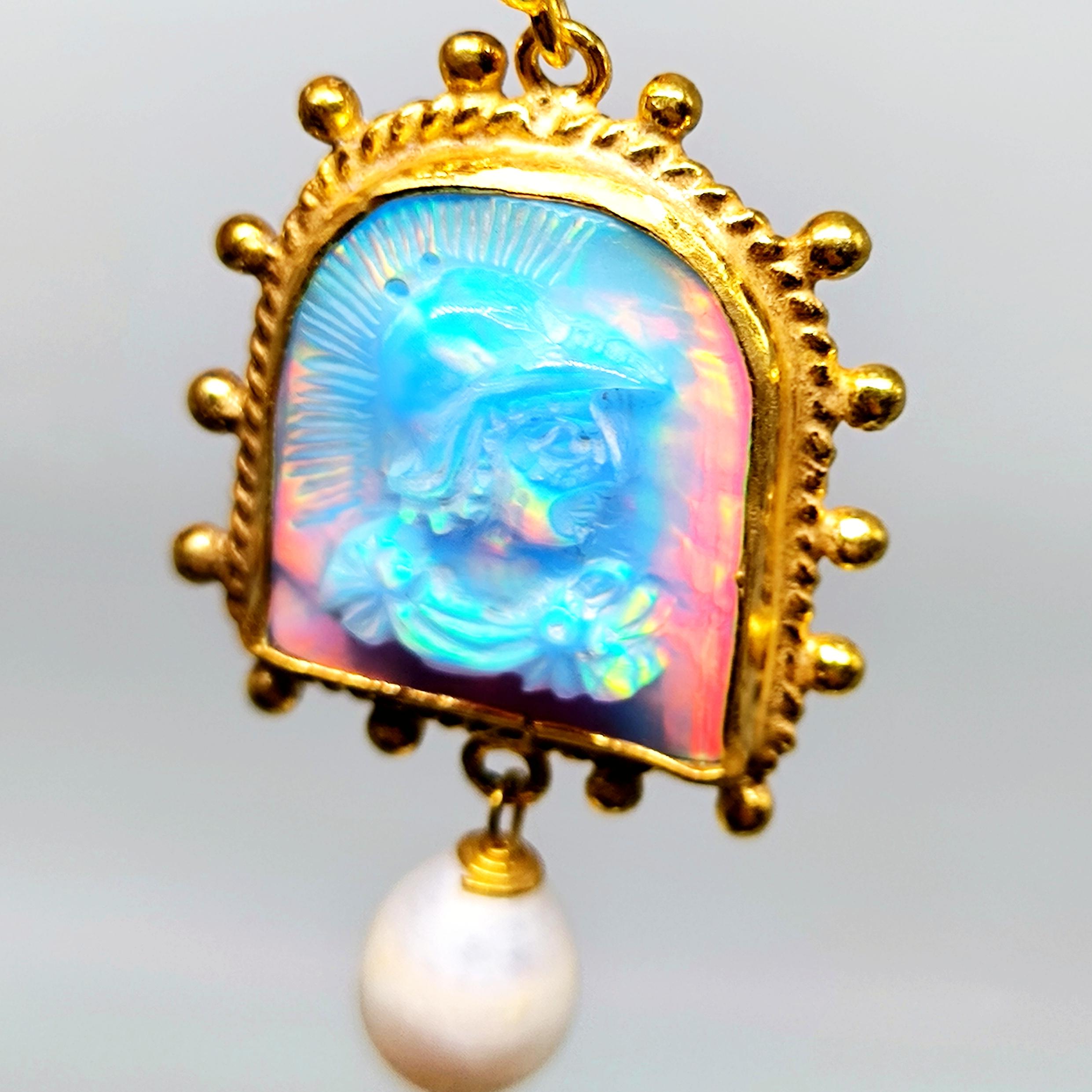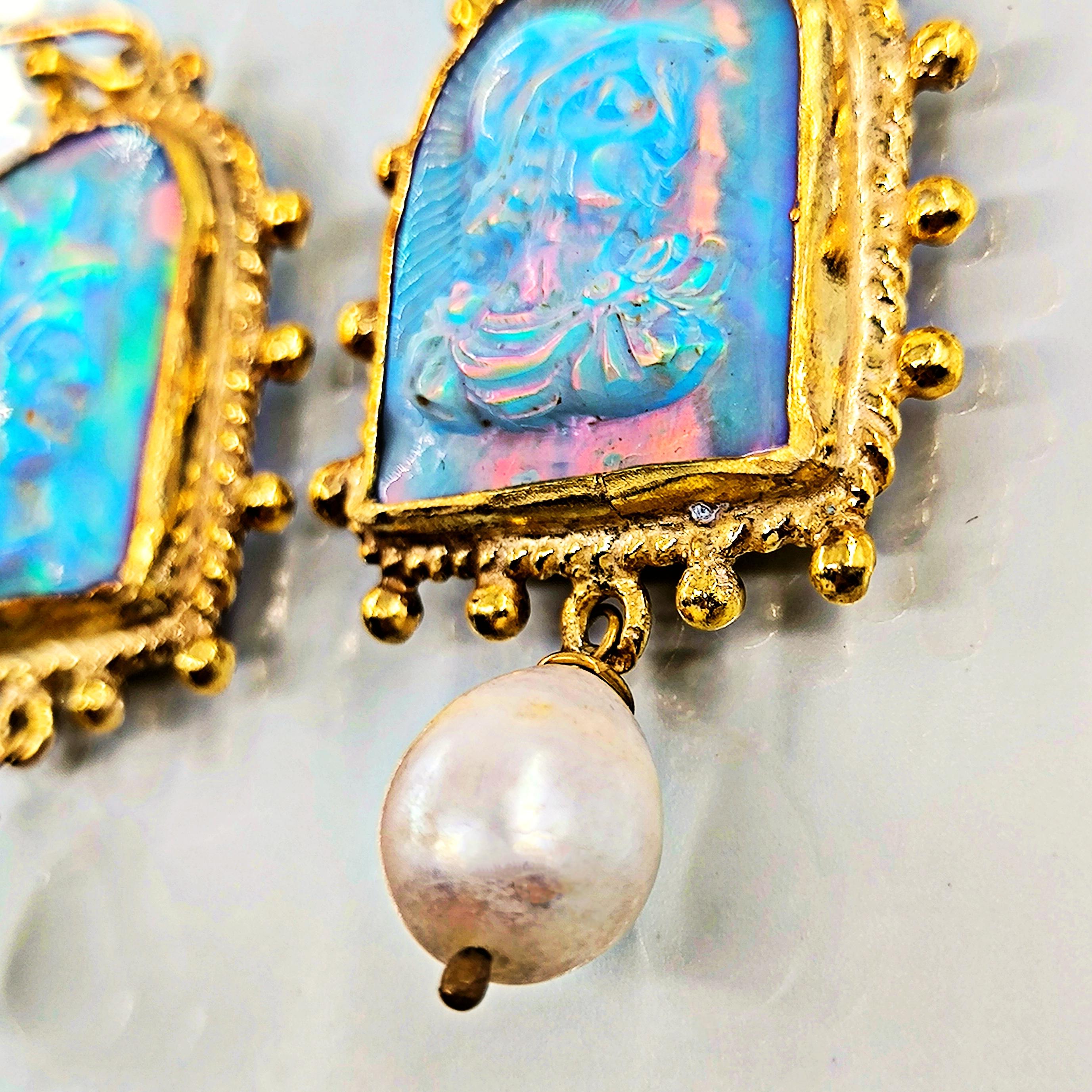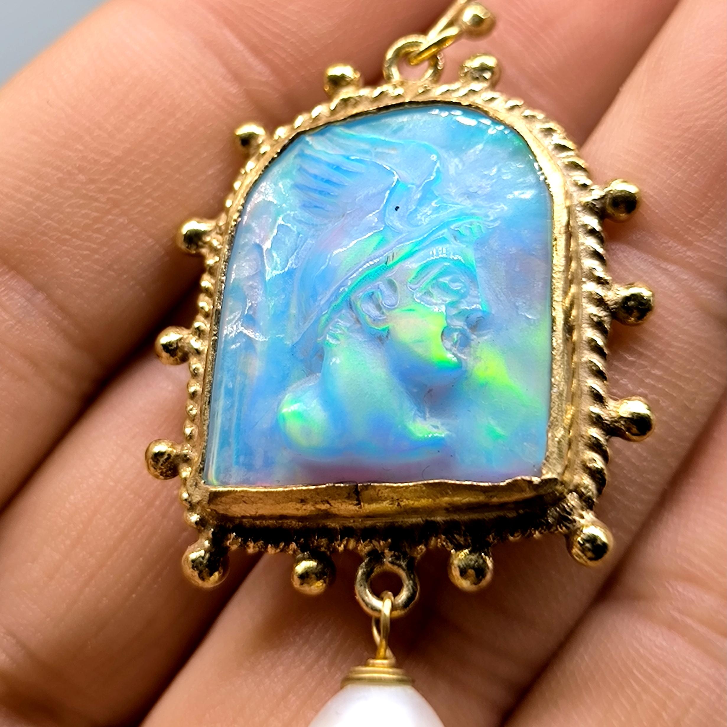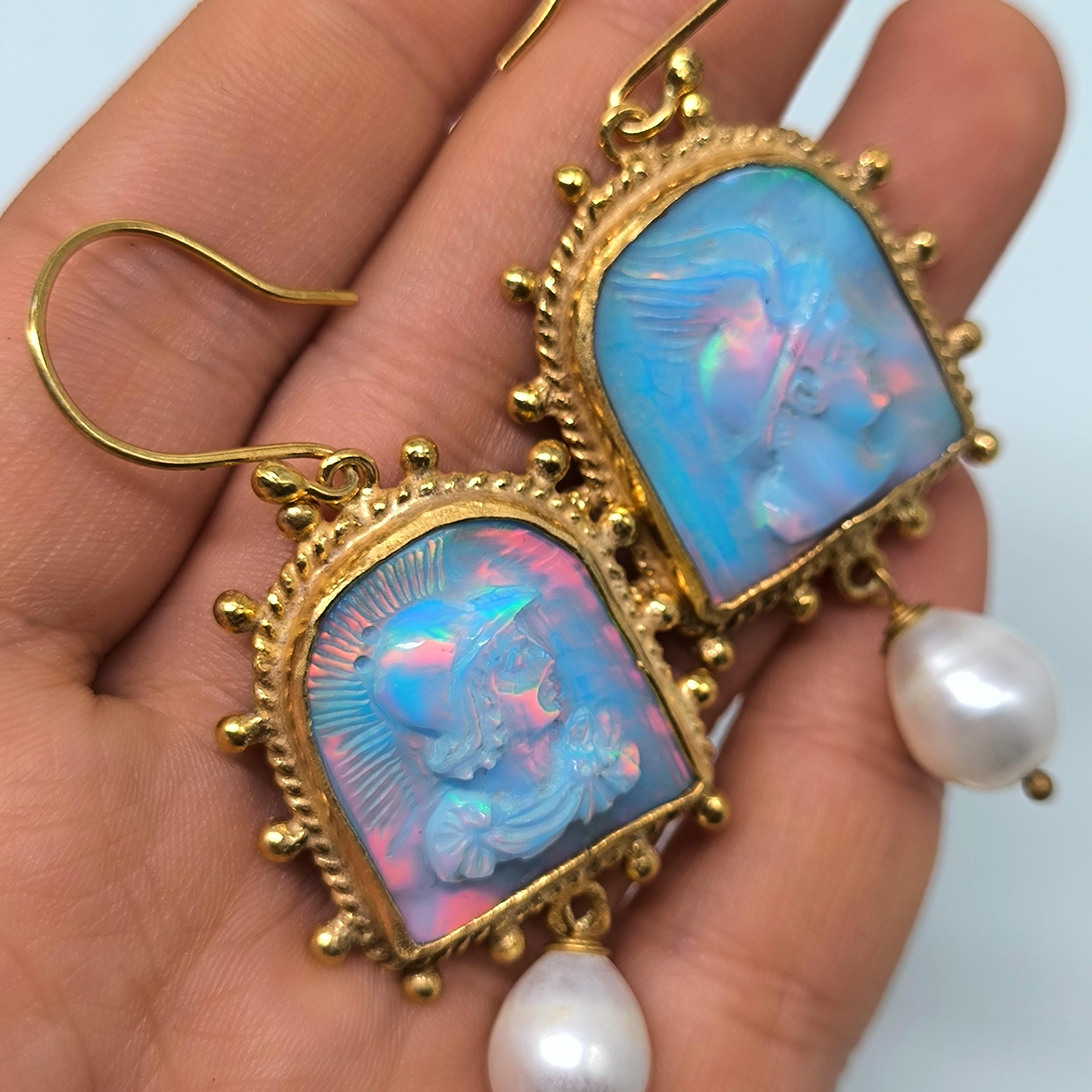 Işıltısıyla adeta yıldız tozunu andıran sentetik opal taşların içine işlenmiş iki büyük tanrı: