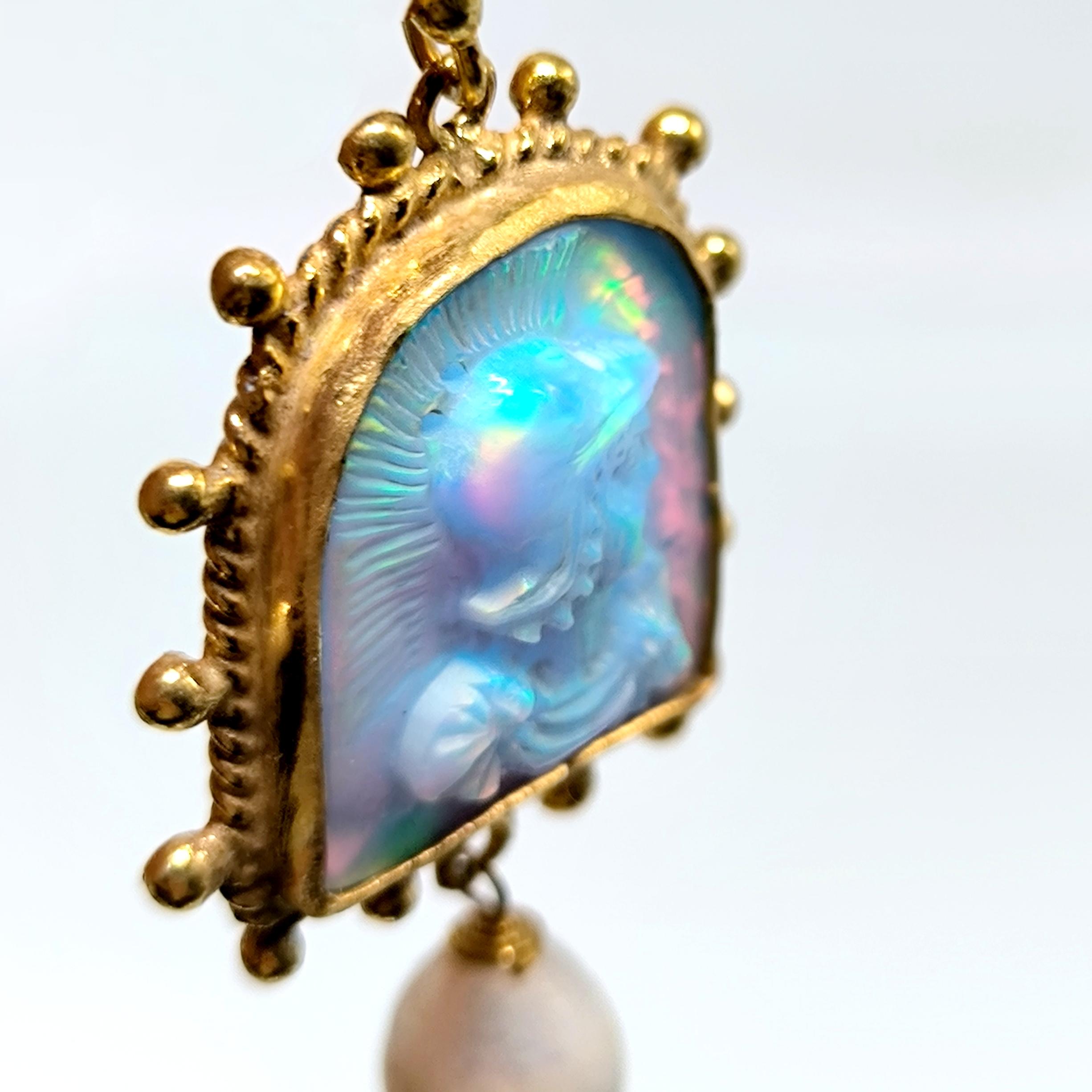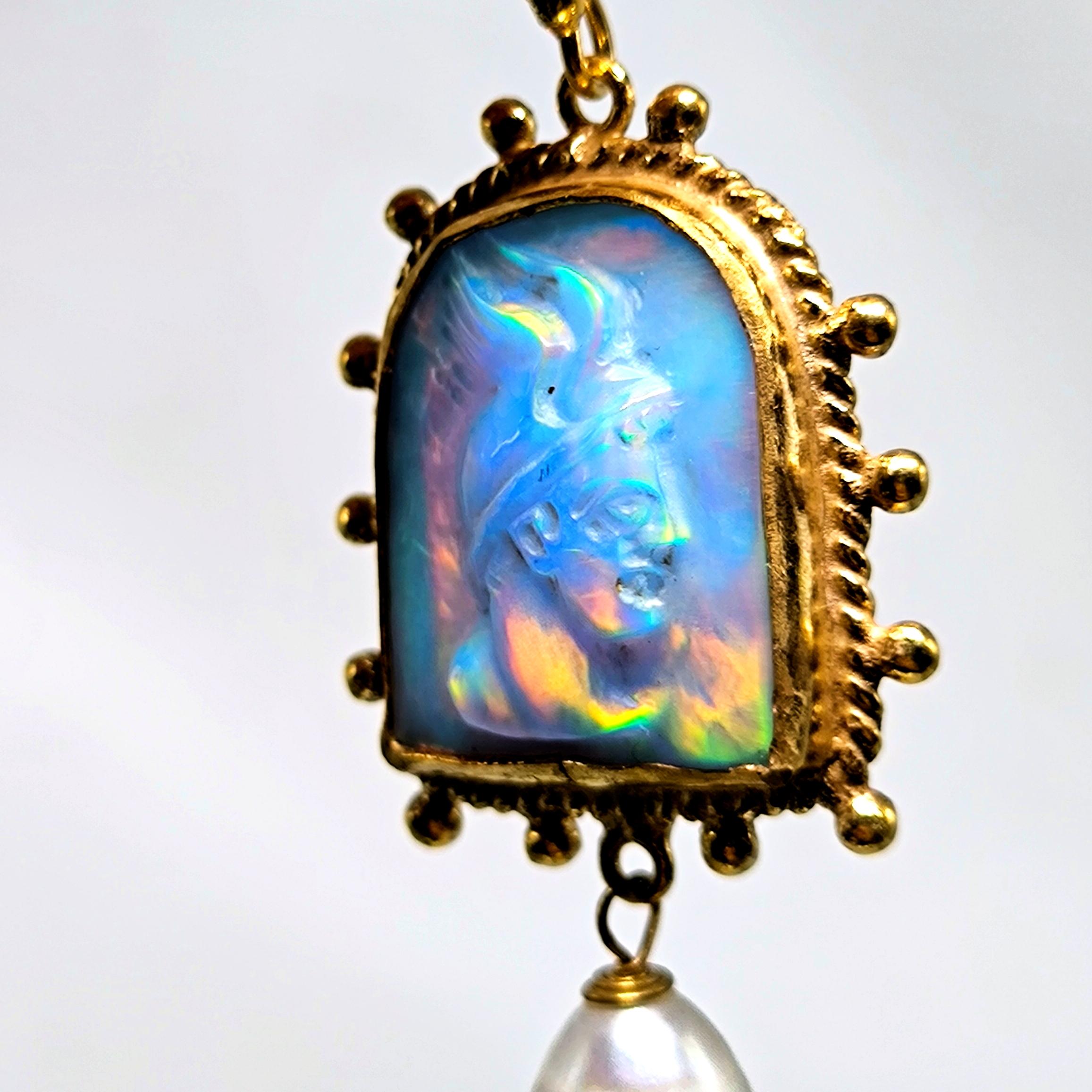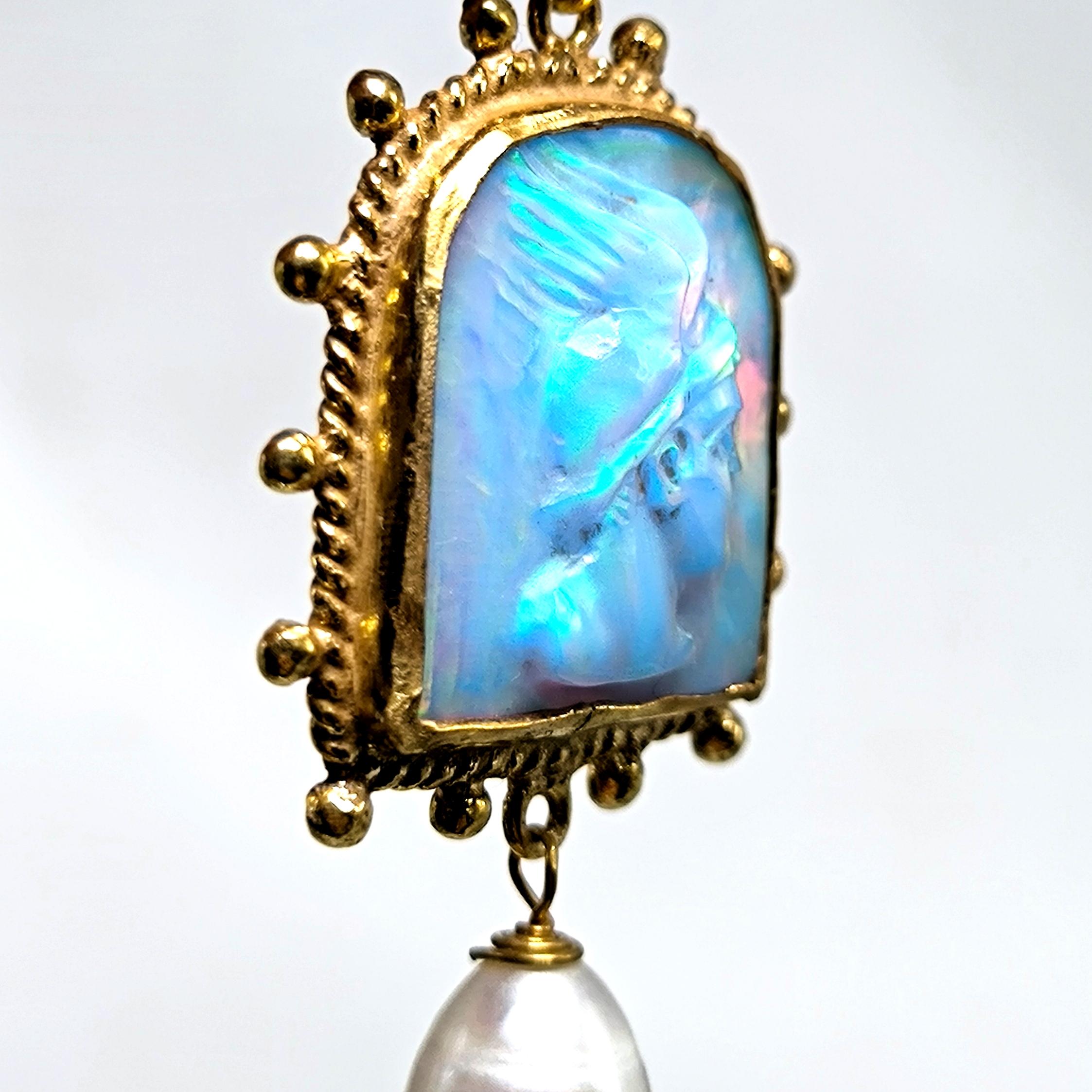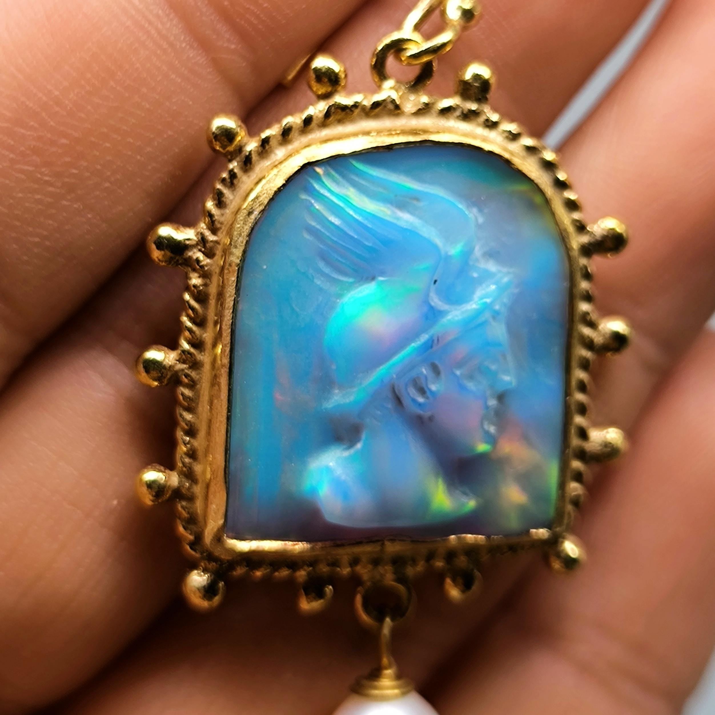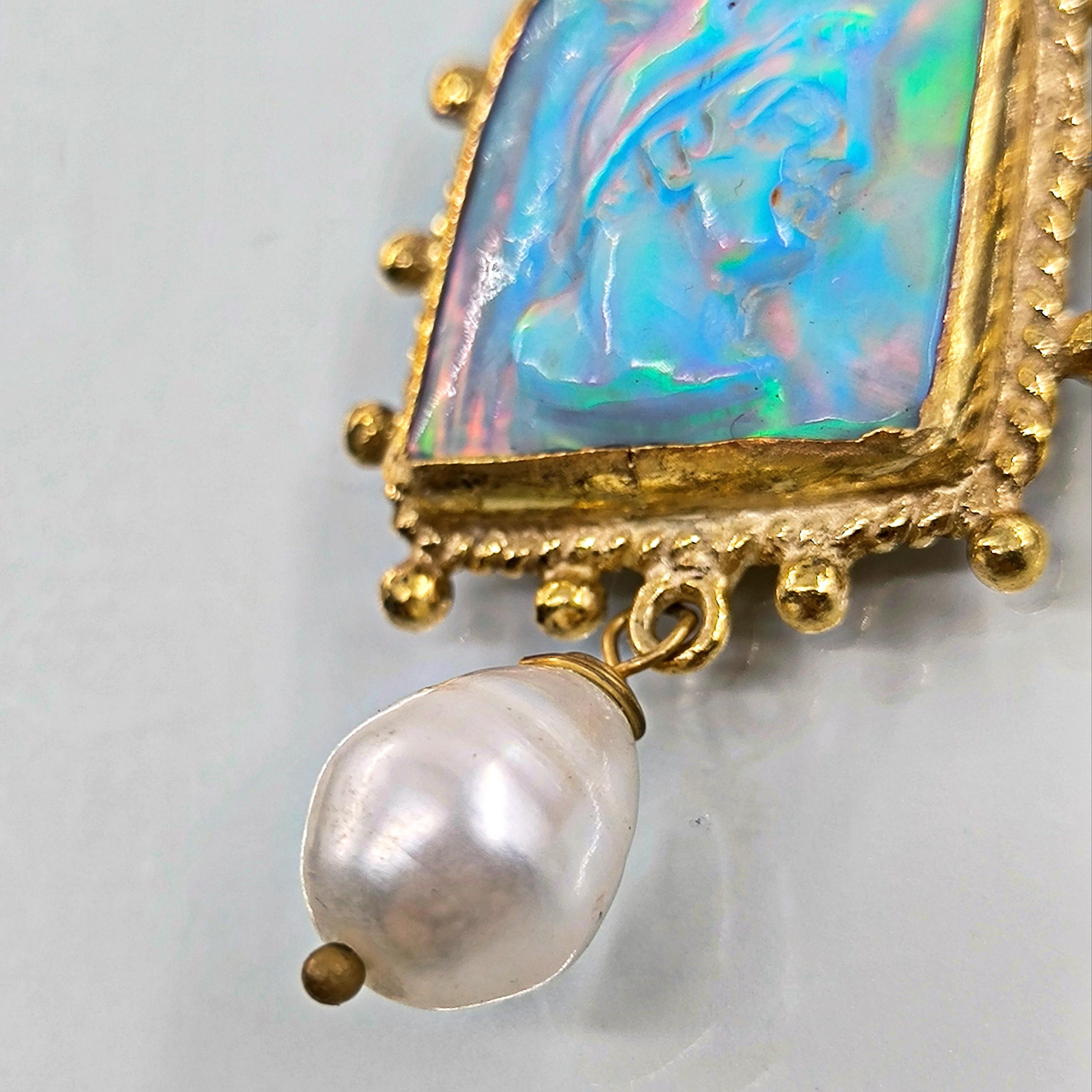 Işıltısıyla adeta yıldız tozunu andıran sentetik opal taşların içine işlenmiş iki büyük tanrı: