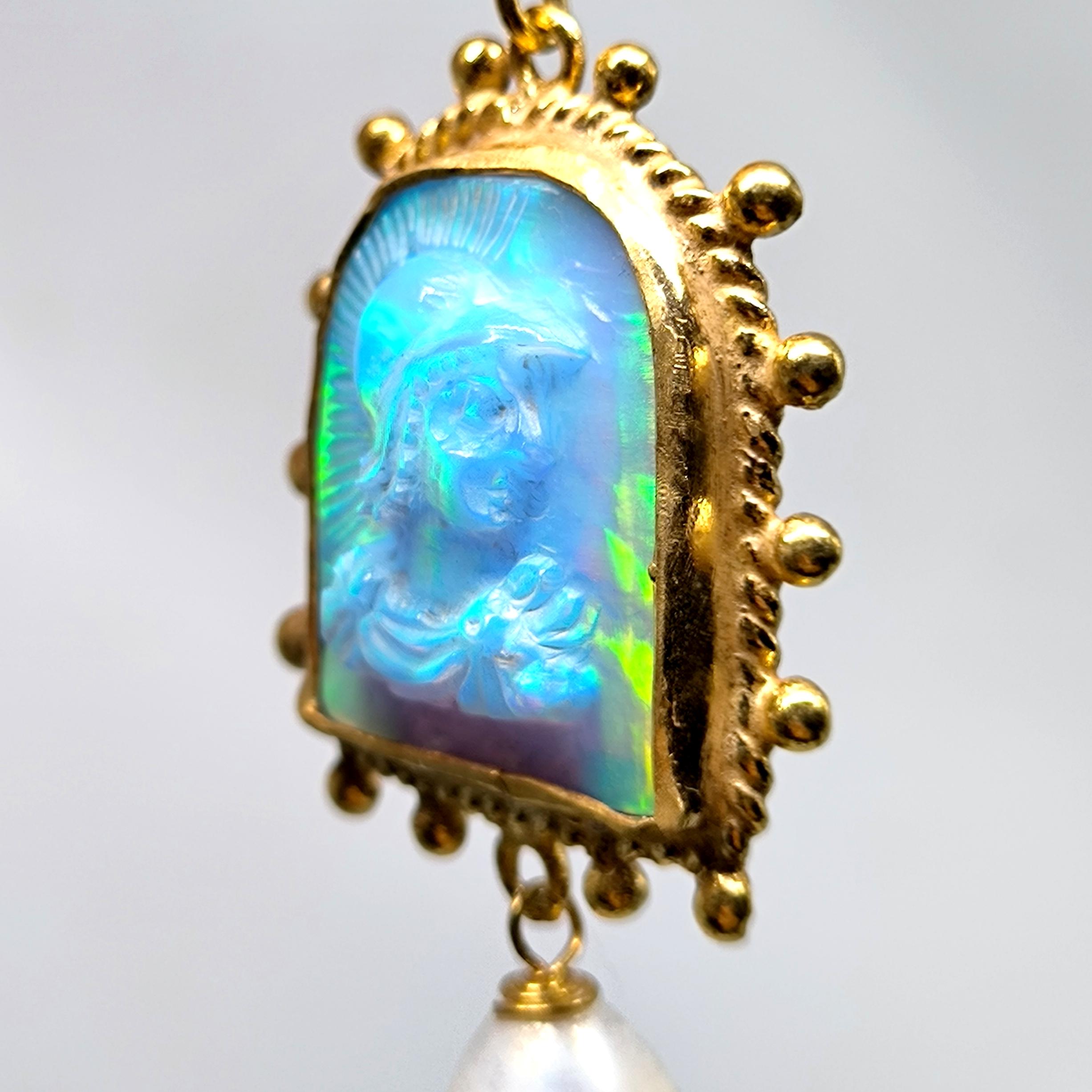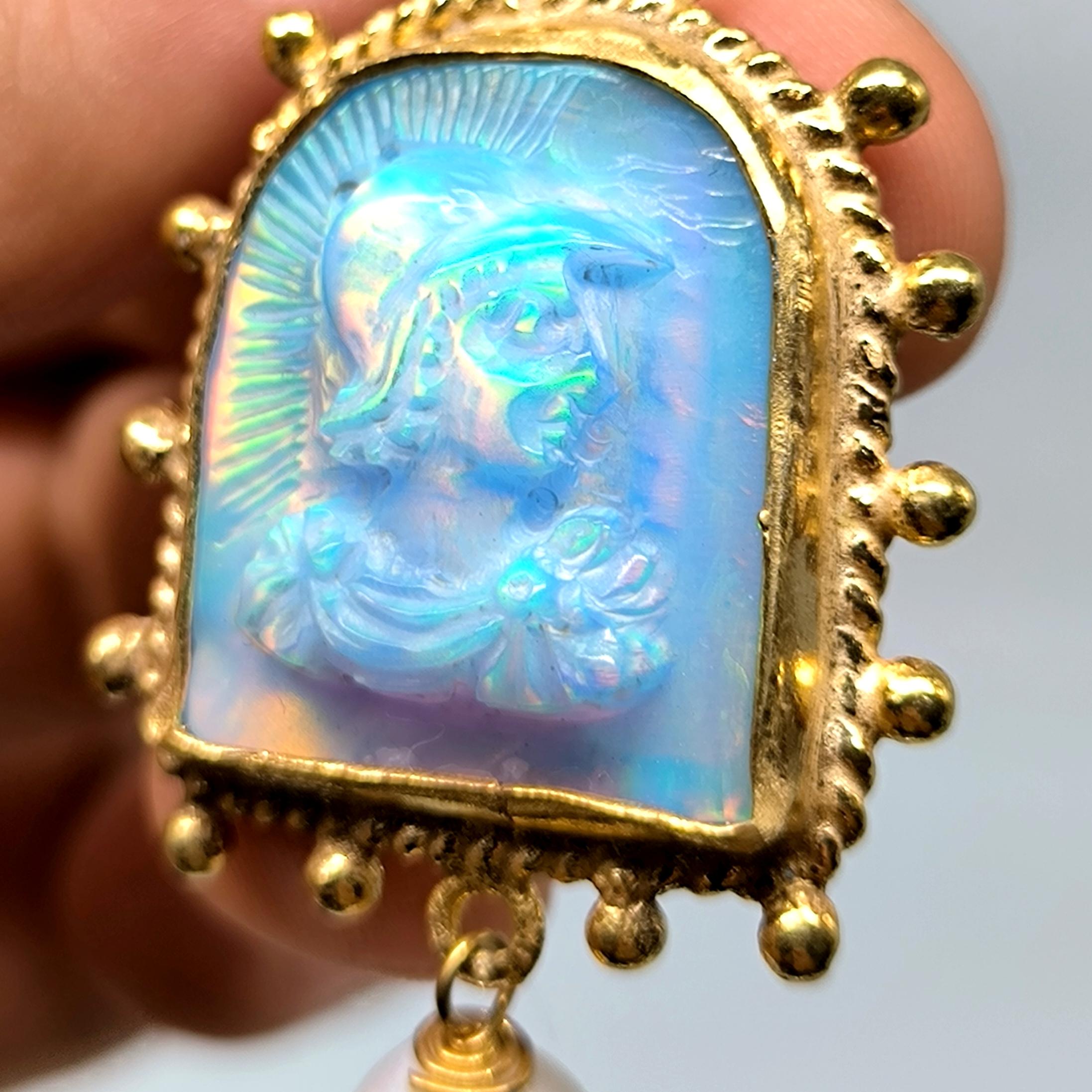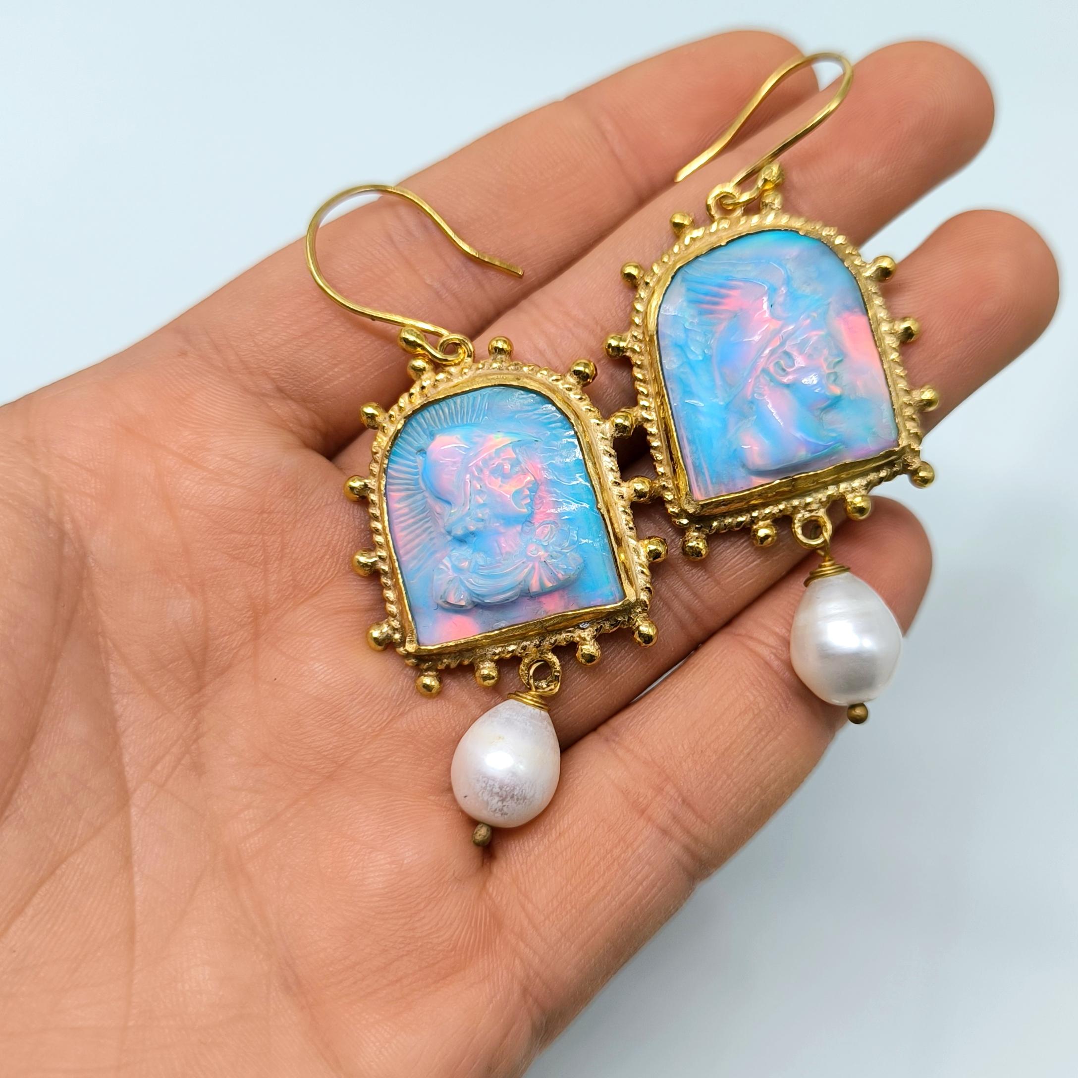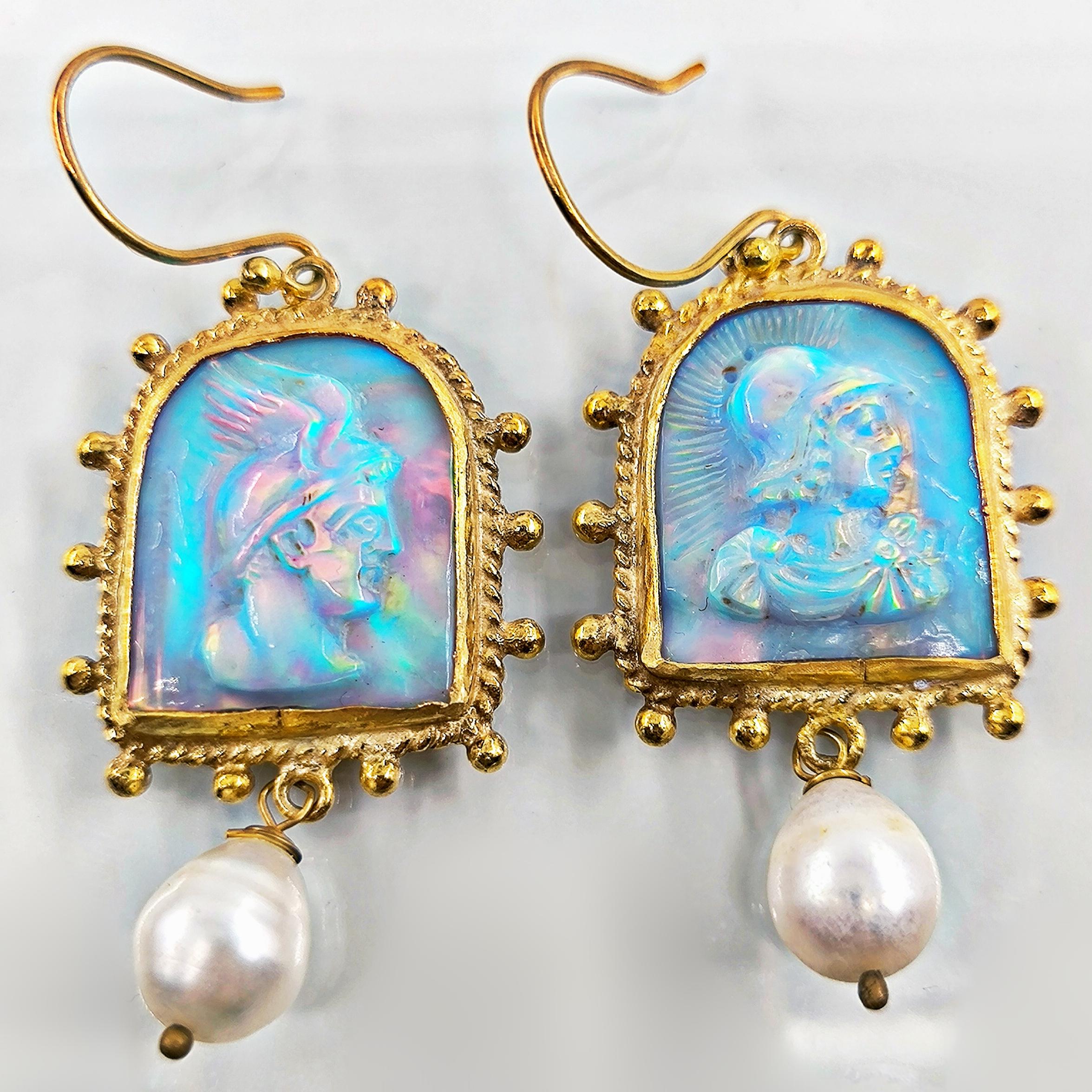 Işıltısıyla adeta yıldız tozunu andıran sentetik opal taşların içine işlenmiş iki büyük tanrı: