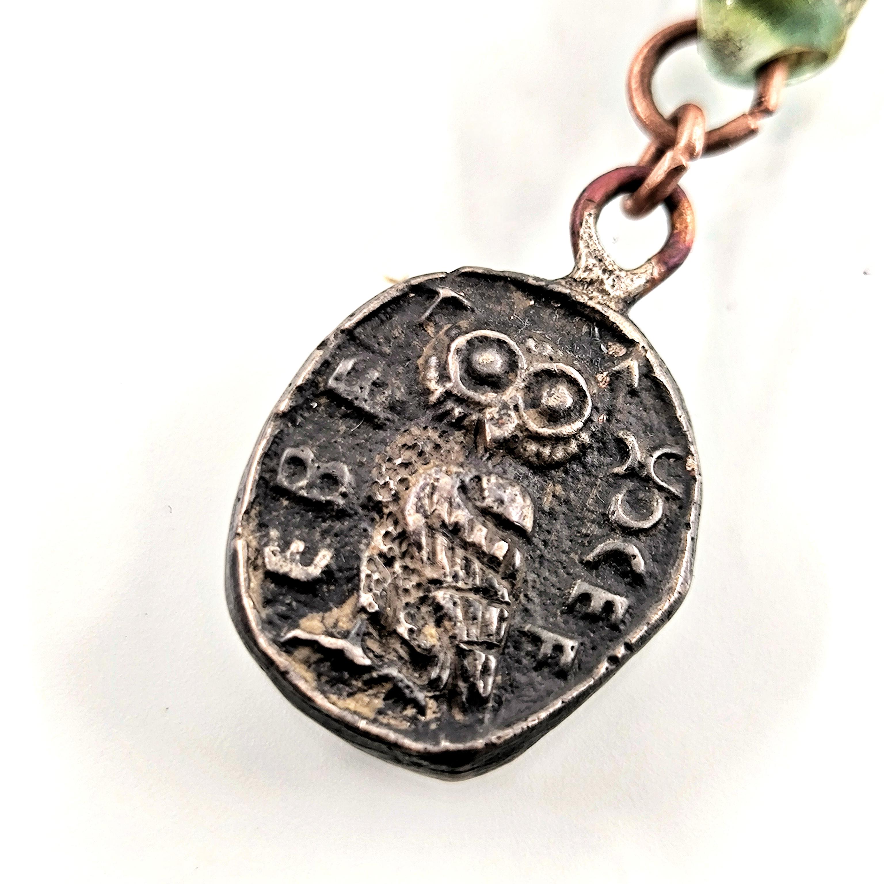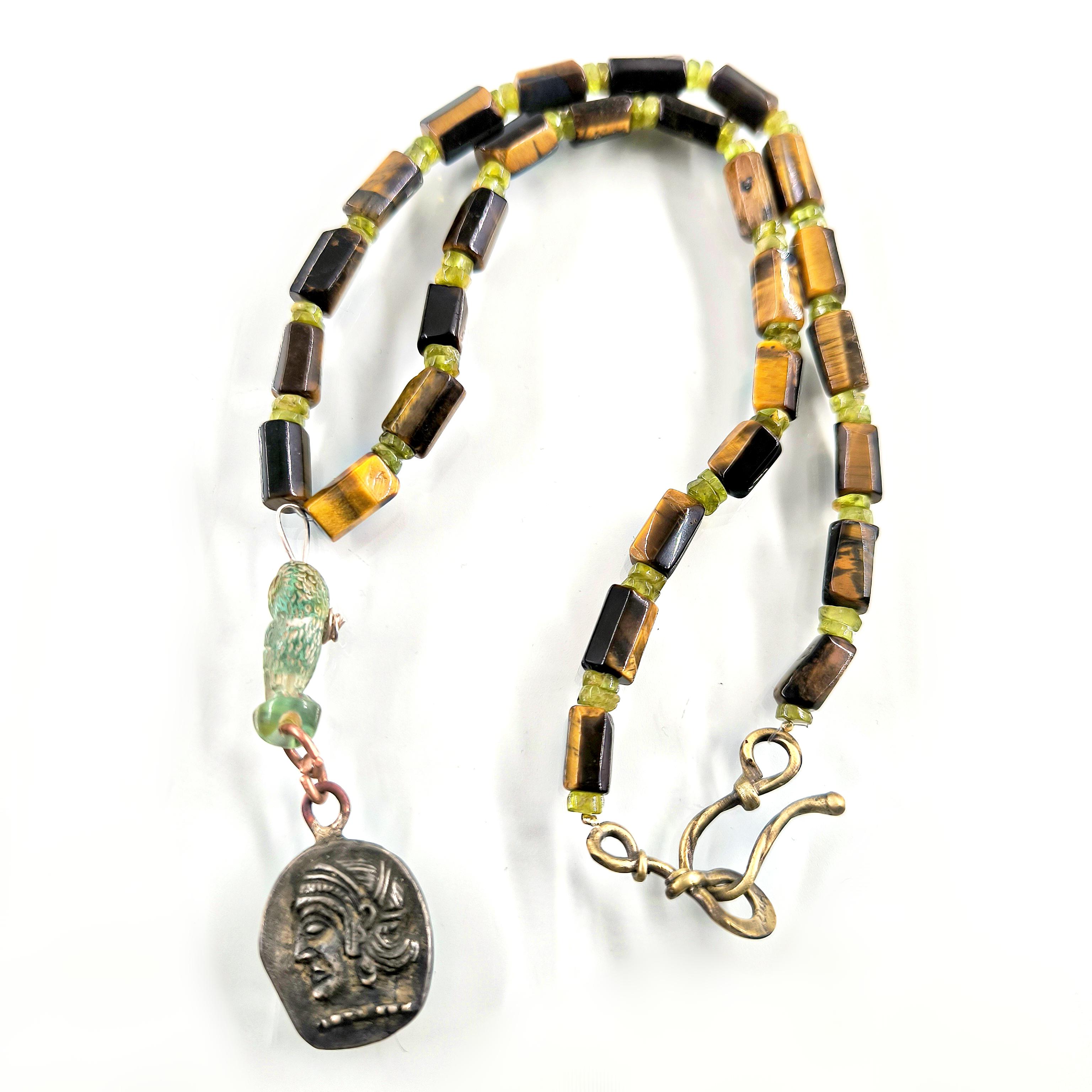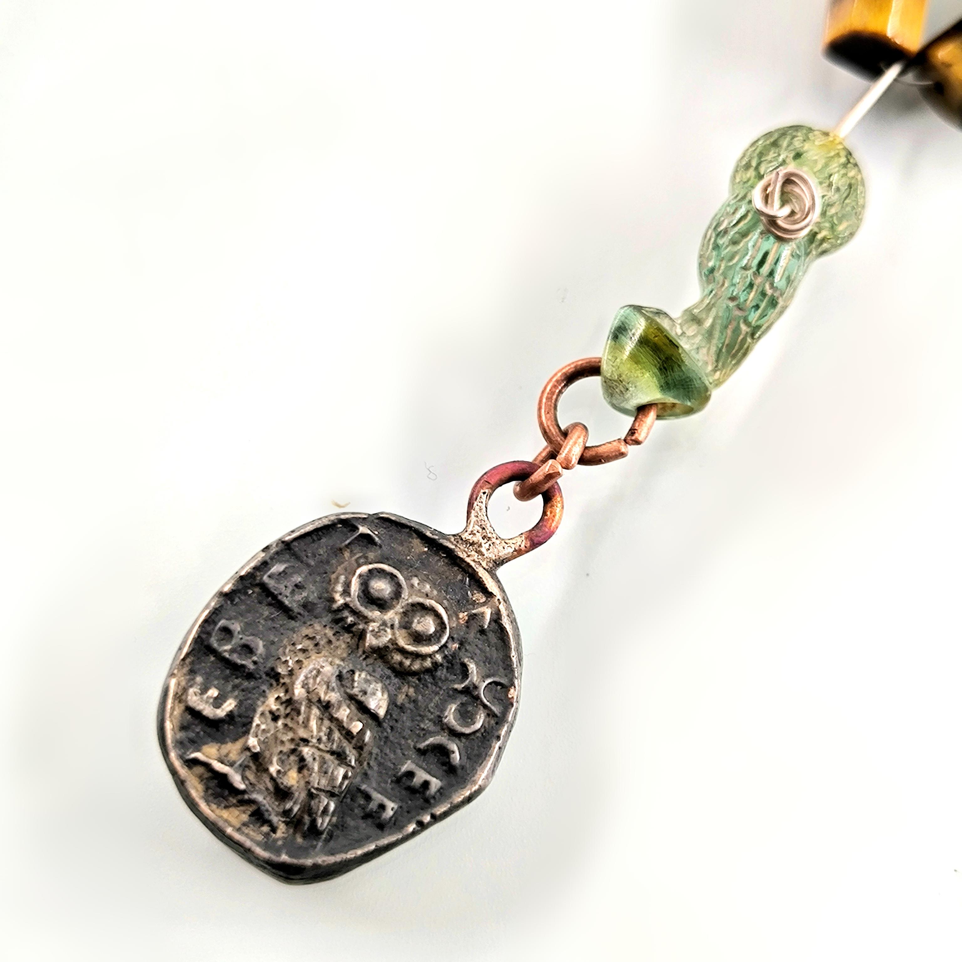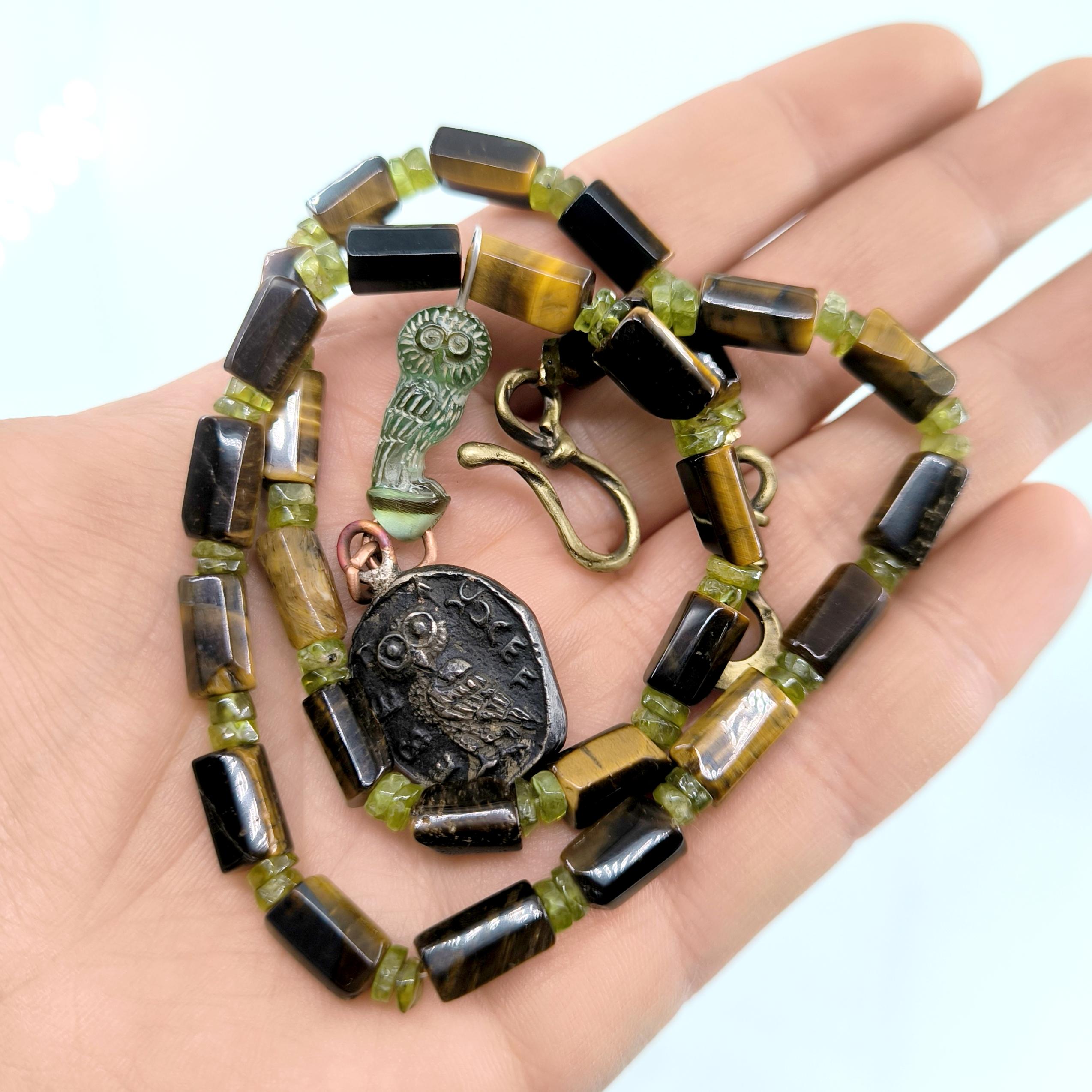Bu tasarımda antik dünyanın bilgelik sembollerini güçlü taşlarla bir araya getirdim. Zincir bölümünde yer alan kaplan gözü taşları ışıkla birlikte canlı bir derinlik yaratırken, aralarındaki natürel zebercetler tasarıma taze ve enerjik bir denge katıyor. Kolye ucunda yer alan yeşil kehribar üzerindeki baykuş kabartması, Athena’nın kadim bilgeliğini simgeler. Hemen altında sallanan düşük ayar gümüş replika ilkel Athena sikkesi ise tasarıma arkeolojik bir ruh kazandırıyor. Medusa imzalı özel gümüş klips ile tamamlanan bu parça, hem güçlü semboller taşıyan hem de boyunda dikkat çeken özgün bir sanat kolyesidir.