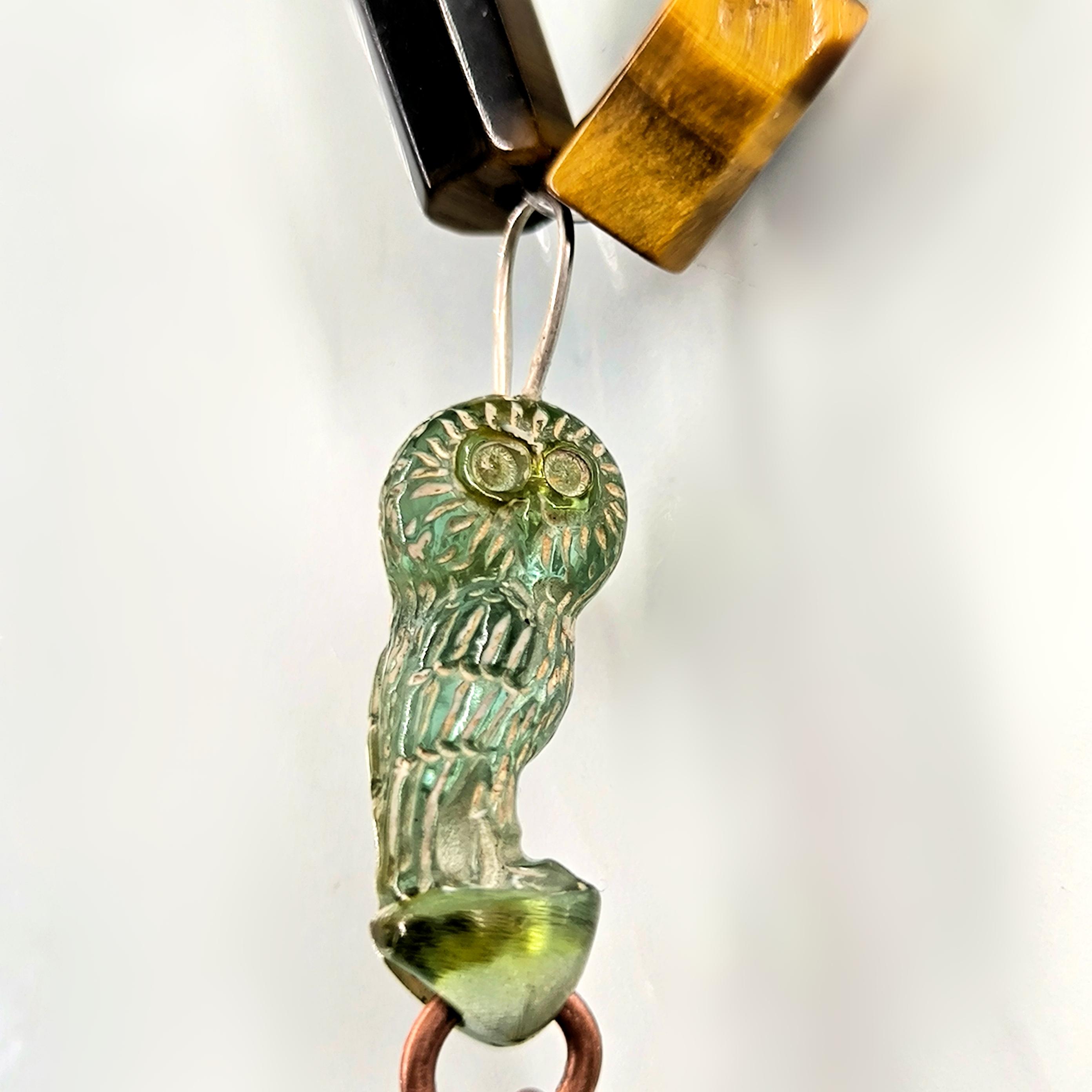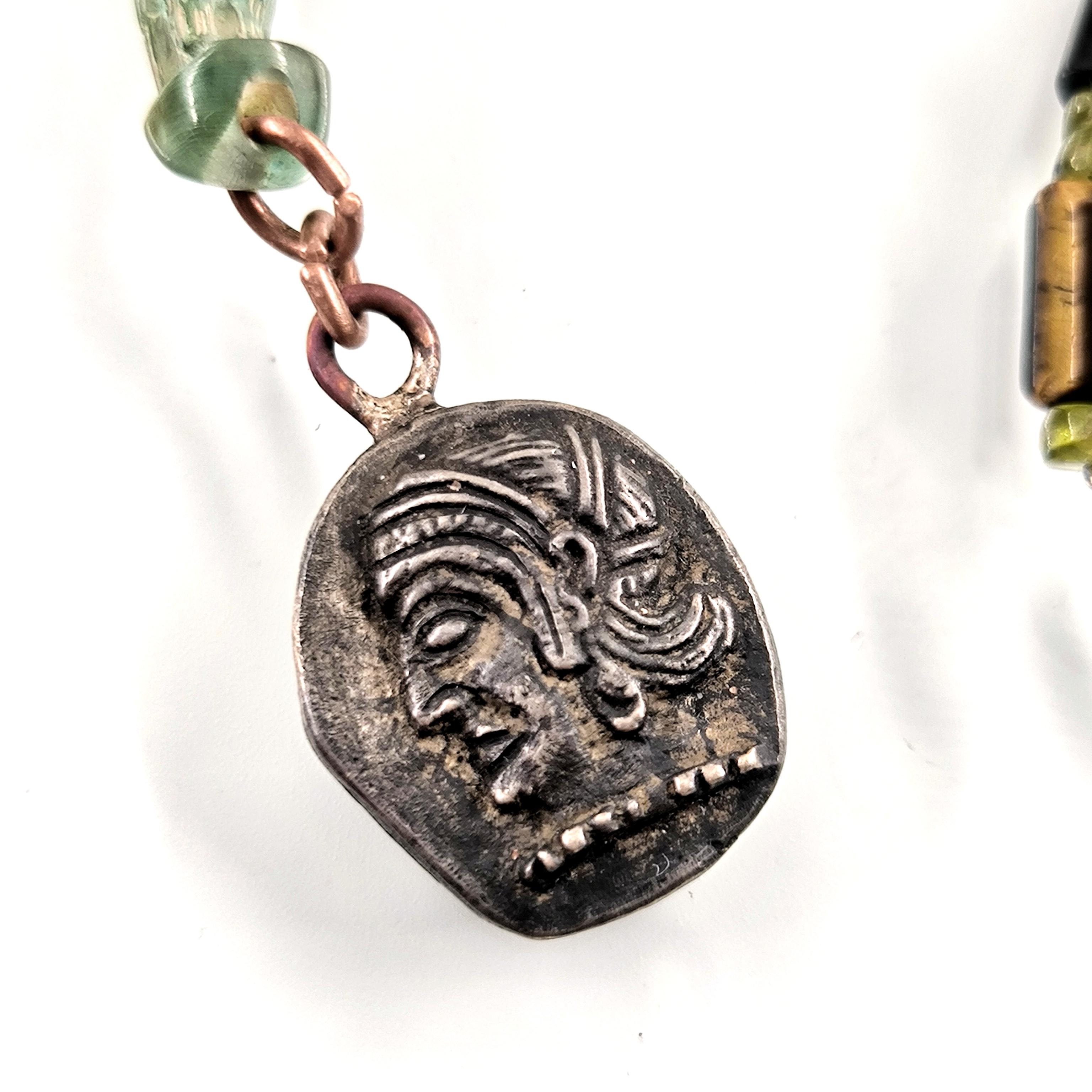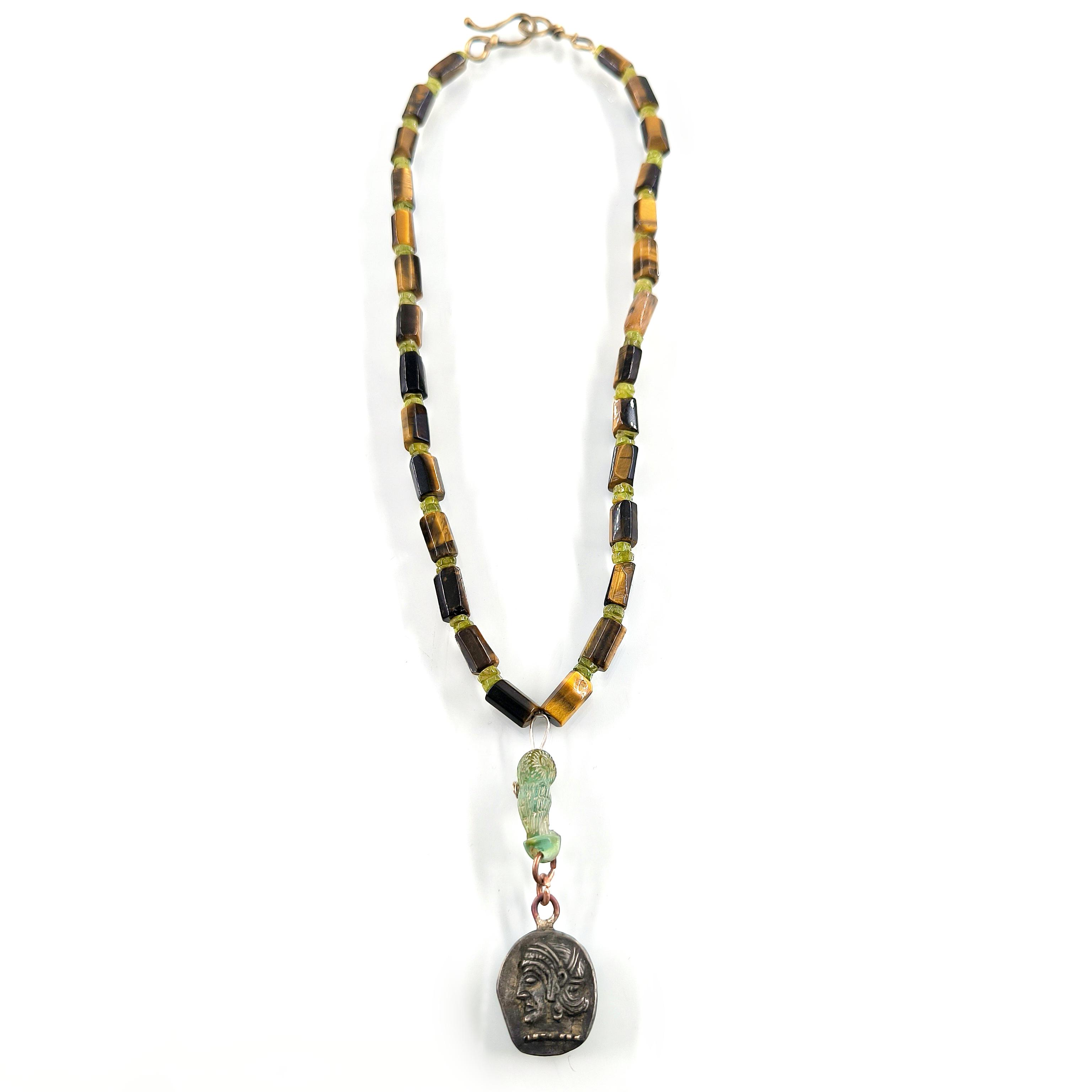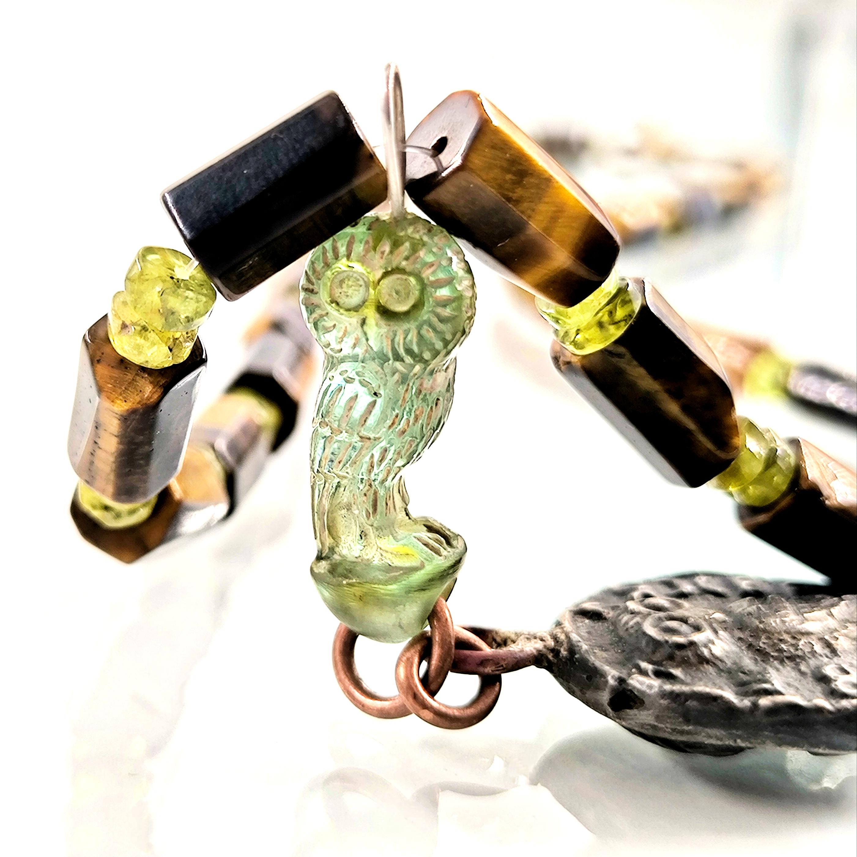 Bu tasarımda antik dünyanın bilgelik sembollerini güçlü taşlarla bir araya getirdim. Zincir bölümünde yer alan kaplan gözü taşları ışıkla birlikte canlı bir derinlik yaratırken, aralarındaki natürel zebercetler tasarıma taze ve enerjik bir denge katıyor. Kolye ucunda yer alan yeşil kehribar üzerindeki baykuş kabartması, Athena’nın kadim bilgeliğini simgeler. Hemen altında sallanan düşük ayar gümüş replika ilkel Athena sikkesi ise tasarıma arkeolojik bir ruh kazandırıyor. Medusa imzalı özel gümüş klips ile tamamlanan bu parça, hem güçlü semboller taşıyan hem de boyunda dikkat çeken özgün bir sanat kolyesidir.